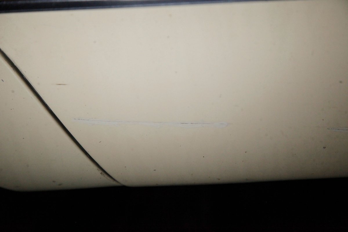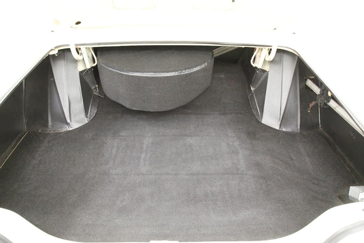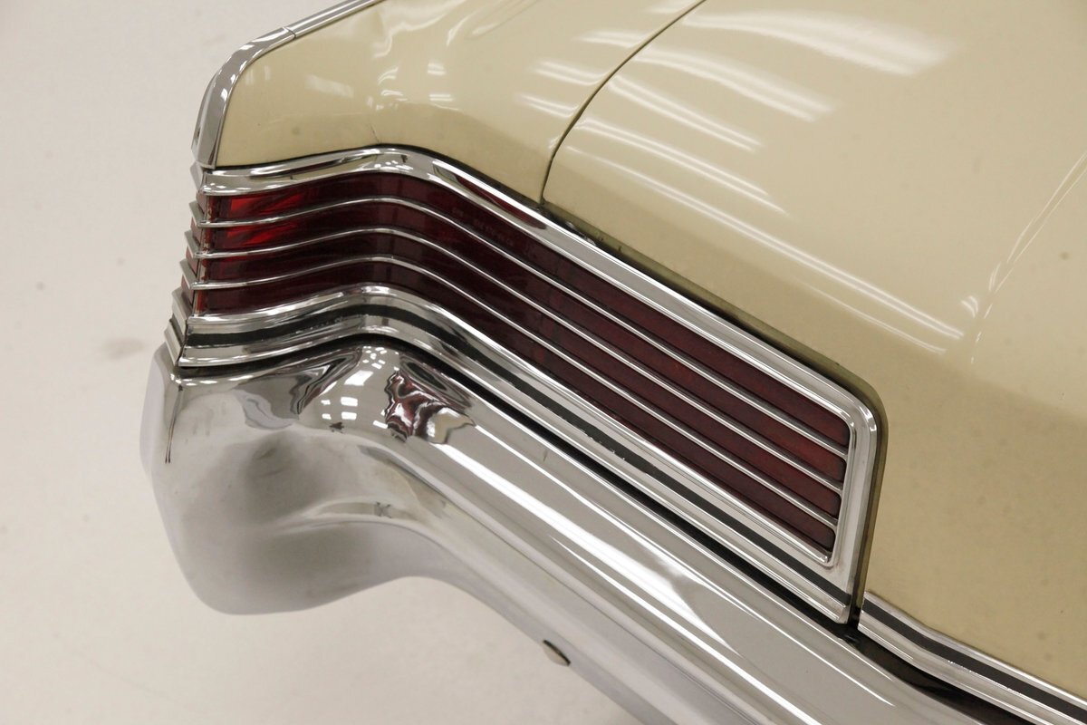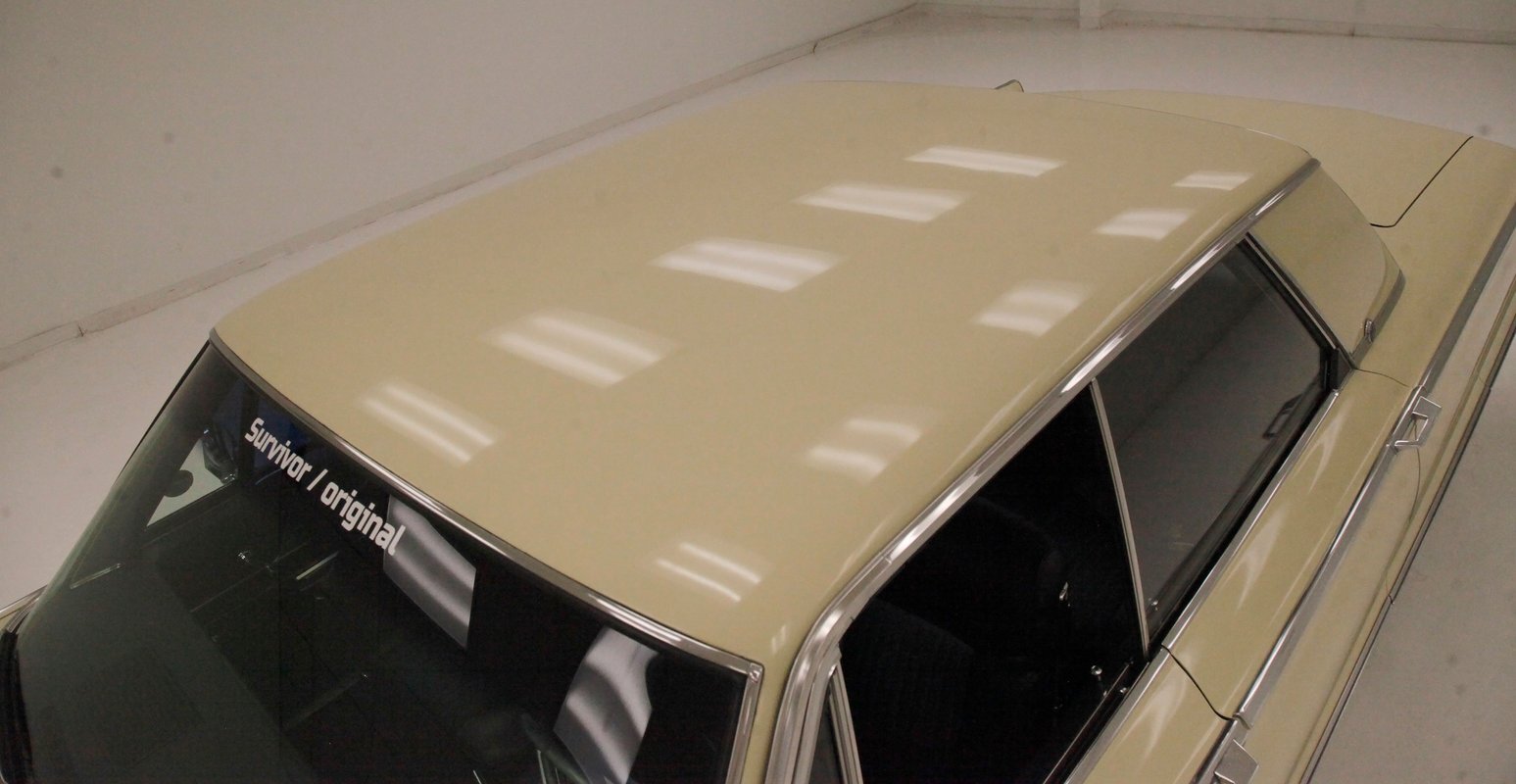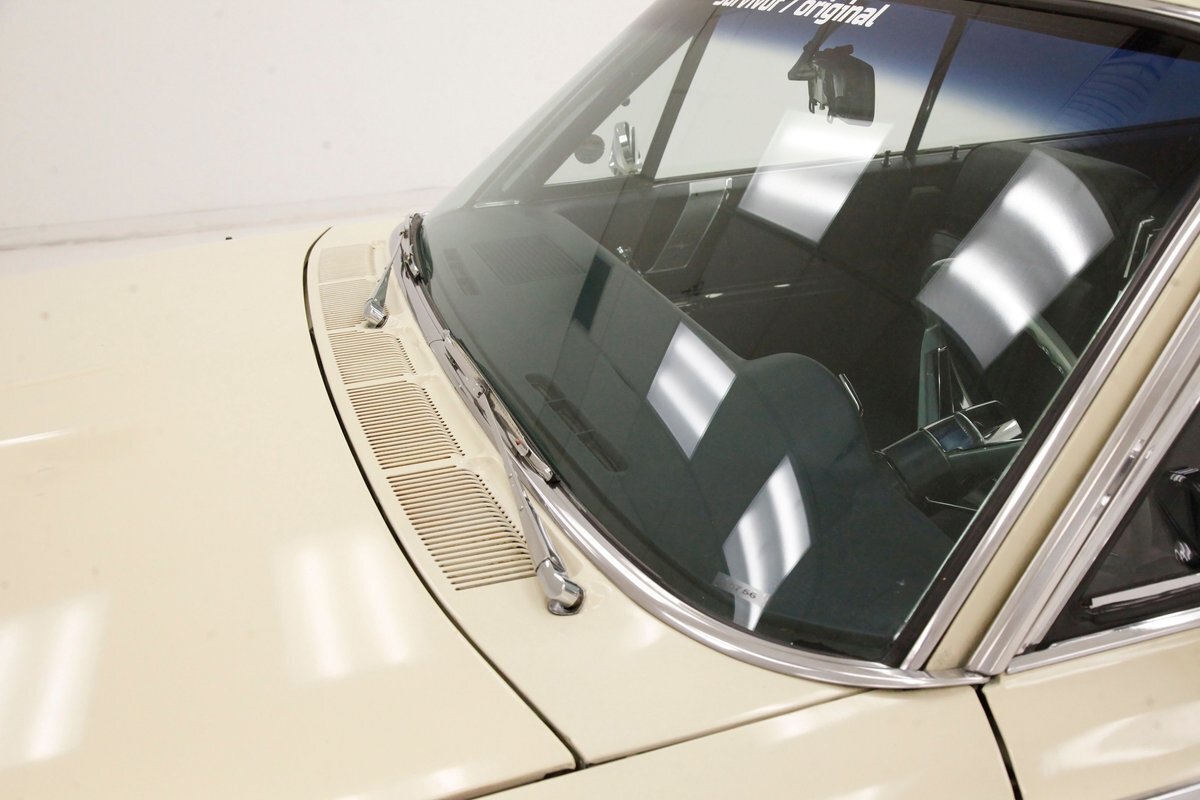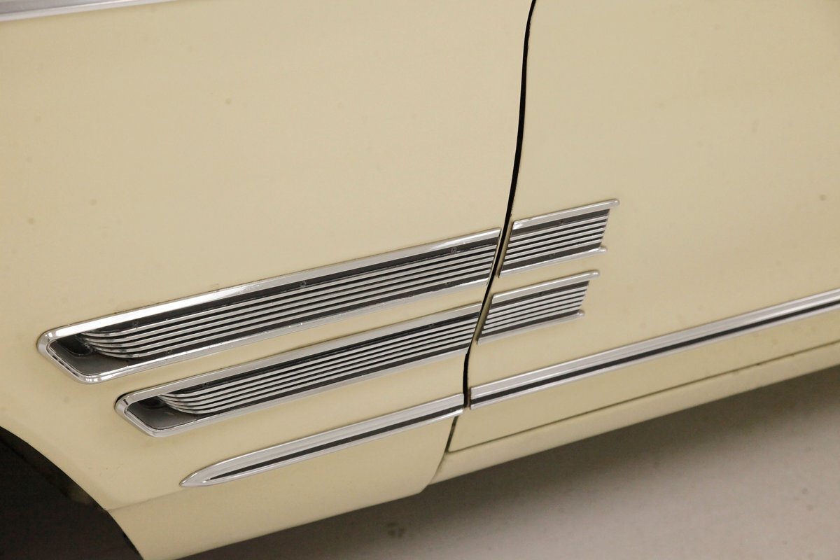 Plenty of Ivory paint covers the straight and true steel slabs that have been formed to create this stylish example of the 300. The gaps are well minded, and paint, being the consignor stated original, has not lost its luster, but does show some wear as well as touched up chip offs and dings. Chrome and badging are all original and all looking good. With its loooooong hood, and 4 door passenger compartment, (more like an apartment), and loooooong trunk, I'm getting ready to move in! Speaking of the trunk, it is sporting the consignor stated special order New Yorker trunk trim, factory jack, felted black liner and black felt covered full size spare tire. A long flat roof presents with block angled B pillars, which was the Mopar style at the time for sedans, and looks just fab as is the plentiful chrome trim around all the windows, trim spear just above the rockers, and all encompassing beltline spear. Within those wheel wells are fantastically preserved tri color and polished 14-inch Chrysler wheel covers with spinner equipped turbine centers and 300 badging wrapped in like new thin whitewall 225/75R14's. Overall, a very nice exterior presentation.