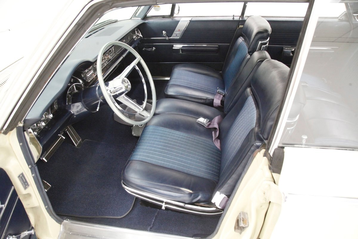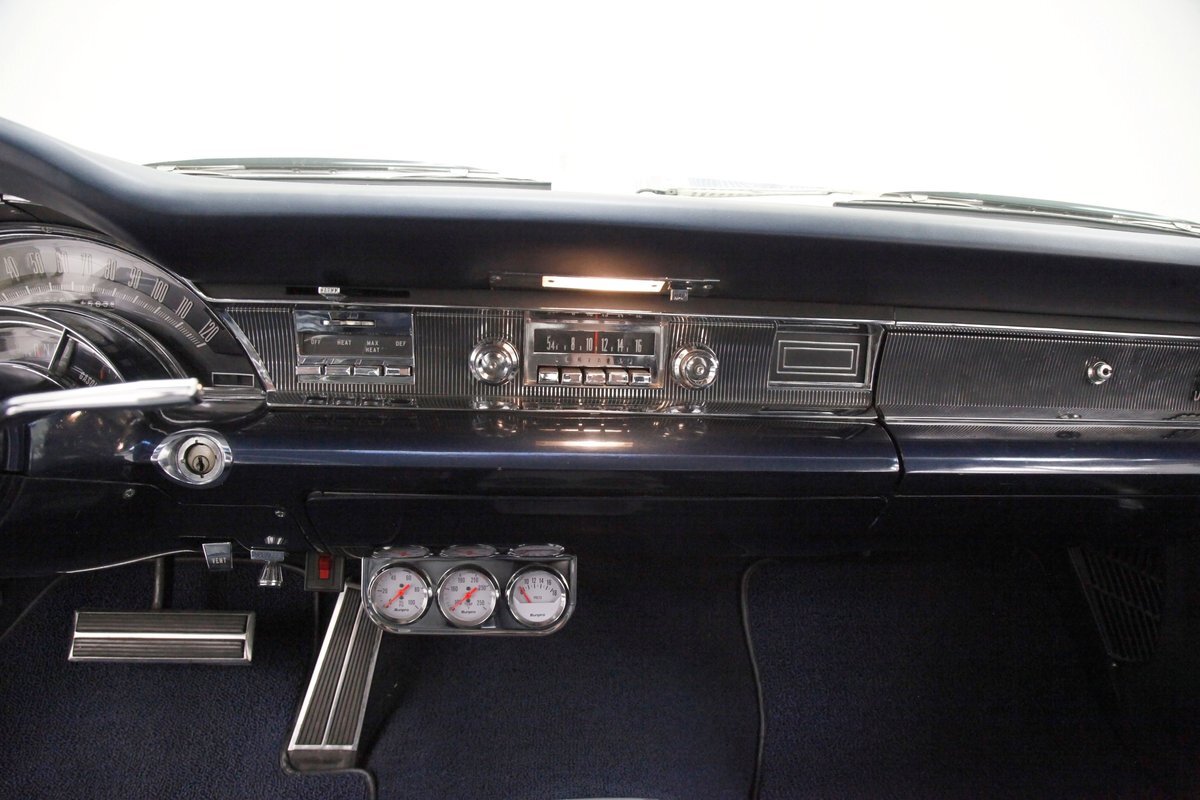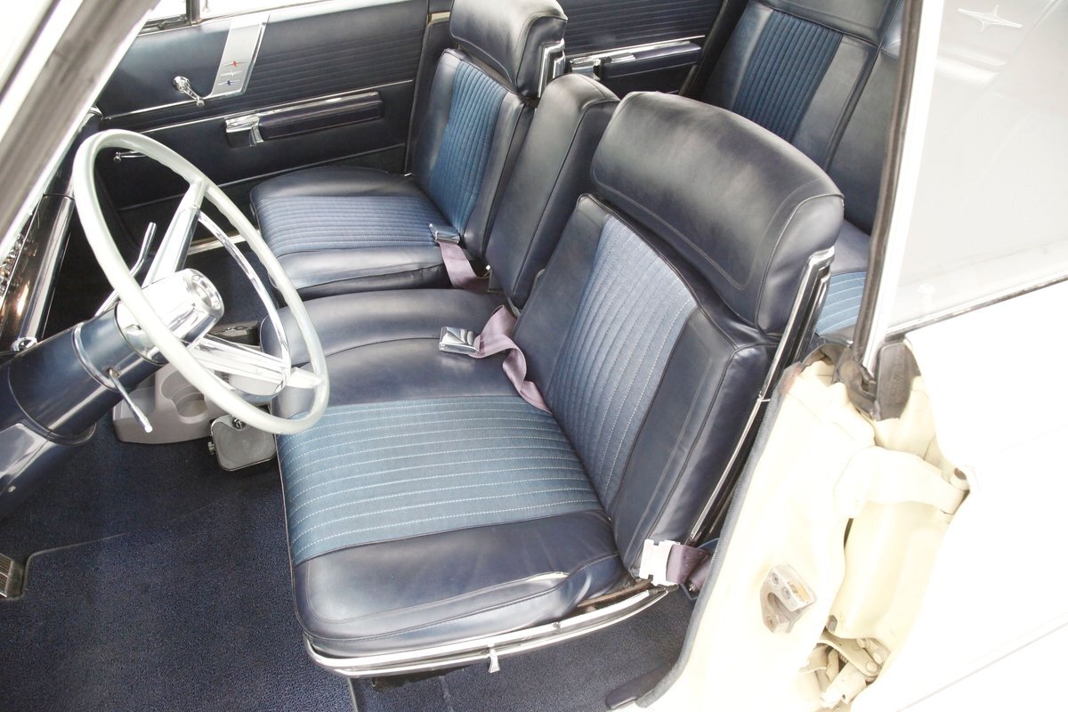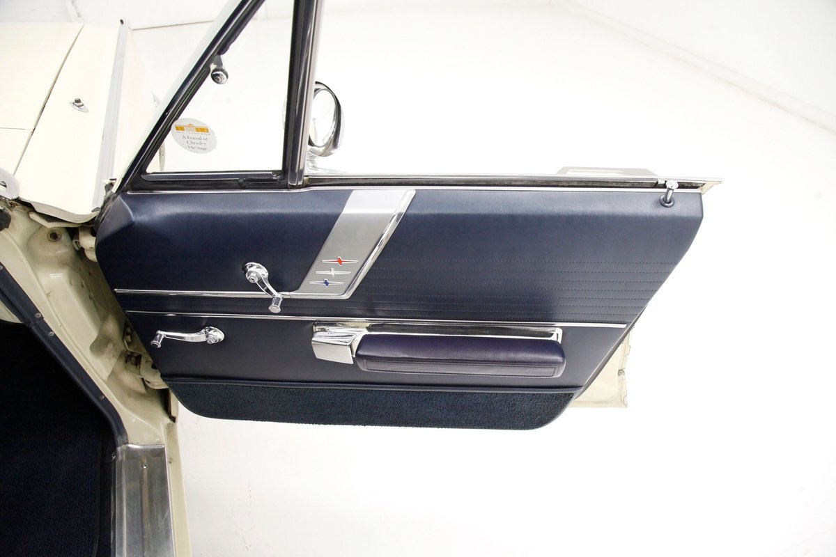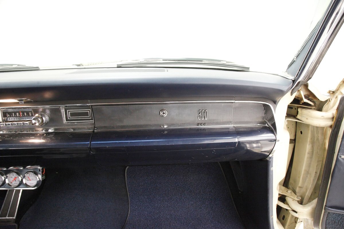 A swing of the massive but well-balanced doors and we are greeted with pristine panels that have a mixture of dark blue vinyl, red, white and blue 300 badges in an aluminum field, and some blue carpeting on the lowers. Slipping inside we see a large 70/30 split bench up front with some light blue tuck and roll inserts and smooth vinyl all in a lustrous dark blue. A central armrest can be folded up to provide an extra seat in the front, or to make room for your best girl to snuggle up with you. In the back we see a matching full bench with a mesh grille center speaker high up in the center. A slight tear is noted on the driver's front outer bolster but otherwise the seats front and rear are all good. A long steel dash with dark blue padded top present with an eyebrow bump up for the rounded instrument cluster and more vertical ribbed chrome have all the original and functioning controls. The heater slides along with the factory AM radio are present and accounted for in the middle of the dash and our consignor notes that a hidden Bluetooth stereo is onboard to satisfy your musical tastes. A trio of white face gauges hangs below the dash within a chrome bezel and dark blue carpet is installed and in good condition as is the dark blue headliner above which is nice and tight.