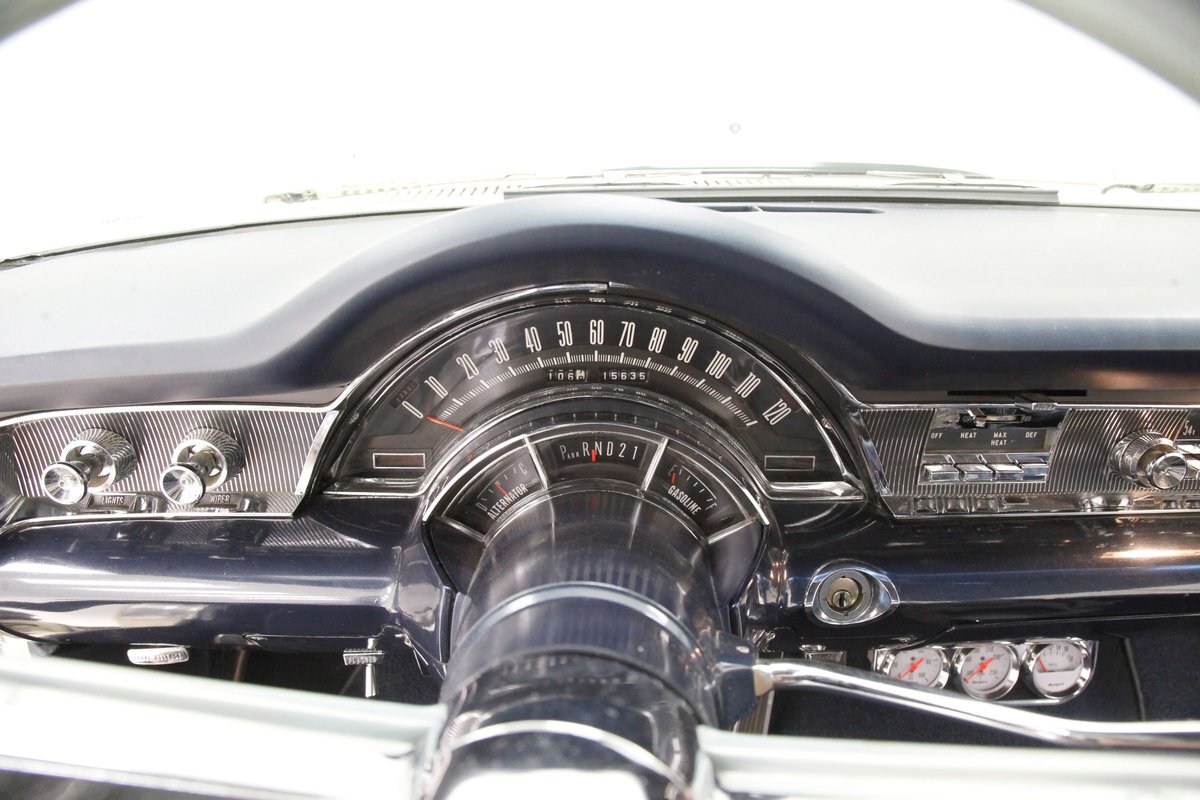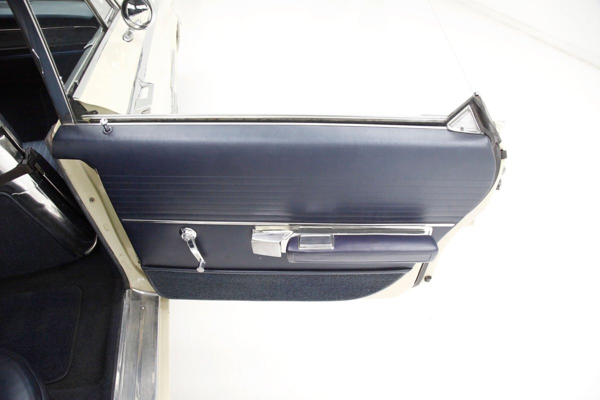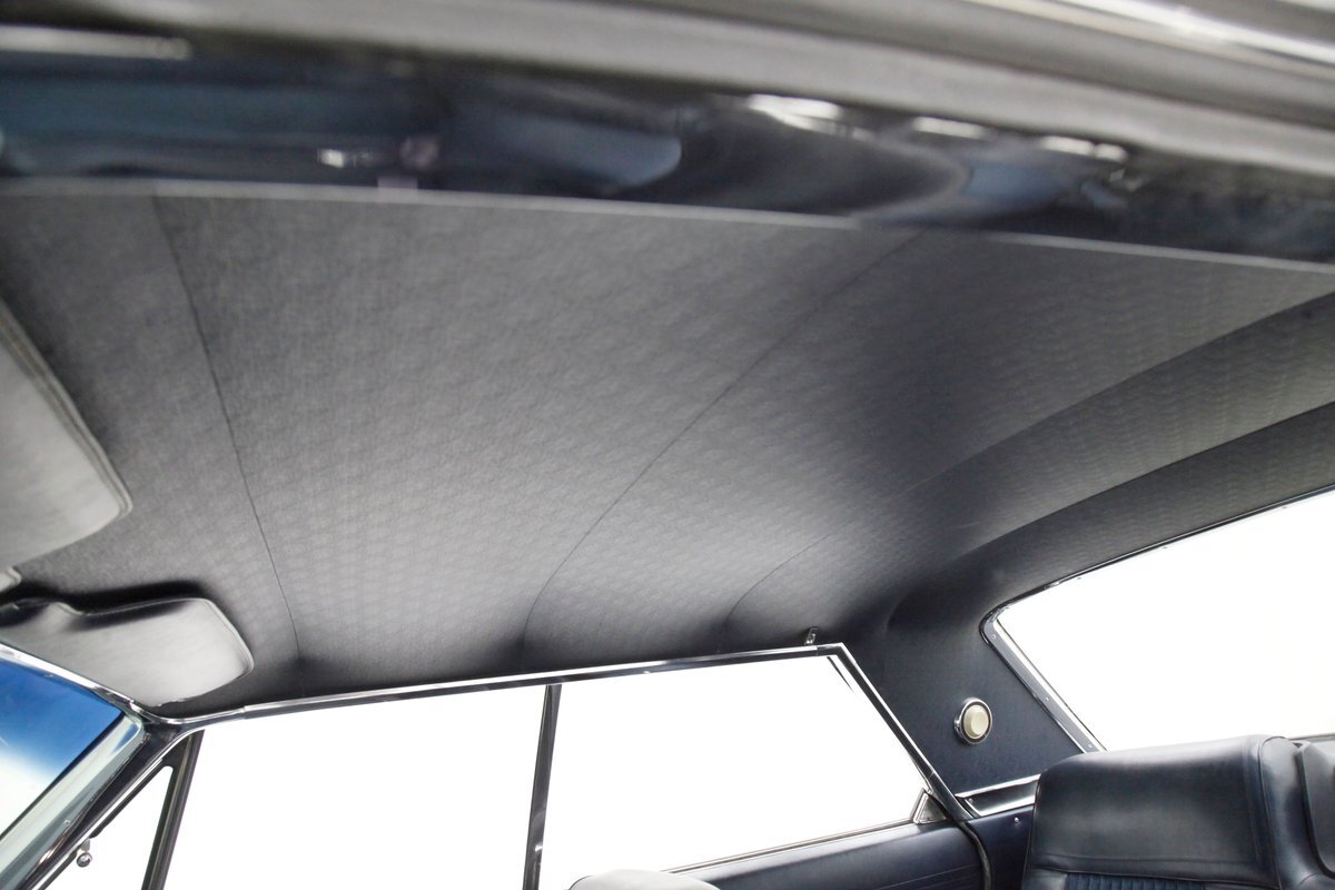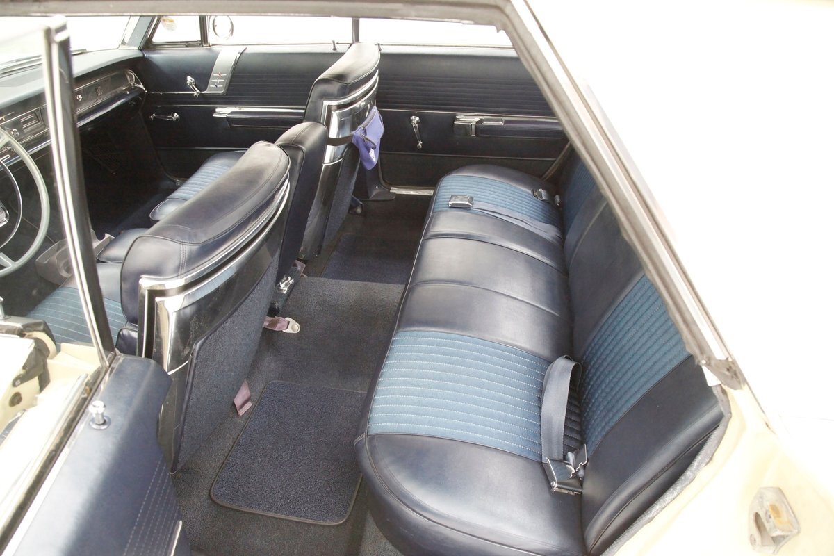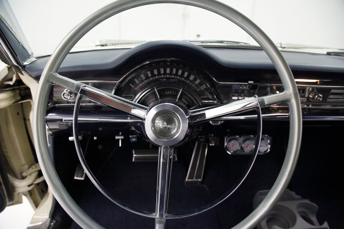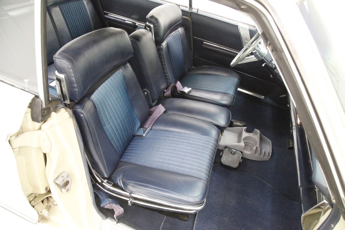 A swing of the massive but well-balanced doors and we are greeted with pristine panels that have a mixture of dark blue vinyl, red, white and blue 300 badges in an aluminum field, and some blue carpeting on the lowers. Slipping inside we see a large 70/30 split bench up front with some light blue tuck and roll inserts and smooth vinyl all in a lustrous dark blue. A central armrest can be folded up to provide an extra seat in the front, or to make room for your best girl to snuggle up with you. In the back we see a matching full bench with a mesh grille center speaker high up in the center. A slight tear is noted on the driver's front outer bolster but otherwise the seats front and rear are all good. A long steel dash with dark blue padded top present with an eyebrow bump up for the rounded instrument cluster and more vertical ribbed chrome have all the original and functioning controls. The heater slides along with the factory AM radio are present and accounted for in the middle of the dash and our consignor notes that a hidden Bluetooth stereo is onboard to satisfy your musical tastes. A trio of white face gauges hangs below the dash within a chrome bezel and dark blue carpet is installed and in good condition as is the dark blue headliner above which is nice and tight.