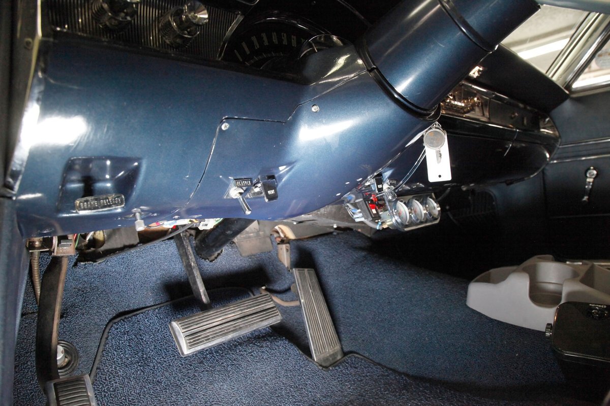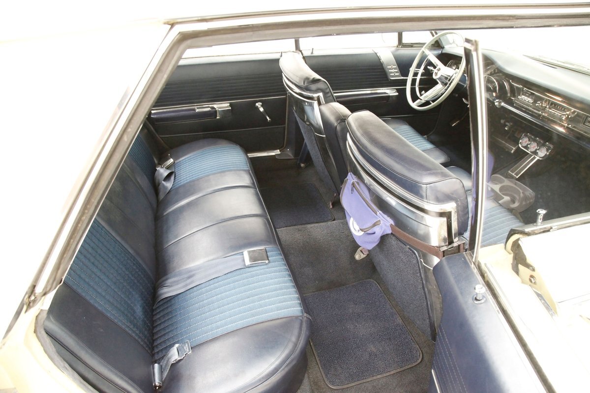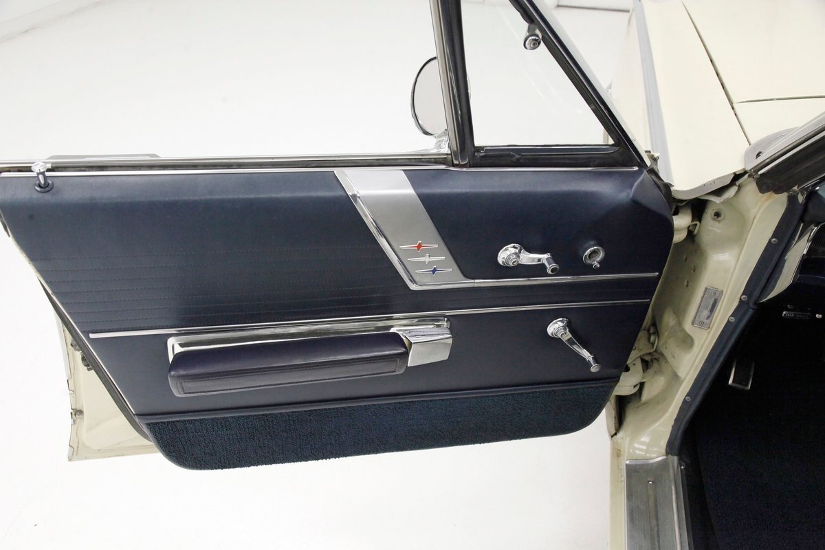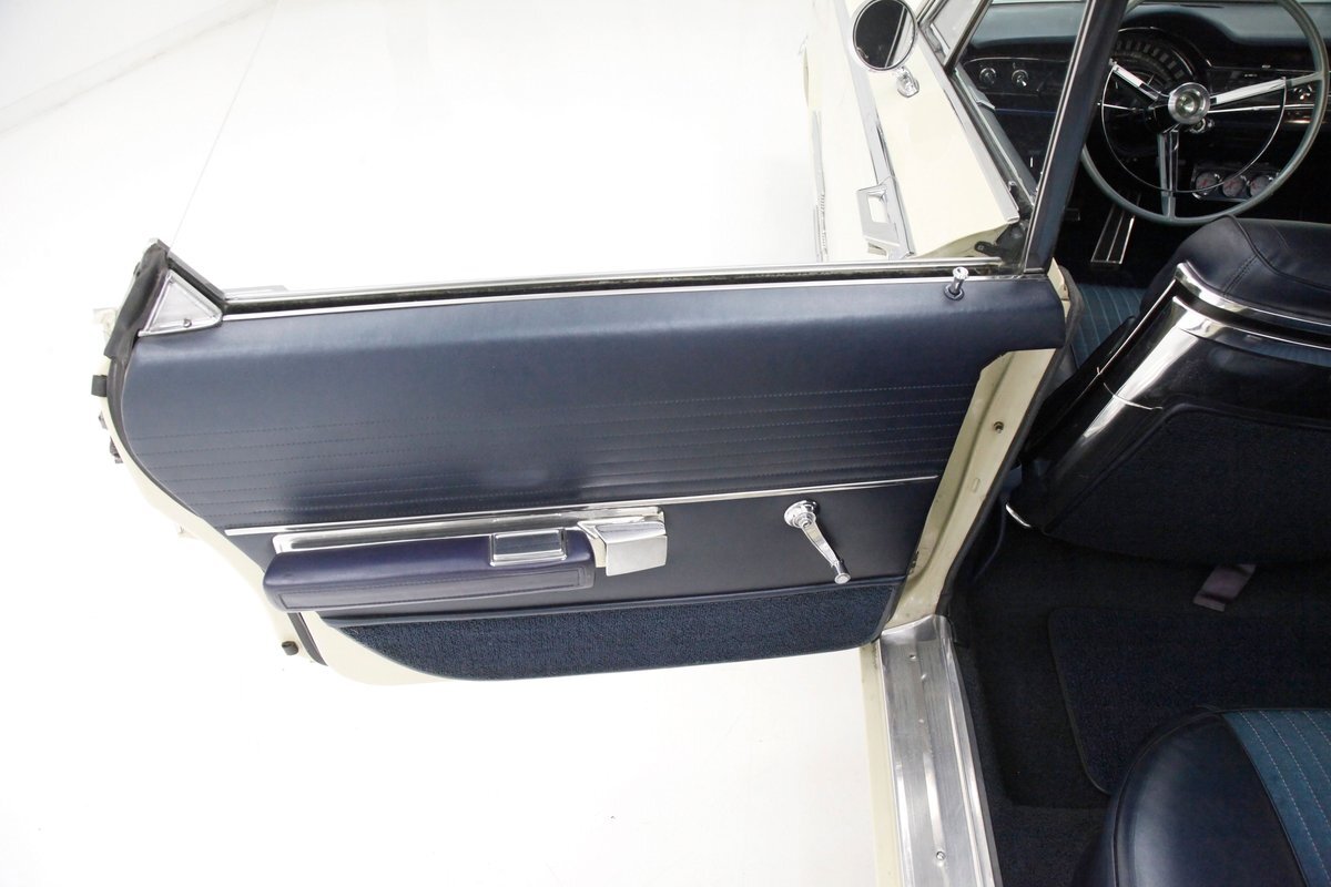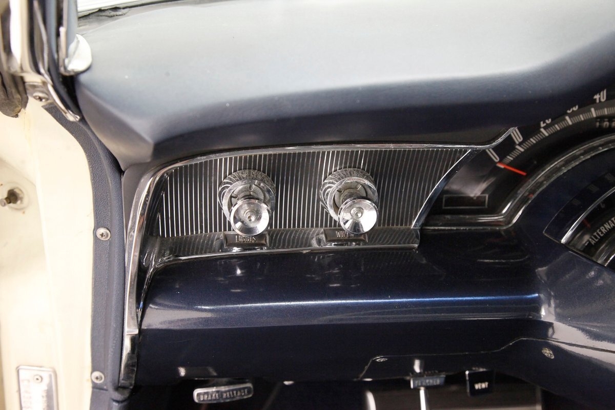 A swing of the massive but well-balanced doors and we are greeted with pristine panels that have a mixture of dark blue vinyl, red, white and blue 300 badges in an aluminum field, and some blue carpeting on the lowers. Slipping inside we see a large 70/30 split bench up front with some light blue tuck and roll inserts and smooth vinyl all in a lustrous dark blue. A central armrest can be folded up to provide an extra seat in the front, or to make room for your best girl to snuggle up with you. In the back we see a matching full bench with a mesh grille center speaker high up in the center. A slight tear is noted on the driver's front outer bolster but otherwise the seats front and rear are all good. A long steel dash with dark blue padded top present with an eyebrow bump up for the rounded instrument cluster and more vertical ribbed chrome have all the original and functioning controls. The heater slides along with the factory AM radio are present and accounted for in the middle of the dash and our consignor notes that a hidden Bluetooth stereo is onboard to satisfy your musical tastes. A trio of white face gauges hangs below the dash within a chrome bezel and dark blue carpet is installed and in good condition as is the dark blue headliner above which is nice and tight.
