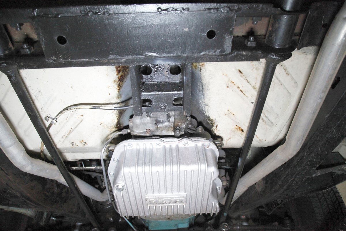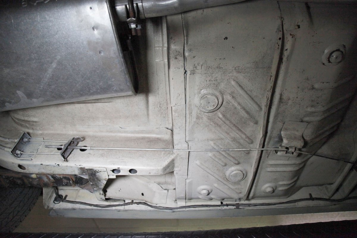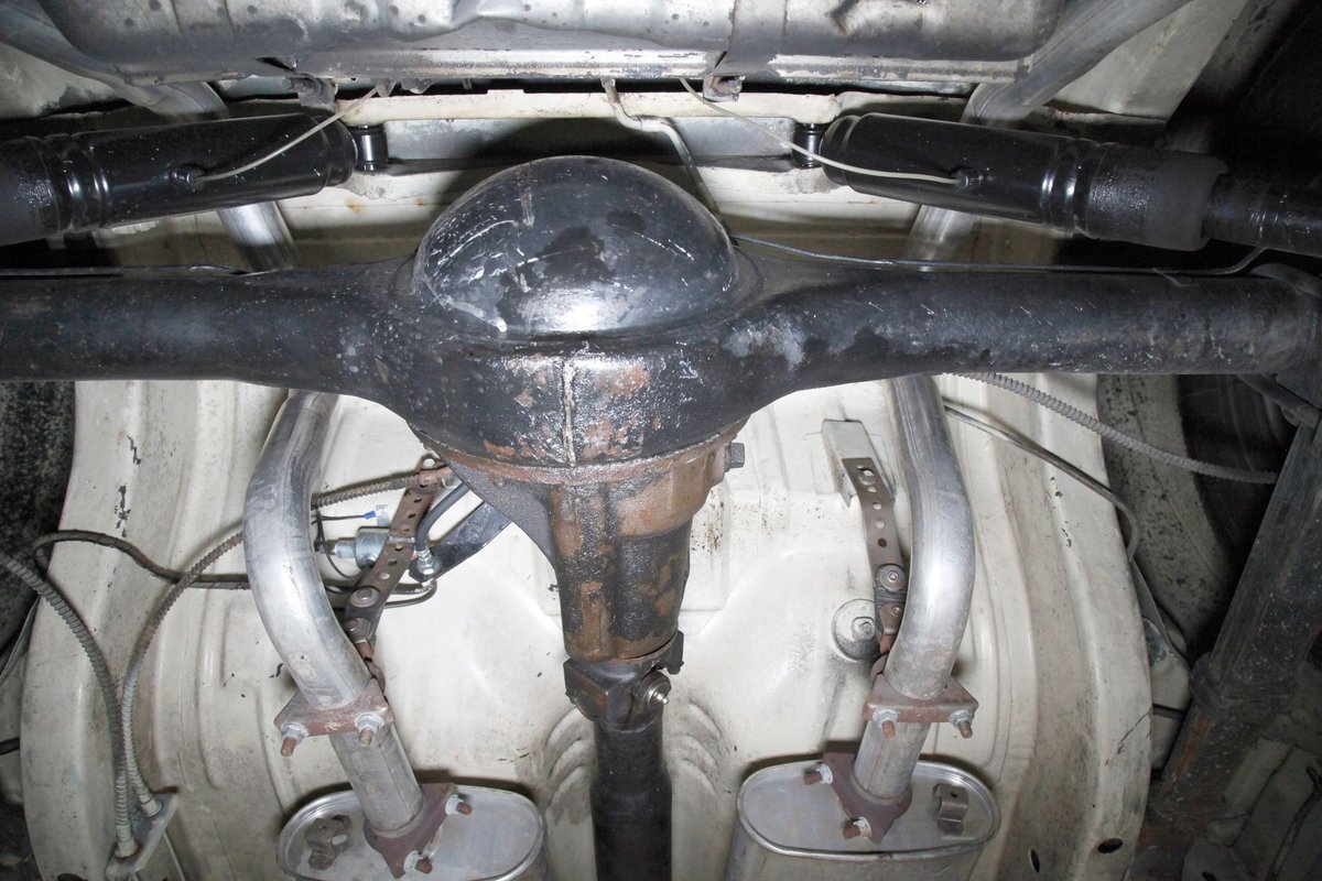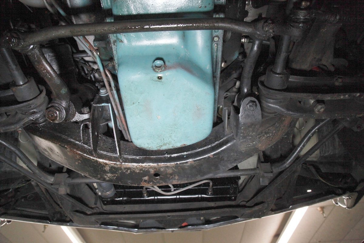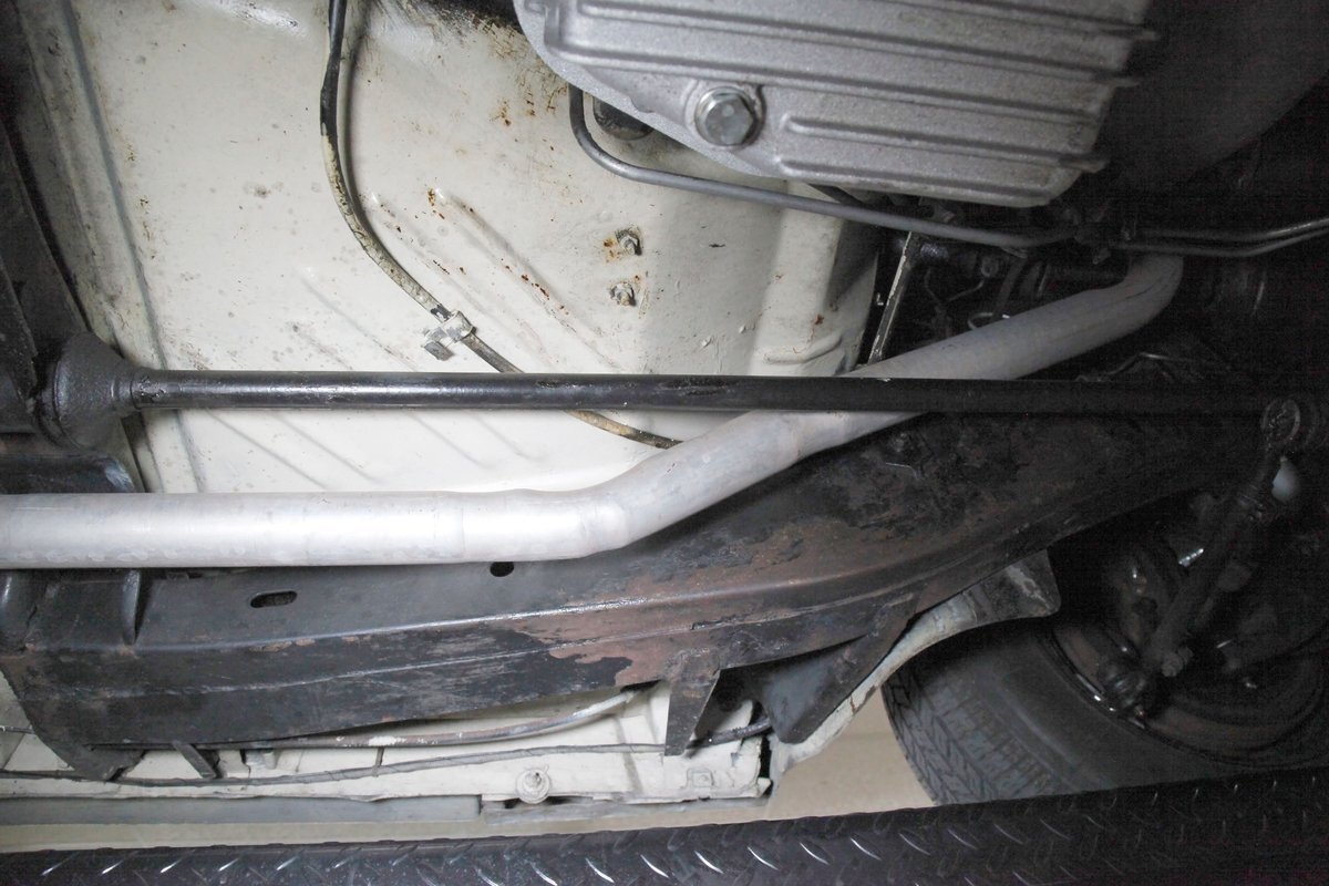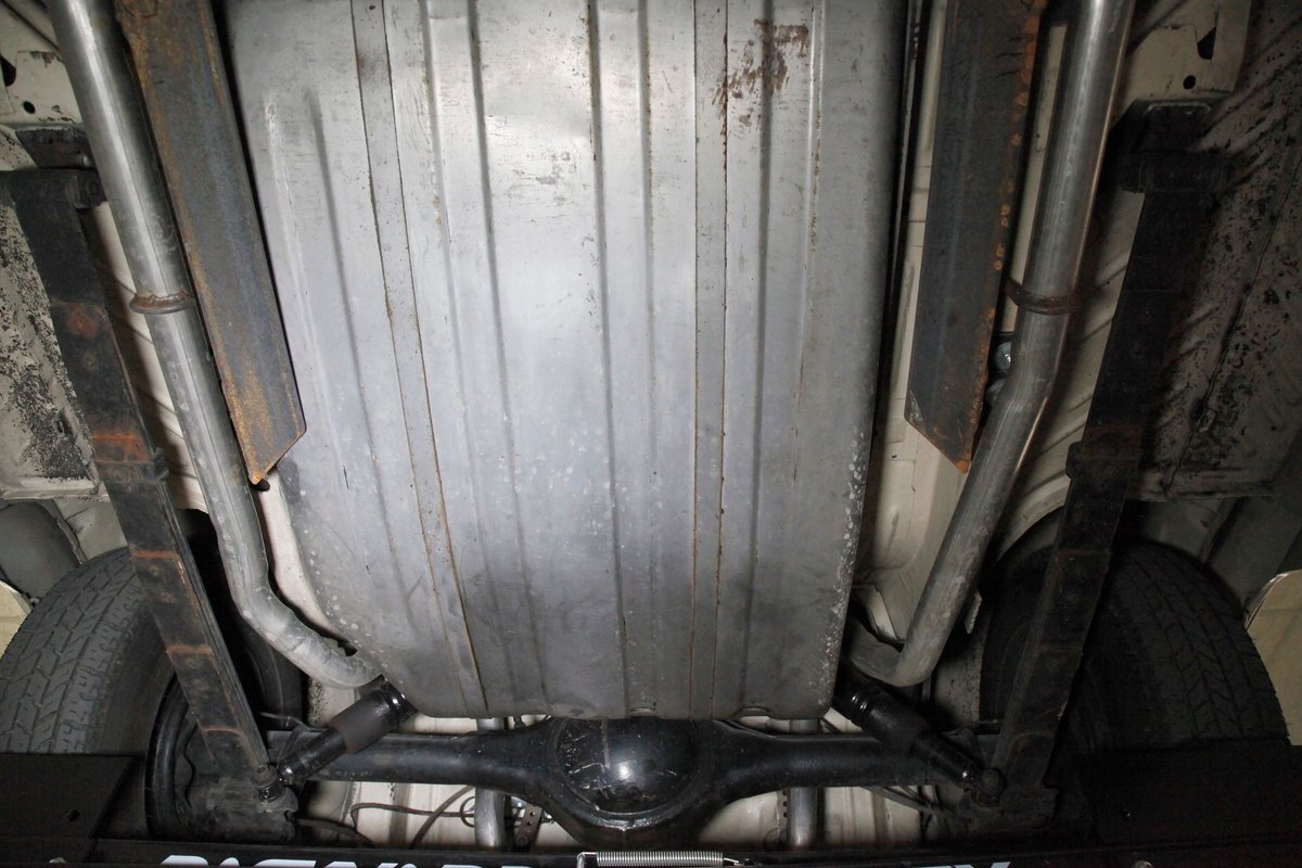 Nice straight steel with some surface rusting, good Ivory floor pans, wheel wells, and all clear on the mechanical front are seen underneath. Independent torsion bar upfront, and leaf springs in the rear make up the suspension, and power drum brakes with a new dual reservoir master cylinder, fresh shoes, hardware, soft lines and wheel cylinders are all around. A newer stock style dual exhaust system is now on to handle the exhale from the big V8 up front.