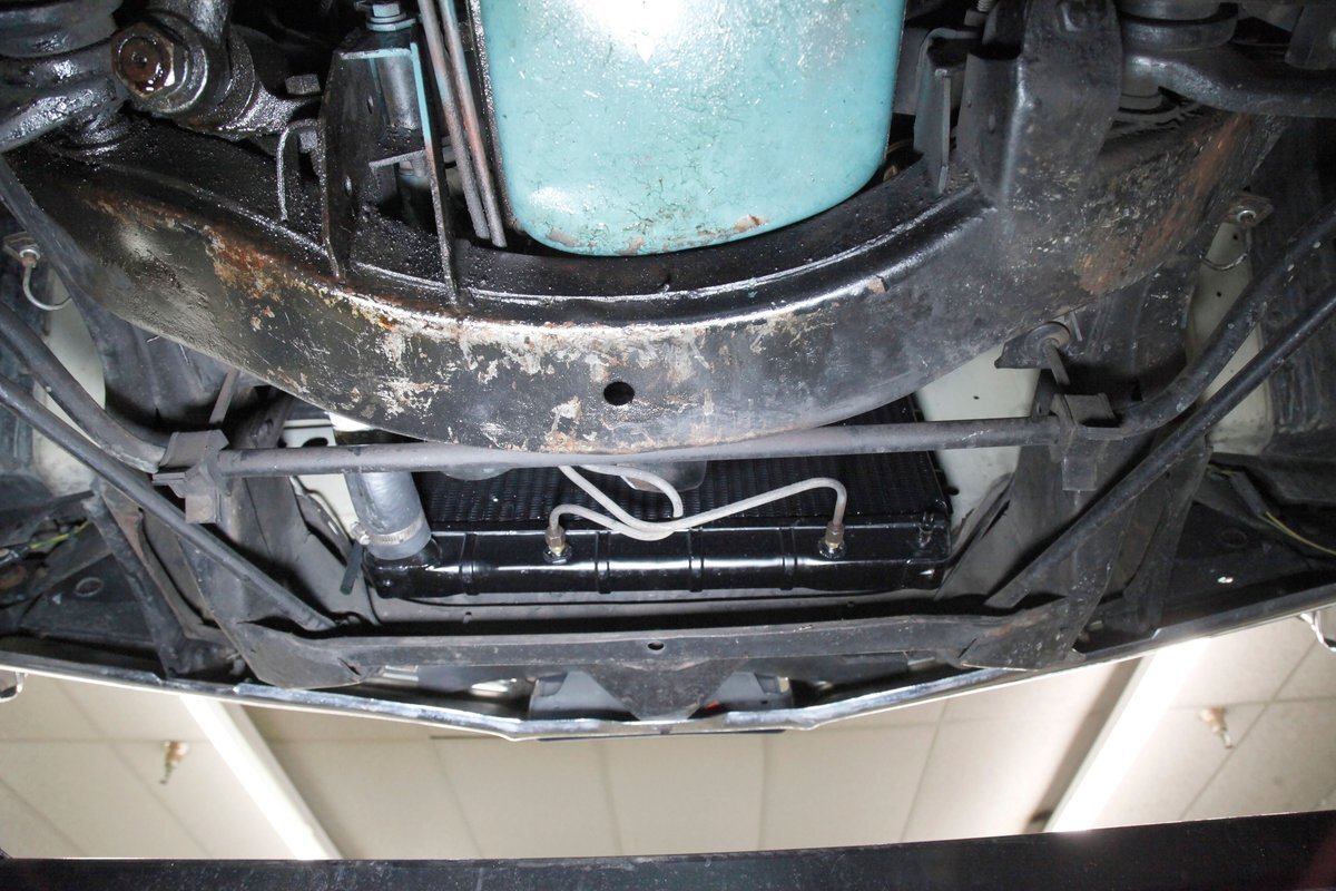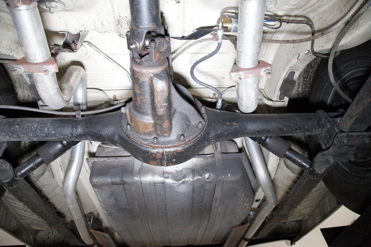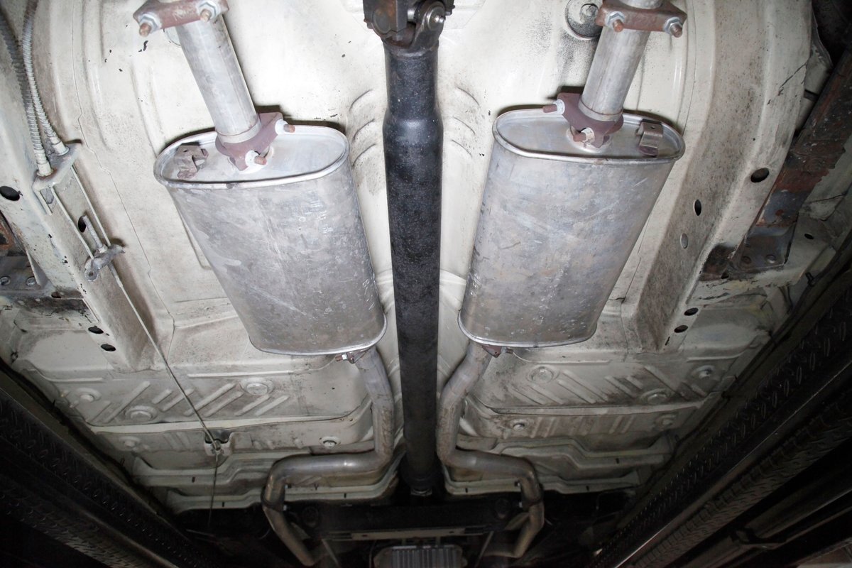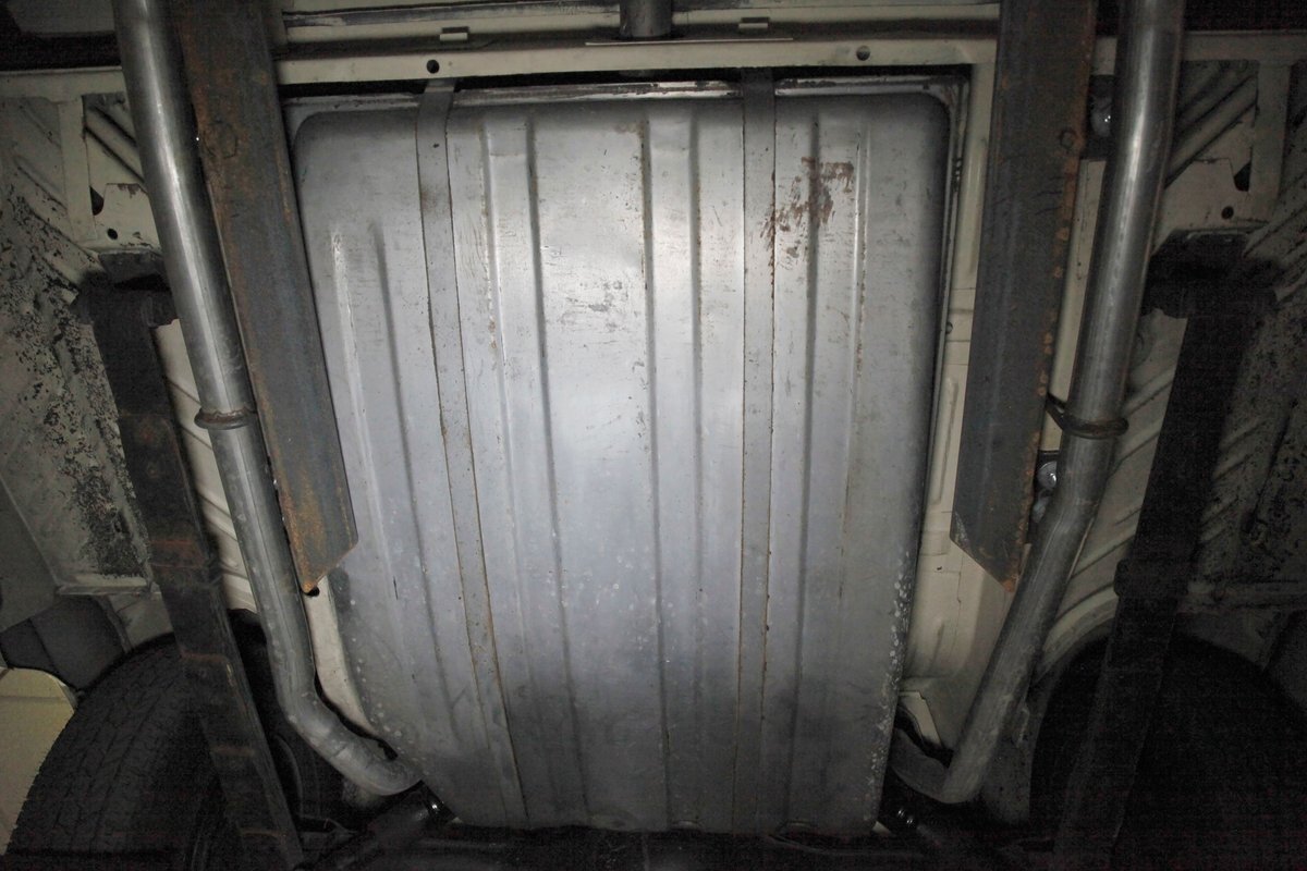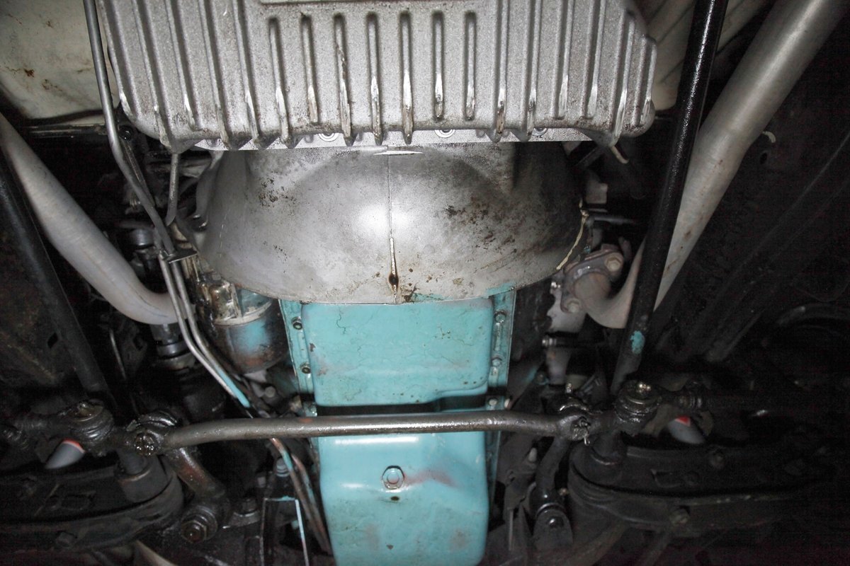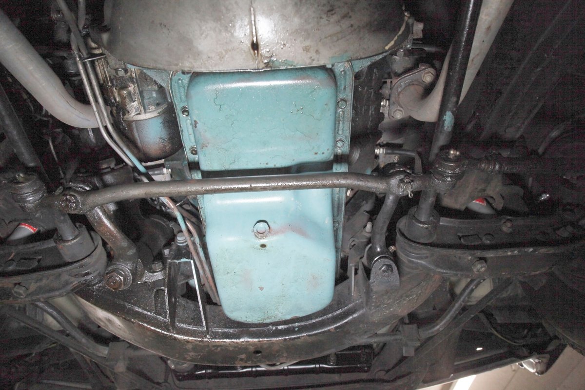 Nice straight steel with some surface rusting, good Ivory floor pans, wheel wells, and all clear on the mechanical front are seen underneath. Independent torsion bar upfront, and leaf springs in the rear make up the suspension, and power drum brakes with a new dual reservoir master cylinder, fresh shoes, hardware, soft lines and wheel cylinders are all around. A newer stock style dual exhaust system is now on to handle the exhale from the big V8 up front.