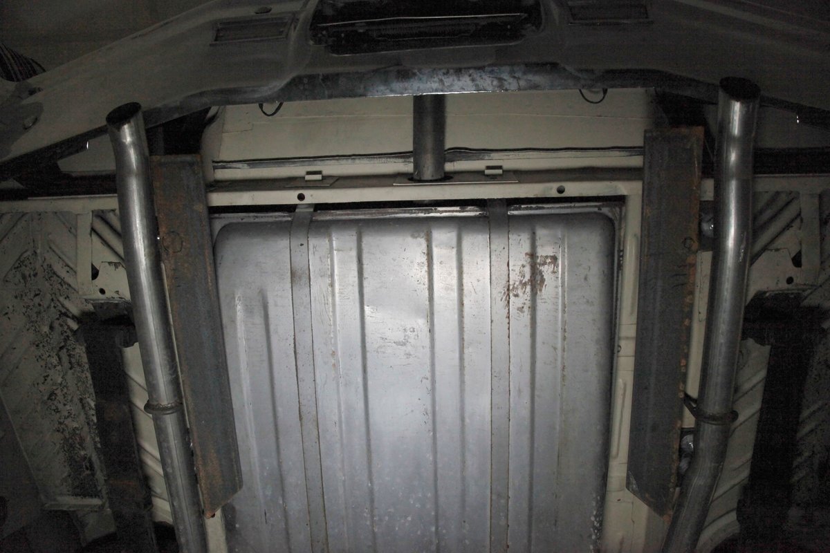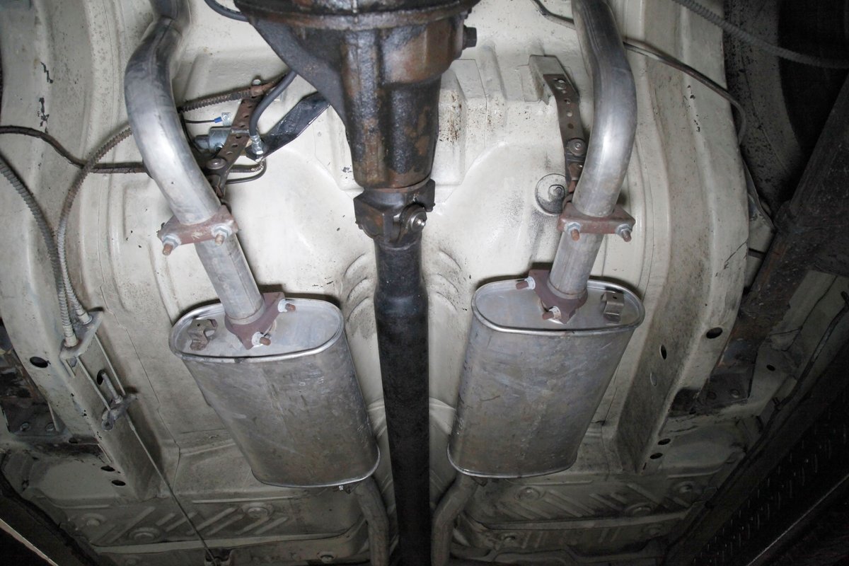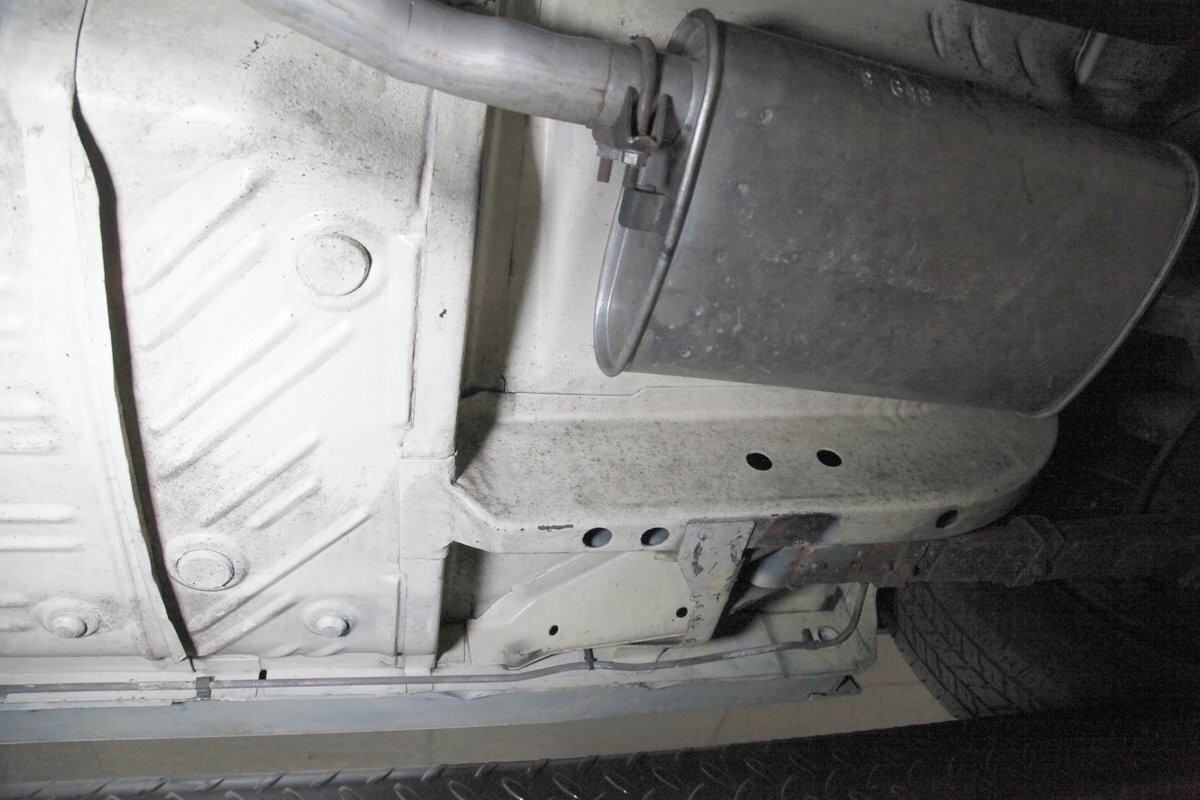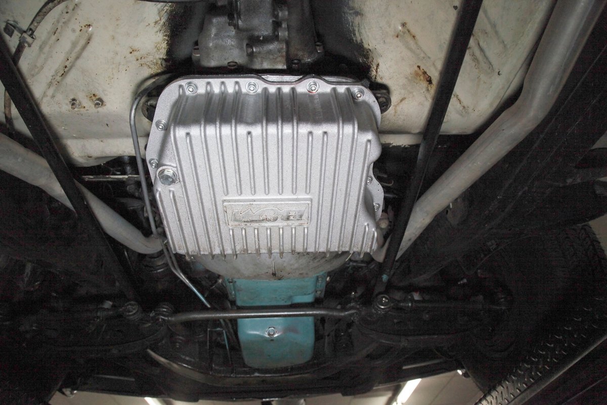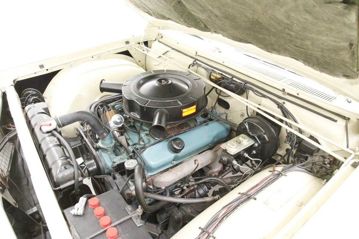 Nice straight steel with some surface rusting, good Ivory floor pans, wheel wells, and all clear on the mechanical front are seen underneath. Independent torsion bar upfront, and leaf springs in the rear make up the suspension, and power drum brakes with a new dual reservoir master cylinder, fresh shoes, hardware, soft lines and wheel cylinders are all around. A newer stock style dual exhaust system is now on to handle the exhale from the big V8 up front.