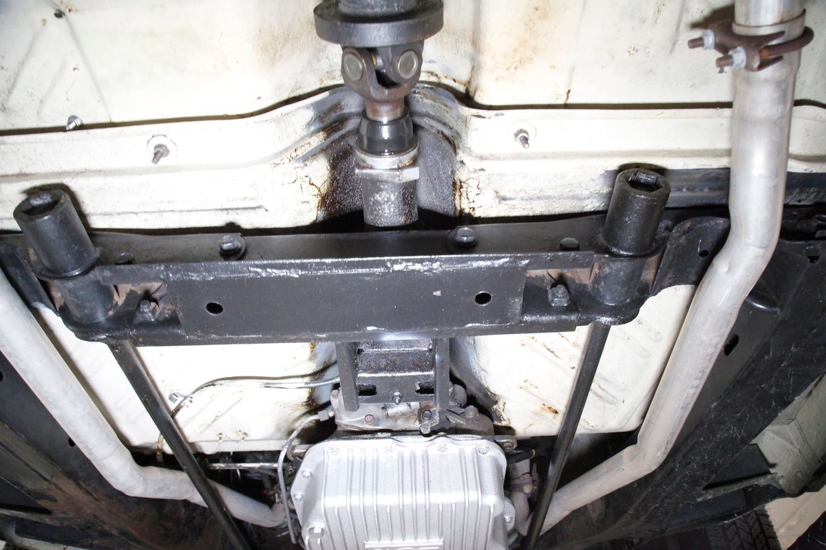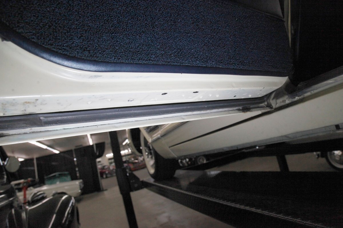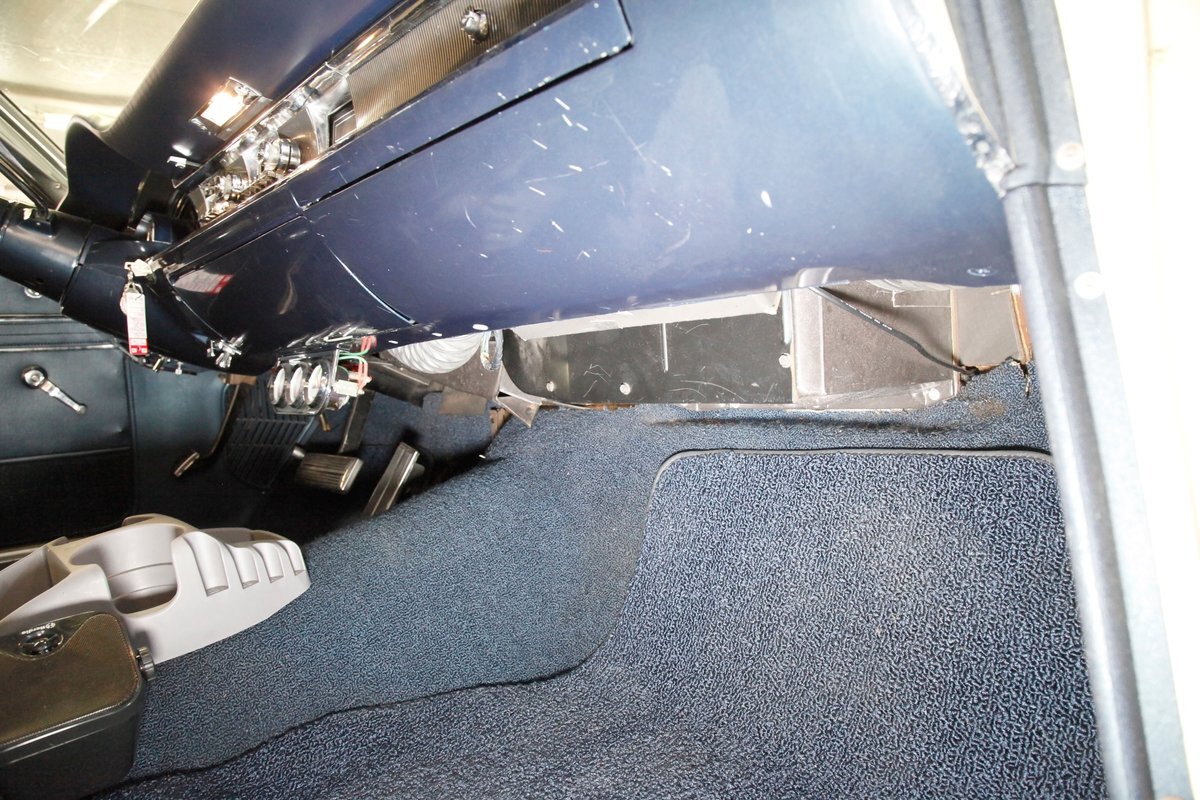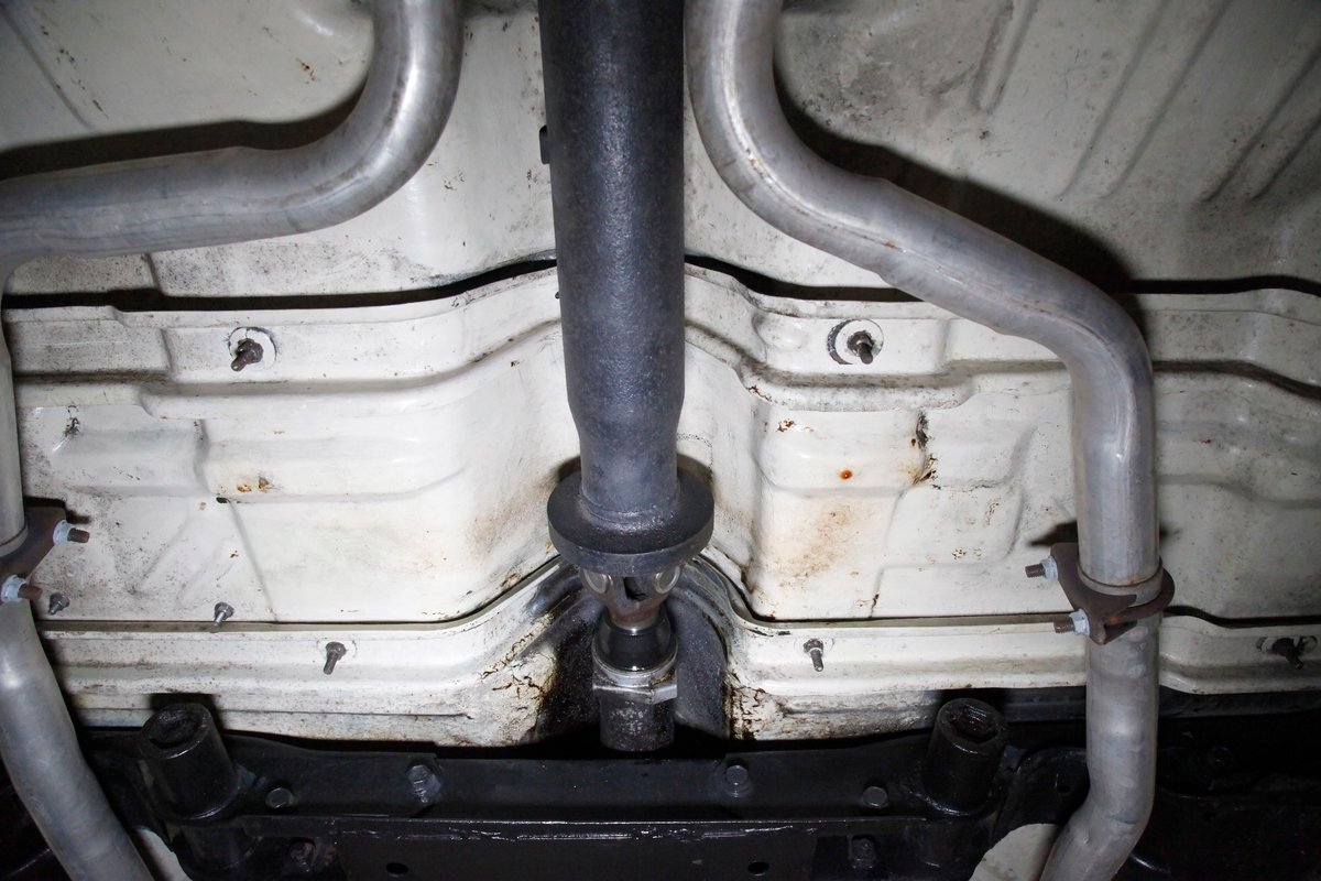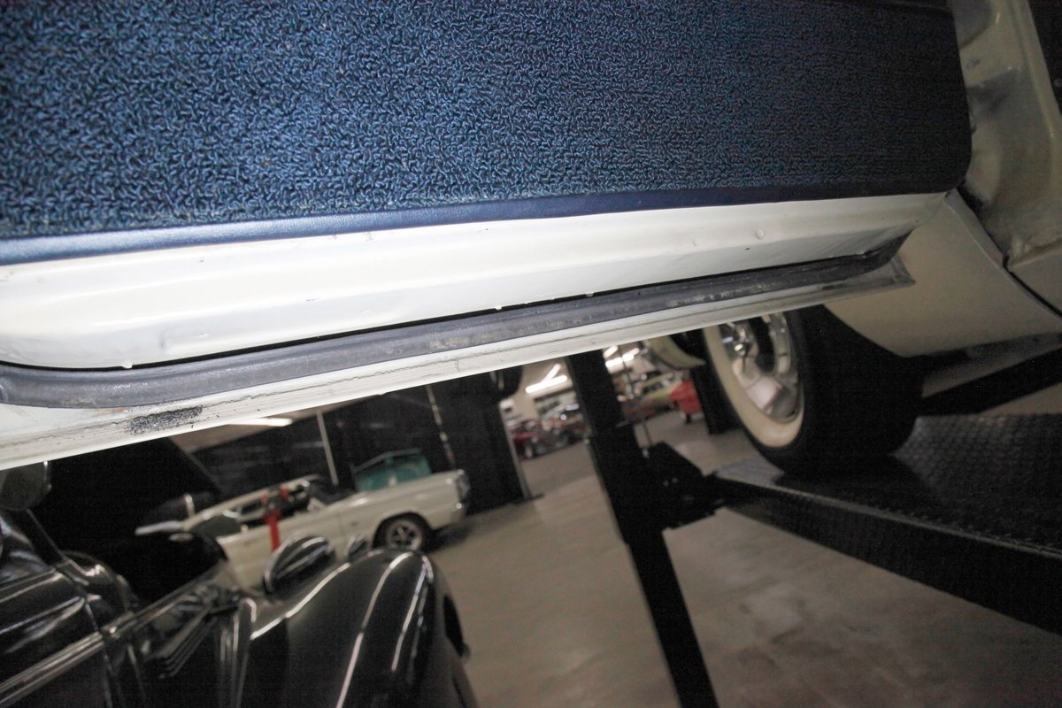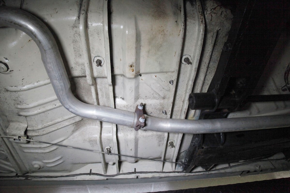 Nice straight steel with some surface rusting, good Ivory floor pans, wheel wells, and all clear on the mechanical front are seen underneath. Independent torsion bar upfront, and leaf springs in the rear make up the suspension, and power drum brakes with a new dual reservoir master cylinder, fresh shoes, hardware, soft lines and wheel cylinders are all around. A newer stock style dual exhaust system is now on to handle the exhale from the big V8 up front.