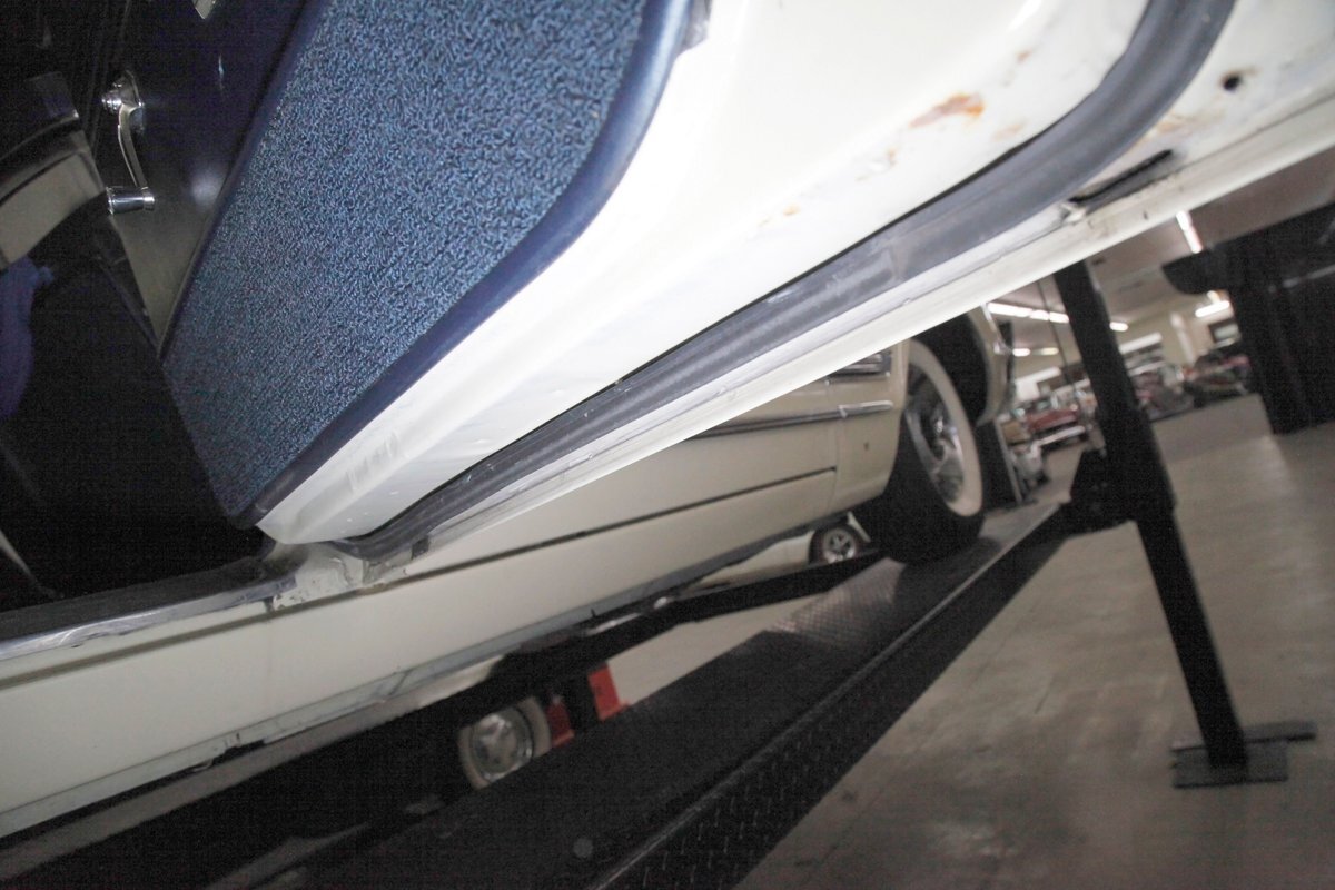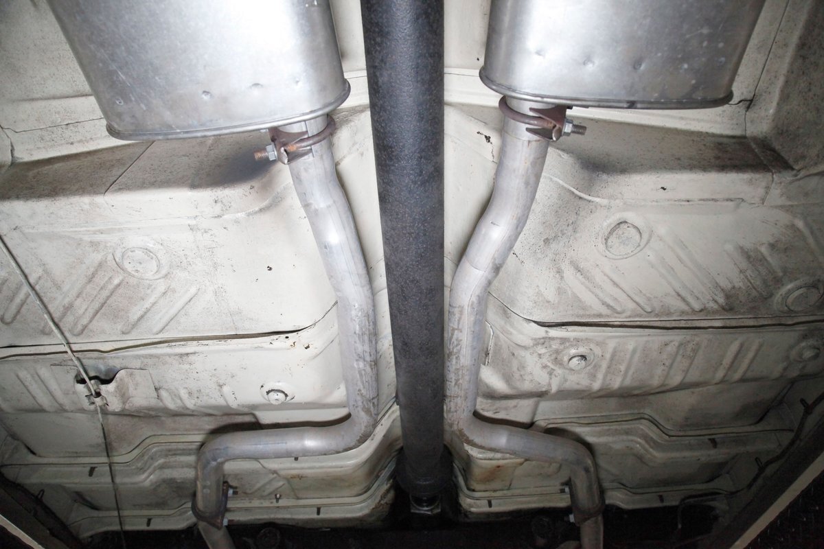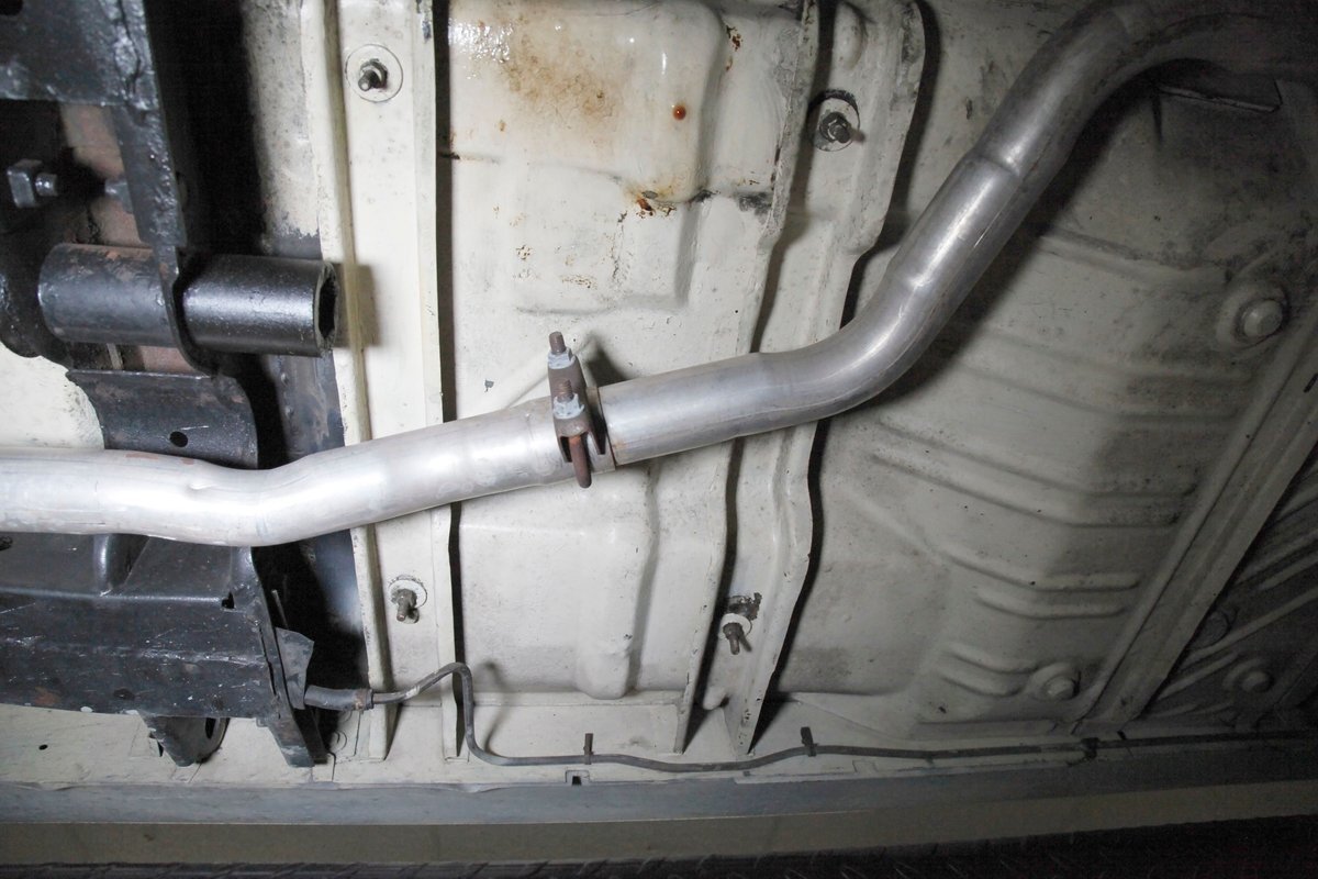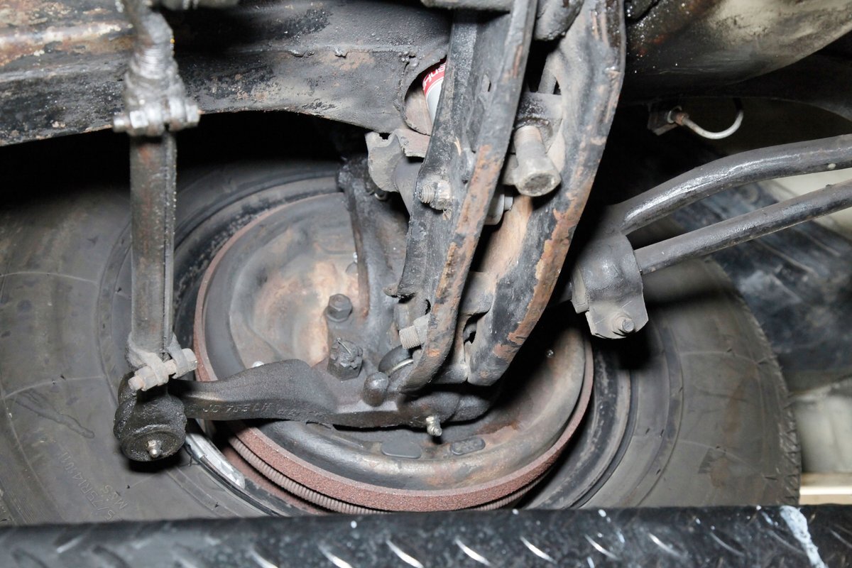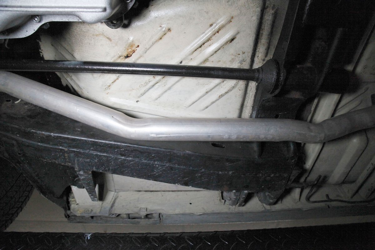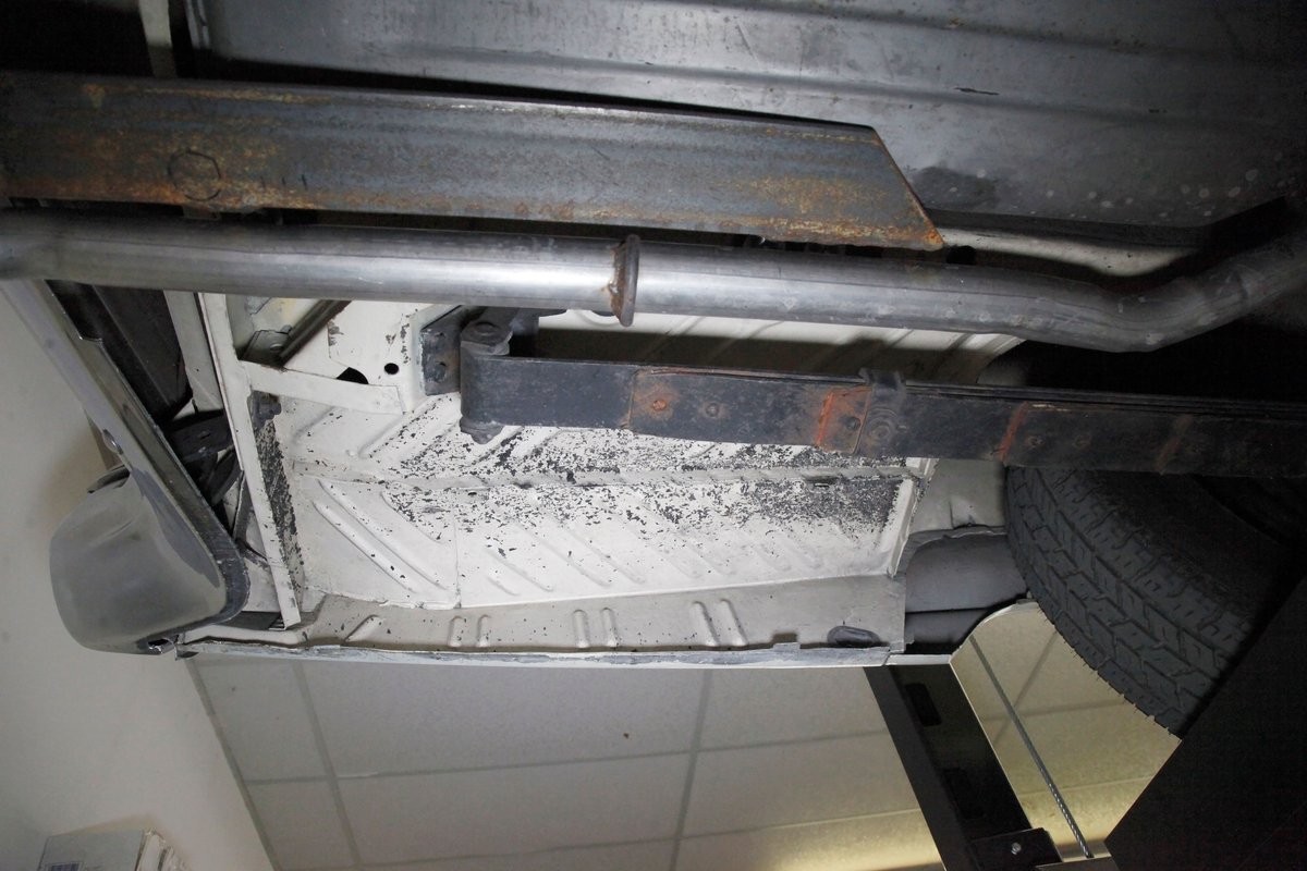 Nice straight steel with some surface rusting, good Ivory floor pans, wheel wells, and all clear on the mechanical front are seen underneath. Independent torsion bar upfront, and leaf springs in the rear make up the suspension, and power drum brakes with a new dual reservoir master cylinder, fresh shoes, hardware, soft lines and wheel cylinders are all around. A newer stock style dual exhaust system is now on to handle the exhale from the big V8 up front.
