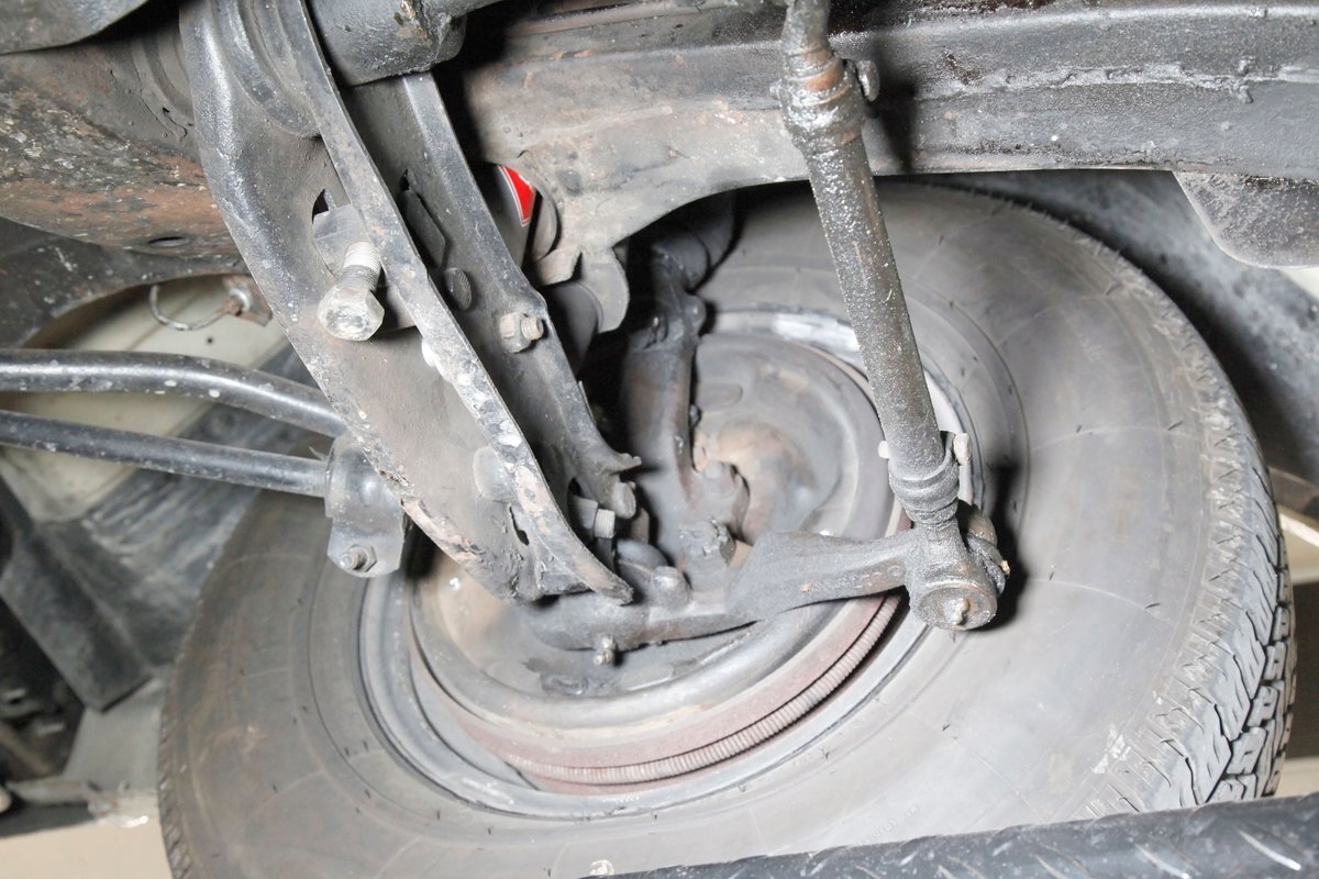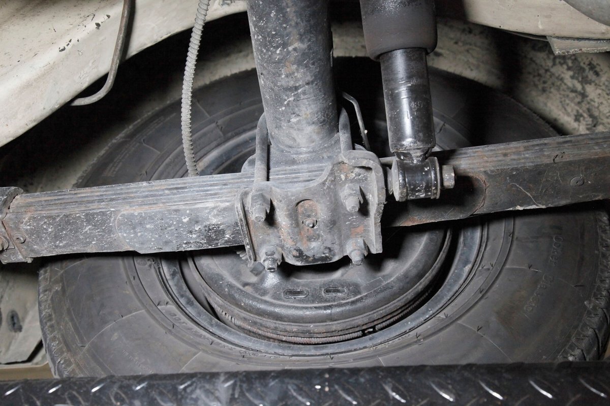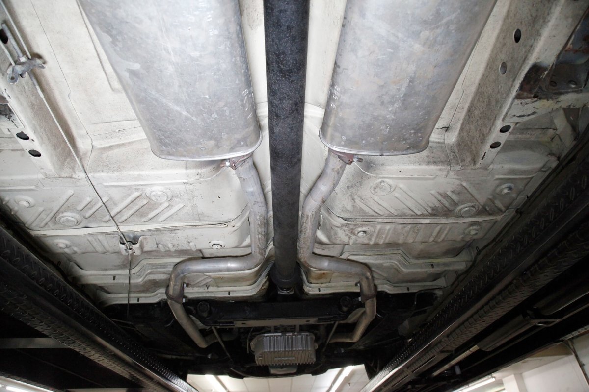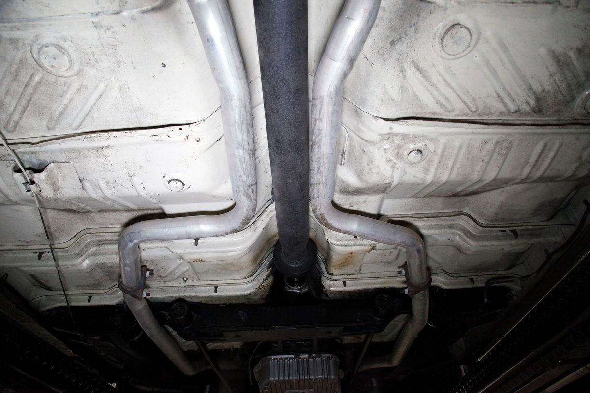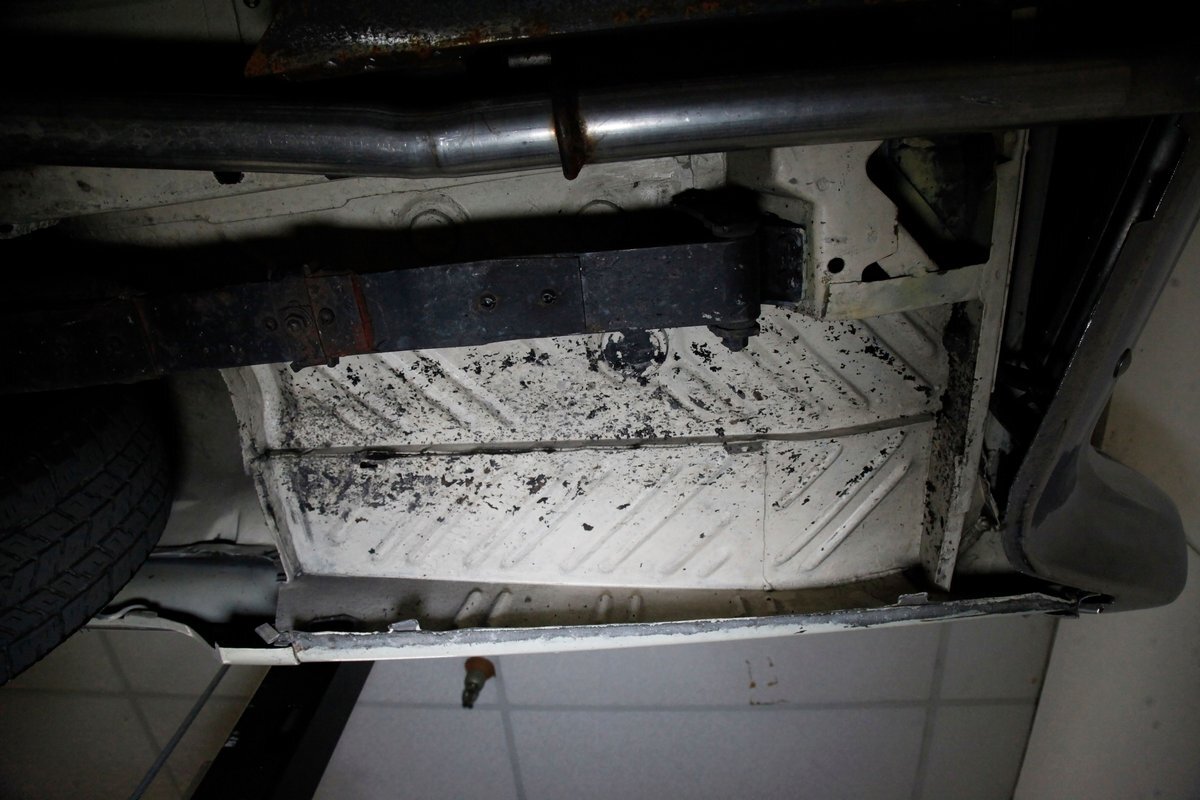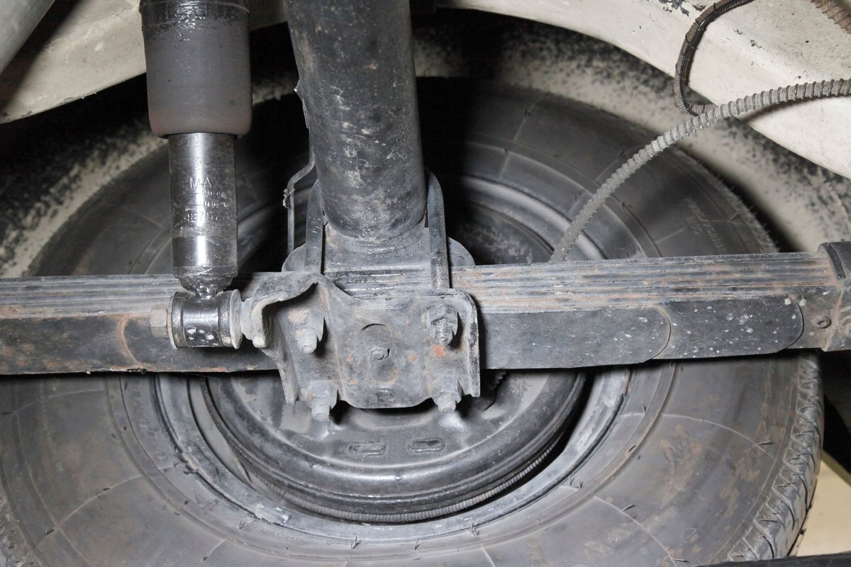 Nice straight steel with some surface rusting, good Ivory floor pans, wheel wells, and all clear on the mechanical front are seen underneath. Independent torsion bar upfront, and leaf springs in the rear make up the suspension, and power drum brakes with a new dual reservoir master cylinder, fresh shoes, hardware, soft lines and wheel cylinders are all around. A newer stock style dual exhaust system is now on to handle the exhale from the big V8 up front.