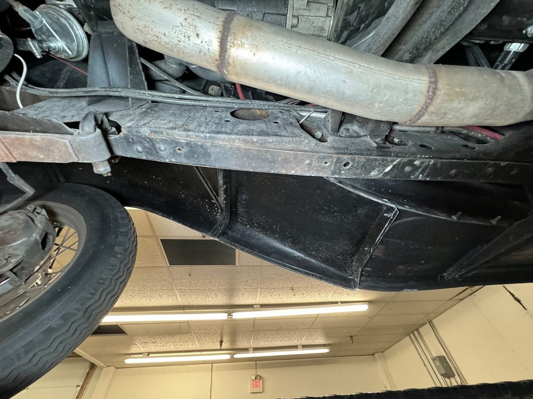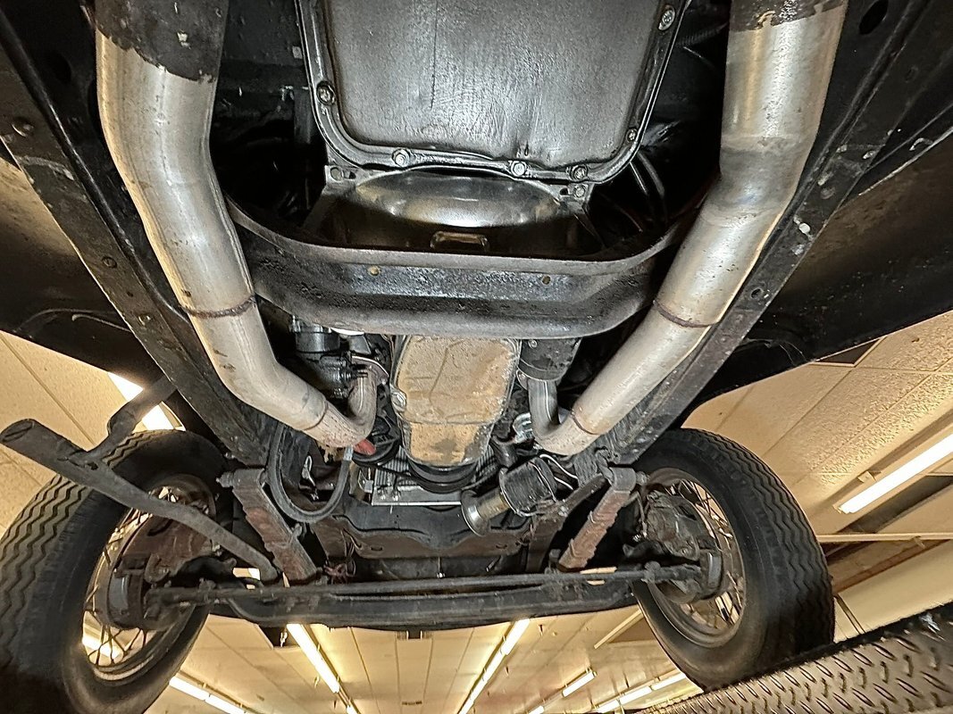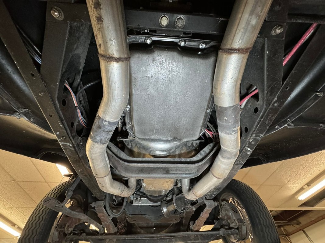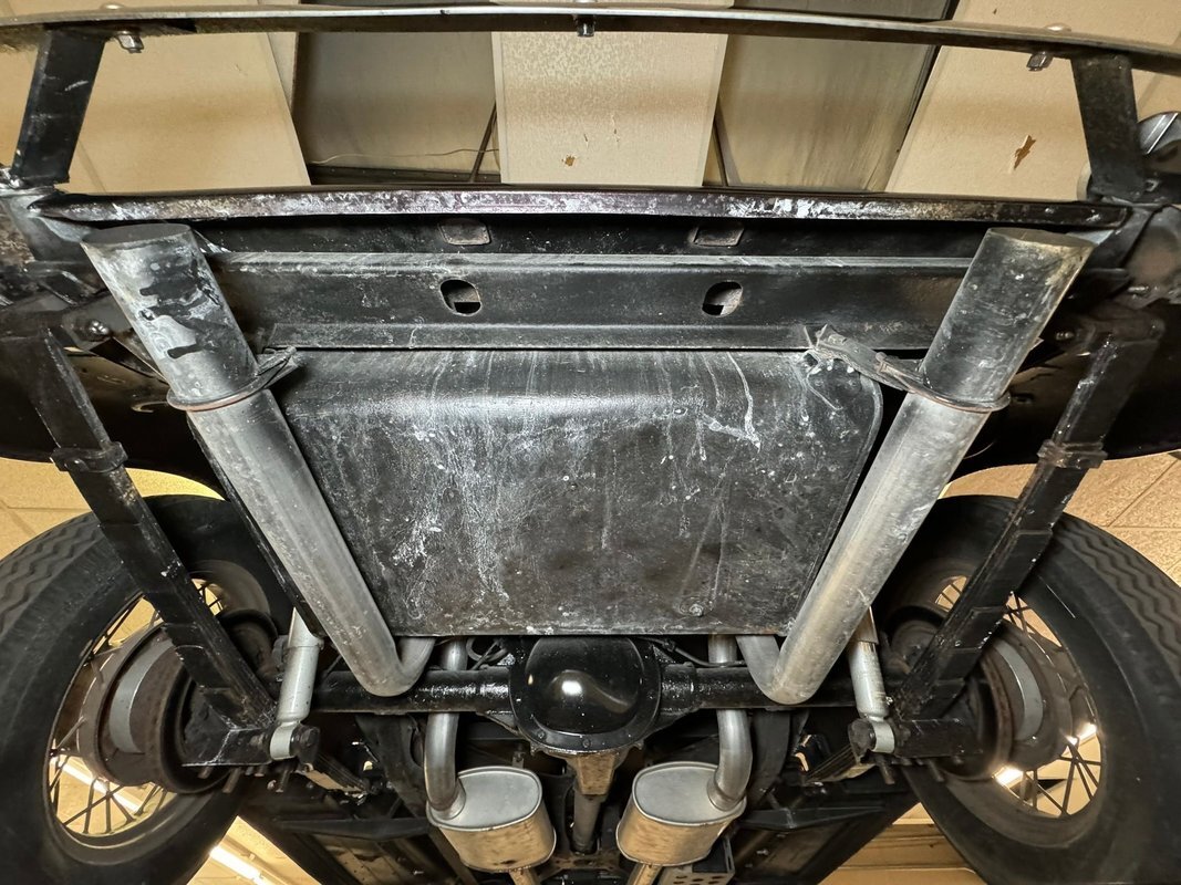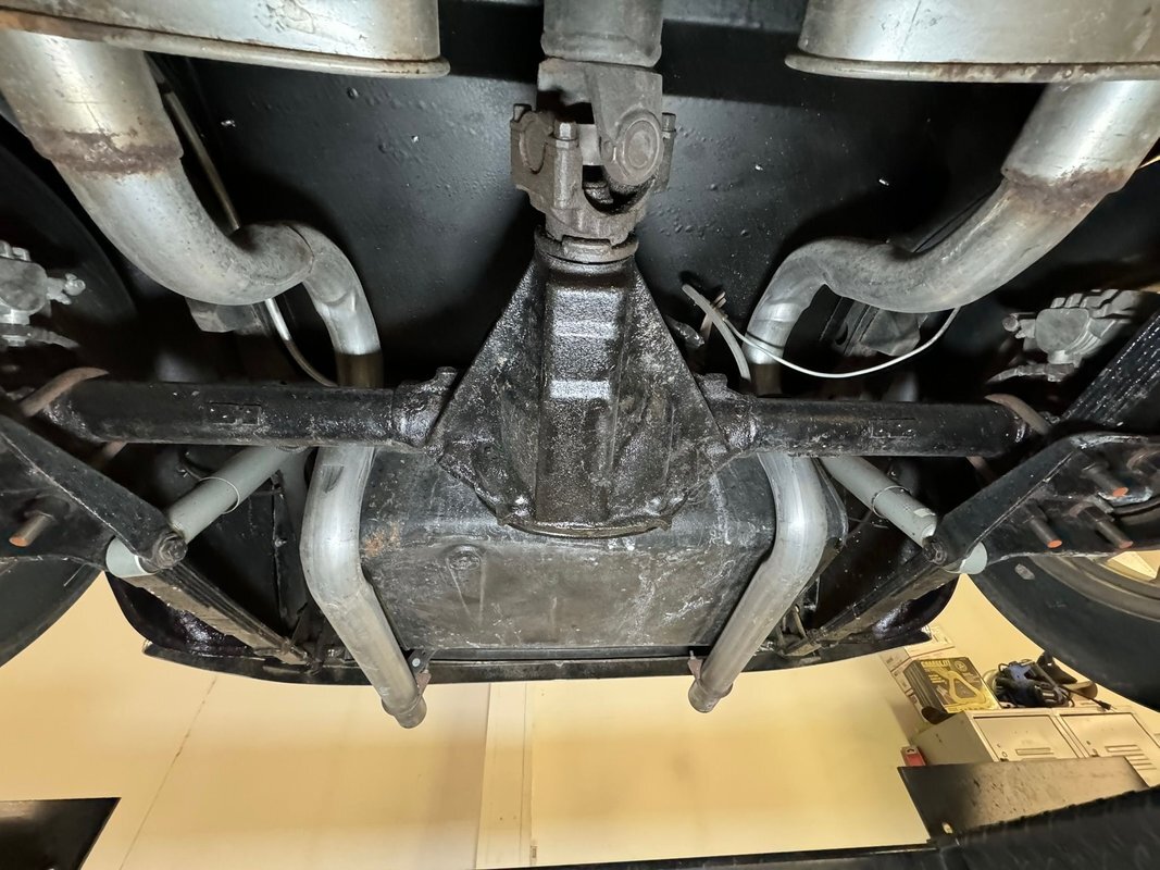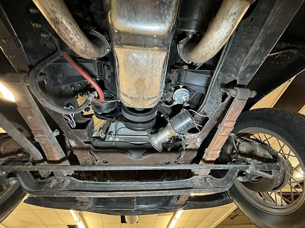 Our consignor states the undercarriage has been undercoated, and it is relatively clean and dry underneath in uniform black. The dual exhaust flows back from the headers into a pair of turbo mufflers then exits discreetly just below the rear bumper. Leaf spring suspension, as it was in 1933 is found front and rear. We note a bit of residual oil on the rear differential.