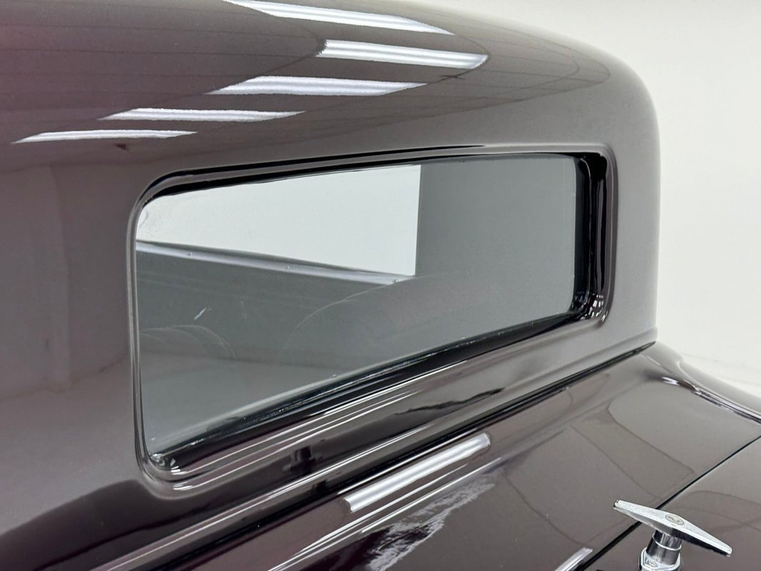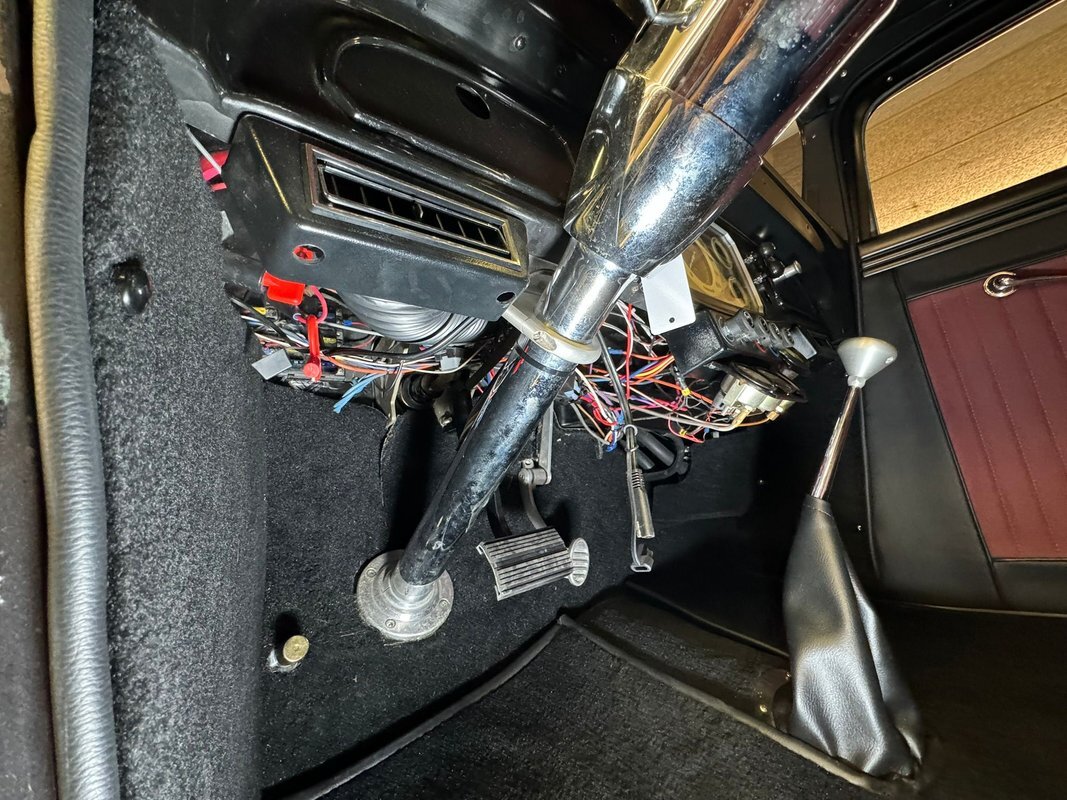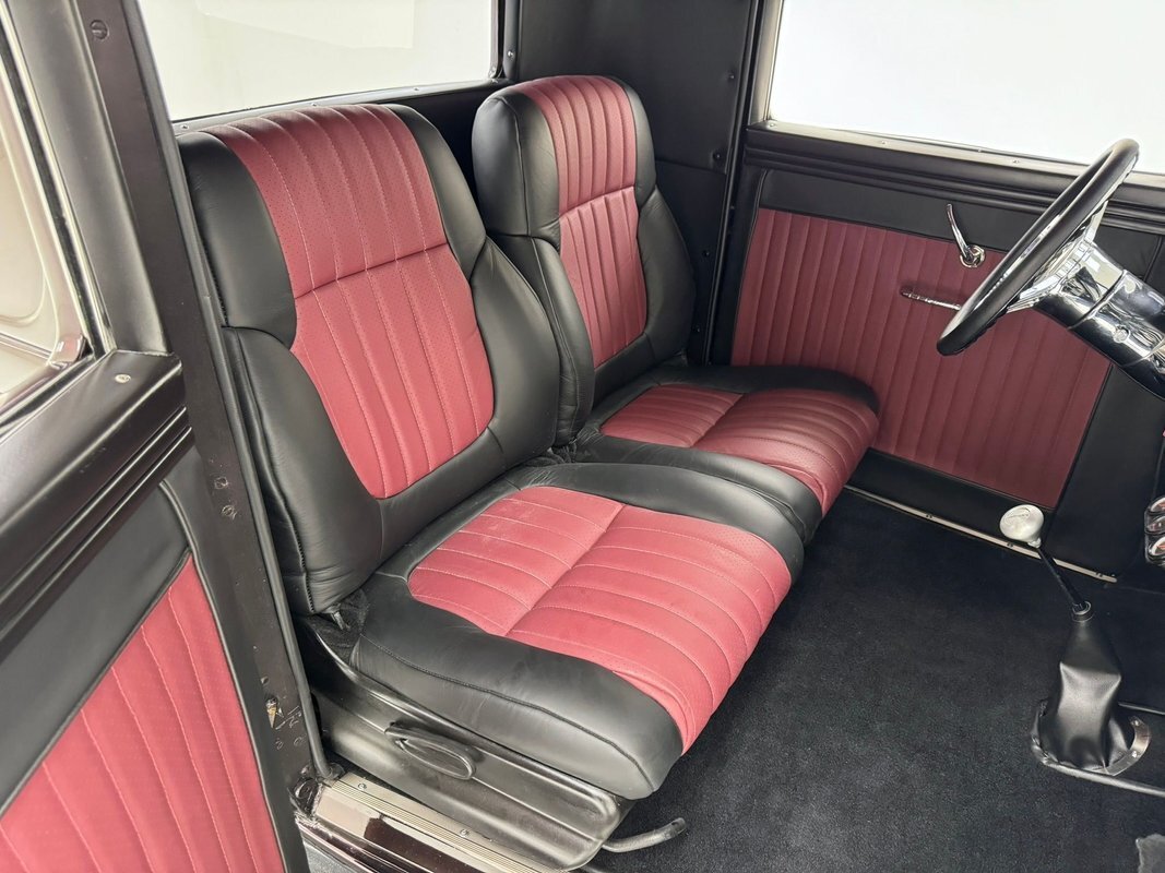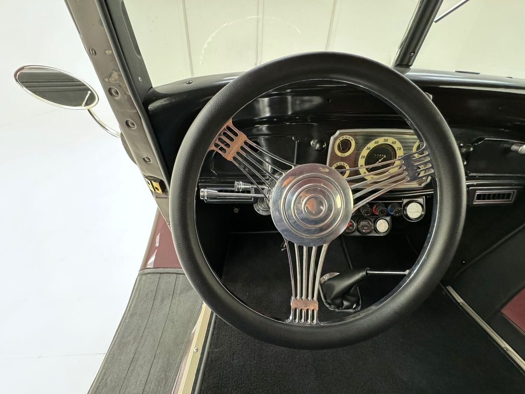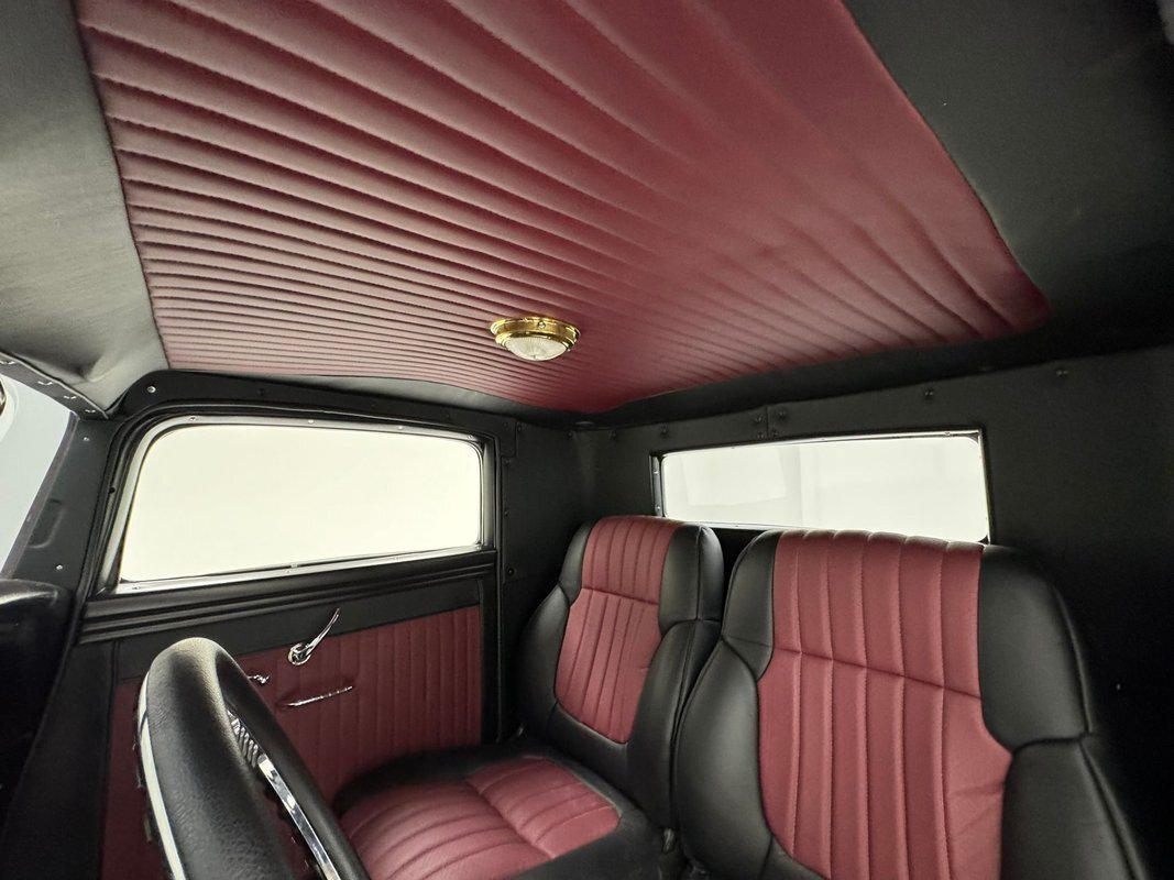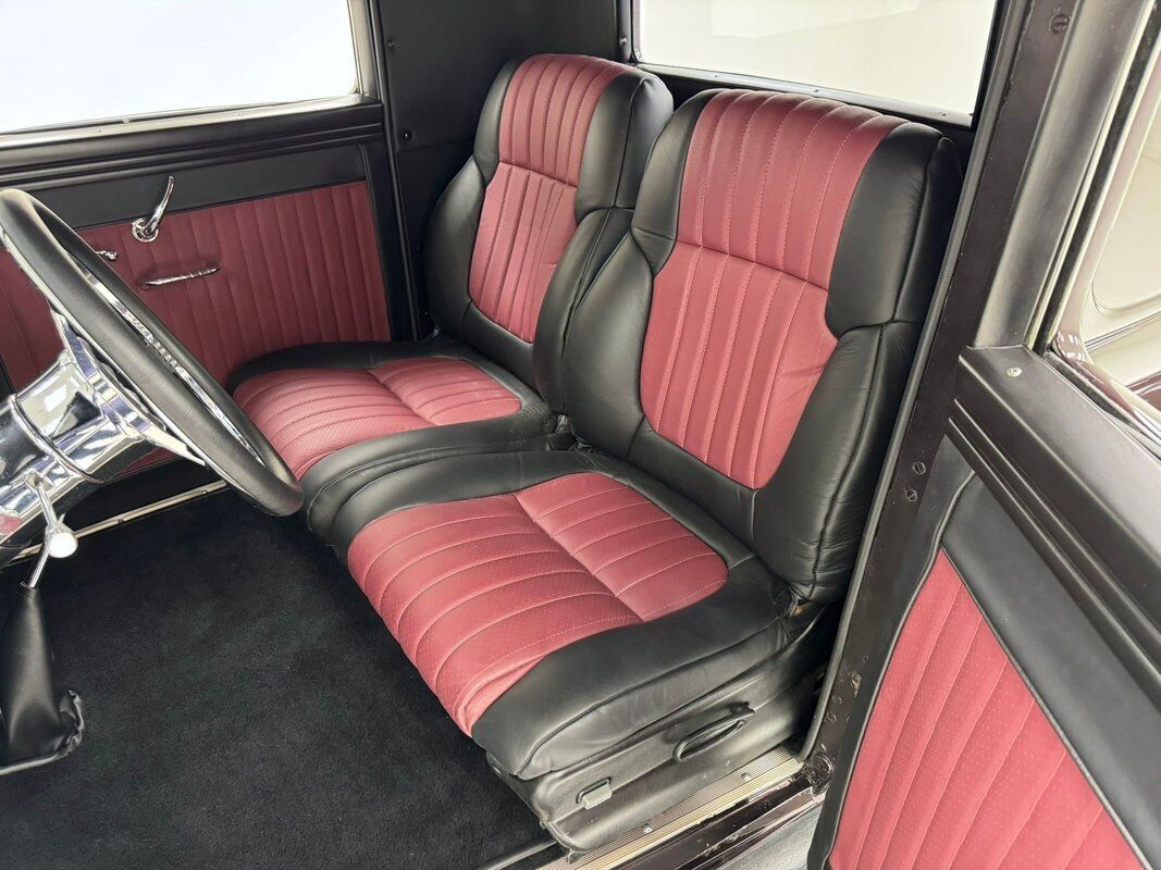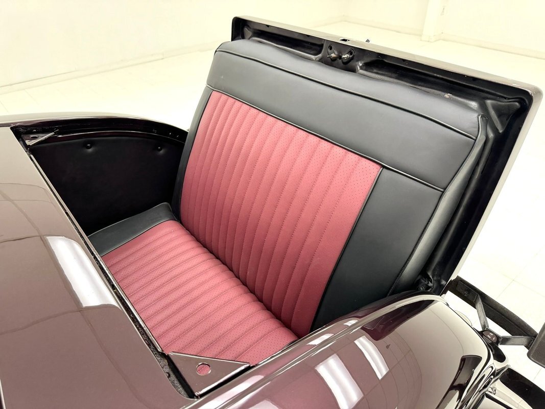 Black leather door cards with red stitched inserts present themselves as we open the reverse hinged doors where robust controls and door pulls in polished metal are found. A pair of bucket seats are pressed together and wear the same black leather and red insert configuration. A banjo style wheel in a more modern and smaller interpretation fronts the driver while the vintage gauge cluster with ivory faces sits in the center of the dash. Below that, a series of more modern Bosch gauges and switches to monitor the updated engine systems including air conditioning and the 12-volt upgrade. A push button billet shifter is floor mounted, surrounded by low pile black carpeting that looks new. The headliner picks up on the leather upholstery with a red stitched panel framed in black leather. Finally, the rumble seat is finished in red and black leather which all looks to be in great condition.