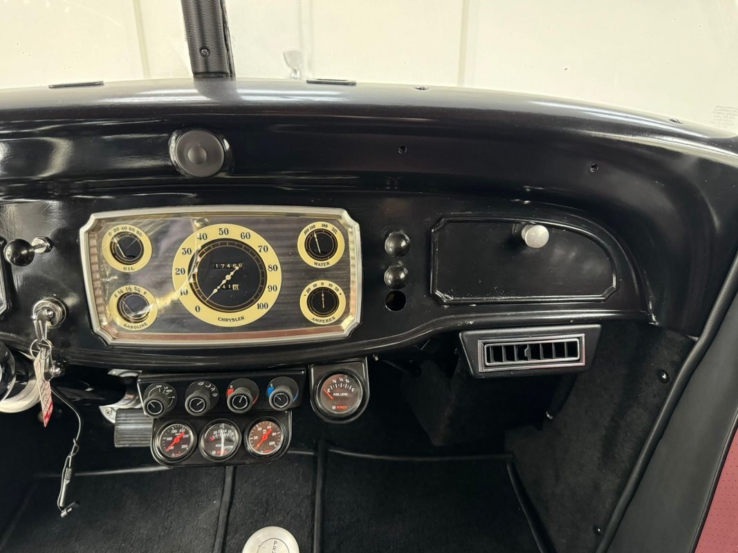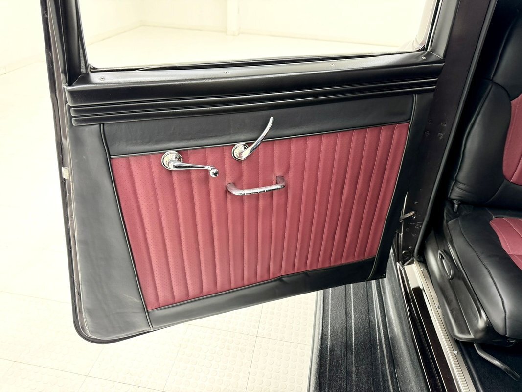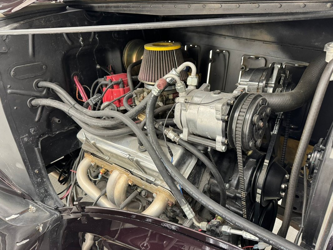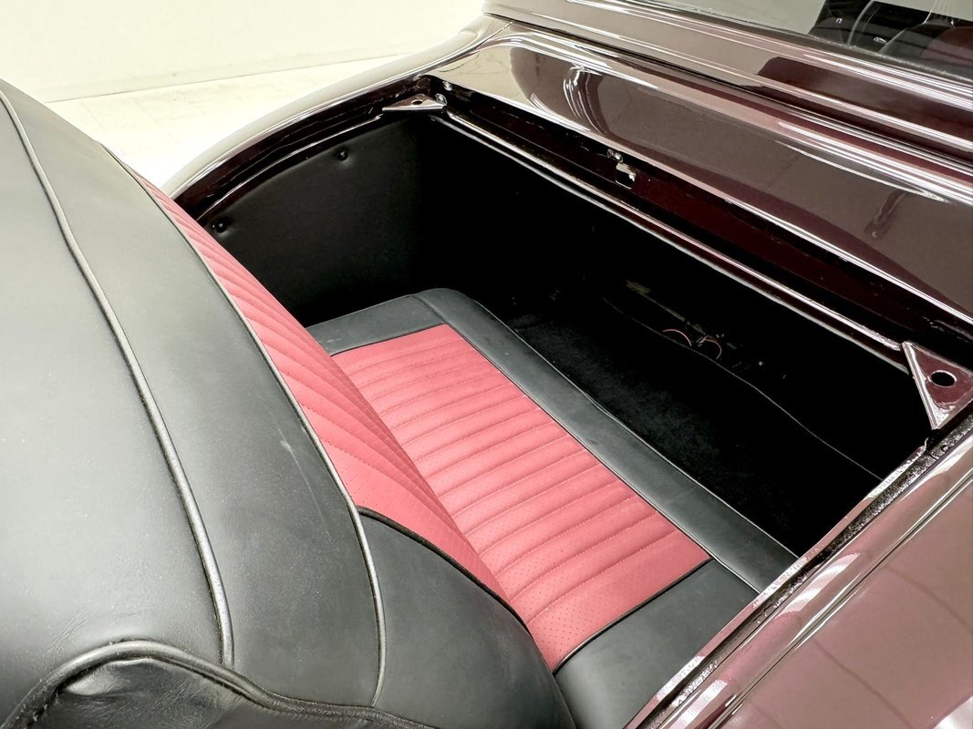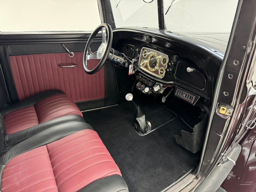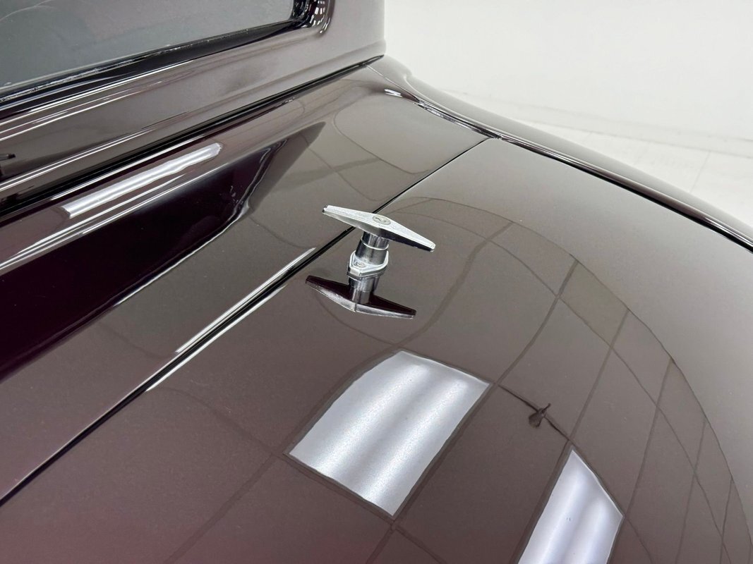Black leather door cards with red stitched inserts present themselves as we open the reverse hinged doors where robust controls and door pulls in polished metal are found. A pair of bucket seats are pressed together and wear the same black leather and red insert configuration. A banjo style wheel in a more modern and smaller interpretation fronts the driver while the vintage gauge cluster with ivory faces sits in the center of the dash. Below that, a series of more modern Bosch gauges and switches to monitor the updated engine systems including air conditioning and the 12-volt upgrade. A push button billet shifter is floor mounted, surrounded by low pile black carpeting that looks new. The headliner picks up on the leather upholstery with a red stitched panel framed in black leather. Finally, the rumble seat is finished in red and black leather which all looks to be in great condition.