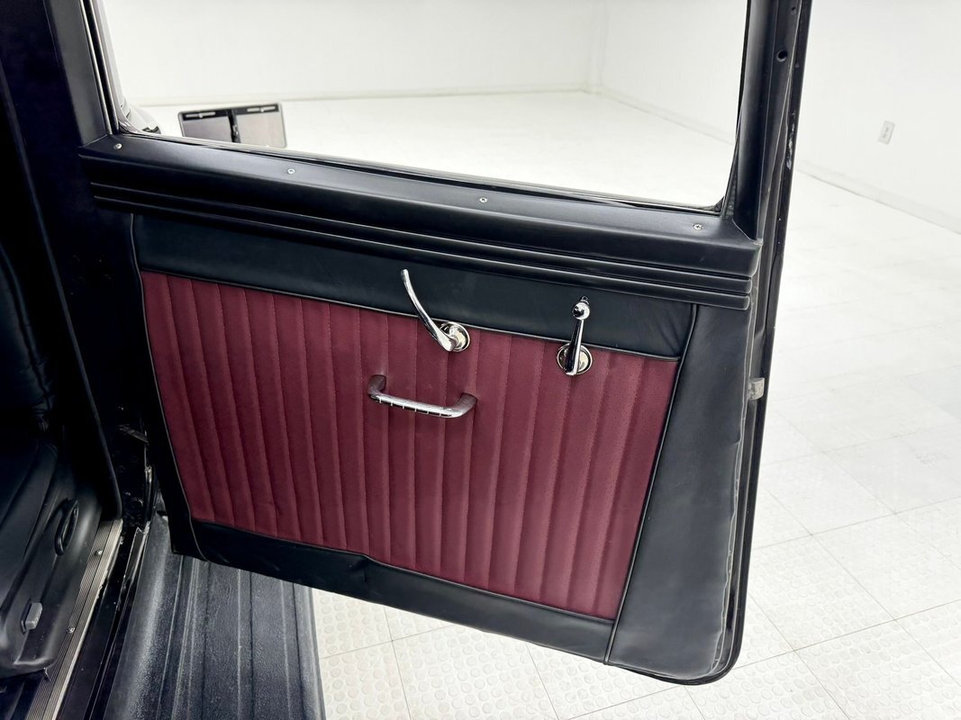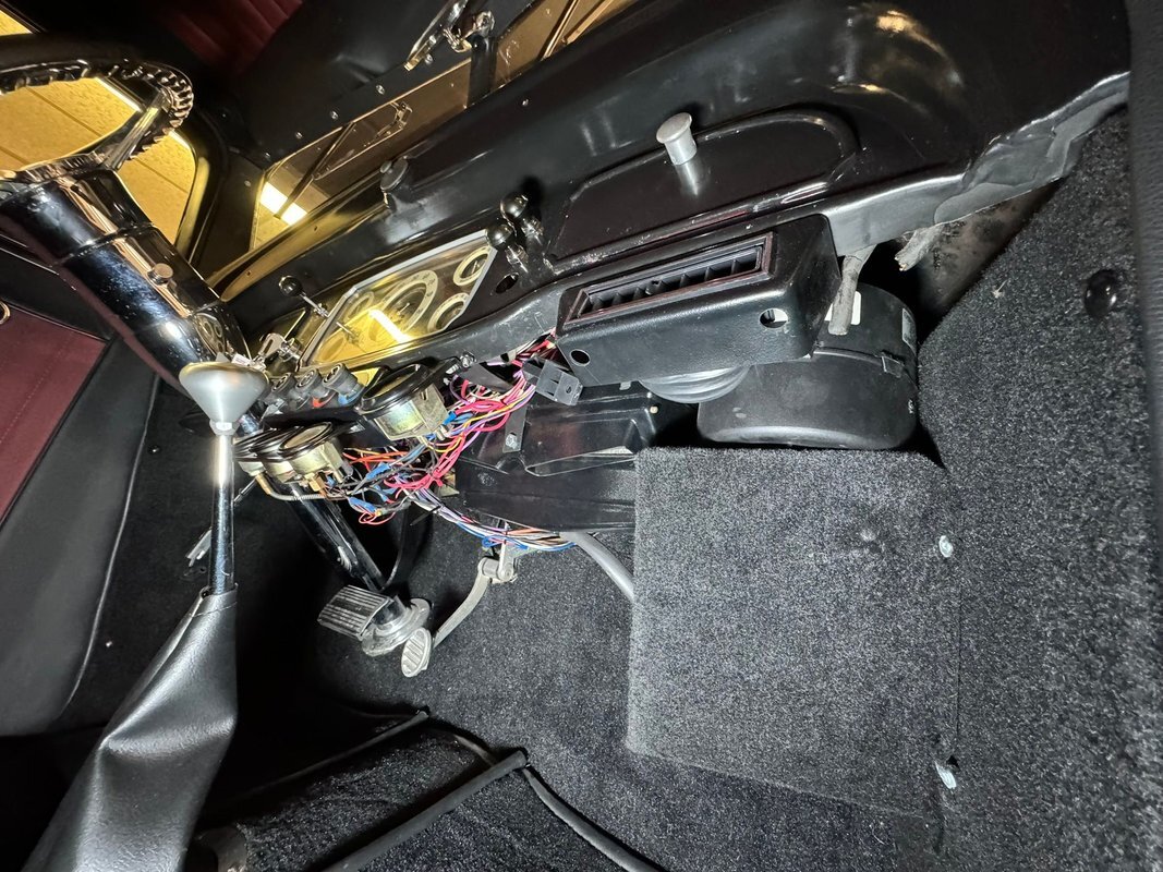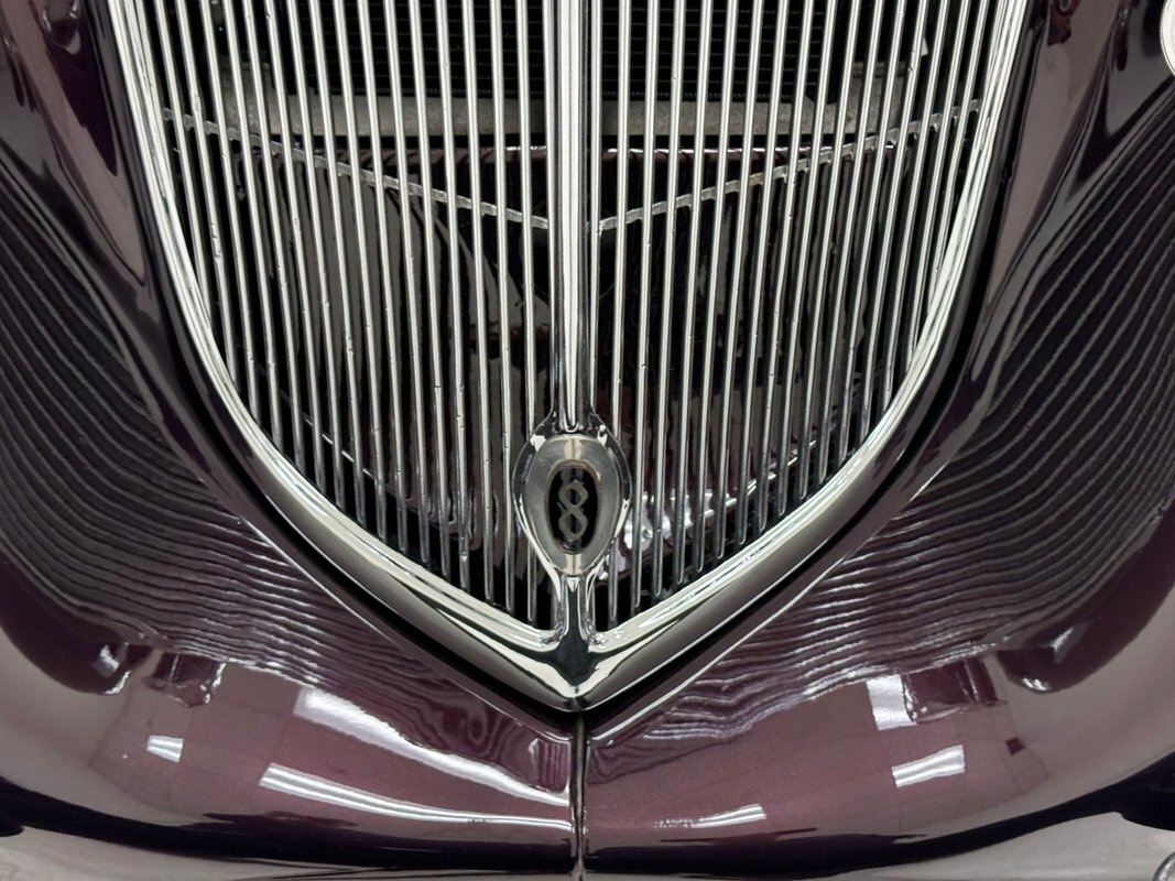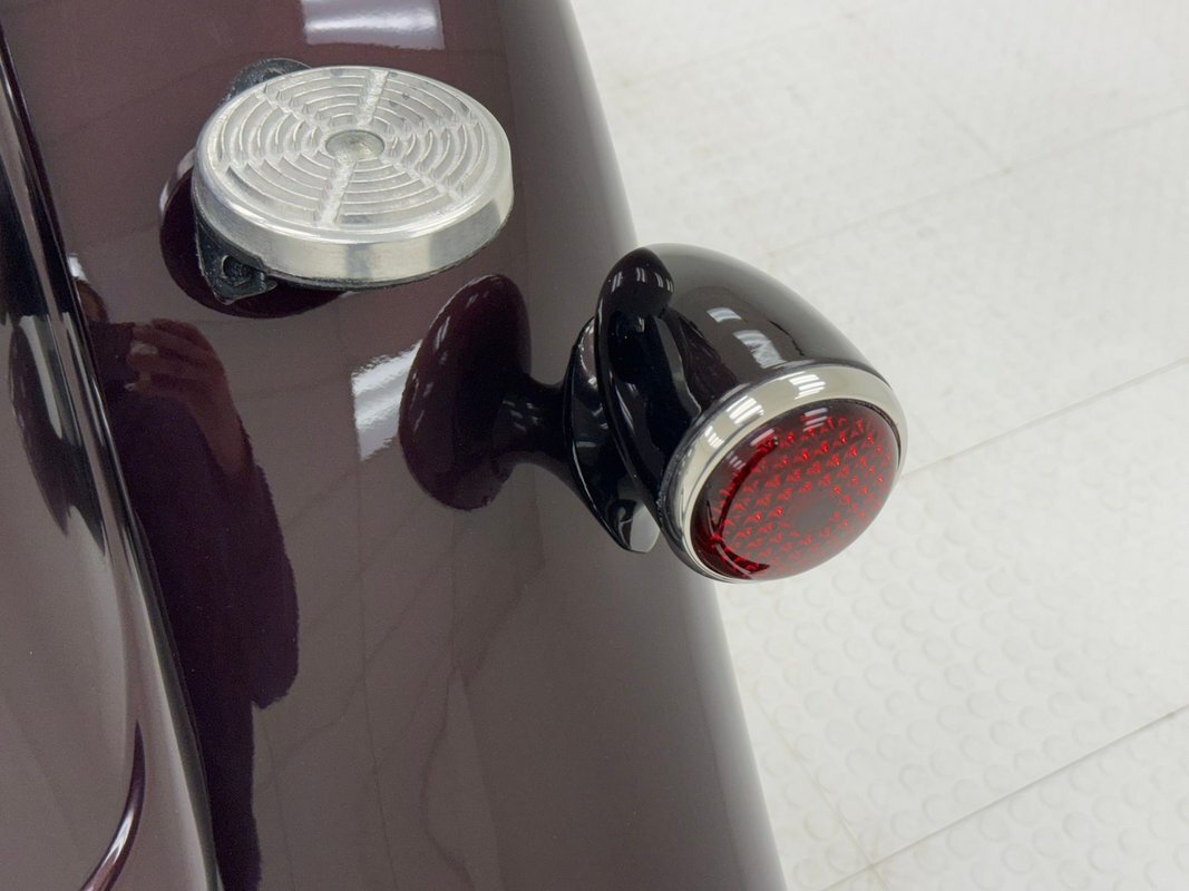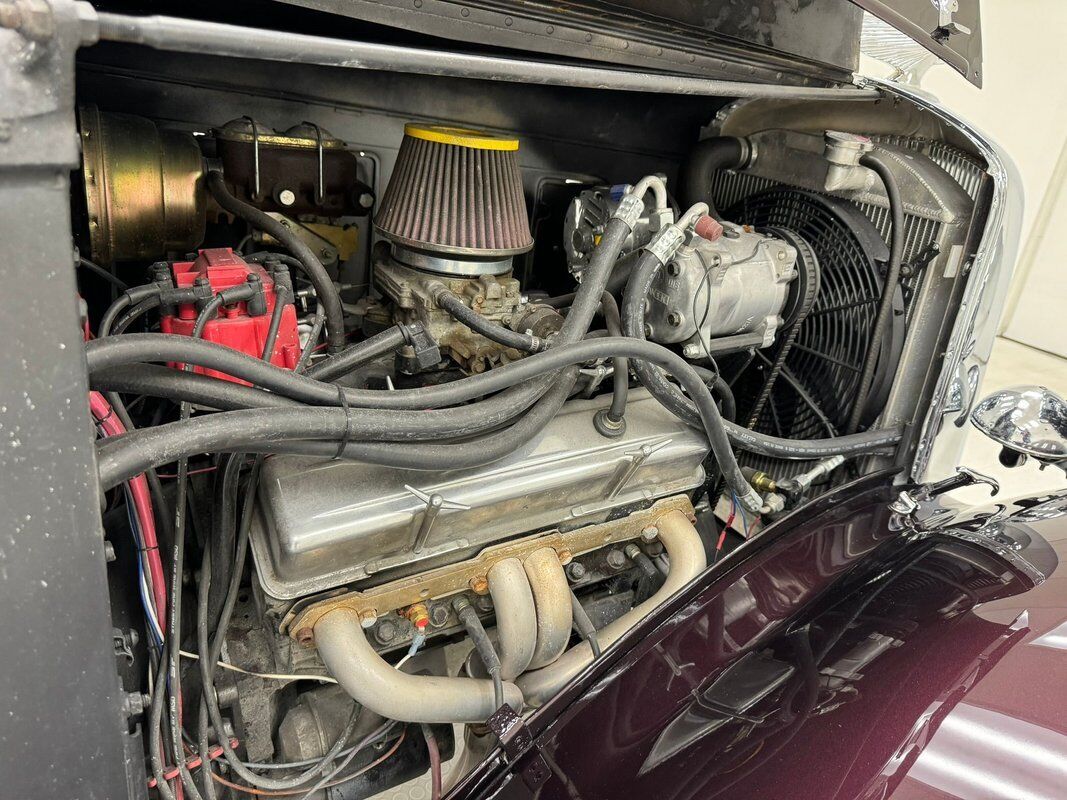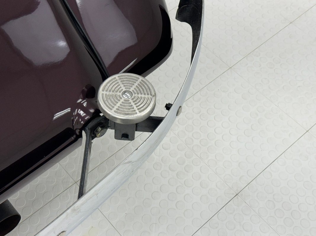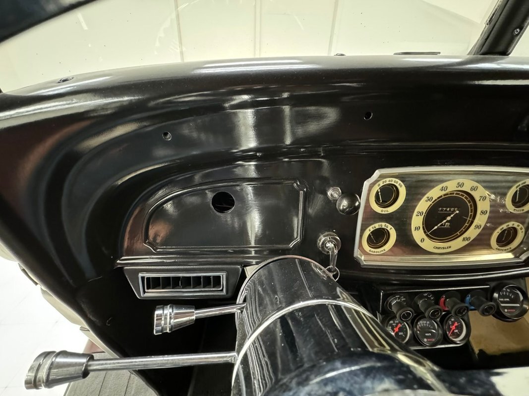 Black leather door cards with red stitched inserts present themselves as we open the reverse hinged doors where robust controls and door pulls in polished metal are found. A pair of bucket seats are pressed together and wear the same black leather and red insert configuration. A banjo style wheel in a more modern and smaller interpretation fronts the driver while the vintage gauge cluster with ivory faces sits in the center of the dash. Below that, a series of more modern Bosch gauges and switches to monitor the updated engine systems including air conditioning and the 12-volt upgrade. A push button billet shifter is floor mounted, surrounded by low pile black carpeting that looks new. The headliner picks up on the leather upholstery with a red stitched panel framed in black leather. Finally, the rumble seat is finished in red and black leather which all looks to be in great condition.