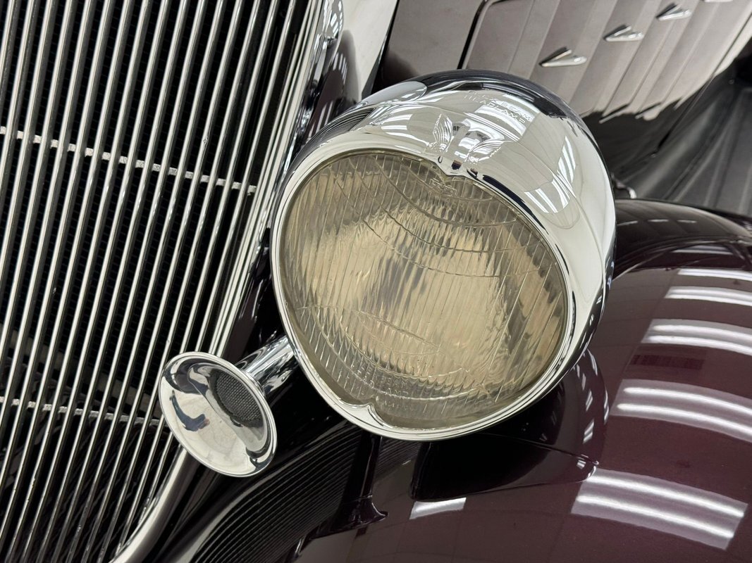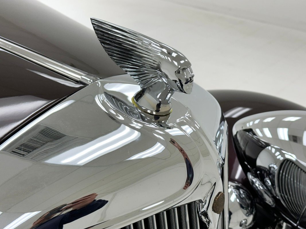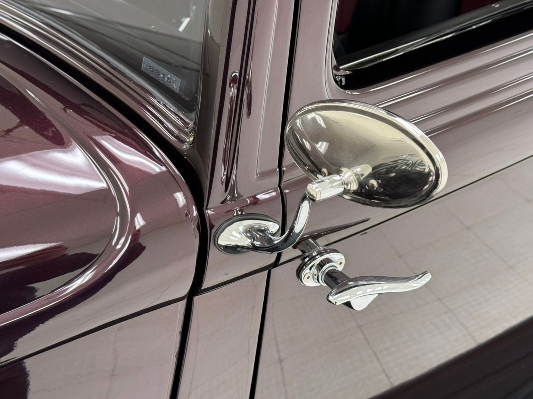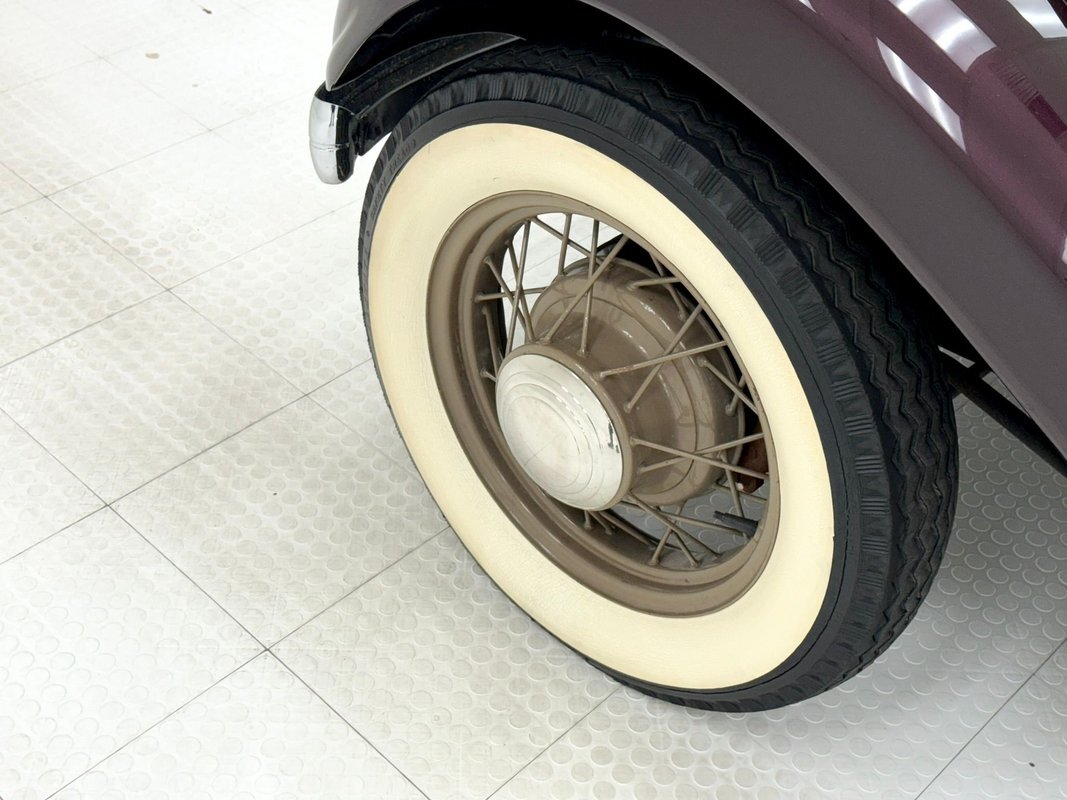 Two stage Dark Cherry Metallic covers this car with breathtaking quality. Miles deep would be apropos here as the rich coat of metallic paint suits the car well. The tall, stately grille is finished in fine chrome, flanked by impressive headlights and symmetrical horns. Atop it all, the amazing Viking ornament wearing a winged helmet seemingly blown back from the wind. The brightwork has been polished to a deep shine and the 17-inch wire wheels, in this case, are painted not chrome, and wrapped in whitewall tires. Textured step ups are found on the back for access to the rumble seat. We note one hairline scratch on the rumble seat cover as the only exterior imperfection.