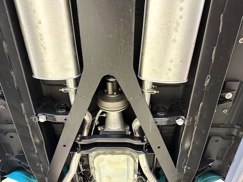 UNDERSIDE: This is one of the cleanest undercarriages we may have ever had. The body was off the frame and literally every component was restored and detailed. The chassis with stripped and painted semi-gloss black. The floors are pristine, clean smooth metal painted satin black. It has the correct dual exhaust system with mufflers and resonators. The fuel system was completely replaced. All the suspension and steering was rebuilt. The brake system was restored, e-brake is hooked up. Bottom of the motor is spotless. The Torqueflite 3-speed automatic trans looks like new. The driveshaft and rear end were restored.