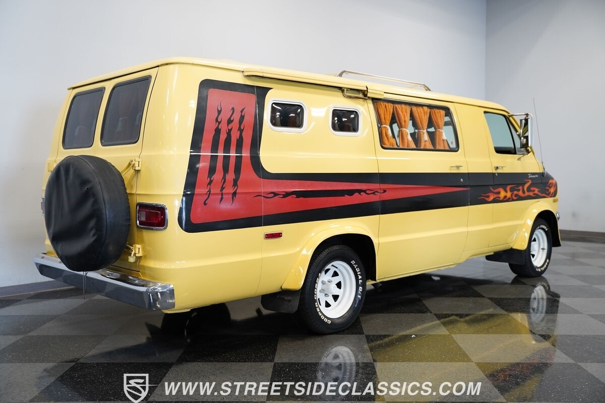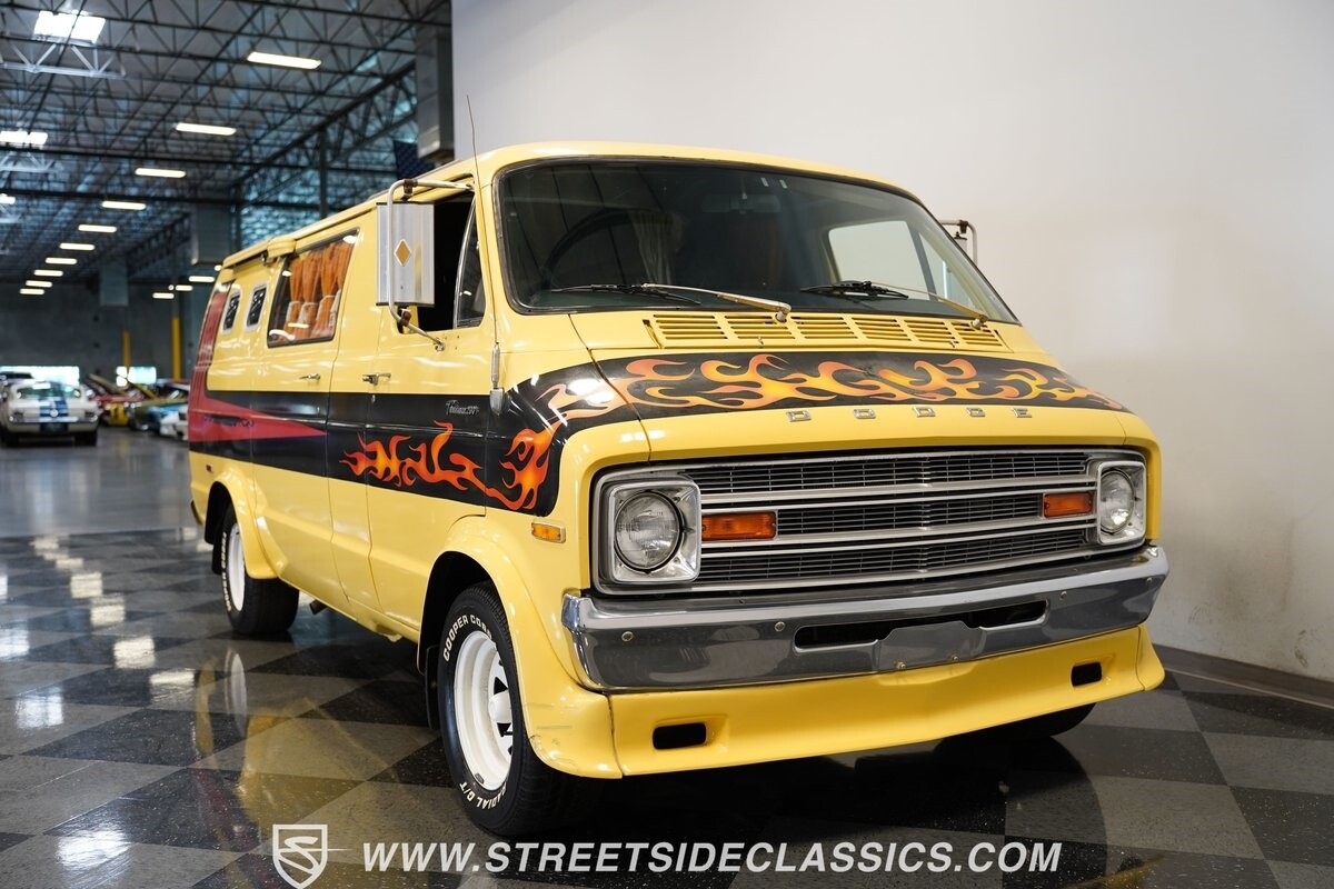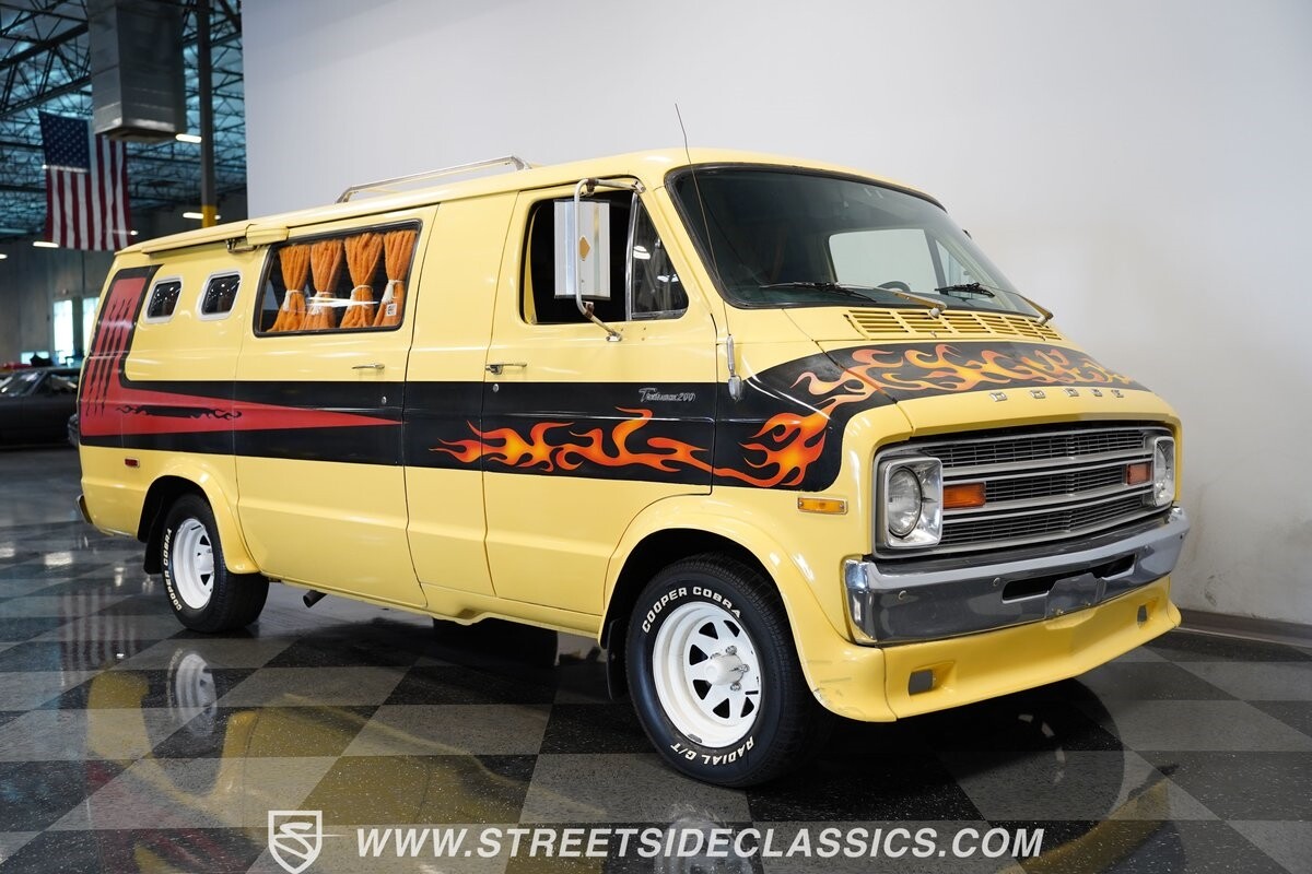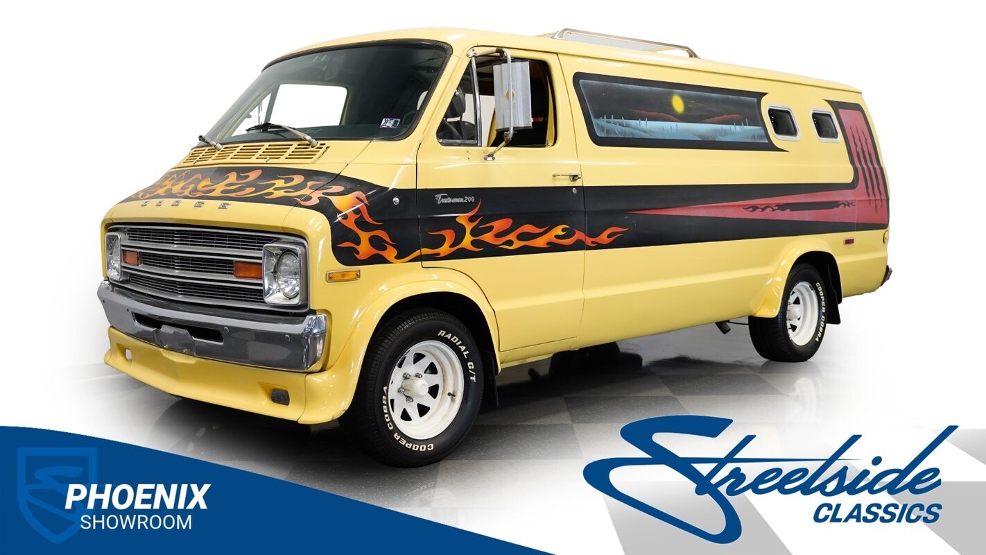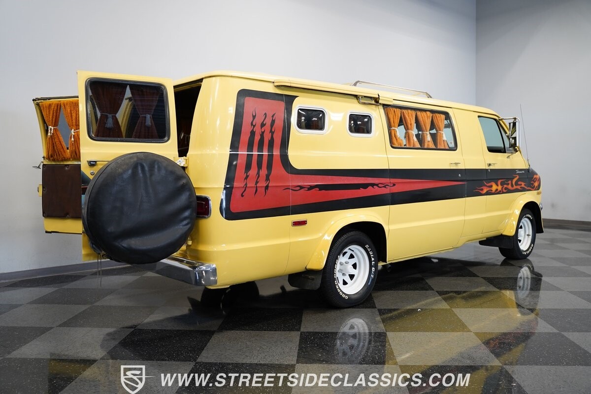 The Dodge B-Series was so much at the heart of the custom van movement, that they were a feature in just about every movie made about vanning. That's why it's awesome to find a true time capsule 1975 Dodge B200 Tradesman done back in the day by Rodco. And they really did all the best cool exterior details like fender flares with a chin spoiler, tall towing mirrors, a roof rack, side windows, and a skylight vent. In fact, there's a level of originality with this one that it appears that the custom murals are the original ones done at Rodco. And there's so much room for all those graphics because this is a long wheelbase Tradesman. All that extra space means even more room on the inside. It's nice to see the shag carpeting, wood paneling, orange curtains, and custom brown lounge seating/table still in place. It even still has a built-in fridge! So as you look through the full package, you're really going to see an impressive level of authenticity that makes this Dodge pure retro cool.