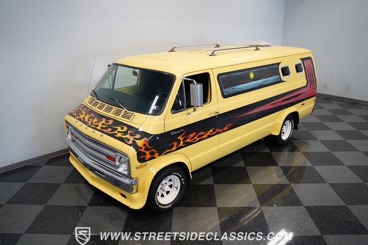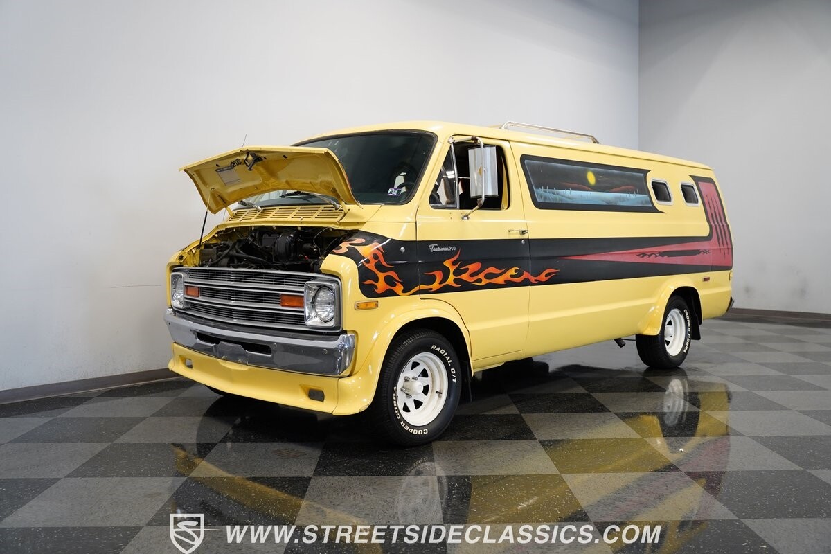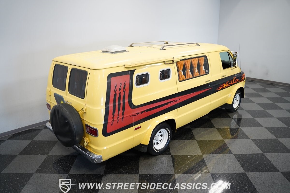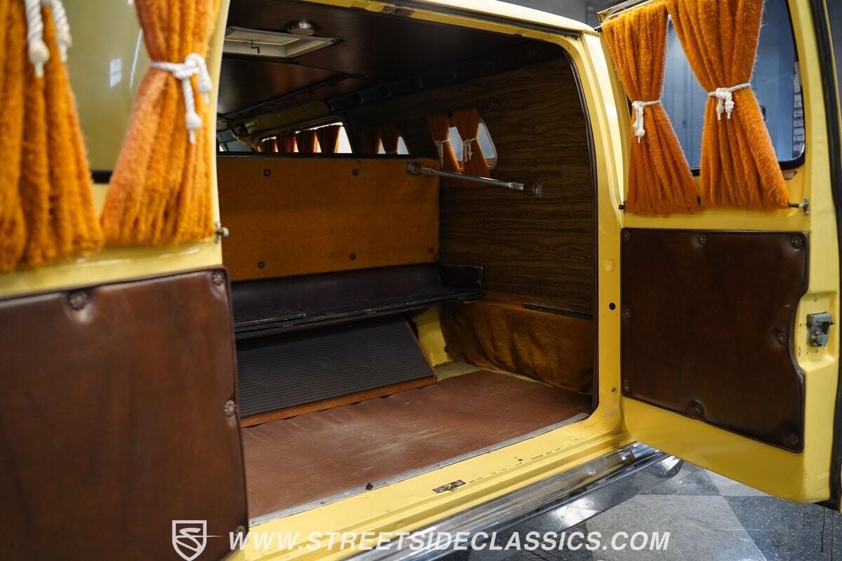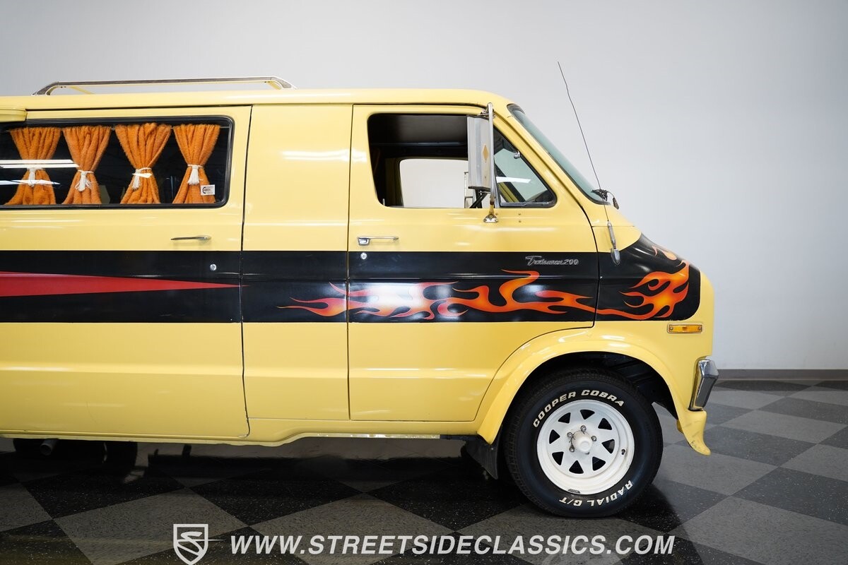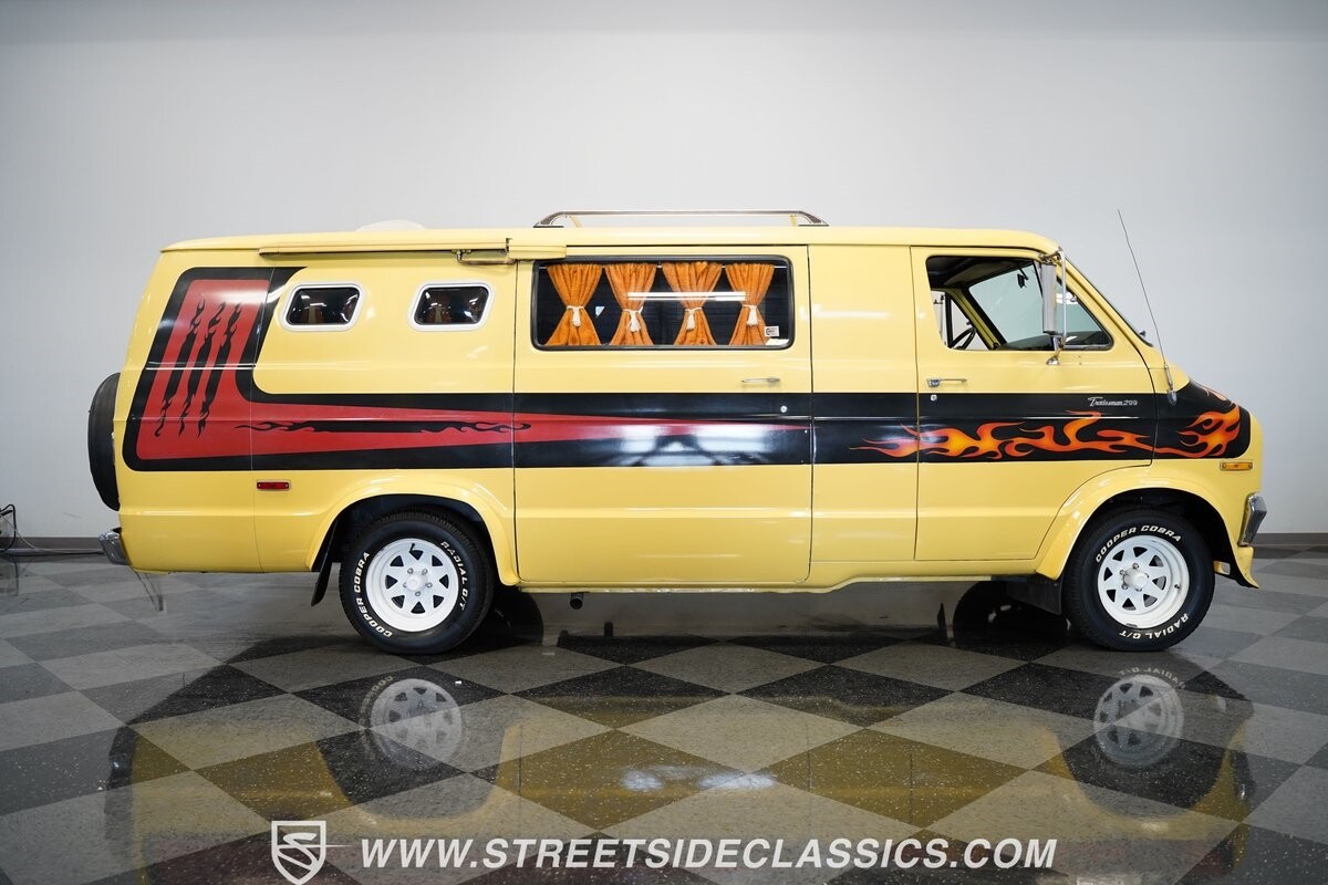 The Dodge B-Series was so much at the heart of the custom van movement, that they were a feature in just about every movie made about vanning. That's why it's awesome to find a true time capsule 1975 Dodge B200 Tradesman done back in the day by Rodco. And they really did all the best cool exterior details like fender flares with a chin spoiler, tall towing mirrors, a roof rack, side windows, and a skylight vent. In fact, there's a level of originality with this one that it appears that the custom murals are the original ones done at Rodco. And there's so much room for all those graphics because this is a long wheelbase Tradesman. All that extra space means even more room on the inside. It's nice to see the shag carpeting, wood paneling, orange curtains, and custom brown lounge seating/table still in place. It even still has a built-in fridge! So as you look through the full package, you're really going to see an impressive level of authenticity that makes this Dodge pure retro cool.