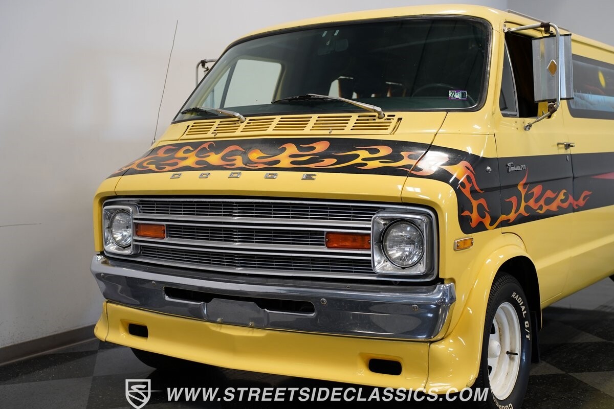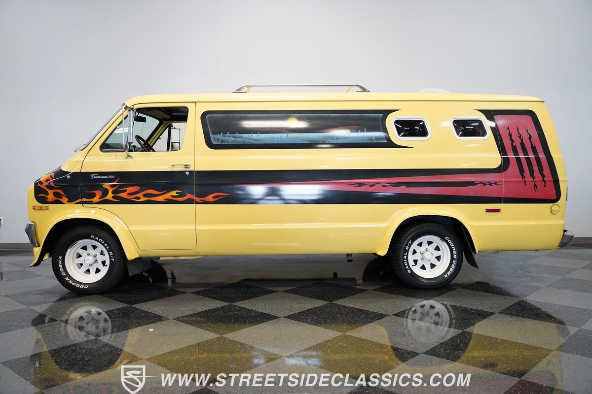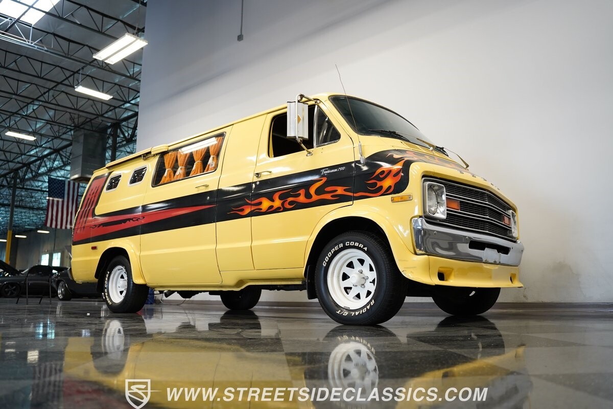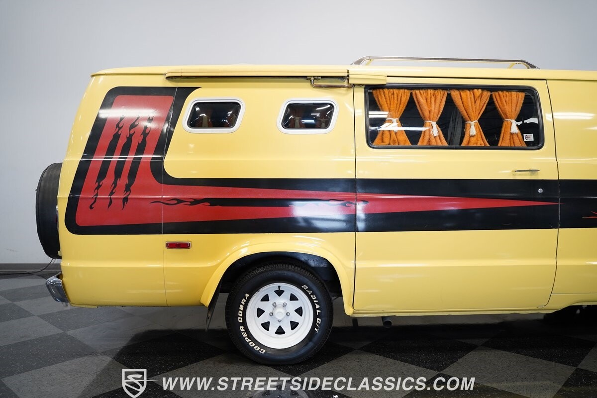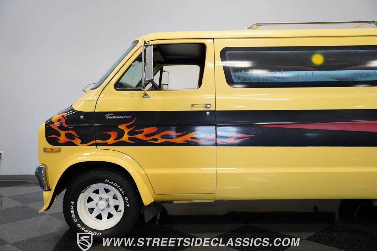 The Dodge B-Series was so much at the heart of the custom van movement, that they were a feature in just about every movie made about vanning. That's why it's awesome to find a true time capsule 1975 Dodge B200 Tradesman done back in the day by Rodco. And they really did all the best cool exterior details like fender flares with a chin spoiler, tall towing mirrors, a roof rack, side windows, and a skylight vent. In fact, there's a level of originality with this one that it appears that the custom murals are the original ones done at Rodco. And there's so much room for all those graphics because this is a long wheelbase Tradesman. All that extra space means even more room on the inside. It's nice to see the shag carpeting, wood paneling, orange curtains, and custom brown lounge seating/table still in place. It even still has a built-in fridge! So as you look through the full package, you're really going to see an impressive level of authenticity that makes this Dodge pure retro cool.