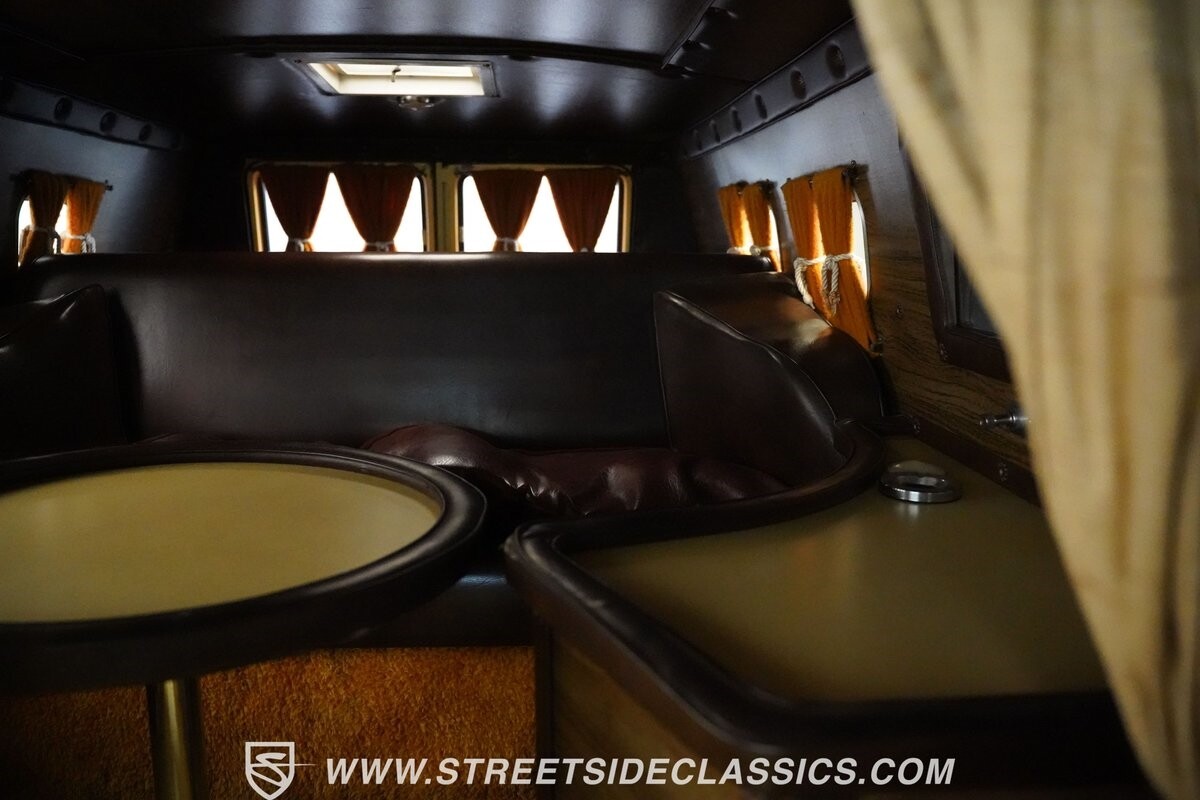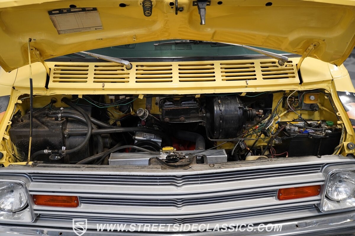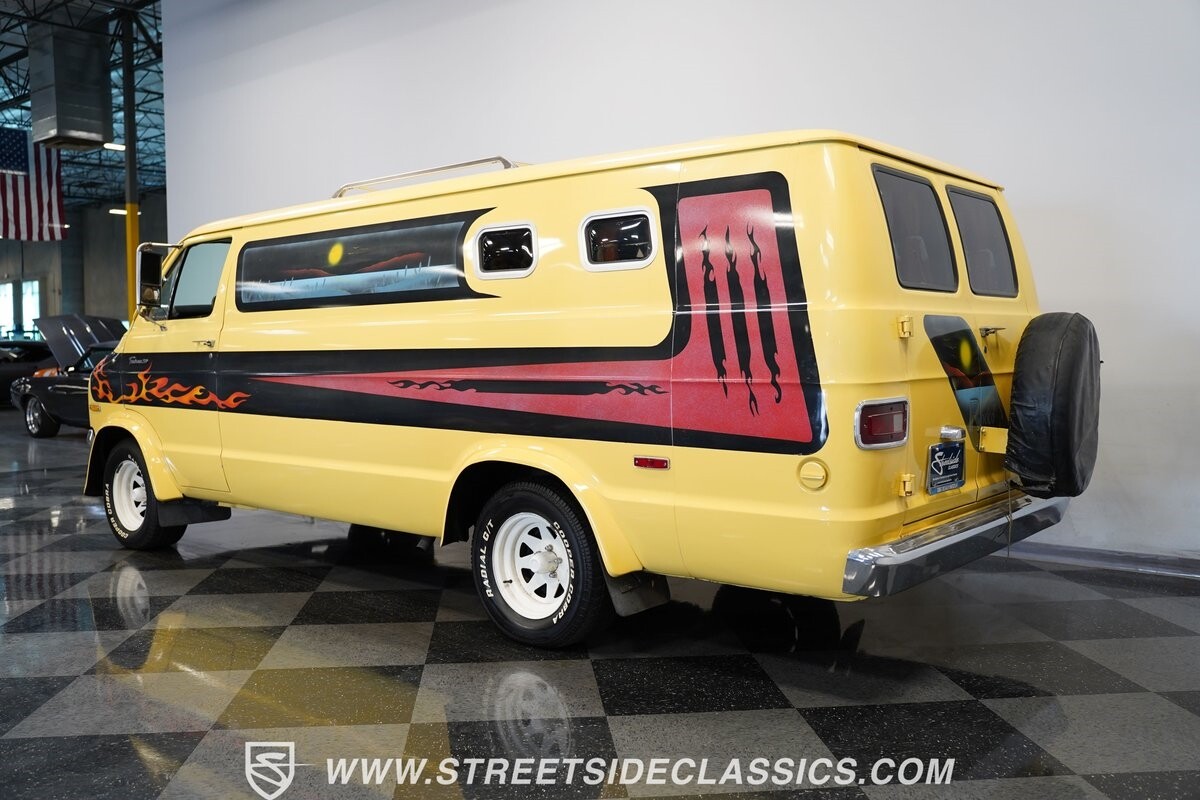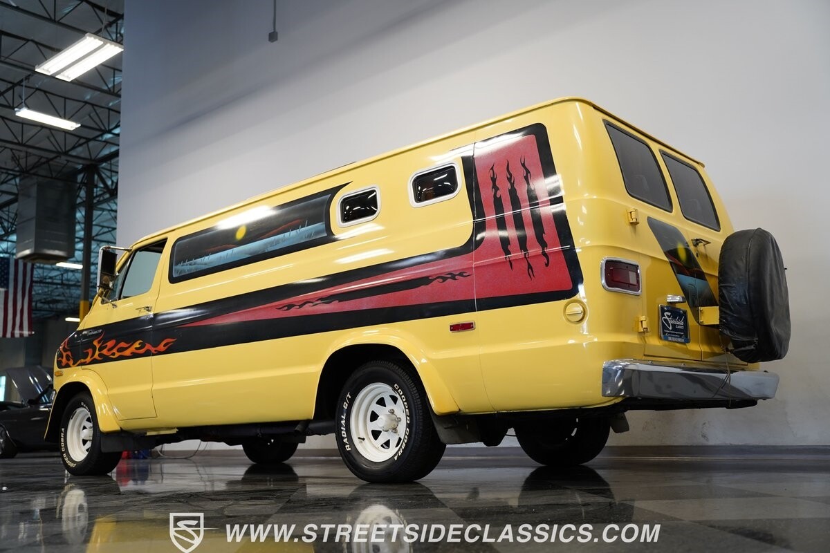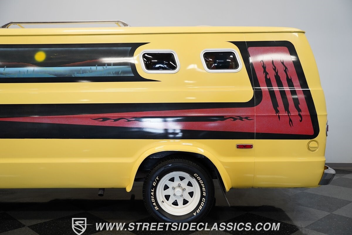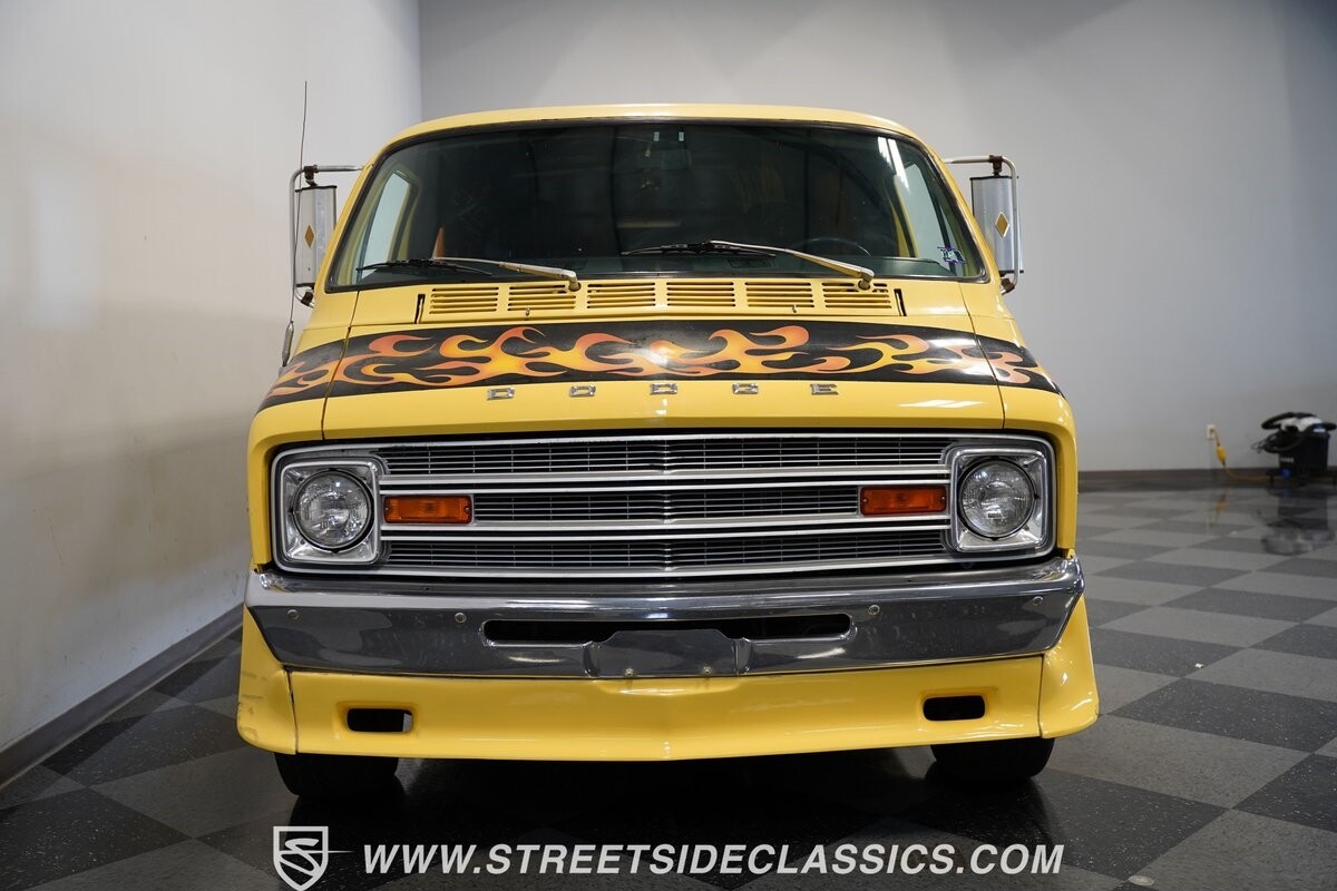 The Dodge B-Series was so much at the heart of the custom van movement, that they were a feature in just about every movie made about vanning. That's why it's awesome to find a true time capsule 1975 Dodge B200 Tradesman done back in the day by Rodco. And they really did all the best cool exterior details like fender flares with a chin spoiler, tall towing mirrors, a roof rack, side windows, and a skylight vent. In fact, there's a level of originality with this one that it appears that the custom murals are the original ones done at Rodco. And there's so much room for all those graphics because this is a long wheelbase Tradesman. All that extra space means even more room on the inside. It's nice to see the shag carpeting, wood paneling, orange curtains, and custom brown lounge seating/table still in place. It even still has a built-in fridge! So as you look through the full package, you're really going to see an impressive level of authenticity that makes this Dodge pure retro cool.