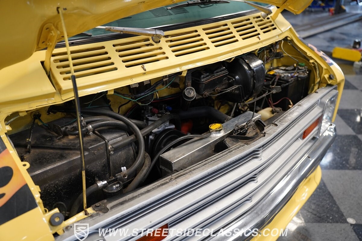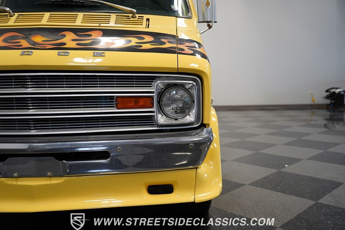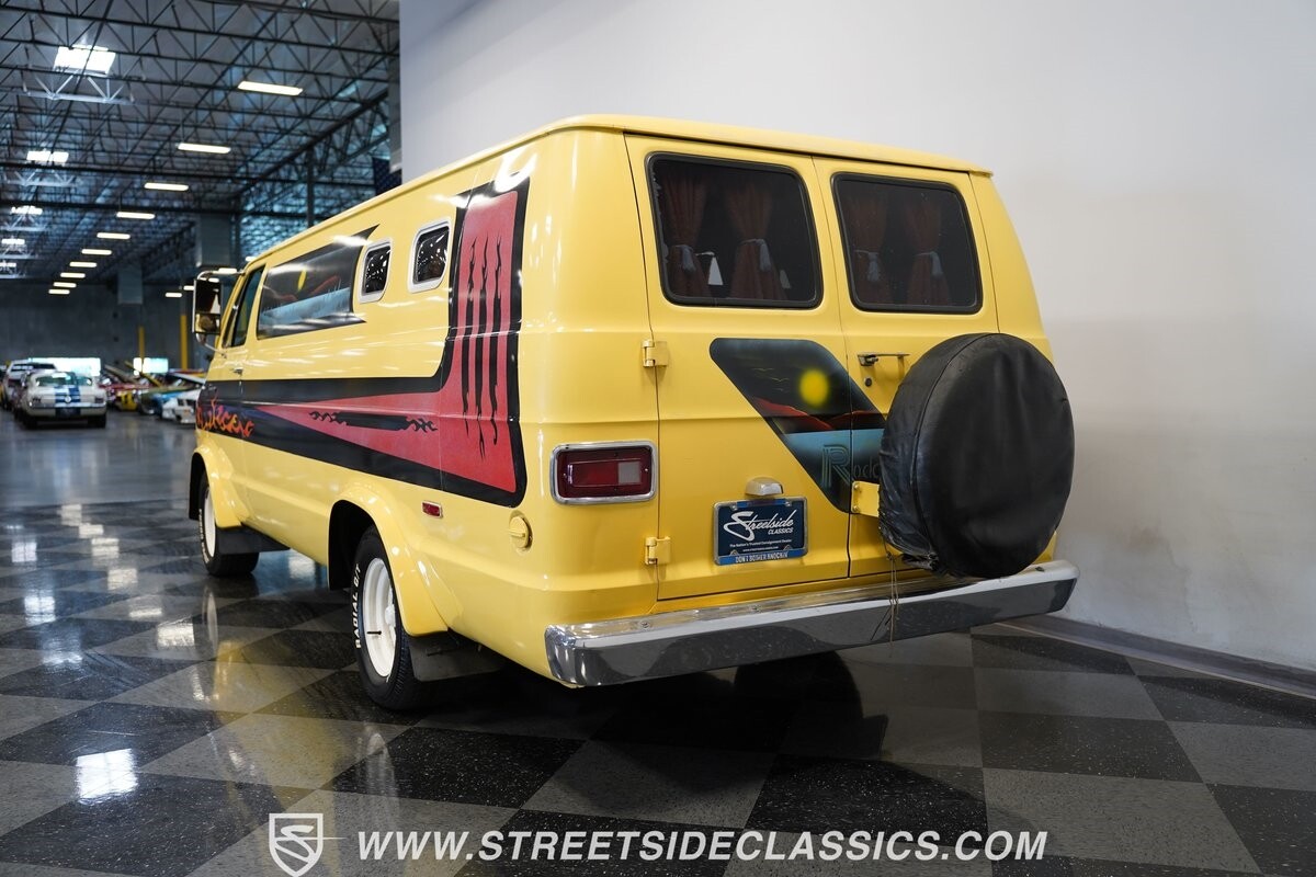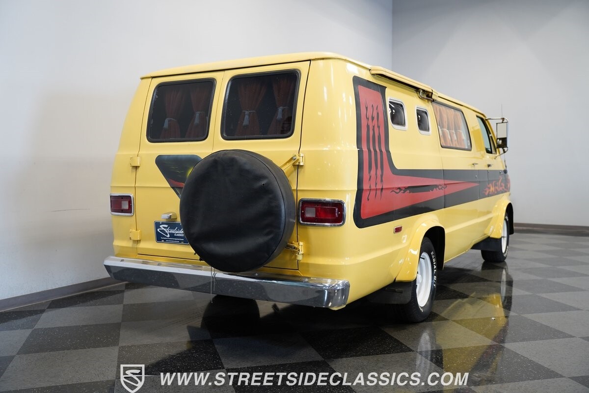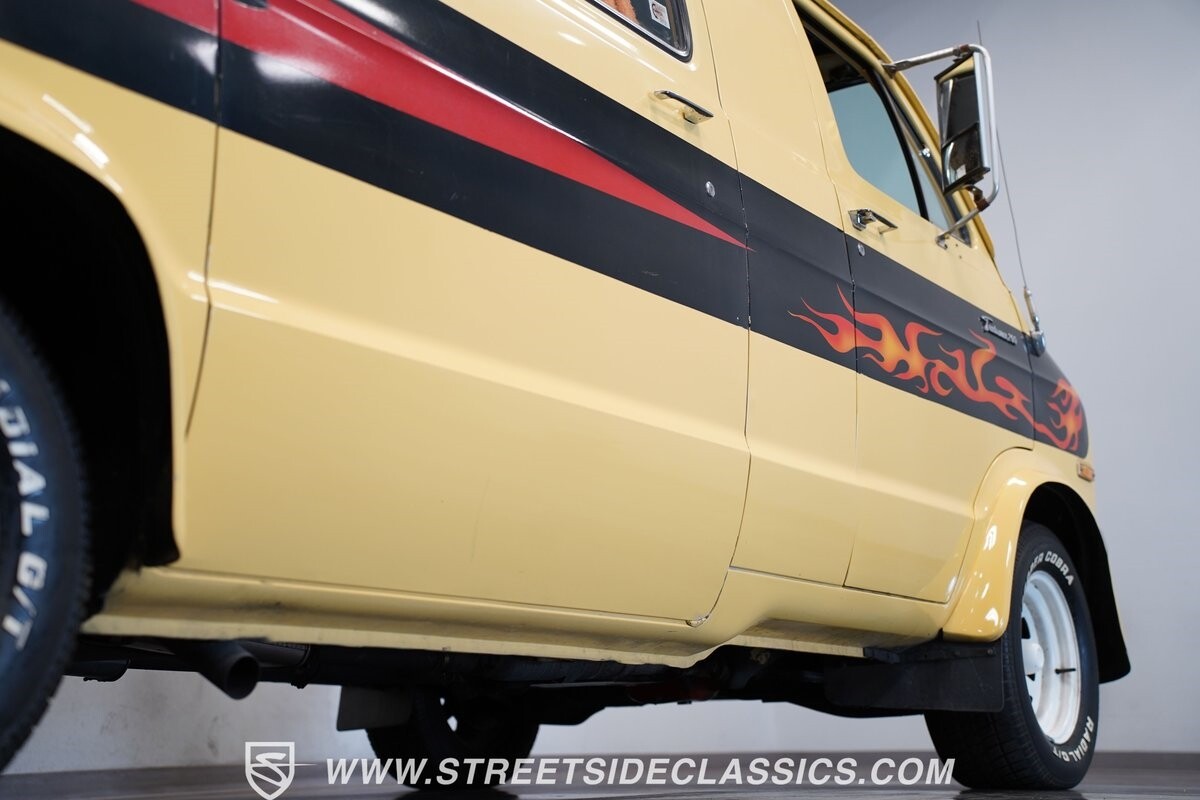 The Dodge B-Series was so much at the heart of the custom van movement, that they were a feature in just about every movie made about vanning. That's why it's awesome to find a true time capsule 1975 Dodge B200 Tradesman done back in the day by Rodco. And they really did all the best cool exterior details like fender flares with a chin spoiler, tall towing mirrors, a roof rack, side windows, and a skylight vent. In fact, there's a level of originality with this one that it appears that the custom murals are the original ones done at Rodco. And there's so much room for all those graphics because this is a long wheelbase Tradesman. All that extra space means even more room on the inside. It's nice to see the shag carpeting, wood paneling, orange curtains, and custom brown lounge seating/table still in place. It even still has a built-in fridge! So as you look through the full package, you're really going to see an impressive level of authenticity that makes this Dodge pure retro cool.