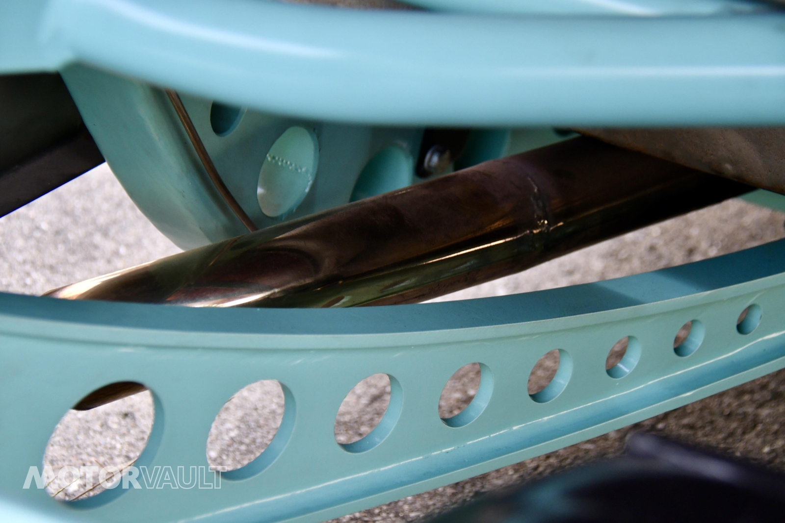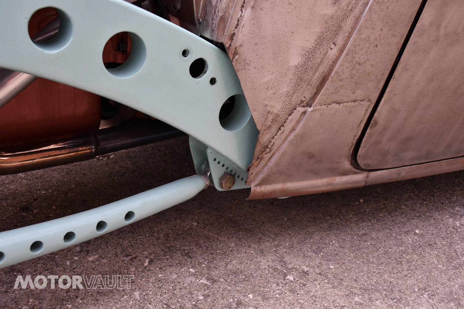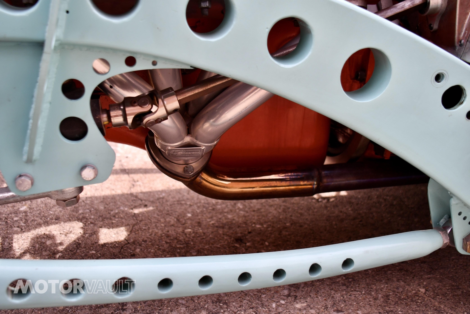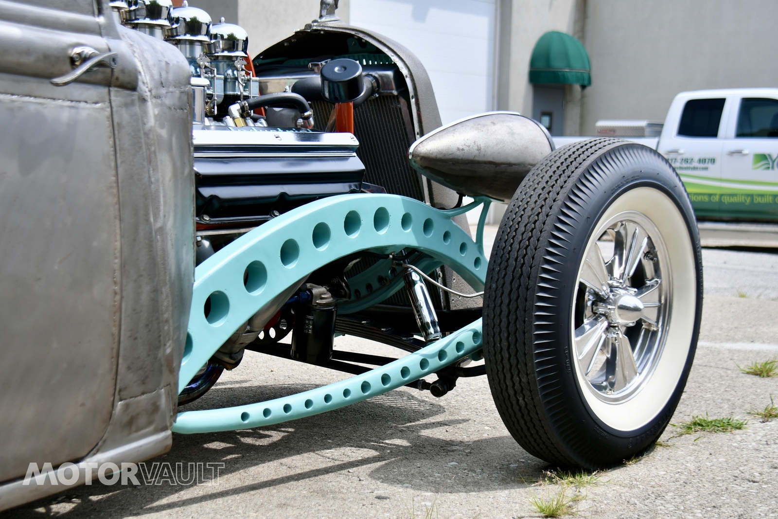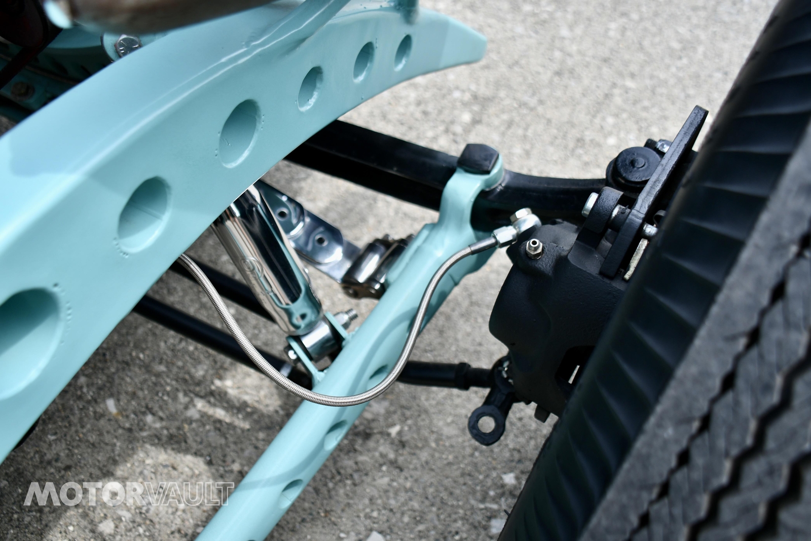 - 1940 Ford front axle w/ disc brakes stabilized by drilled and arched wish bones
