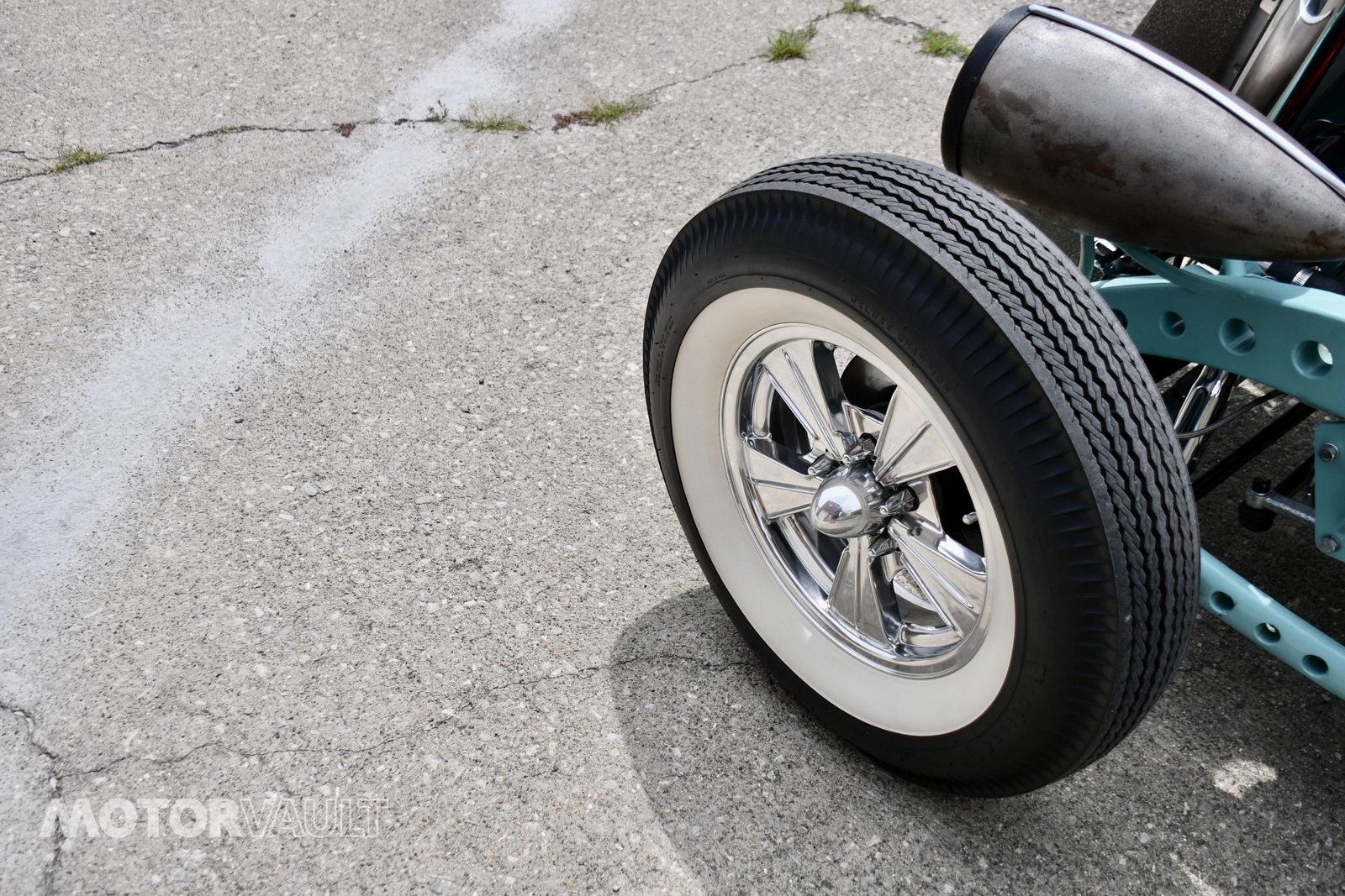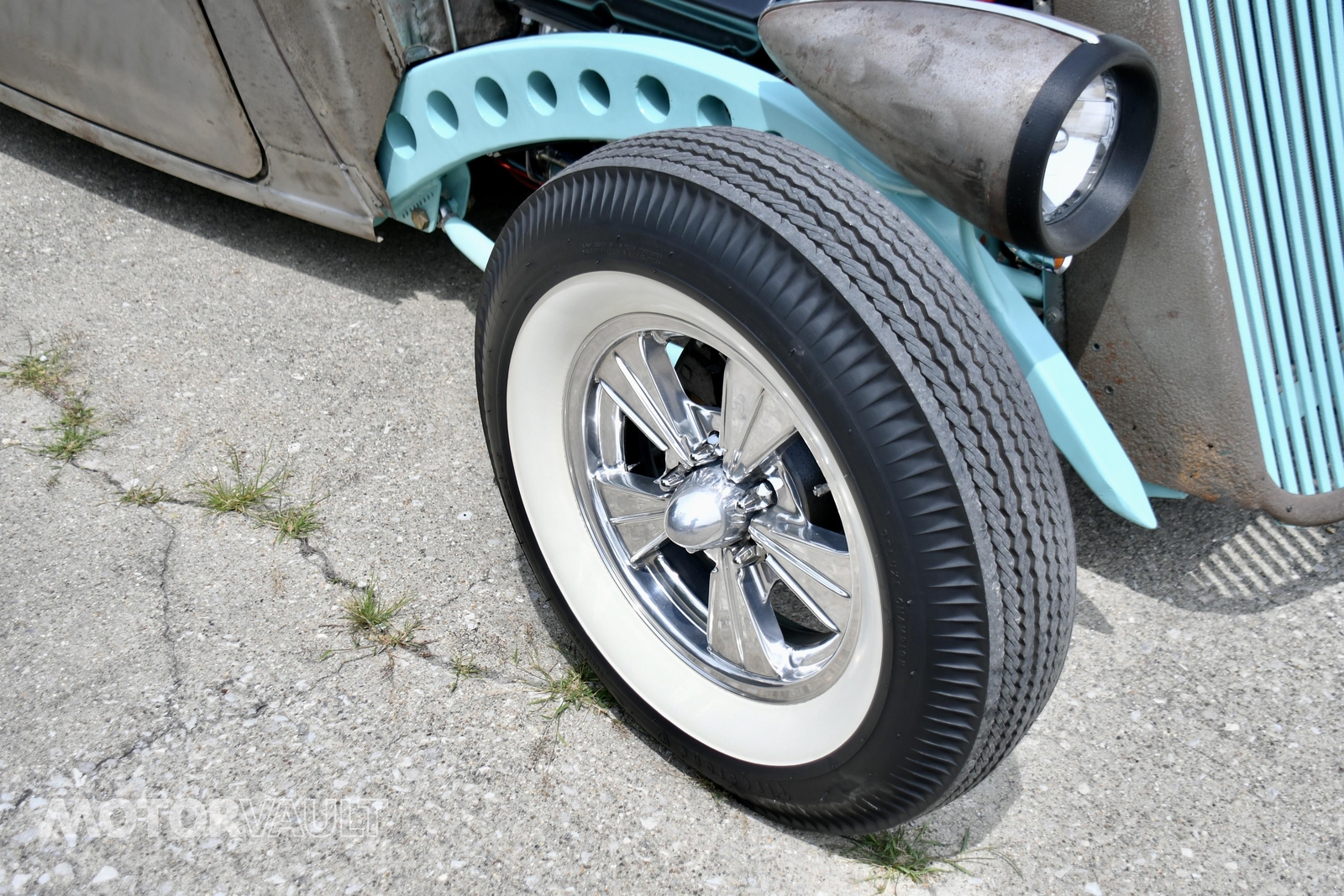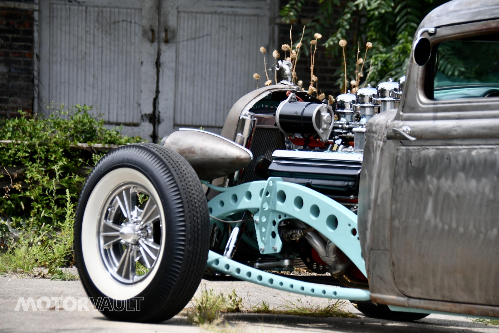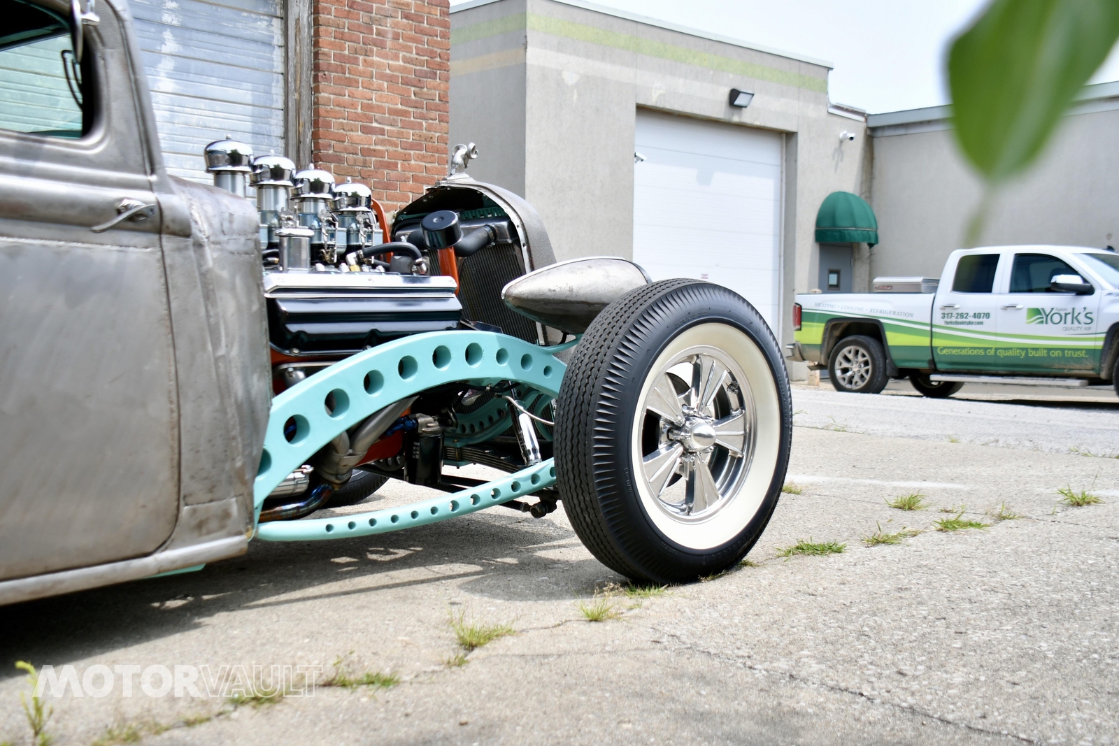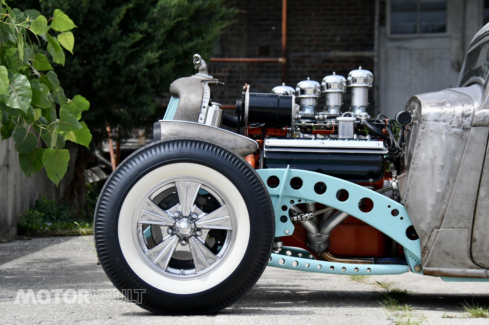 - 1940 Ford front axle w/ disc brakes stabilized by drilled and arched wish bones