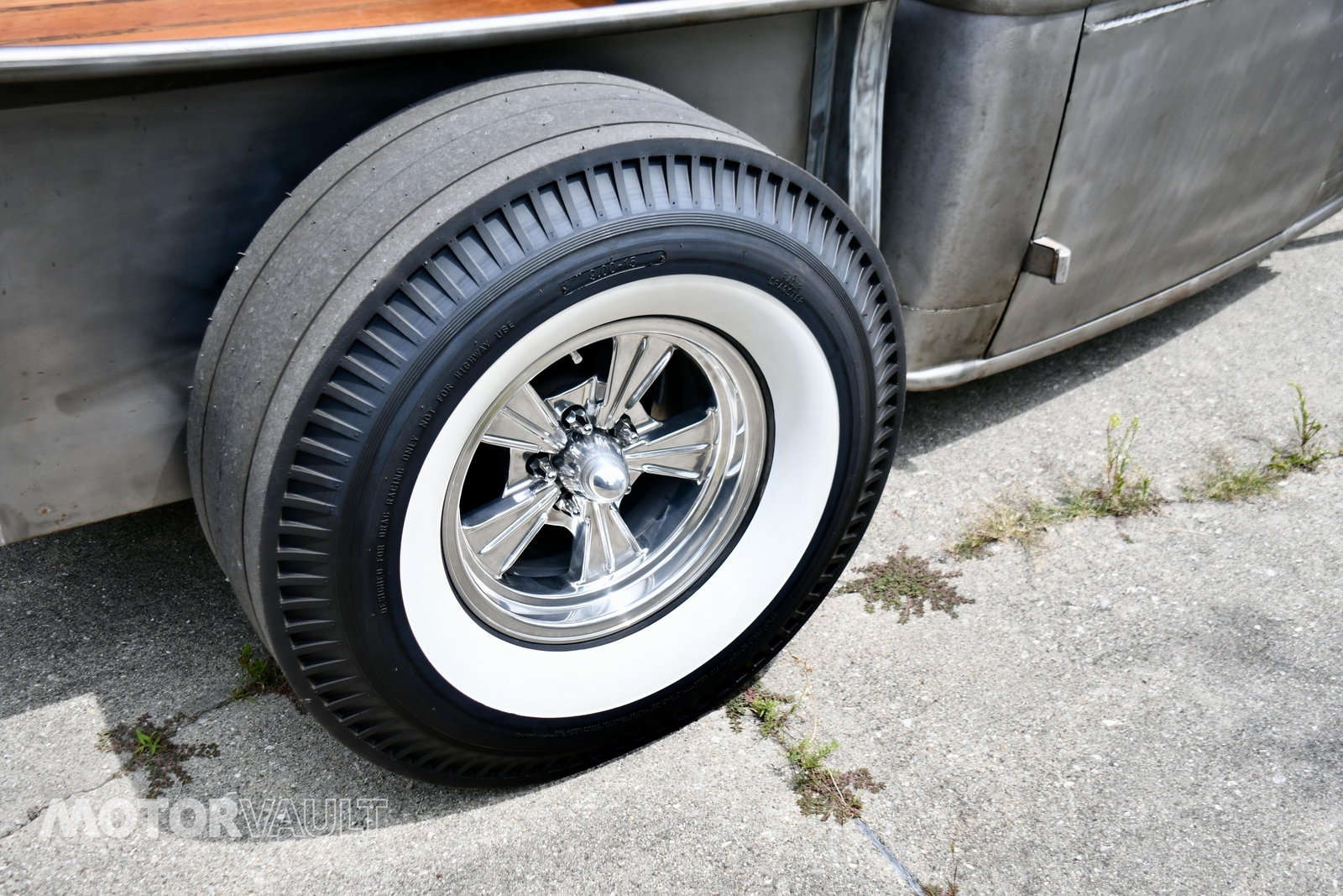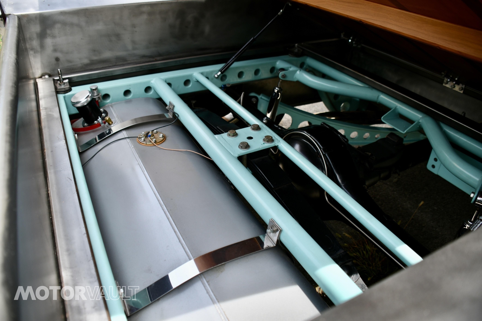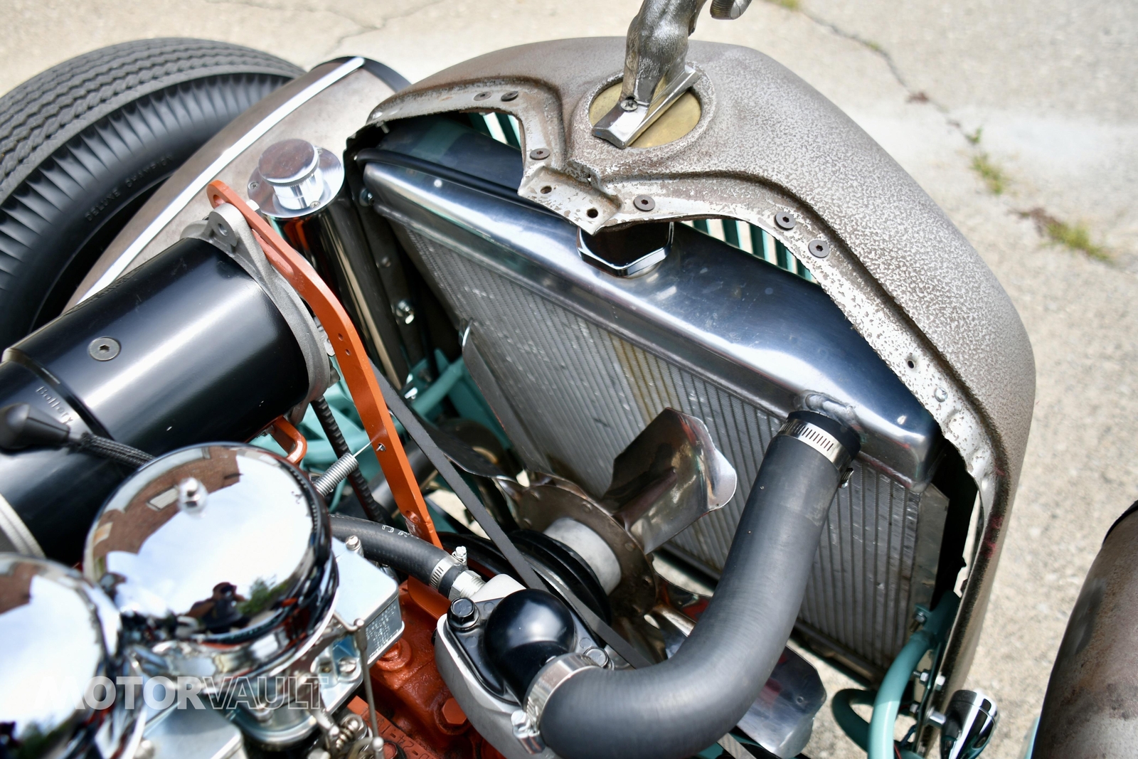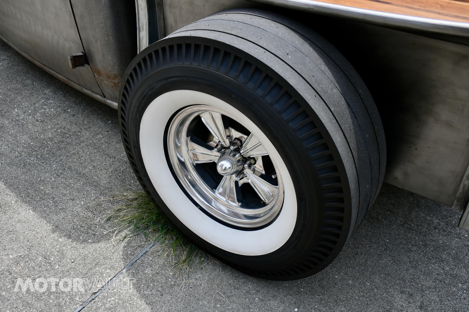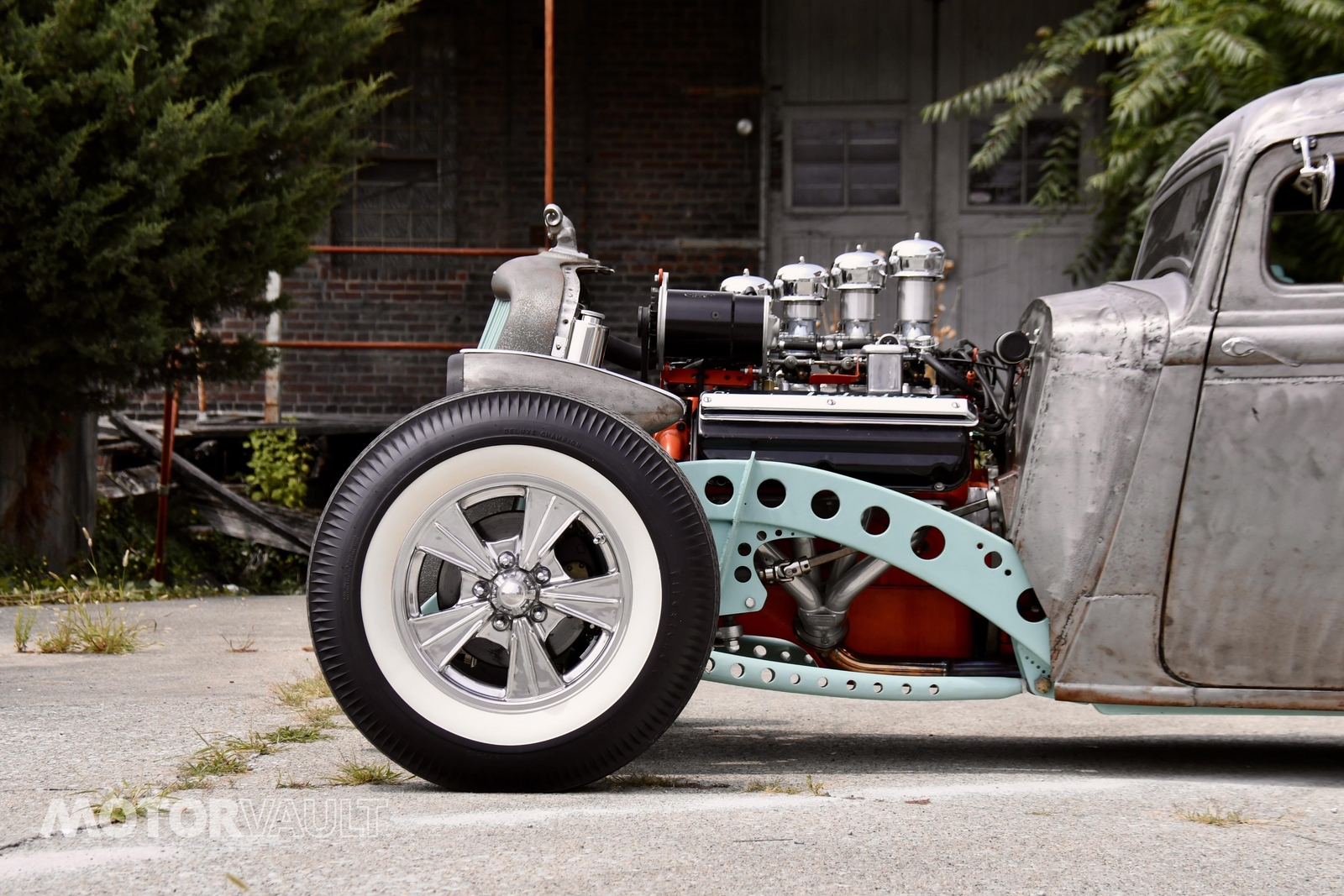 - 1940 Ford front axle w/ disc brakes stabilized by drilled and arched wish bones