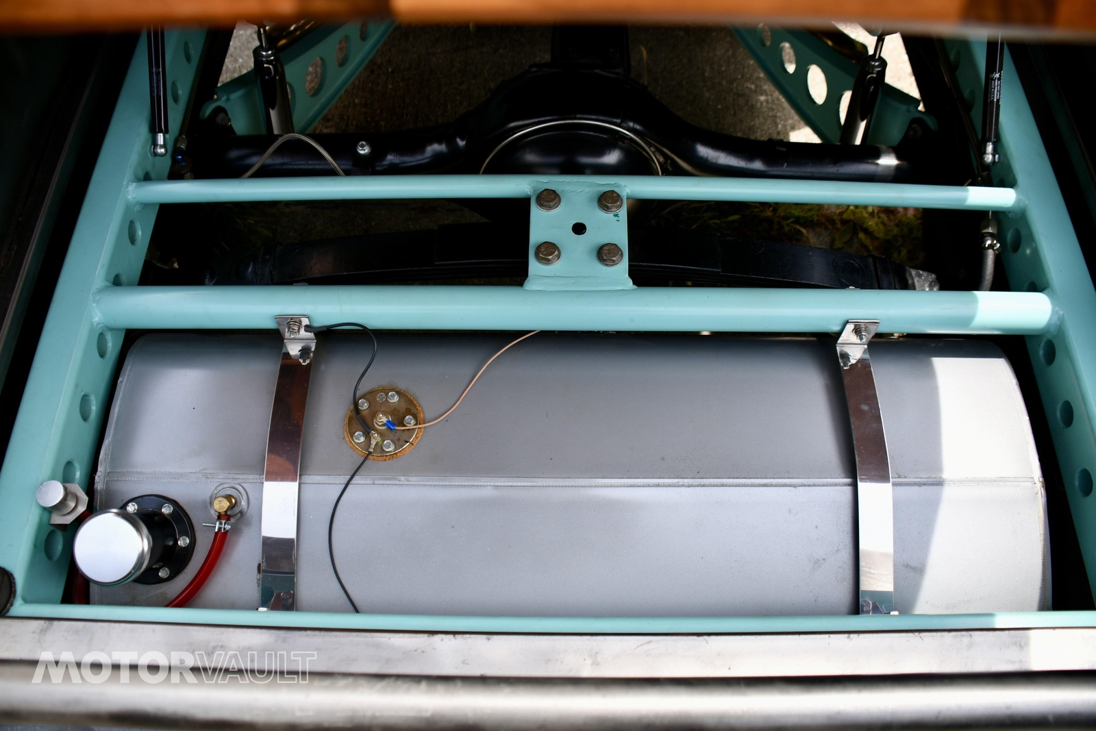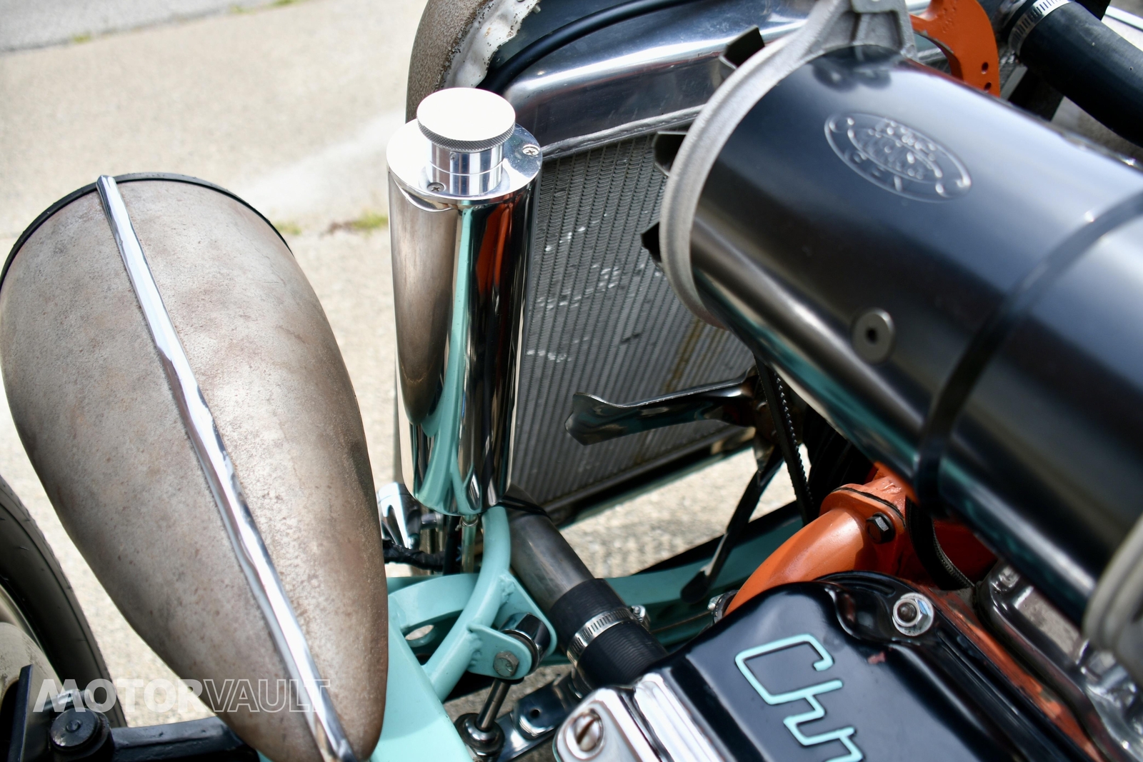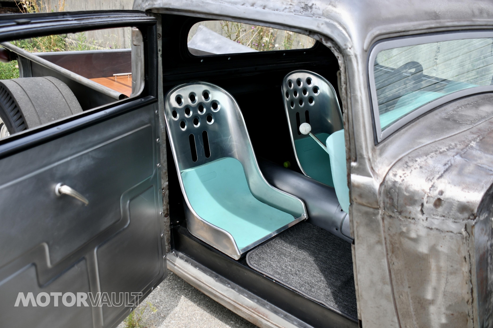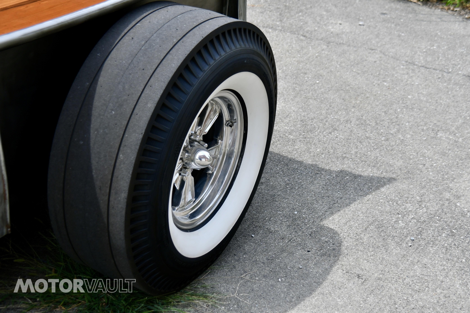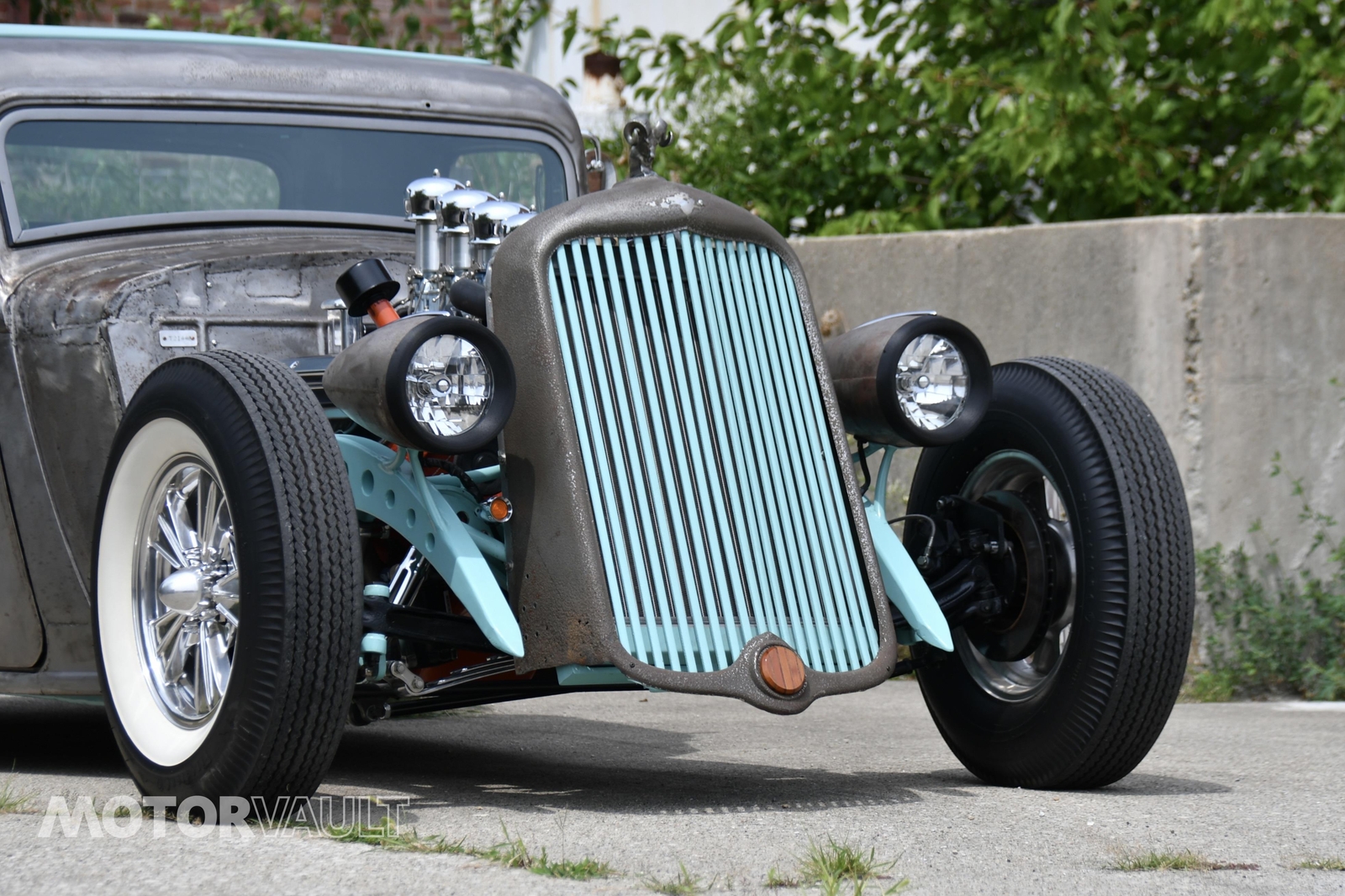 - 1940 Ford front axle w/ disc brakes stabilized by drilled and arched wish bones