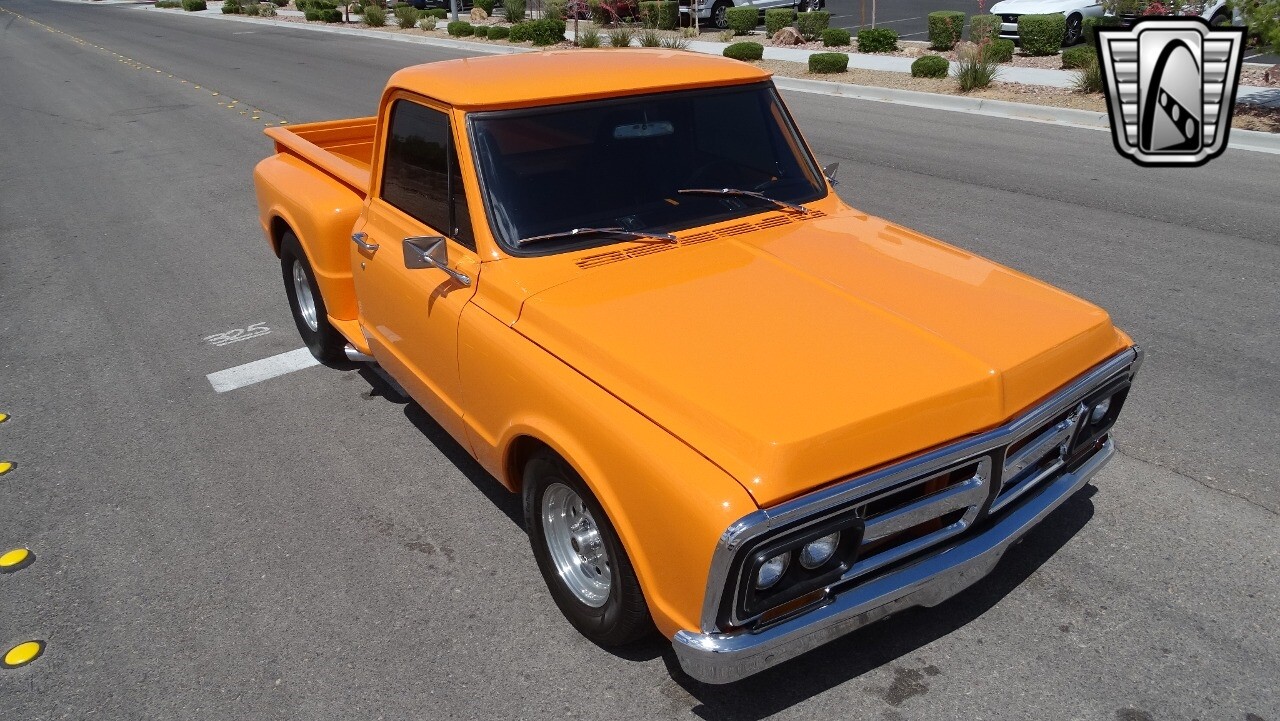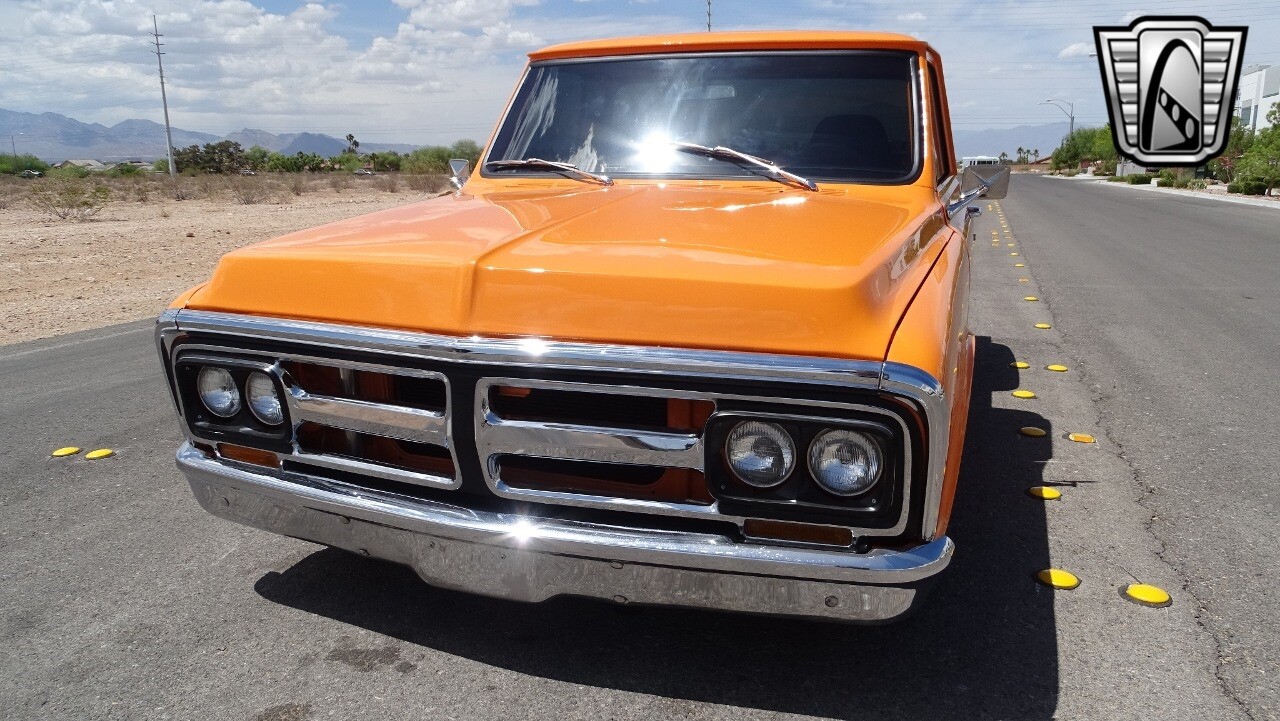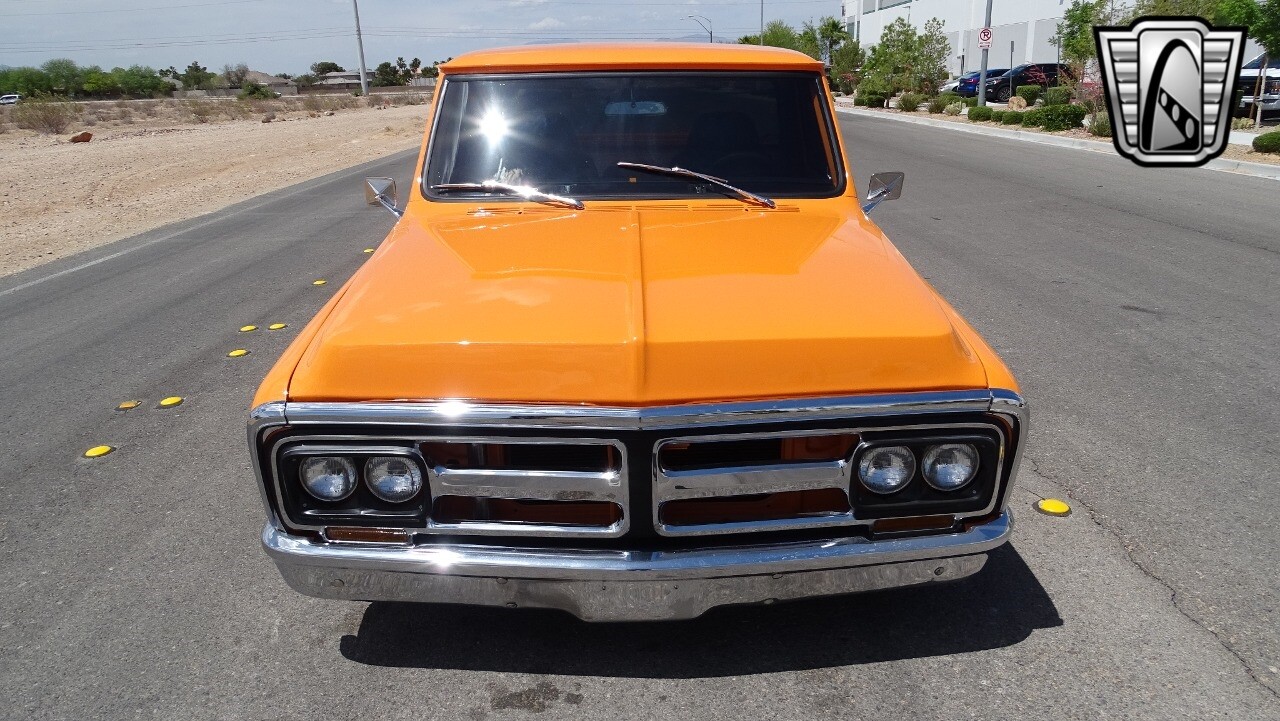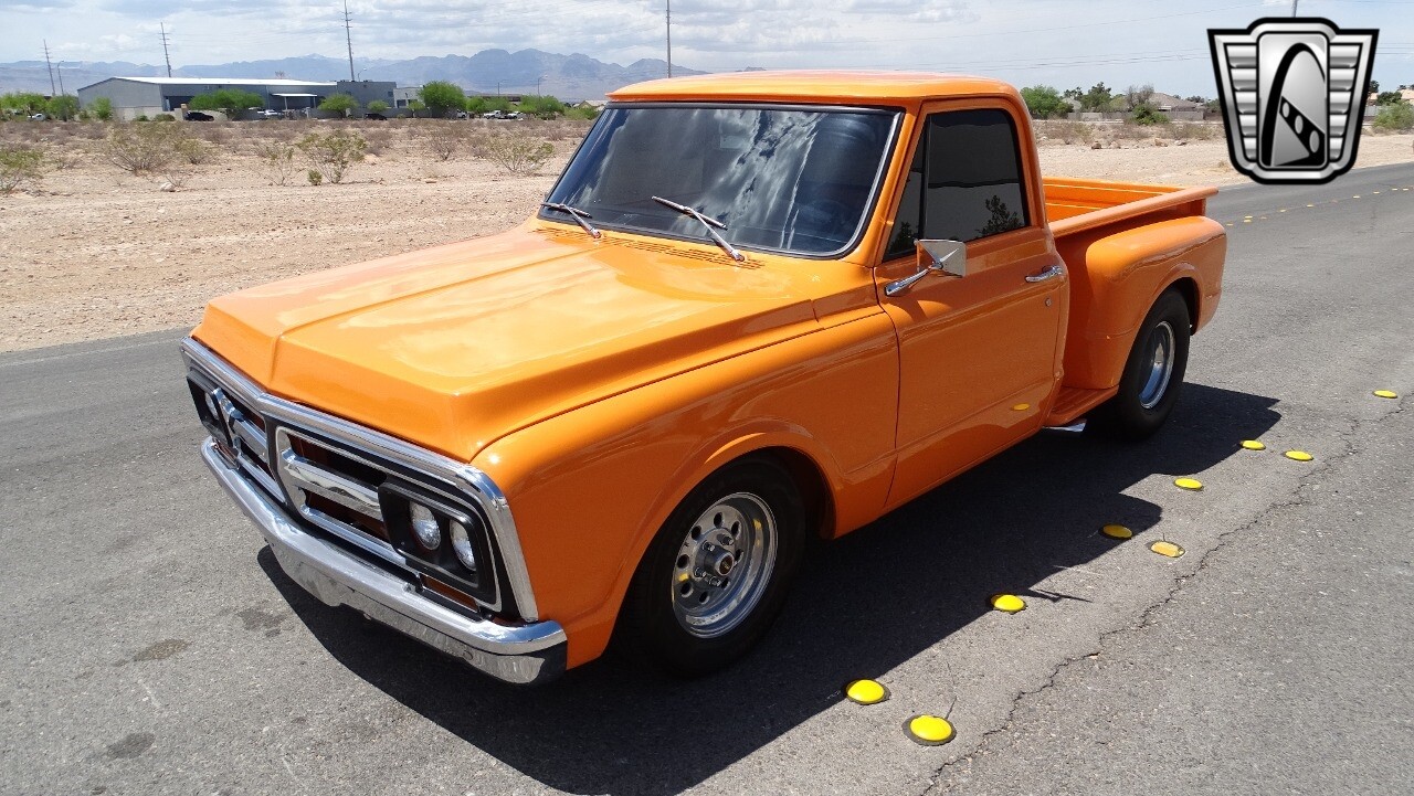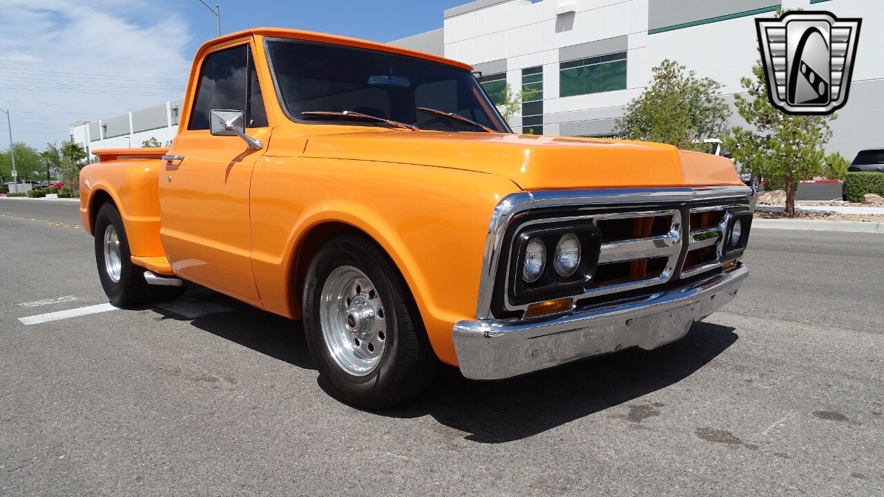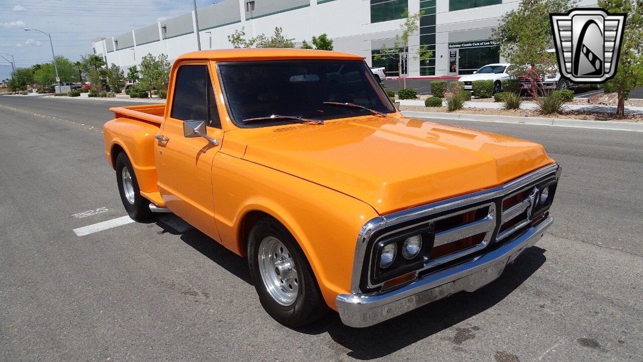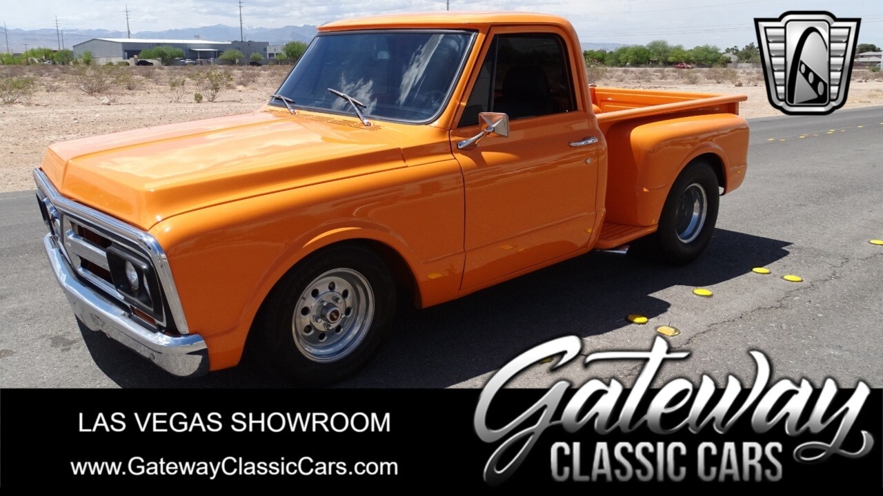 Gateway Classic Cars of Las Vegas is proud to digitally present this 1971 GMC C1500 Short bed Pickup. [ omitted ]. Walking around this pre-street '71 one should notice the Mercedes Orange gloss paint that is offset with black accent trim. Adding to the curb appeal are chrome bumpers, chrome mirrors, chrome handles, dual side exhaust, tinted windows, side steps, short-bed, light tan wood bed kit, 1-piece molded bed, frenched in taillights, fuel cell located in the bed, and even an aggressive mini-tubbed stance with rear air bags, and 15" Weld Racing rims wrapped in Mickey Thompson radial tires. Jumping into the cab of this recently restored piece of GM history, you instantly see the exterior theme was carried inside to match. Sporting a custom black leather bench seat with orange inserts, orange stitching, matching dash pad, matching custom orange/black door panels, chrome accent trim, tilt steering wheel, aftermarket Auto-Meter Pro Comp gauges, White Hurst shifter on the floor, upgraded sound system with Pioneer head unit and Rockford Fosgate speakers, and even a MSD ignition setup. Powering this beast is a 383 CID V8 engine that is mated to a performance built 4-speed manual transmission. The owner states that the engine was rebuilt less than 1,000 miles ago and has provided a dyno report from ATK High Performance Engines. The report shows this truck is capable of 500 HP/505 FT TQ, prefers 91 plus octane, and is ready to run! Pushing this power to the ground is a Ford 9" Rear with 3.70 gears. Under the hood is organized and shows upgrades that include dual electric cooling fans, aluminum Edelbrock intake, 1 Inch Headman headers, ATK HP Heads, Weiland action long pump water pump, Quick Fuel 750CFM Carburetor, and so on! This truck also provides ease of power steering and power brakes. The owner provided a complete breakdown of the engine specs, receipts from other items purchased for this build, and even the dyno report. If you are looking for a built beast that needs nothing but a new owner, this could be the one you have been searching for!.