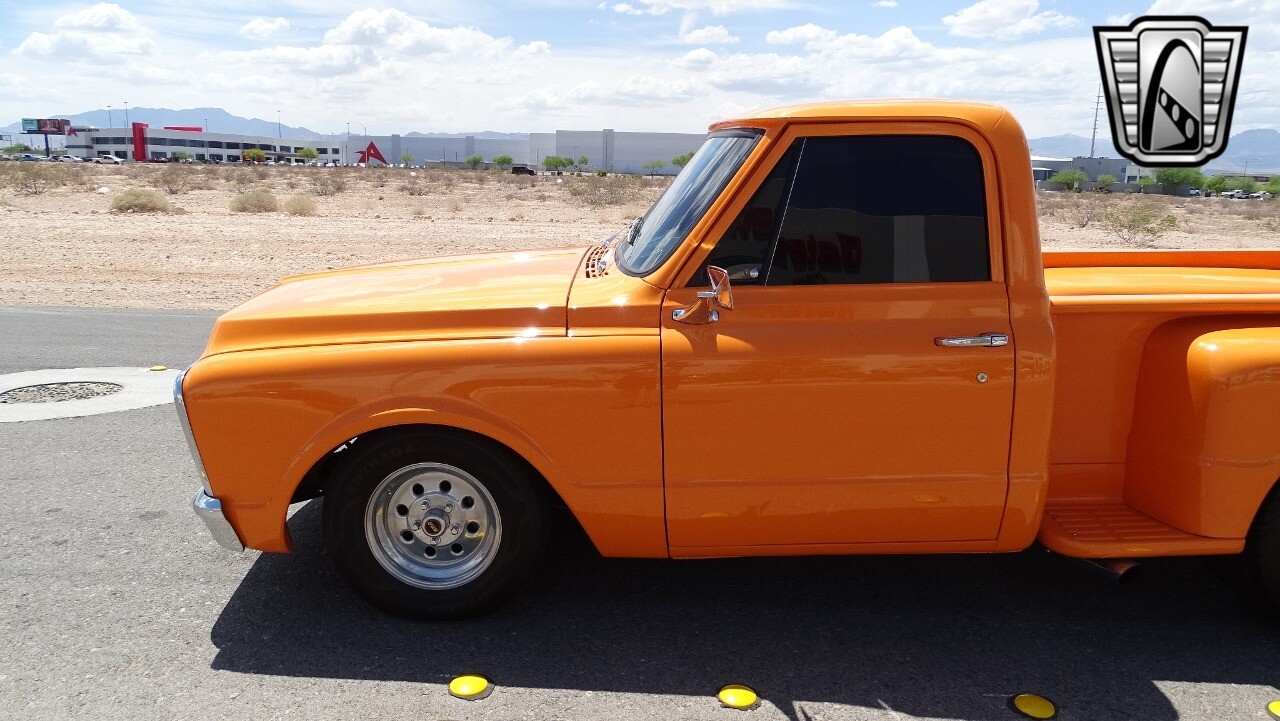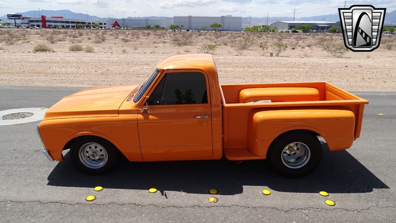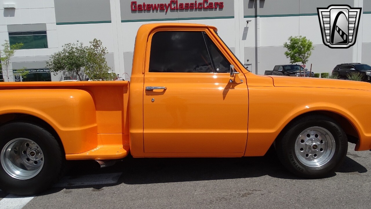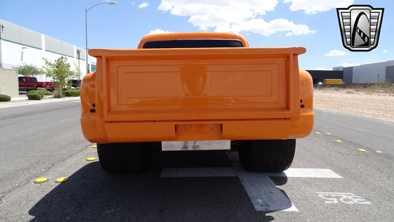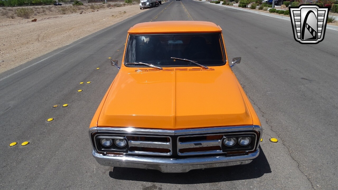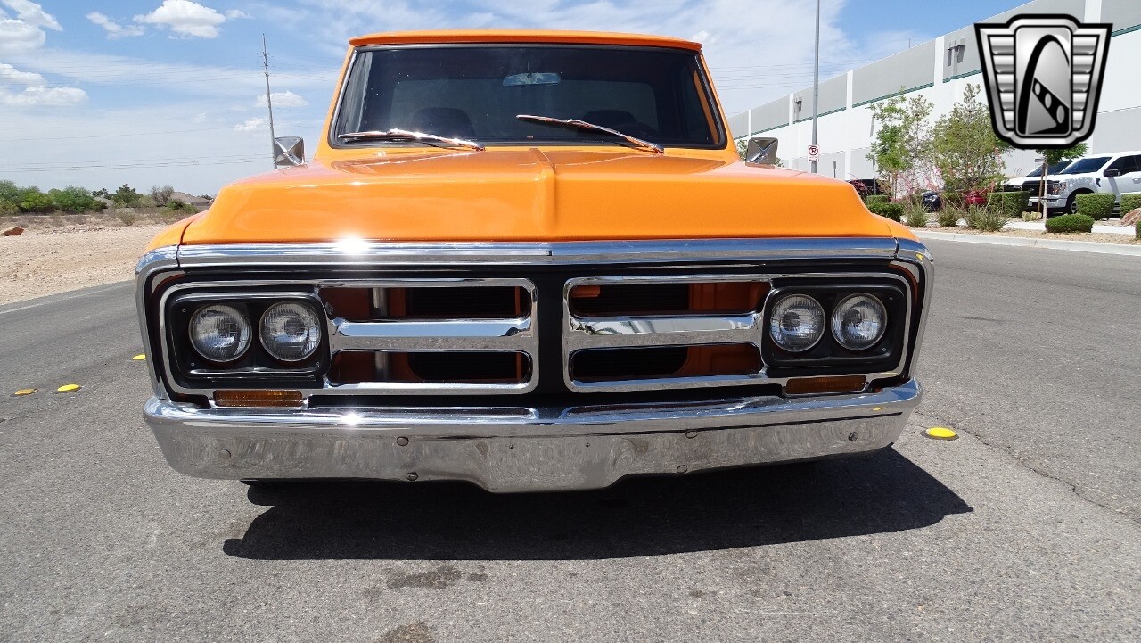 Gateway Classic Cars of Las Vegas is proud to digitally present this 1971 GMC C1500 Short bed Pickup. [ omitted ]. Walking around this pre-street '71 one should notice the Mercedes Orange gloss paint that is offset with black accent trim. Adding to the curb appeal are chrome bumpers, chrome mirrors, chrome handles, dual side exhaust, tinted windows, side steps, short-bed, light tan wood bed kit, 1-piece molded bed, frenched in taillights, fuel cell located in the bed, and even an aggressive mini-tubbed stance with rear air bags, and 15" Weld Racing rims wrapped in Mickey Thompson radial tires. Jumping into the cab of this recently restored piece of GM history, you instantly see the exterior theme was carried inside to match. Sporting a custom black leather bench seat with orange inserts, orange stitching, matching dash pad, matching custom orange/black door panels, chrome accent trim, tilt steering wheel, aftermarket Auto-Meter Pro Comp gauges, White Hurst shifter on the floor, upgraded sound system with Pioneer head unit and Rockford Fosgate speakers, and even a MSD ignition setup. Powering this beast is a 383 CID V8 engine that is mated to a performance built 4-speed manual transmission. The owner states that the engine was rebuilt less than 1,000 miles ago and has provided a dyno report from ATK High Performance Engines. The report shows this truck is capable of 500 HP/505 FT TQ, prefers 91 plus octane, and is ready to run! Pushing this power to the ground is a Ford 9" Rear with 3.70 gears. Under the hood is organized and shows upgrades that include dual electric cooling fans, aluminum Edelbrock intake, 1 Inch Headman headers, ATK HP Heads, Weiland action long pump water pump, Quick Fuel 750CFM Carburetor, and so on! This truck also provides ease of power steering and power brakes. The owner provided a complete breakdown of the engine specs, receipts from other items purchased for this build, and even the dyno report. If you are looking for a built beast that needs nothing but a new owner, this could be the one you have been searching for!.