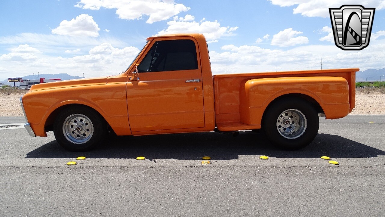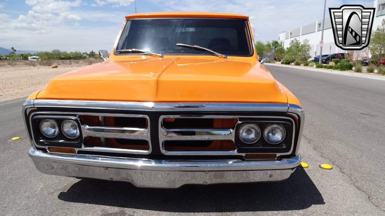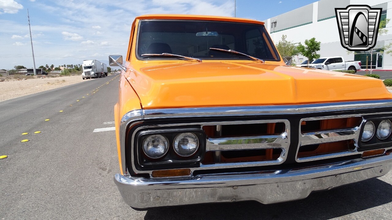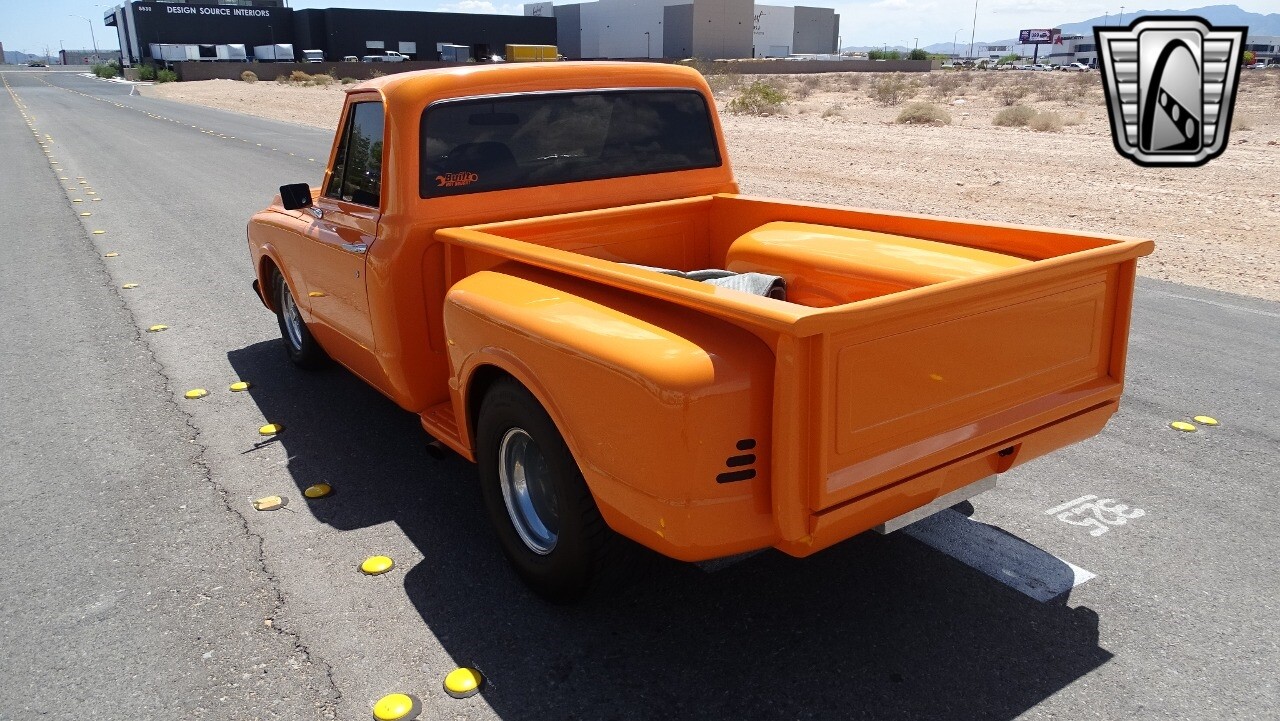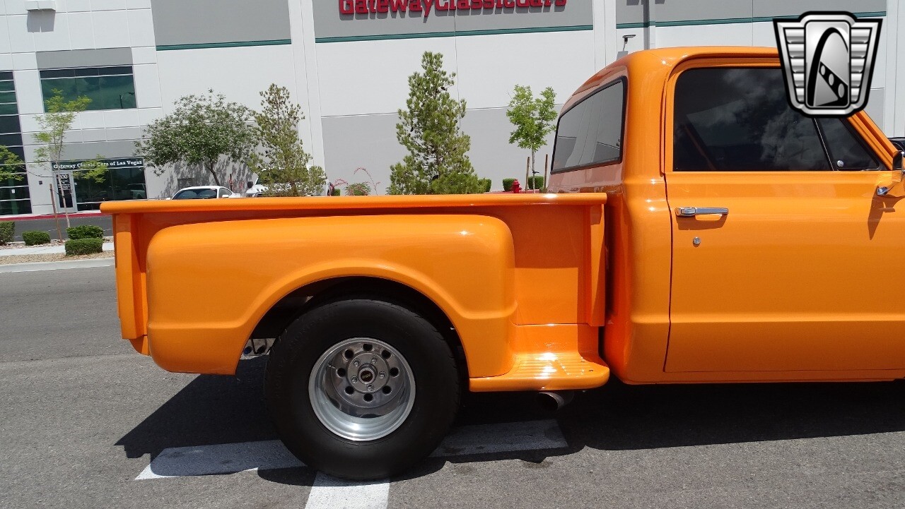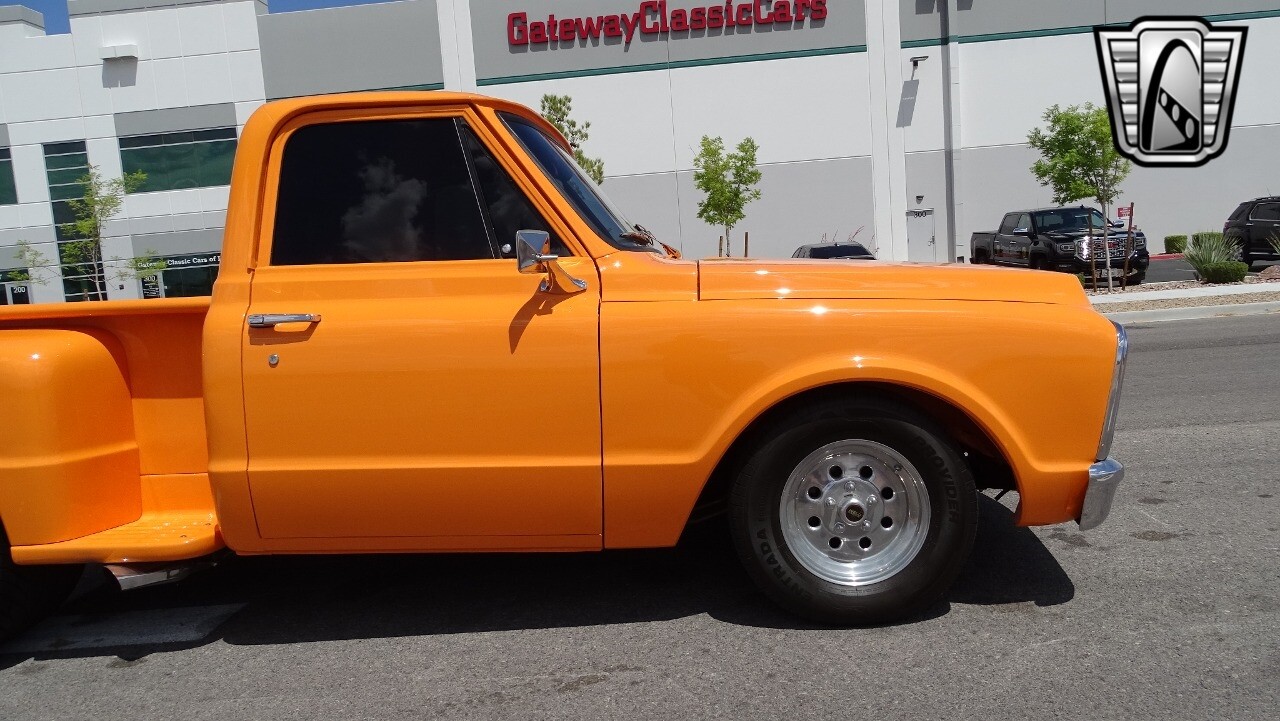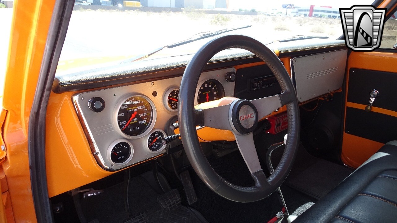 Gateway Classic Cars of Las Vegas is proud to digitally present this 1971 GMC C1500 Short bed Pickup. [ omitted ]. Walking around this pre-street '71 one should notice the Mercedes Orange gloss paint that is offset with black accent trim. Adding to the curb appeal are chrome bumpers, chrome mirrors, chrome handles, dual side exhaust, tinted windows, side steps, short-bed, light tan wood bed kit, 1-piece molded bed, frenched in taillights, fuel cell located in the bed, and even an aggressive mini-tubbed stance with rear air bags, and 15" Weld Racing rims wrapped in Mickey Thompson radial tires. Jumping into the cab of this recently restored piece of GM history, you instantly see the exterior theme was carried inside to match. Sporting a custom black leather bench seat with orange inserts, orange stitching, matching dash pad, matching custom orange/black door panels, chrome accent trim, tilt steering wheel, aftermarket Auto-Meter Pro Comp gauges, White Hurst shifter on the floor, upgraded sound system with Pioneer head unit and Rockford Fosgate speakers, and even a MSD ignition setup. Powering this beast is a 383 CID V8 engine that is mated to a performance built 4-speed manual transmission. The owner states that the engine was rebuilt less than 1,000 miles ago and has provided a dyno report from ATK High Performance Engines. The report shows this truck is capable of 500 HP/505 FT TQ, prefers 91 plus octane, and is ready to run! Pushing this power to the ground is a Ford 9" Rear with 3.70 gears. Under the hood is organized and shows upgrades that include dual electric cooling fans, aluminum Edelbrock intake, 1 Inch Headman headers, ATK HP Heads, Weiland action long pump water pump, Quick Fuel 750CFM Carburetor, and so on! This truck also provides ease of power steering and power brakes. The owner provided a complete breakdown of the engine specs, receipts from other items purchased for this build, and even the dyno report. If you are looking for a built beast that needs nothing but a new owner, this could be the one you have been searching for!.