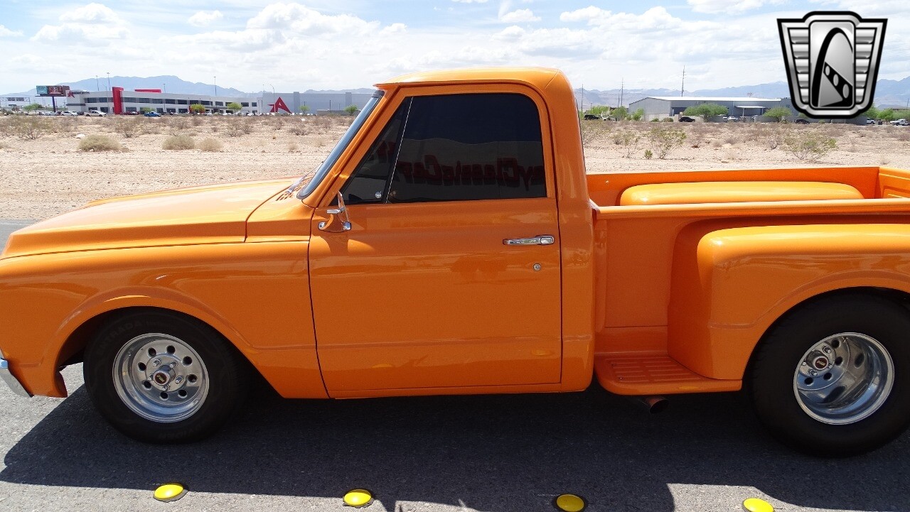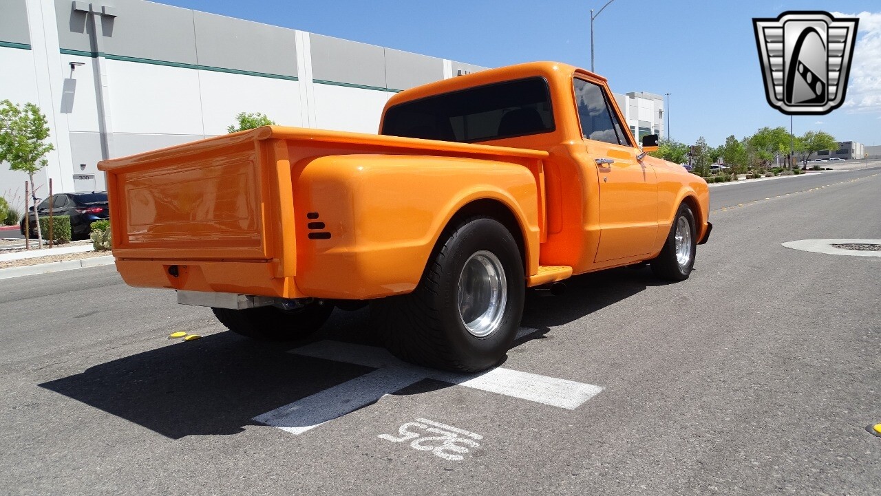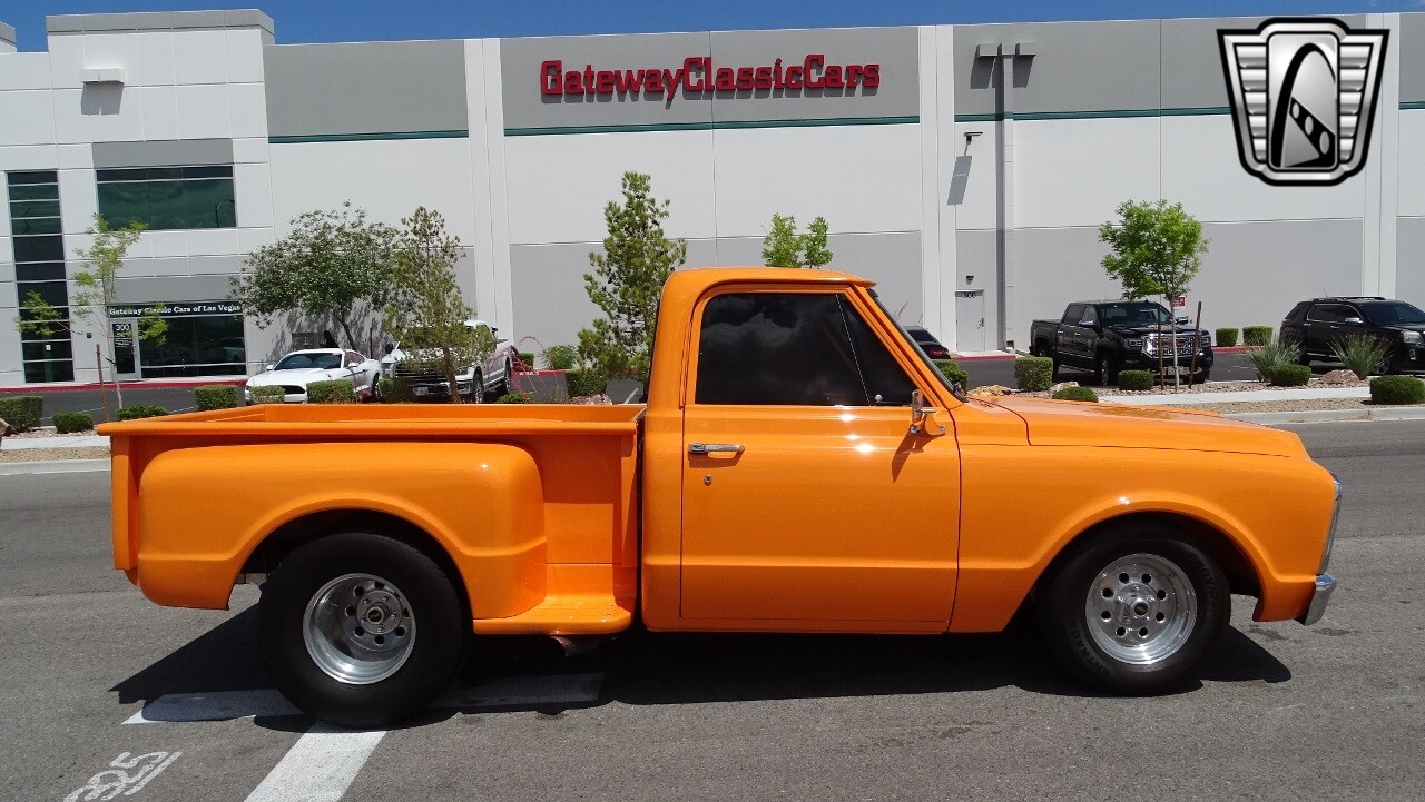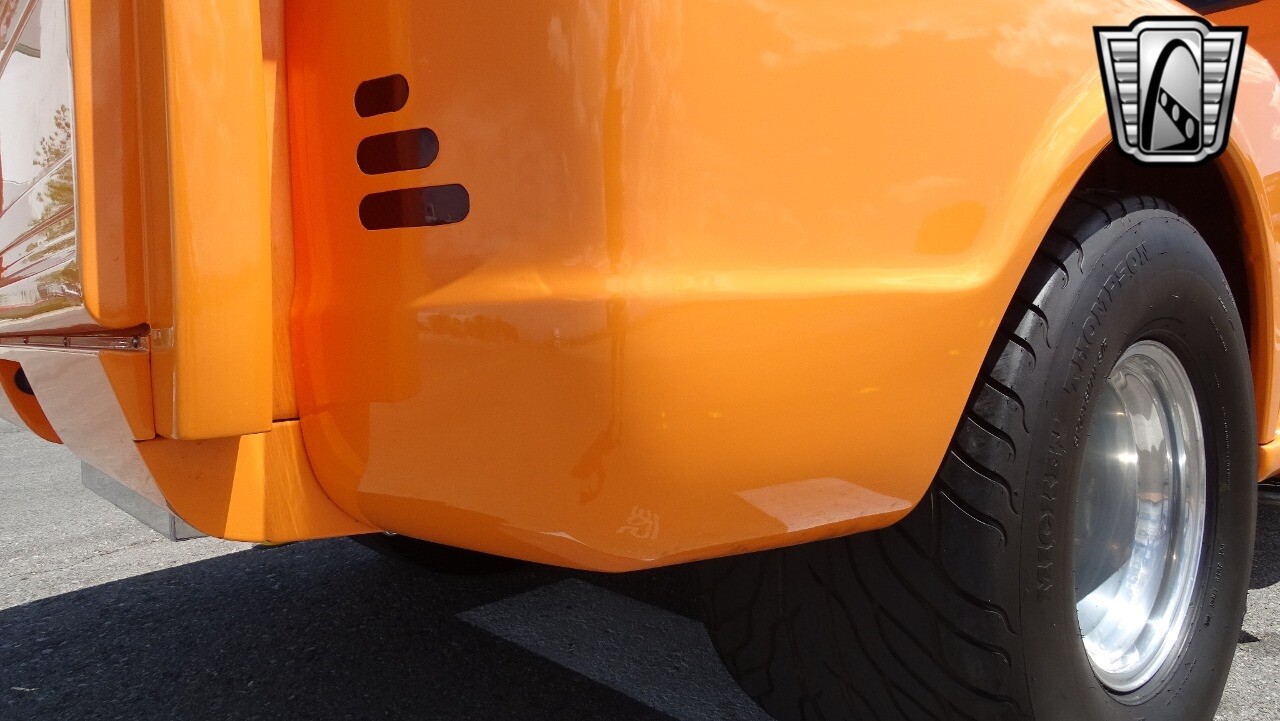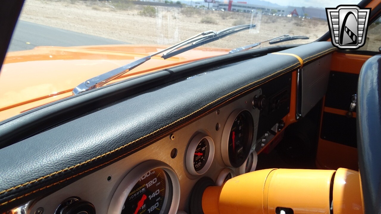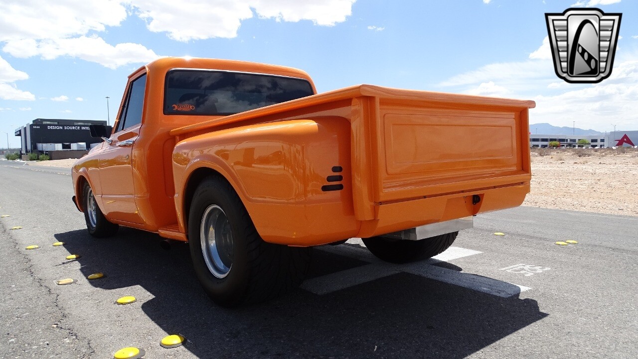 Gateway Classic Cars of Las Vegas is proud to digitally present this 1971 GMC C1500 Short bed Pickup. [ omitted ]. Walking around this pre-street '71 one should notice the Mercedes Orange gloss paint that is offset with black accent trim. Adding to the curb appeal are chrome bumpers, chrome mirrors, chrome handles, dual side exhaust, tinted windows, side steps, short-bed, light tan wood bed kit, 1-piece molded bed, frenched in taillights, fuel cell located in the bed, and even an aggressive mini-tubbed stance with rear air bags, and 15" Weld Racing rims wrapped in Mickey Thompson radial tires. Jumping into the cab of this recently restored piece of GM history, you instantly see the exterior theme was carried inside to match. Sporting a custom black leather bench seat with orange inserts, orange stitching, matching dash pad, matching custom orange/black door panels, chrome accent trim, tilt steering wheel, aftermarket Auto-Meter Pro Comp gauges, White Hurst shifter on the floor, upgraded sound system with Pioneer head unit and Rockford Fosgate speakers, and even a MSD ignition setup. Powering this beast is a 383 CID V8 engine that is mated to a performance built 4-speed manual transmission. The owner states that the engine was rebuilt less than 1,000 miles ago and has provided a dyno report from ATK High Performance Engines. The report shows this truck is capable of 500 HP/505 FT TQ, prefers 91 plus octane, and is ready to run! Pushing this power to the ground is a Ford 9" Rear with 3.70 gears. Under the hood is organized and shows upgrades that include dual electric cooling fans, aluminum Edelbrock intake, 1 Inch Headman headers, ATK HP Heads, Weiland action long pump water pump, Quick Fuel 750CFM Carburetor, and so on! This truck also provides ease of power steering and power brakes. The owner provided a complete breakdown of the engine specs, receipts from other items purchased for this build, and even the dyno report. If you are looking for a built beast that needs nothing but a new owner, this could be the one you have been searching for!.