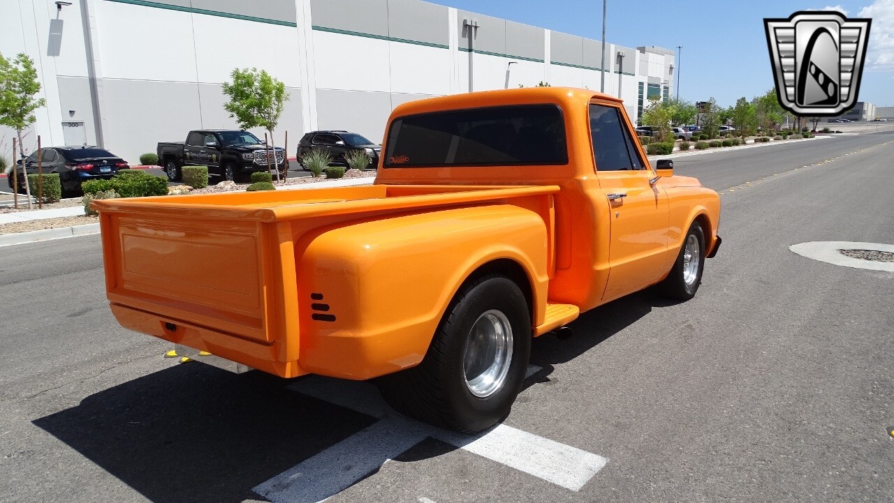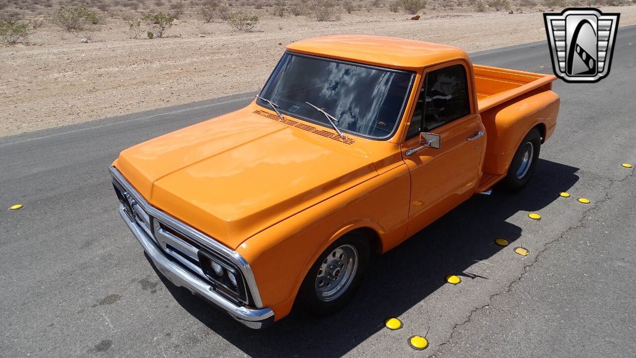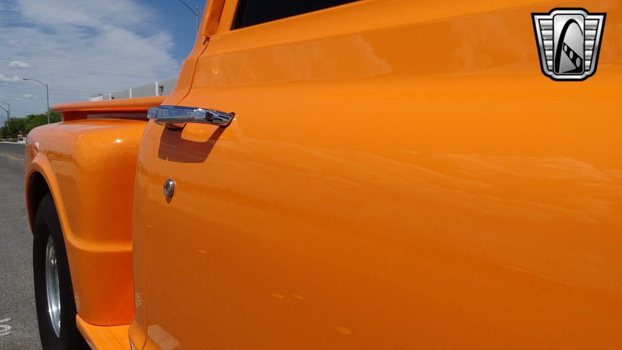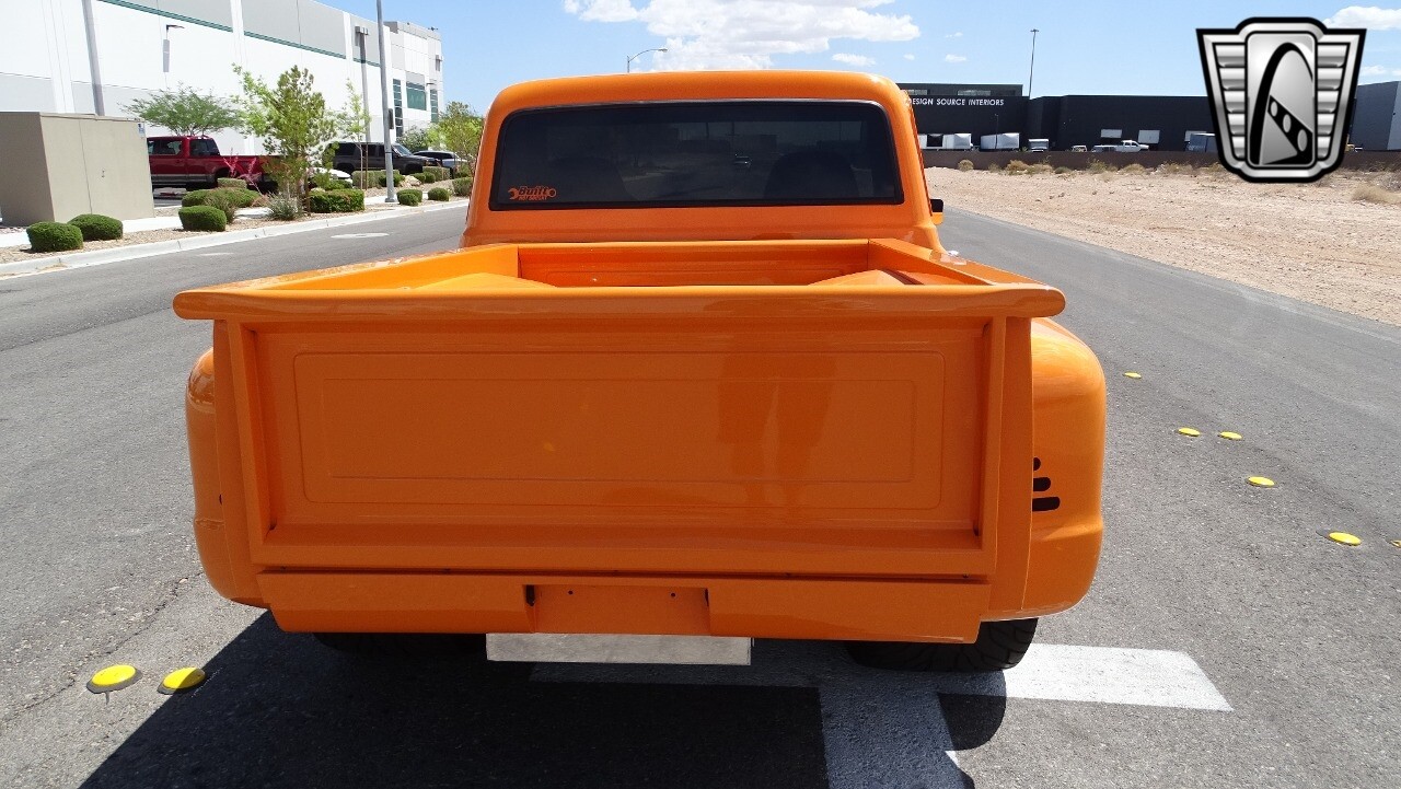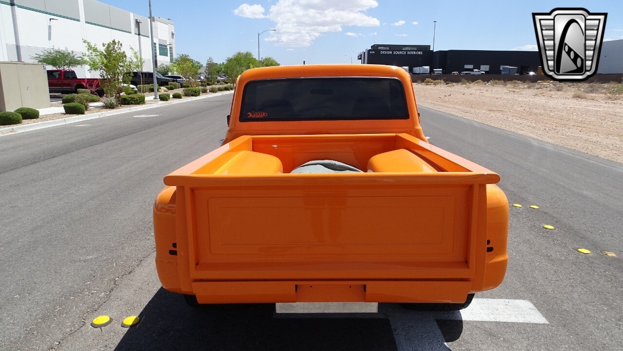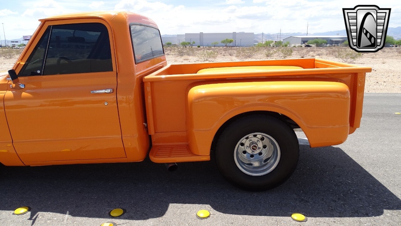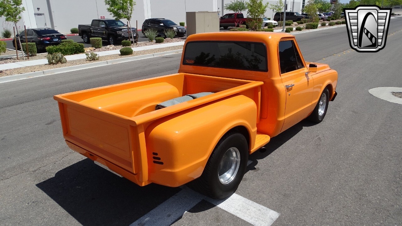 Gateway Classic Cars of Las Vegas is proud to digitally present this 1971 GMC C1500 Short bed Pickup. [ omitted ]. Walking around this pre-street '71 one should notice the Mercedes Orange gloss paint that is offset with black accent trim. Adding to the curb appeal are chrome bumpers, chrome mirrors, chrome handles, dual side exhaust, tinted windows, side steps, short-bed, light tan wood bed kit, 1-piece molded bed, frenched in taillights, fuel cell located in the bed, and even an aggressive mini-tubbed stance with rear air bags, and 15" Weld Racing rims wrapped in Mickey Thompson radial tires. Jumping into the cab of this recently restored piece of GM history, you instantly see the exterior theme was carried inside to match. Sporting a custom black leather bench seat with orange inserts, orange stitching, matching dash pad, matching custom orange/black door panels, chrome accent trim, tilt steering wheel, aftermarket Auto-Meter Pro Comp gauges, White Hurst shifter on the floor, upgraded sound system with Pioneer head unit and Rockford Fosgate speakers, and even a MSD ignition setup. Powering this beast is a 383 CID V8 engine that is mated to a performance built 4-speed manual transmission. The owner states that the engine was rebuilt less than 1,000 miles ago and has provided a dyno report from ATK High Performance Engines. The report shows this truck is capable of 500 HP/505 FT TQ, prefers 91 plus octane, and is ready to run! Pushing this power to the ground is a Ford 9" Rear with 3.70 gears. Under the hood is organized and shows upgrades that include dual electric cooling fans, aluminum Edelbrock intake, 1 Inch Headman headers, ATK HP Heads, Weiland action long pump water pump, Quick Fuel 750CFM Carburetor, and so on! This truck also provides ease of power steering and power brakes. The owner provided a complete breakdown of the engine specs, receipts from other items purchased for this build, and even the dyno report. If you are looking for a built beast that needs nothing but a new owner, this could be the one you have been searching for!.
