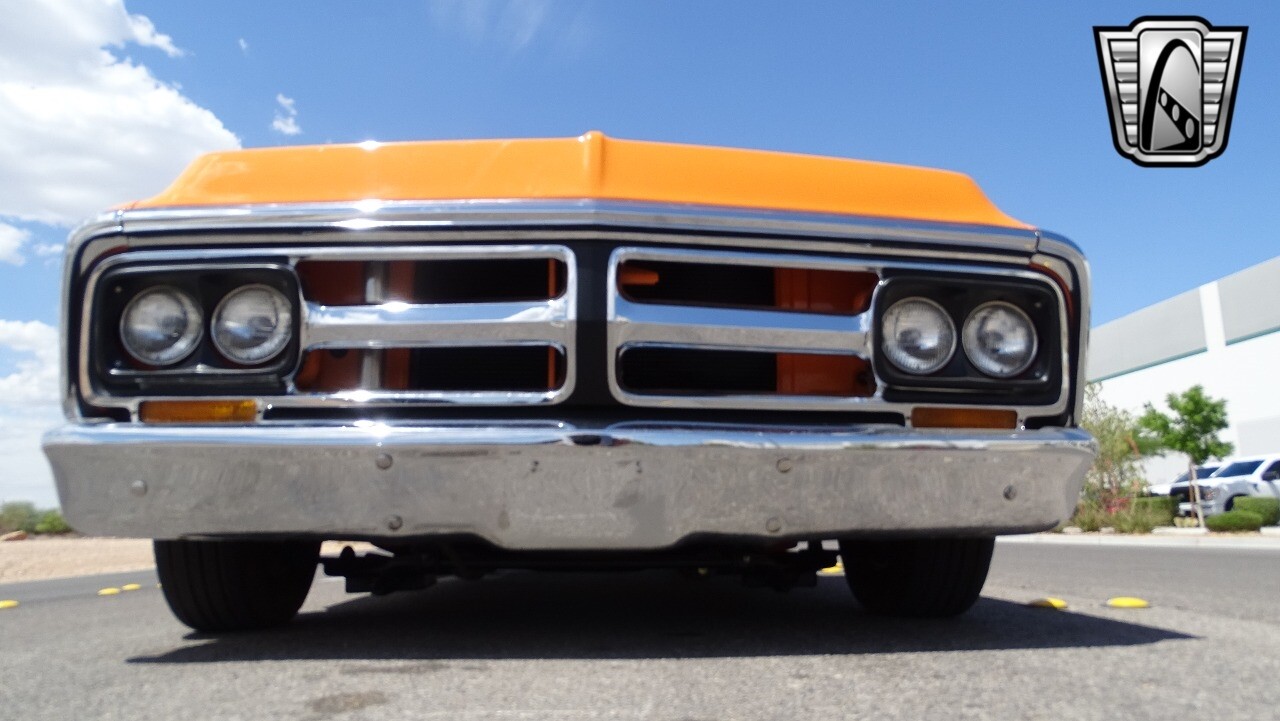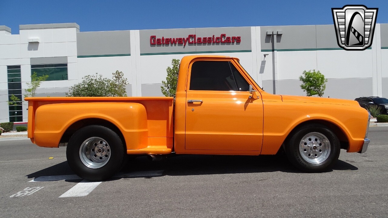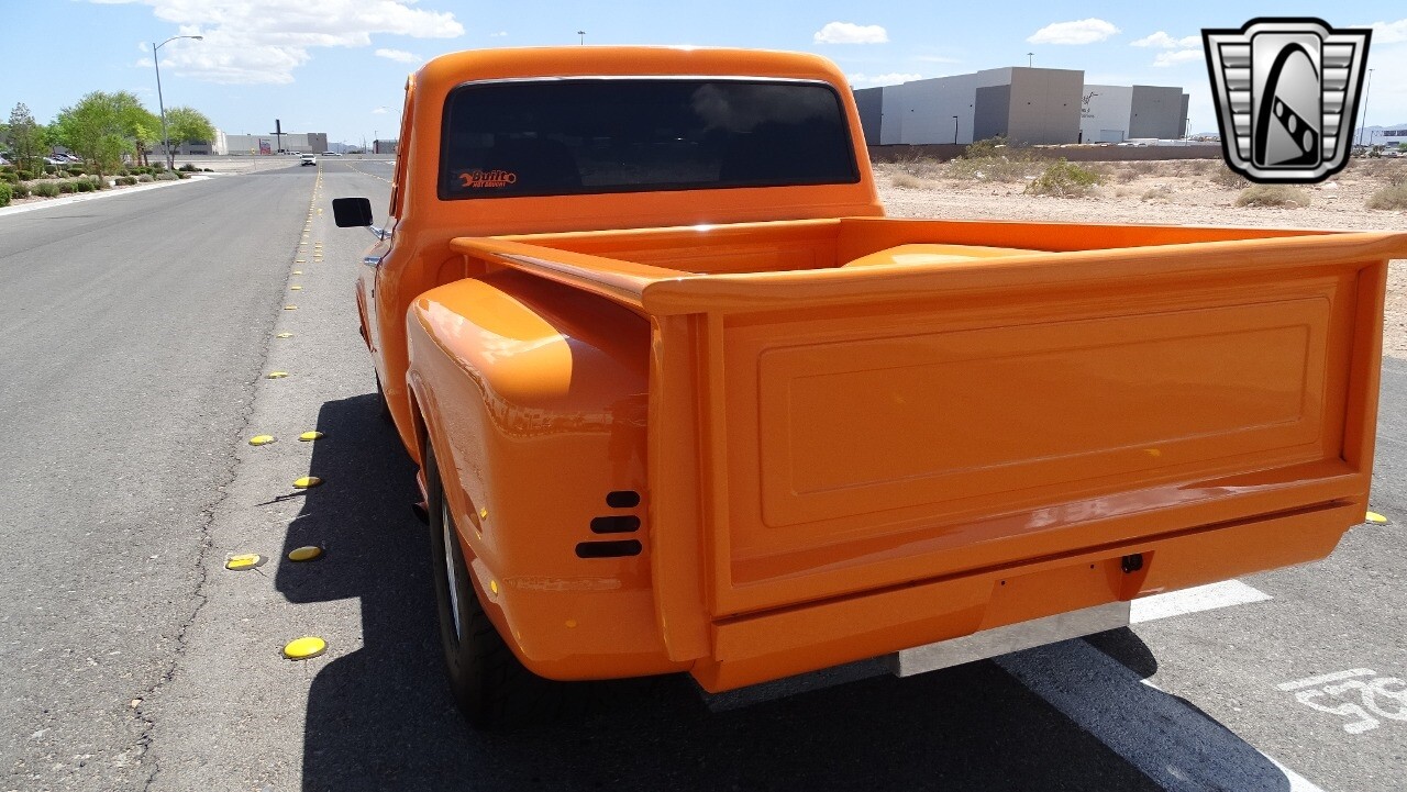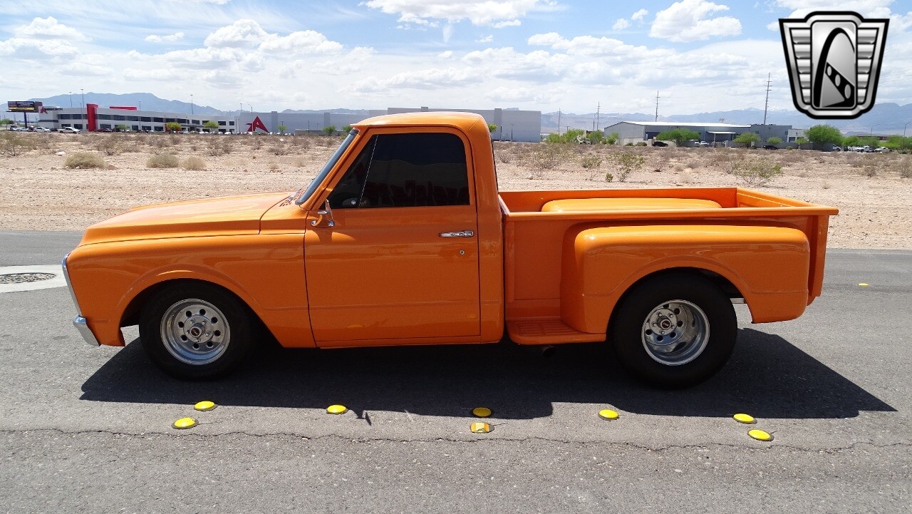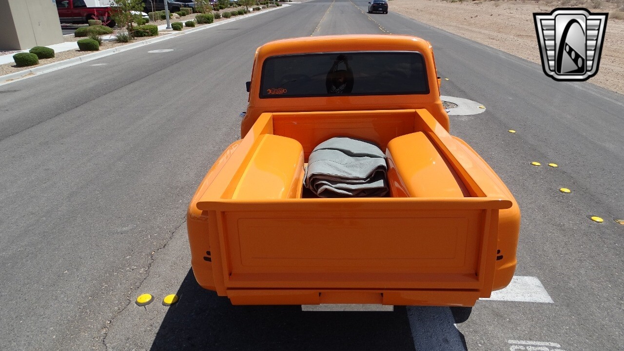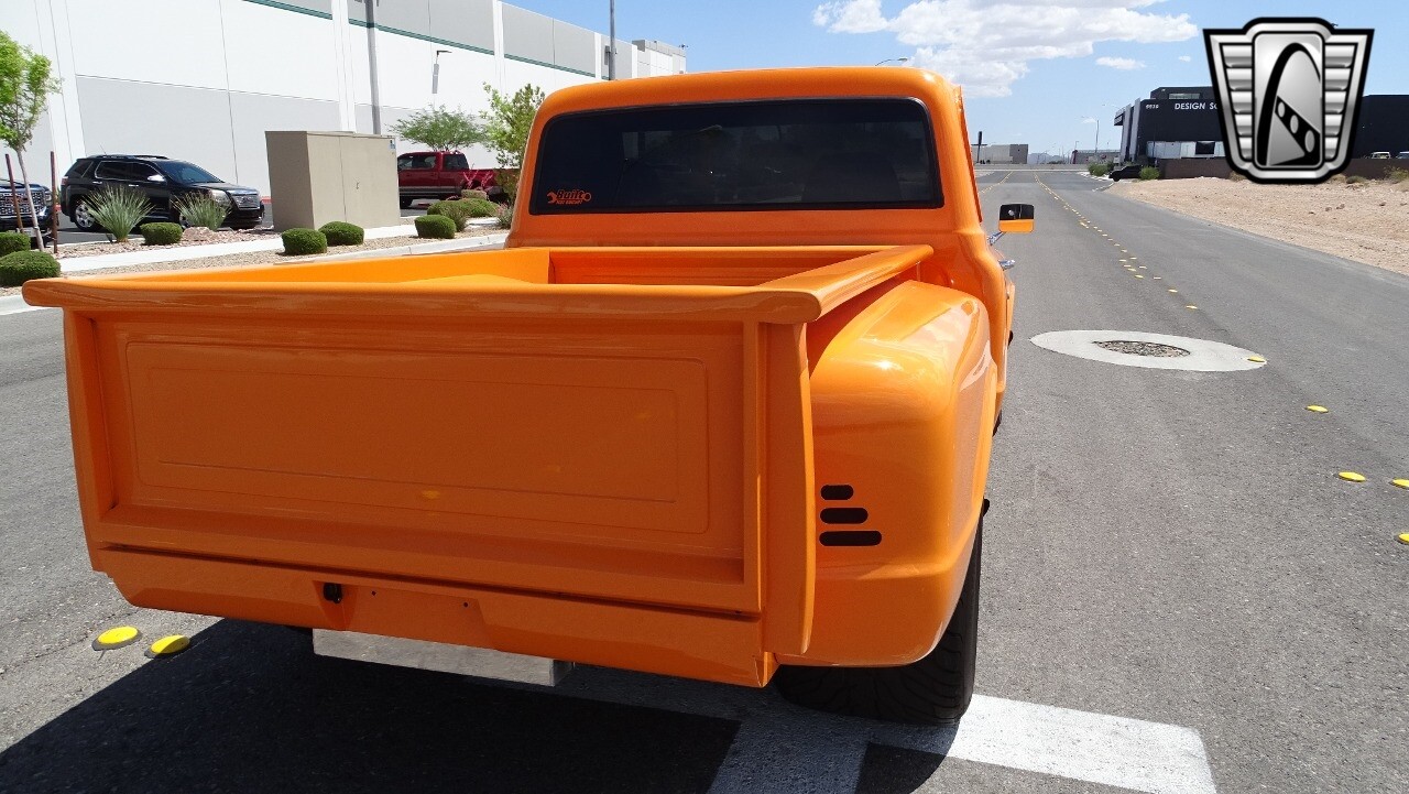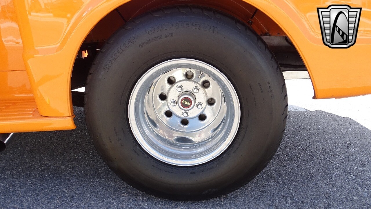 Gateway Classic Cars of Las Vegas is proud to digitally present this 1971 GMC C1500 Short bed Pickup. [ omitted ]. Walking around this pre-street '71 one should notice the Mercedes Orange gloss paint that is offset with black accent trim. Adding to the curb appeal are chrome bumpers, chrome mirrors, chrome handles, dual side exhaust, tinted windows, side steps, short-bed, light tan wood bed kit, 1-piece molded bed, frenched in taillights, fuel cell located in the bed, and even an aggressive mini-tubbed stance with rear air bags, and 15" Weld Racing rims wrapped in Mickey Thompson radial tires. Jumping into the cab of this recently restored piece of GM history, you instantly see the exterior theme was carried inside to match. Sporting a custom black leather bench seat with orange inserts, orange stitching, matching dash pad, matching custom orange/black door panels, chrome accent trim, tilt steering wheel, aftermarket Auto-Meter Pro Comp gauges, White Hurst shifter on the floor, upgraded sound system with Pioneer head unit and Rockford Fosgate speakers, and even a MSD ignition setup. Powering this beast is a 383 CID V8 engine that is mated to a performance built 4-speed manual transmission. The owner states that the engine was rebuilt less than 1,000 miles ago and has provided a dyno report from ATK High Performance Engines. The report shows this truck is capable of 500 HP/505 FT TQ, prefers 91 plus octane, and is ready to run! Pushing this power to the ground is a Ford 9" Rear with 3.70 gears. Under the hood is organized and shows upgrades that include dual electric cooling fans, aluminum Edelbrock intake, 1 Inch Headman headers, ATK HP Heads, Weiland action long pump water pump, Quick Fuel 750CFM Carburetor, and so on! This truck also provides ease of power steering and power brakes. The owner provided a complete breakdown of the engine specs, receipts from other items purchased for this build, and even the dyno report. If you are looking for a built beast that needs nothing but a new owner, this could be the one you have been searching for!.