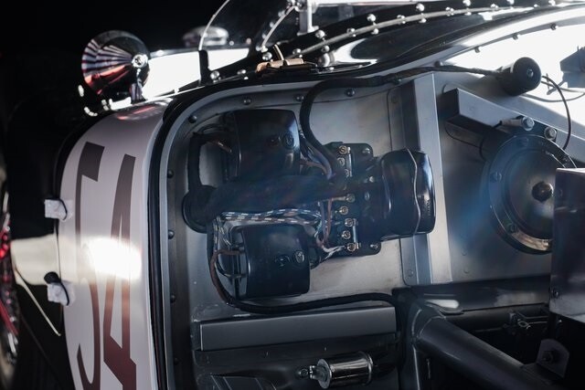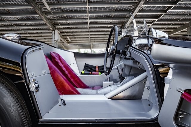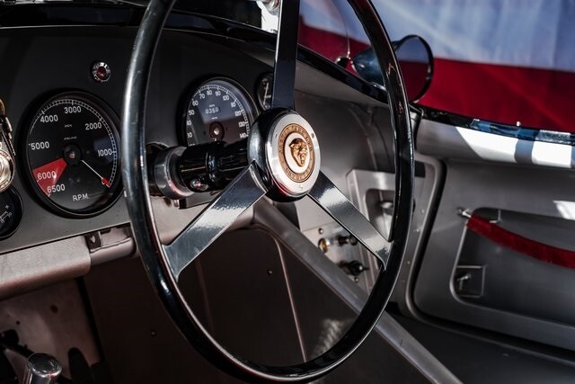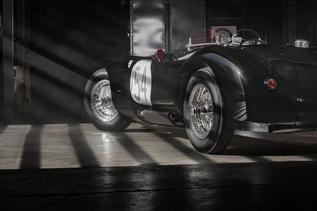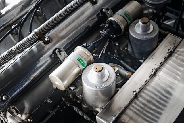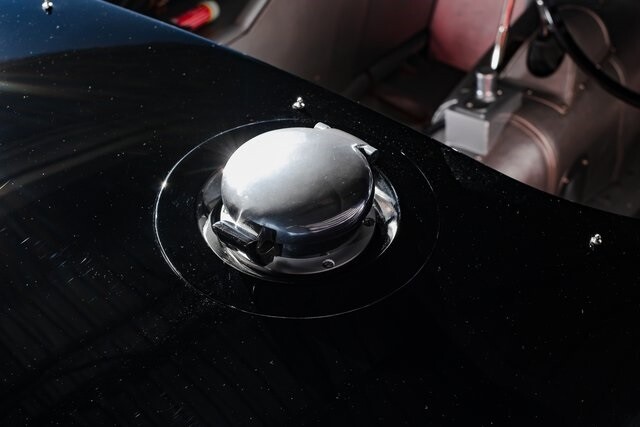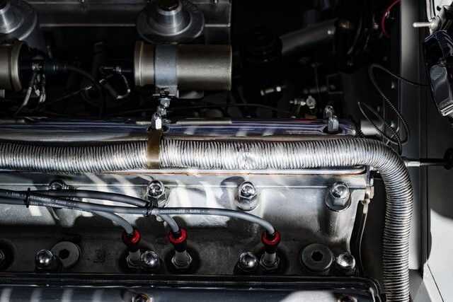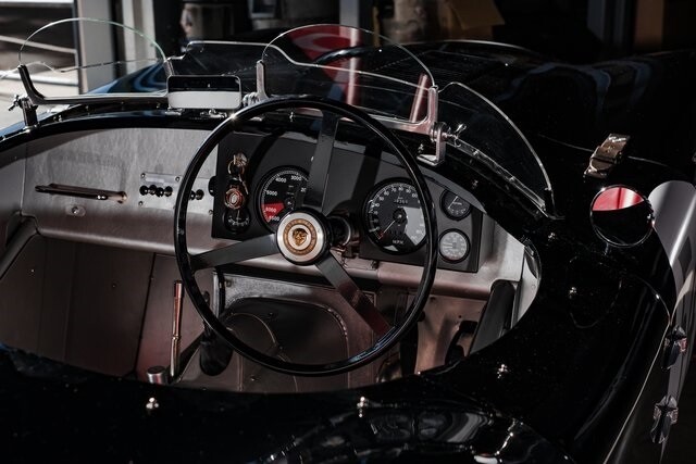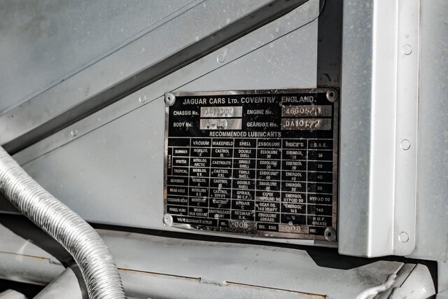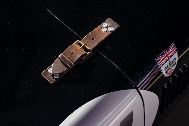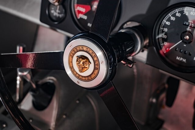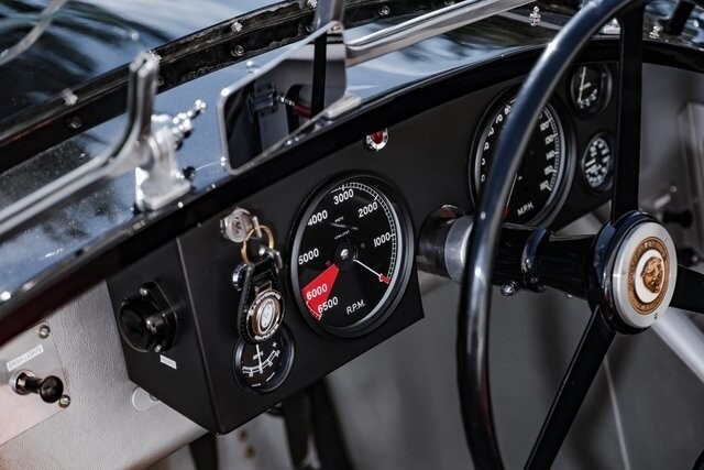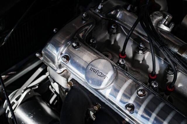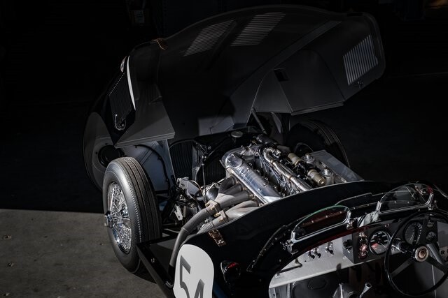 This car is said to be among a limited run of re-creations built with hand-formed aluminum bodywork by Hawker Racing, which was formed as an offshoot of vintage aircraft restoration outfit Hawker Restorations.The body is finished in black with number 54 roundels on the hood, sides, and tail section. A paint correction is said to have been performed in 2022. Exterior details include faired-in Lucas tri-bar headlights, leather hood-retention straps, Brooklands-style windscreens behind a fixed full-width windshield, dual side mirrors, a Monza-style fuel filler, and side-pipe exhaust with dual outlets .Chrome wire wheels are secured by two-eared knock-offs and are wrapped in 6.00H16 Avon Turbospeed Mk 4 tires. Stopping is handled by drum brakes at each corner, while steering is via rack and pinion. The brake fluid reservoir was replaced in 2022, at which time the fluid was flushed.The right-hand-drive cockpit houses a pair of fixed-back bucket seats trimmed in red leather, while silver upholstery covers the center tunnel. Additional features include a door-pull strap wrapped in red leather, a polished shift knob, a dash-mounted rearview mirror, and a passenger-side grab handle.The three-spoke steering wheel sits ahead of Smiths instrumentation including a 160-mph speedometer, a reverse-sweep tachometer, and gauges monitoring amperage, fuel level, oil pressure, and coolant temperature. The five-digit odometer shows 360 miles.The 3.4-liter XK inline-six features dual-overhead camshafts, twin SU carburetors, a cold-air intake box, twin Lucas coils, and three-into-one exhaust headers. Service in 2022 included cleaning of the carburetors, repairs to the radiator, flushing of the fuel system, and fluid changes.