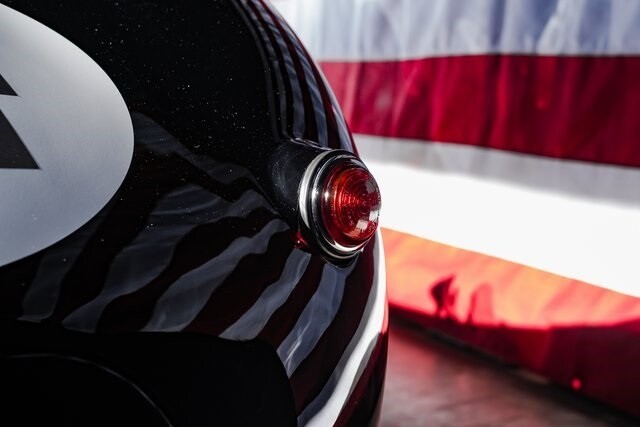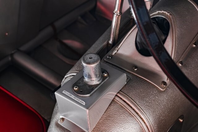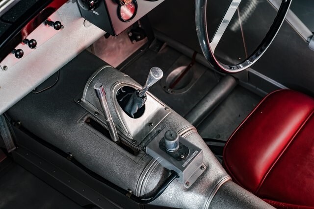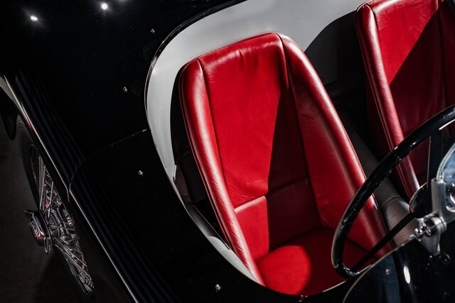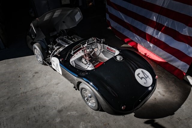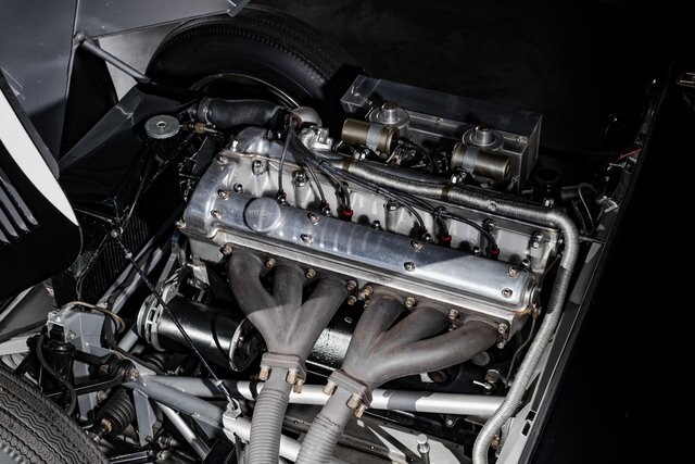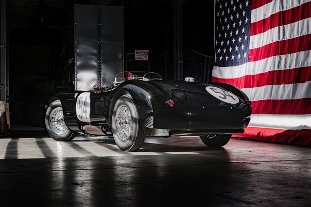 Featuring aluminum bodywork finished in black over a steel tube frame, the car is powered by a 3.4-liter Jaguar XK inline-six that breathes through twin SU carburetors. Additional features include a four-speed manual transmission, four-wheel drum brakes, independent front suspension, rack-and-pinion steering, 16 wire wheels, side-pipe exhaust, and red leather upholstery over two-place seating.