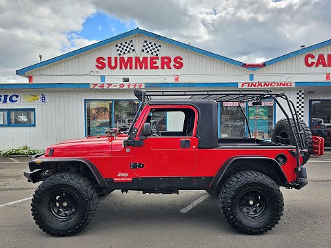 Highlights Include: 4.0L 6-cyl Engine - Automatic Transmission w/ Overdrive - Beautiful Flame Red Paint Graphite Cloth Bucket Seat w/ Console Interior - LJ XTOP Half Hardtop Kit by GR8TOPS - Bedliner - Upgraded Boss Bluetooth Stereo System w/ Kicker Speakers Air Conditioning Labeled Toggle Switches for LED Lights and Onboard Air Compressor - Hood Mounted Jack - Gobi Safari Roof Rack w/ LED Lights - X-Bull 13,000lb Winch w/ upgraded Winch Rope - Bushwacker Fender Flares - Poison Spyder Rocker Protection - Smittybilt Metal Bumpers w/ Heavy Duty Rear Tire Carrier - Sits perfect on the 15-Inch ProComp Black Alloy Wheels w/ 35 12.50 R15 Tires.