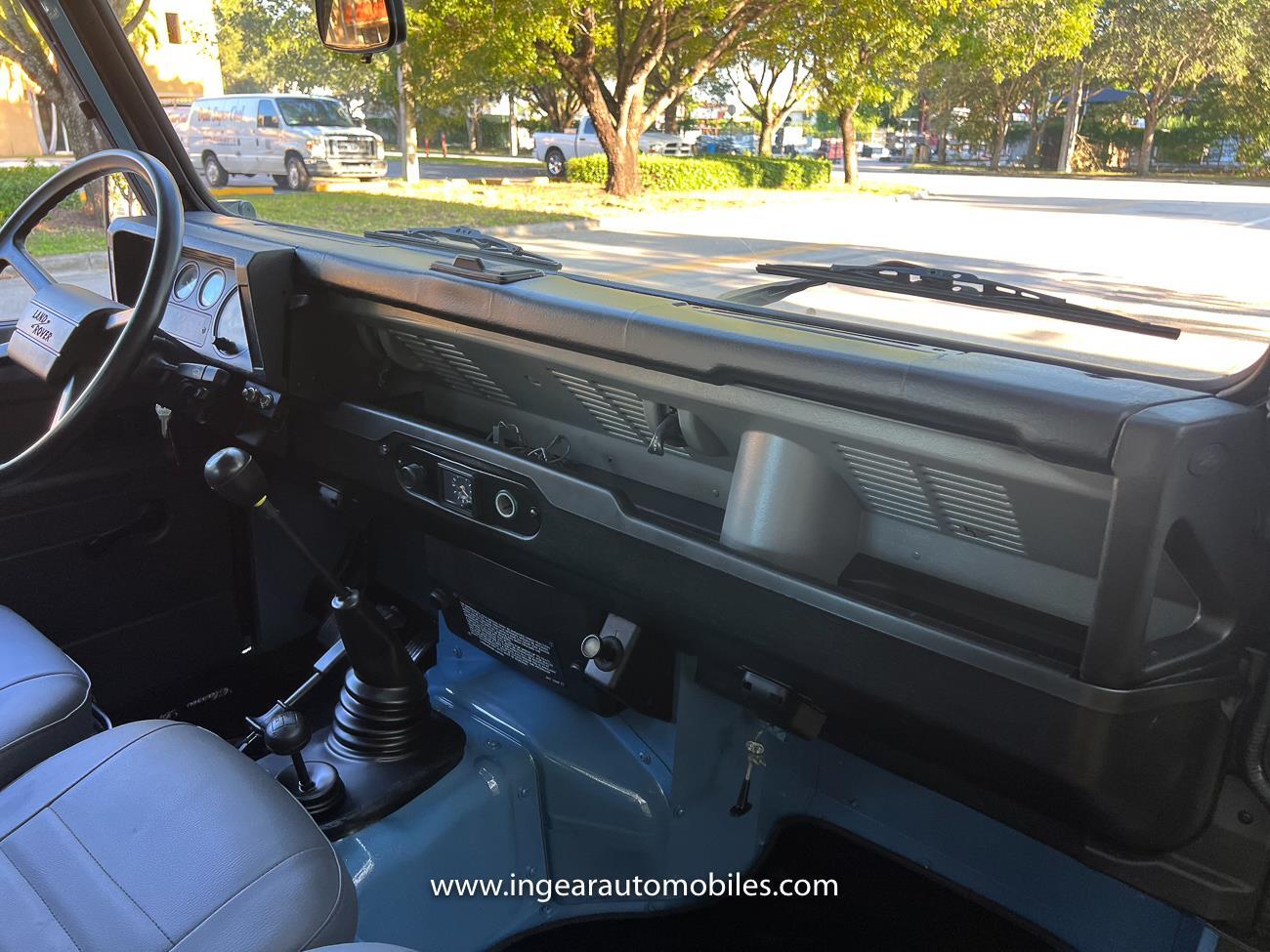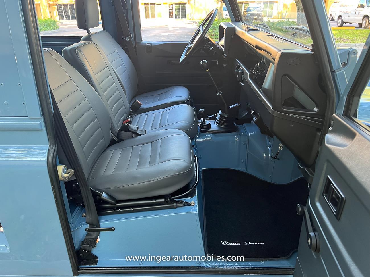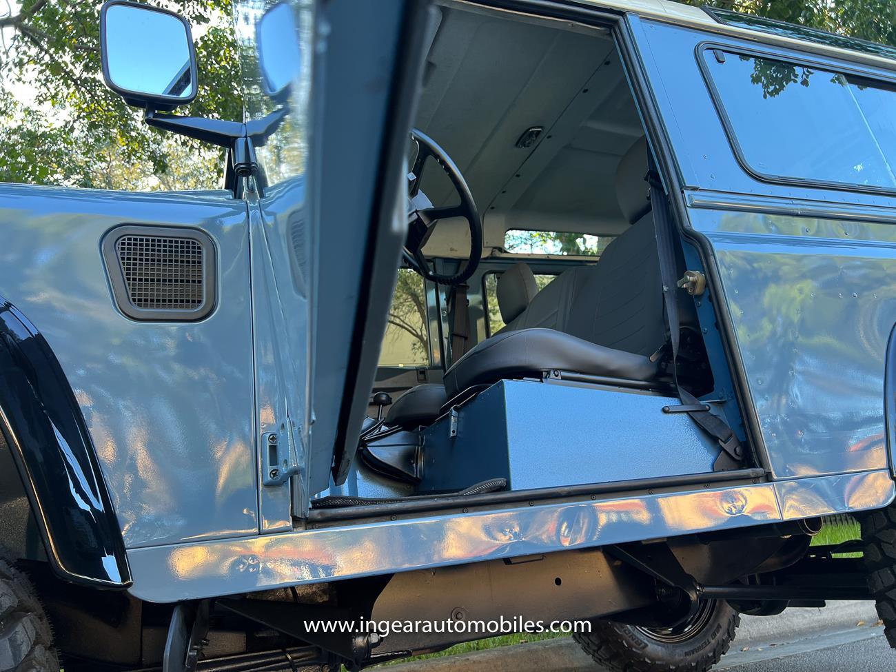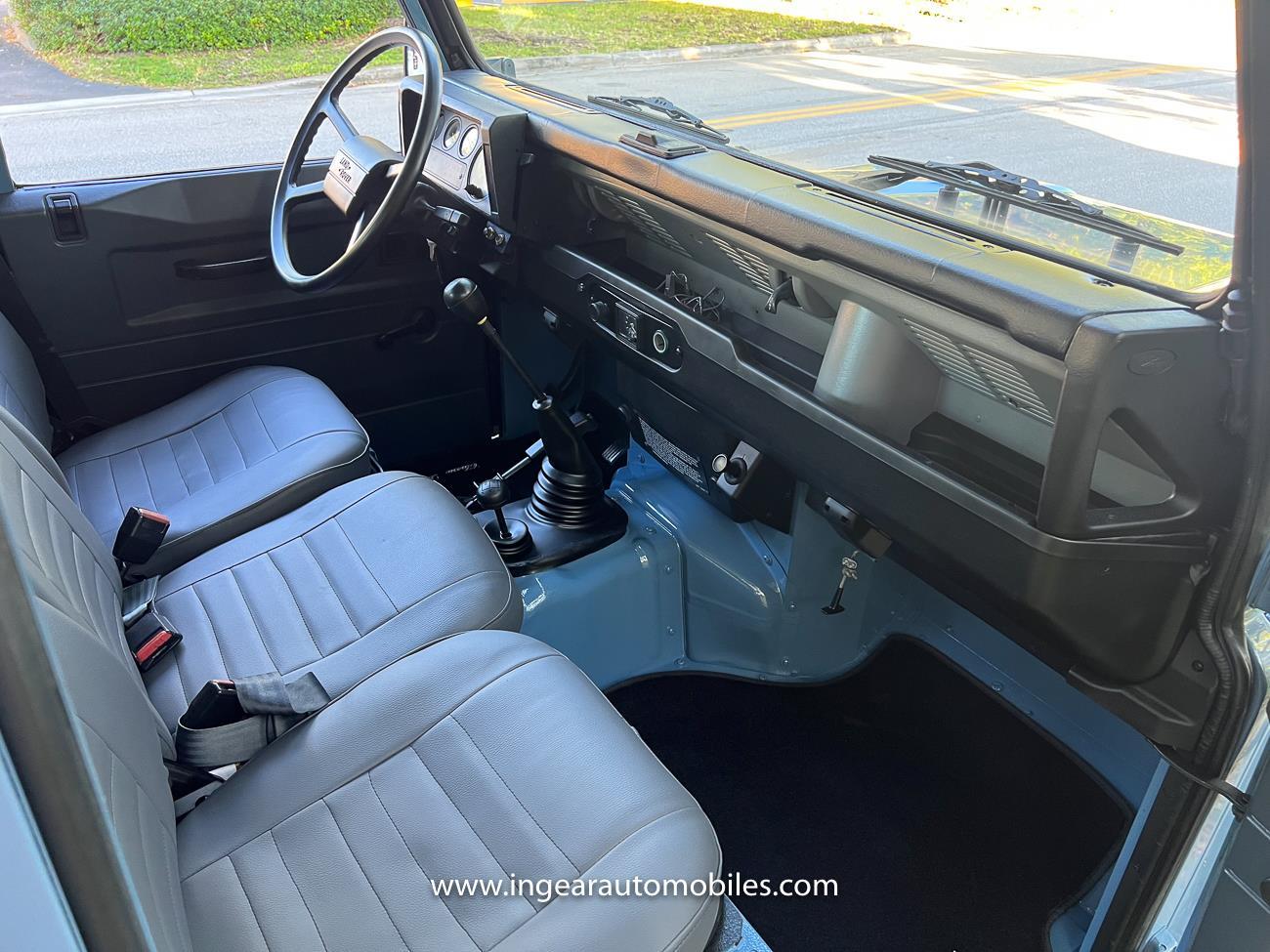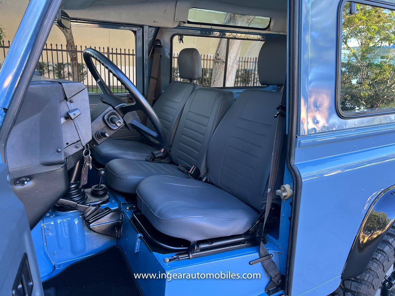 Defender has numerous options such as Power Steering, Power Brakes, Front Disc Brakes, sawtooth wheels, Factory Left Hand Drive, new wheels & tires, buckets seats, fender flares, rear side opening windows, carpet matts, mud guards, rear step, blackout HID headlights, and more…The Interior is nice and contrast well to the exterior safri blue paint, newer upholstery has been fitted, and tastefully done. Factory steering wheel. Has it’s normal wear and tear like any vehicle, but very solid Land Rover, and as you can see it received a restoration by the previous owner. Make sure to see my full album of pictures.
