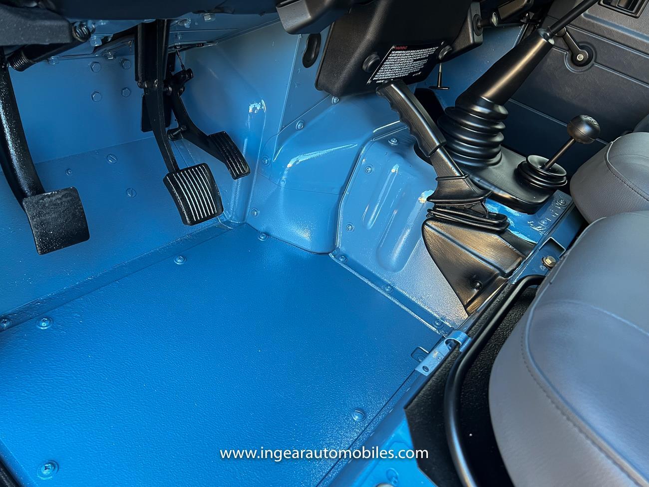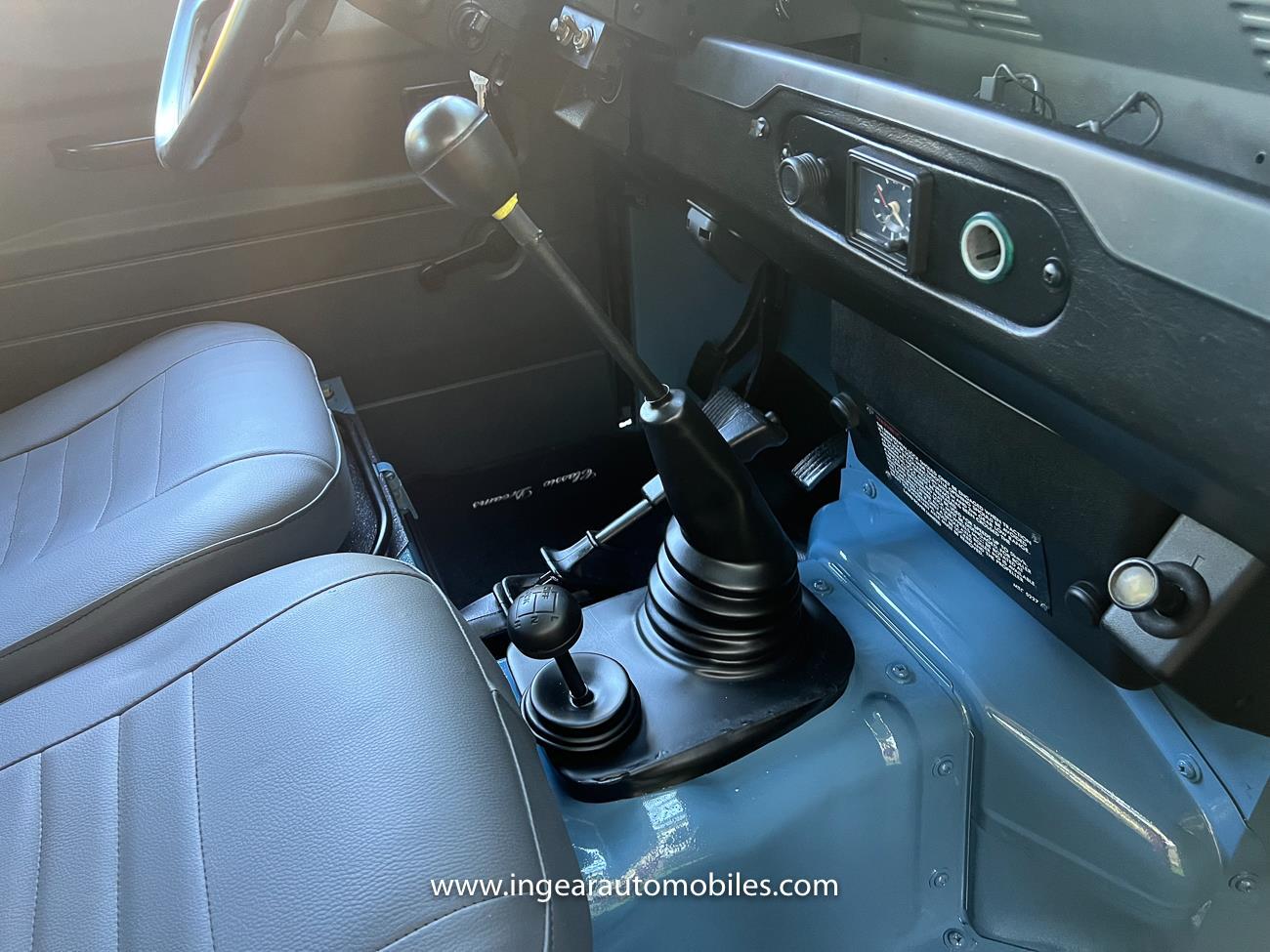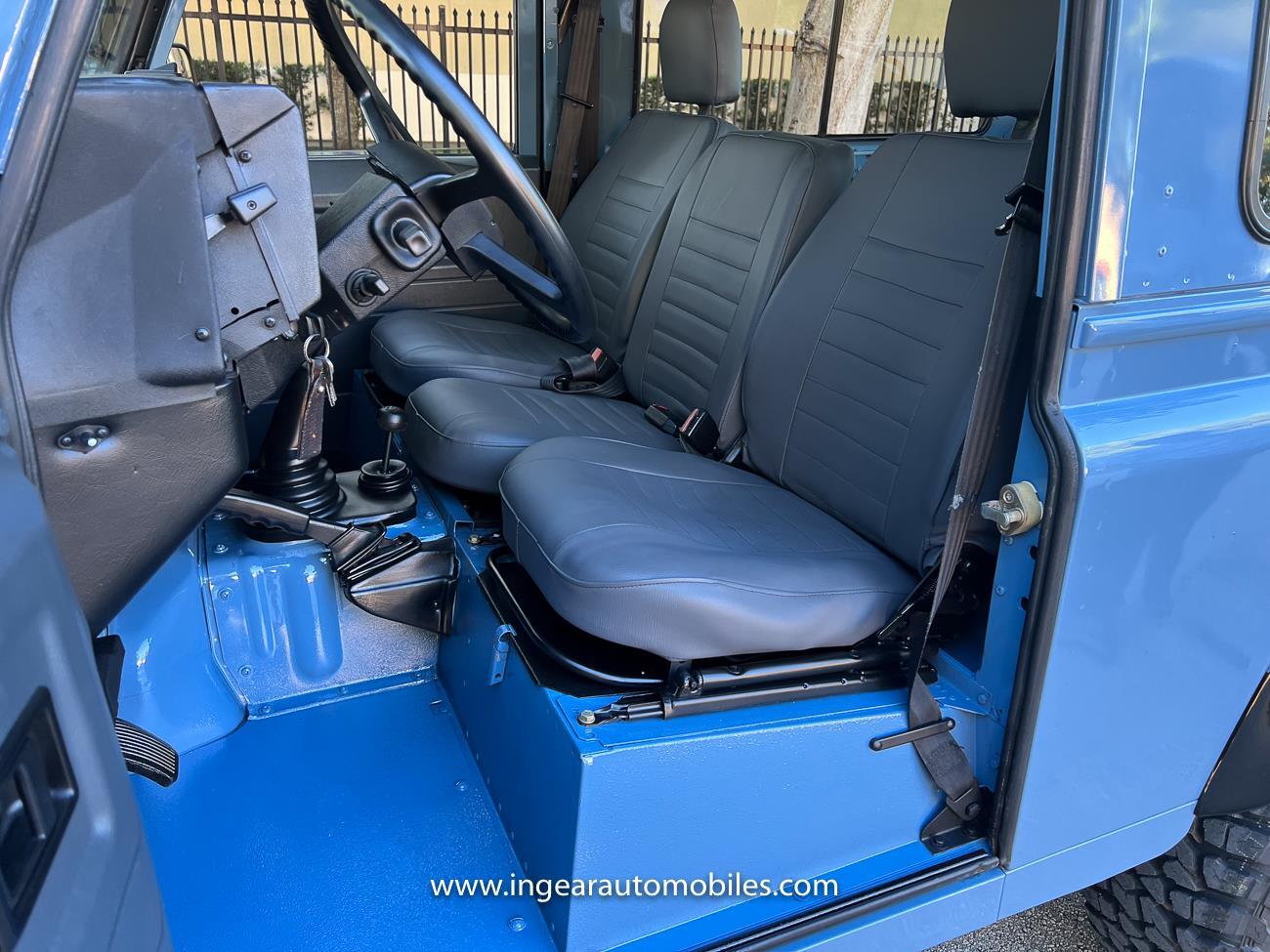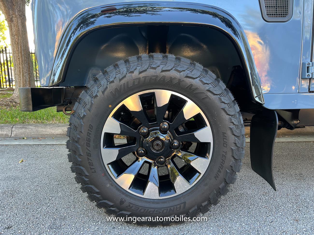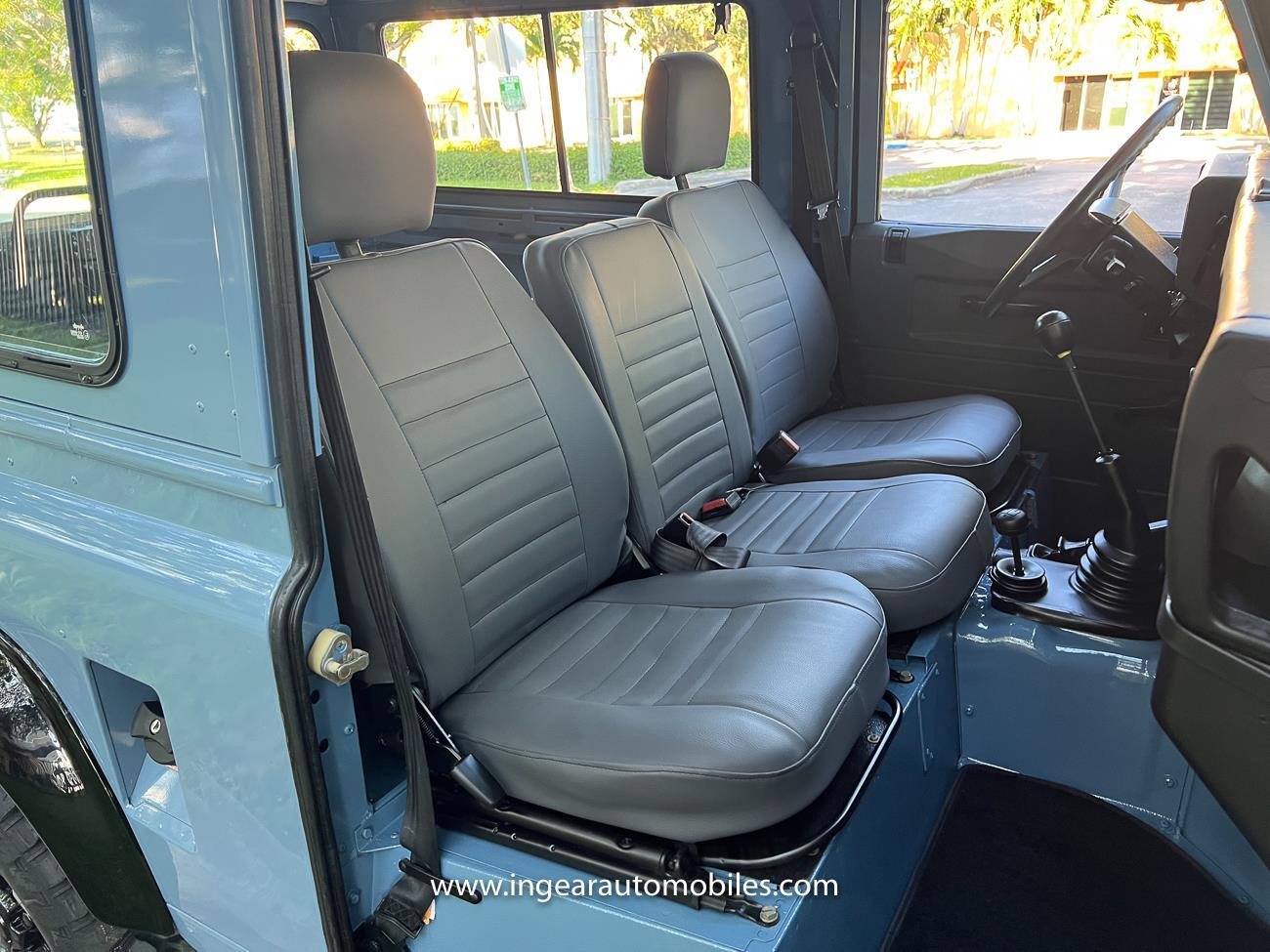 Defender has numerous options such as Power Steering, Power Brakes, Front Disc Brakes, sawtooth wheels, Factory Left Hand Drive, new wheels & tires, buckets seats, fender flares, rear side opening windows, carpet matts, mud guards, rear step, blackout HID headlights, and more…The Interior is nice and contrast well to the exterior safri blue paint, newer upholstery has been fitted, and tastefully done. Factory steering wheel. Has it’s normal wear and tear like any vehicle, but very solid Land Rover, and as you can see it received a restoration by the previous owner. Make sure to see my full album of pictures.