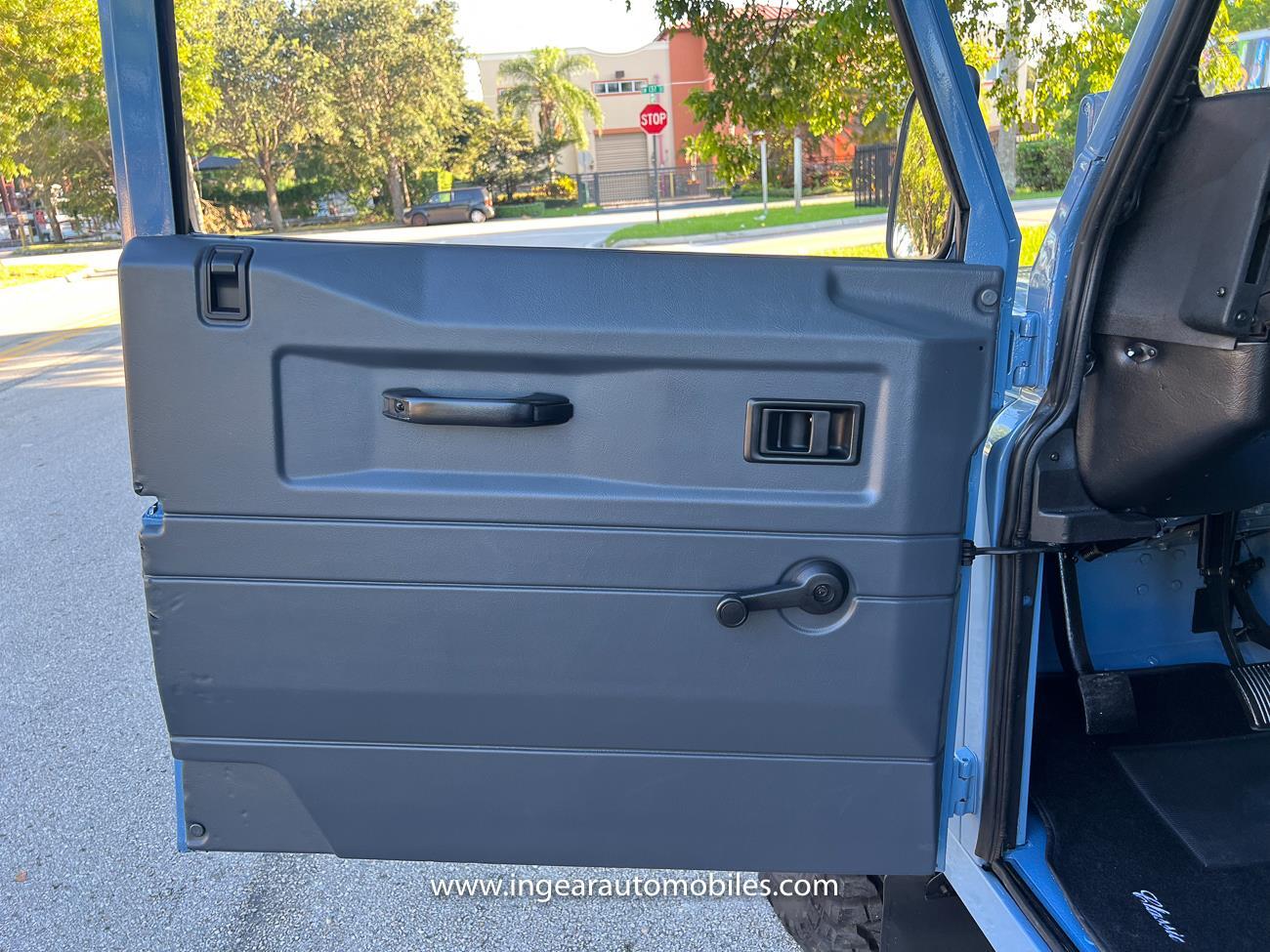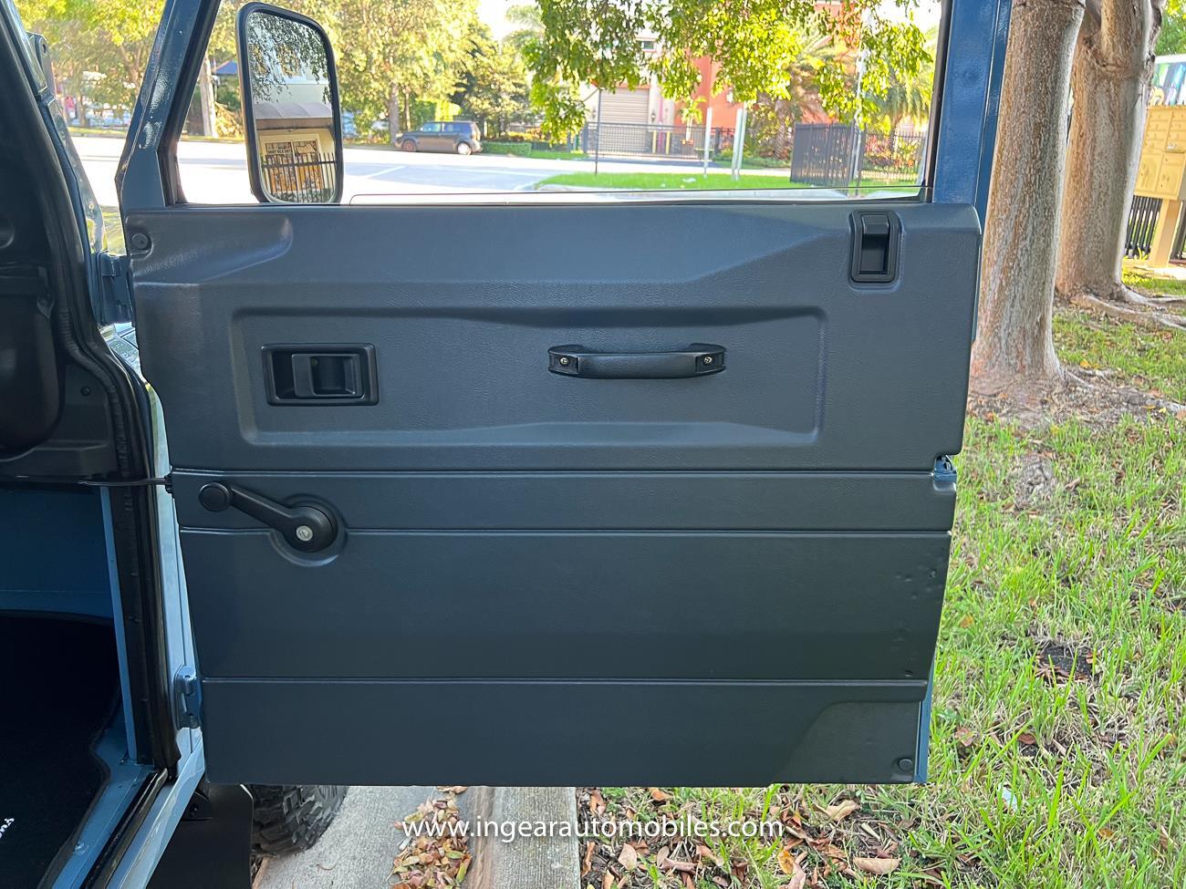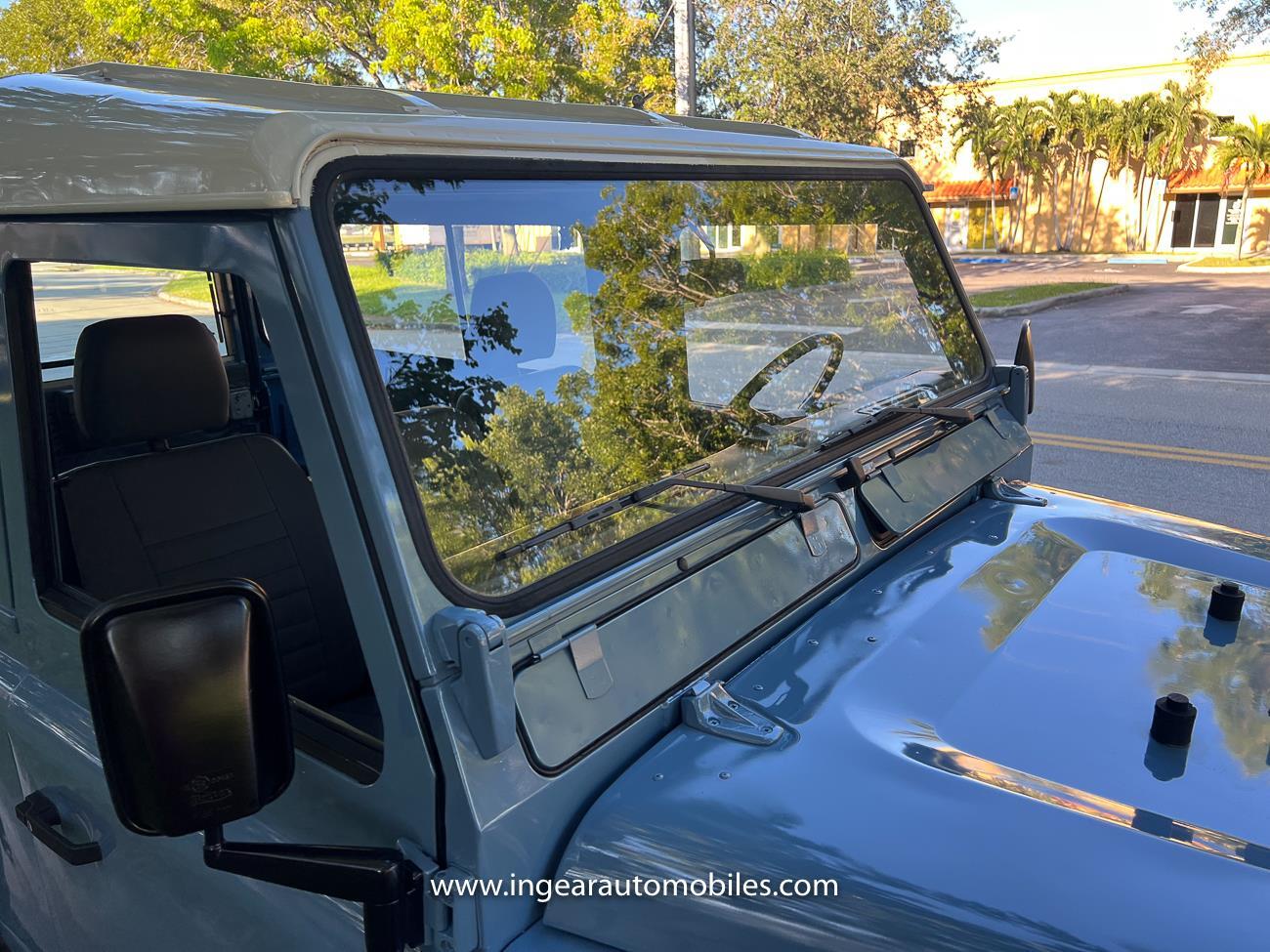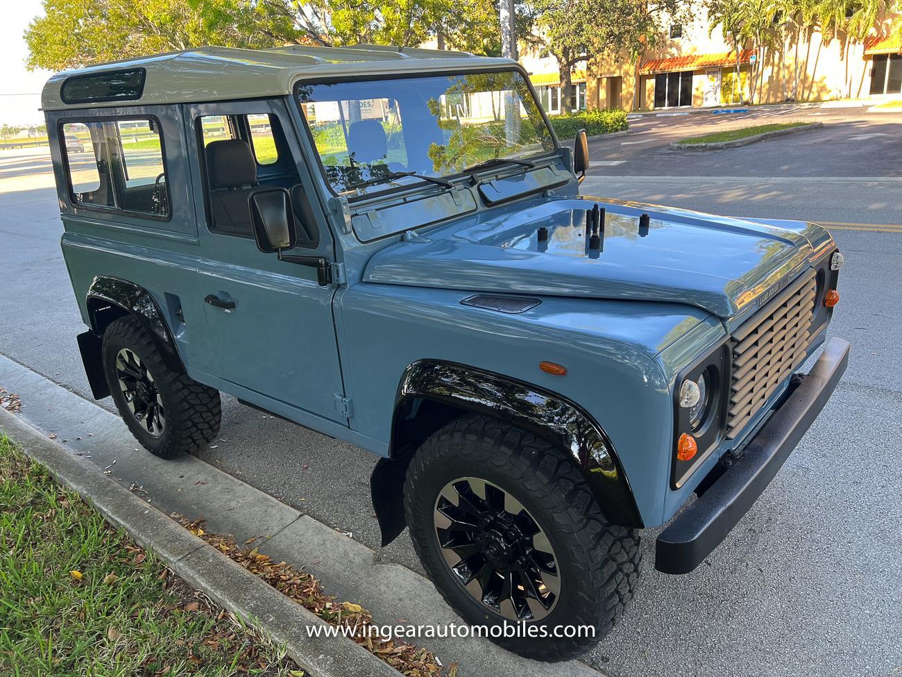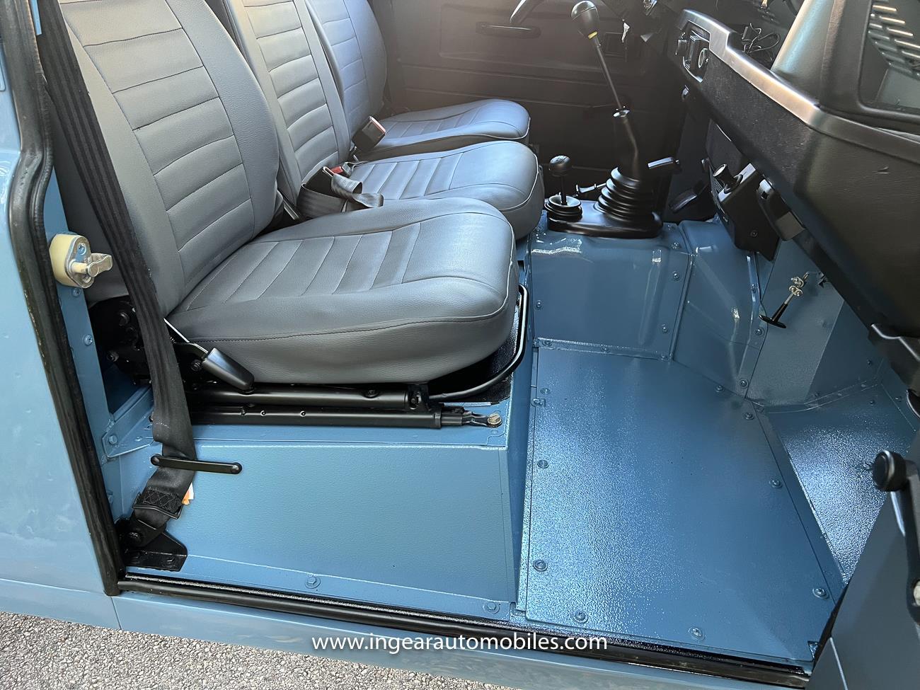 Defender has numerous options such as Power Steering, Power Brakes, Front Disc Brakes, sawtooth wheels, Factory Left Hand Drive, new wheels & tires, buckets seats, fender flares, rear side opening windows, carpet matts, mud guards, rear step, blackout HID headlights, and more…The Interior is nice and contrast well to the exterior safri blue paint, newer upholstery has been fitted, and tastefully done. Factory steering wheel. Has it’s normal wear and tear like any vehicle, but very solid Land Rover, and as you can see it received a restoration by the previous owner. Make sure to see my full album of pictures.