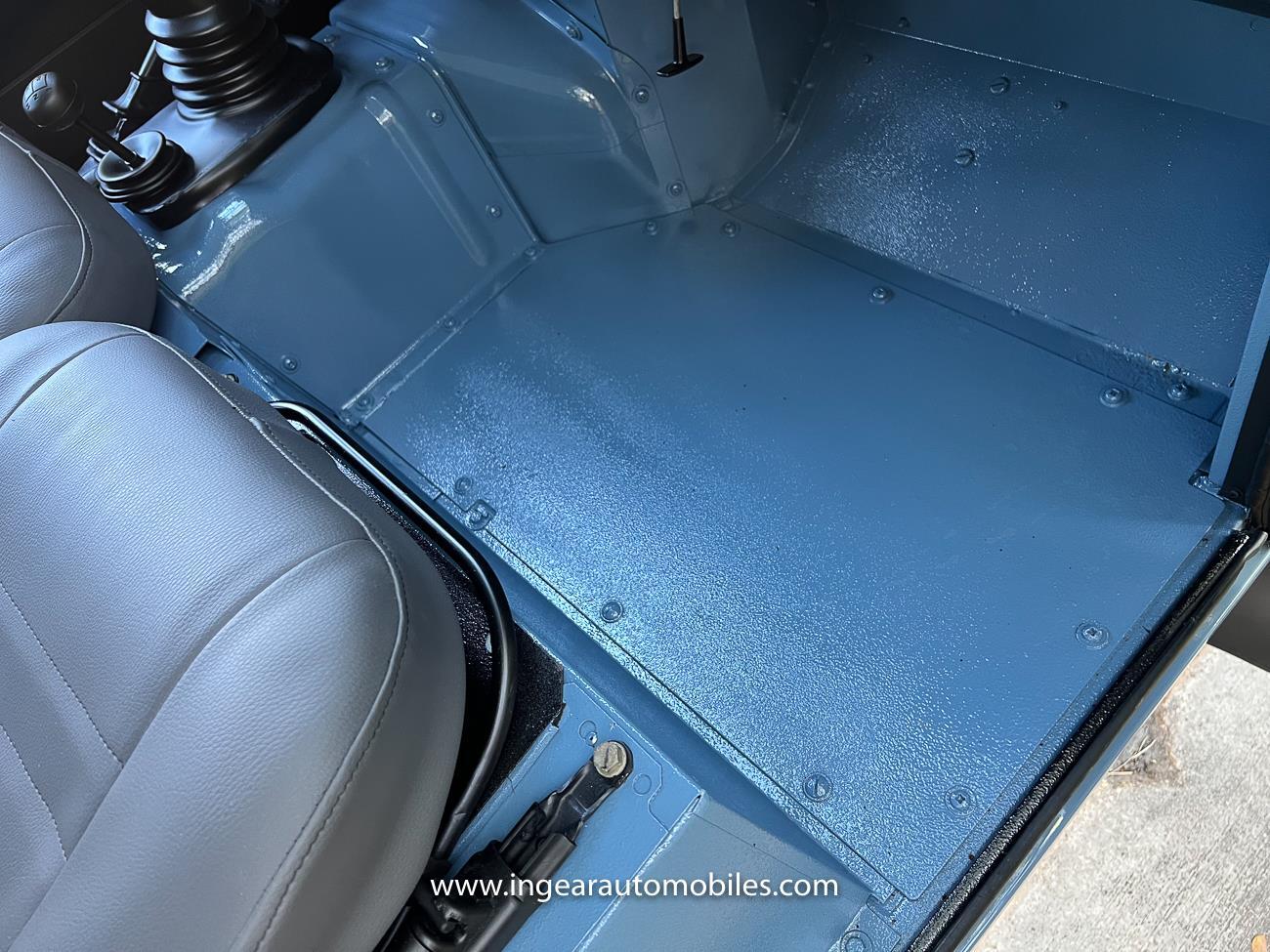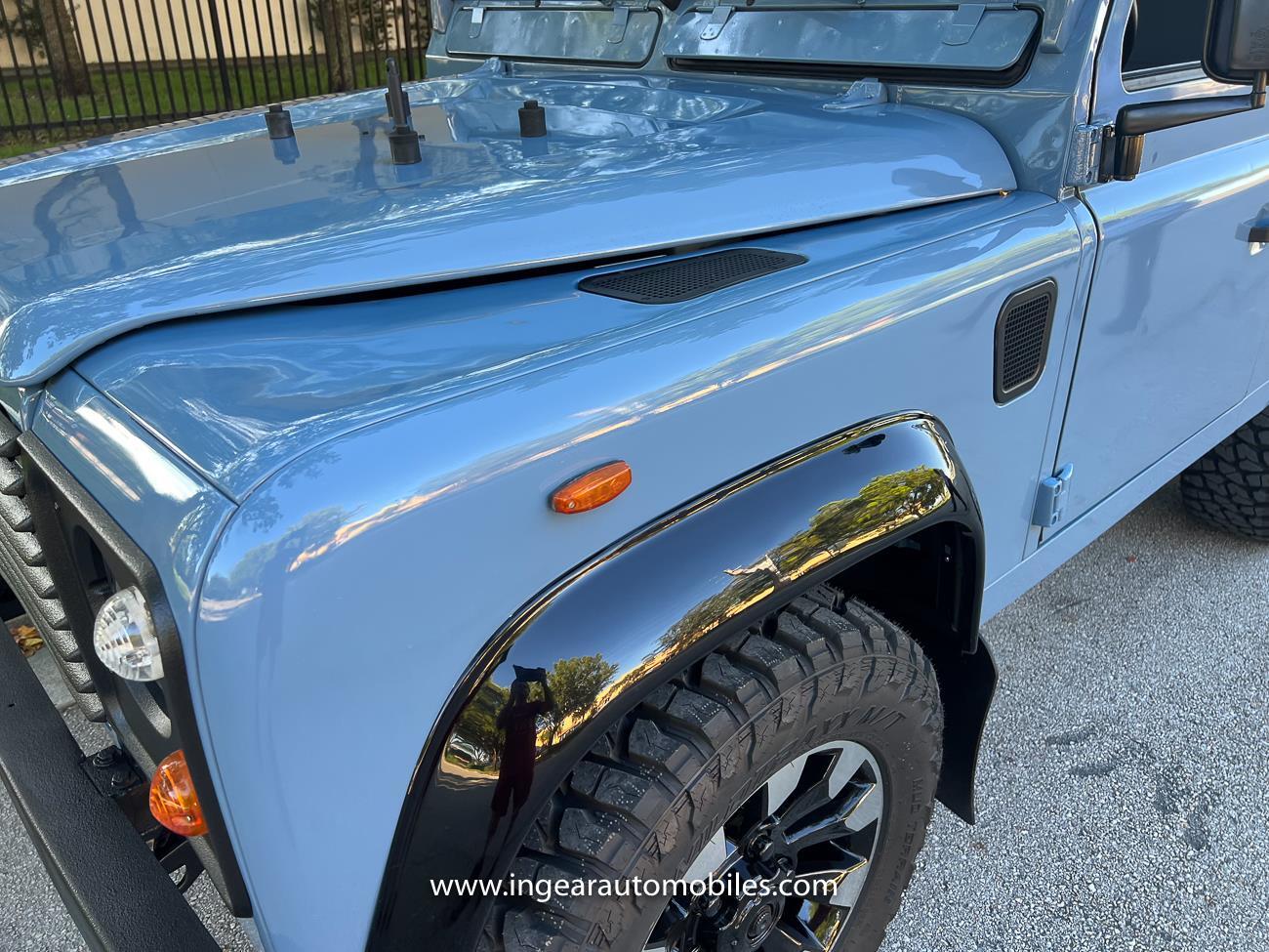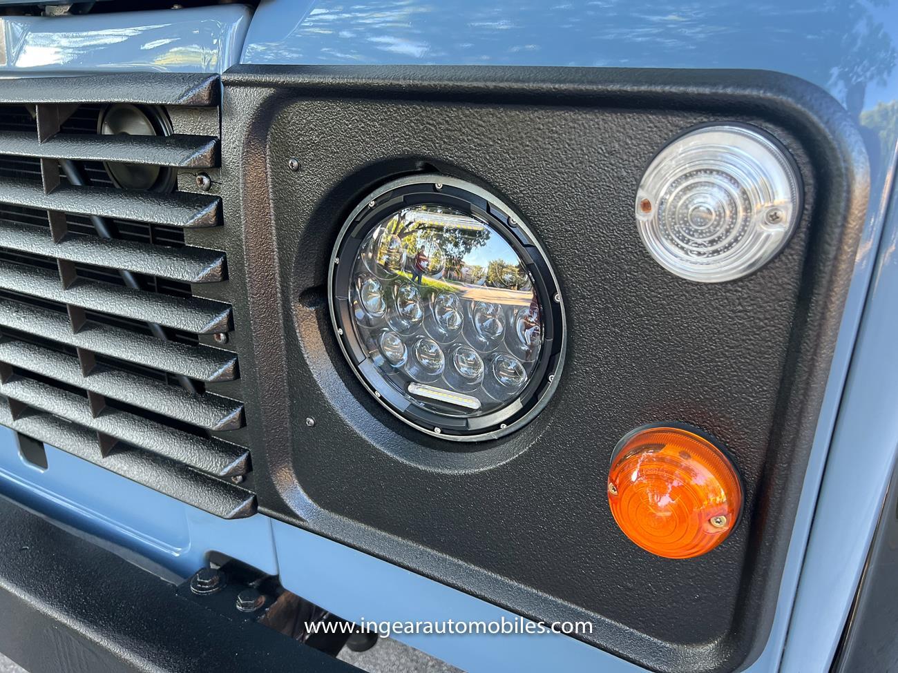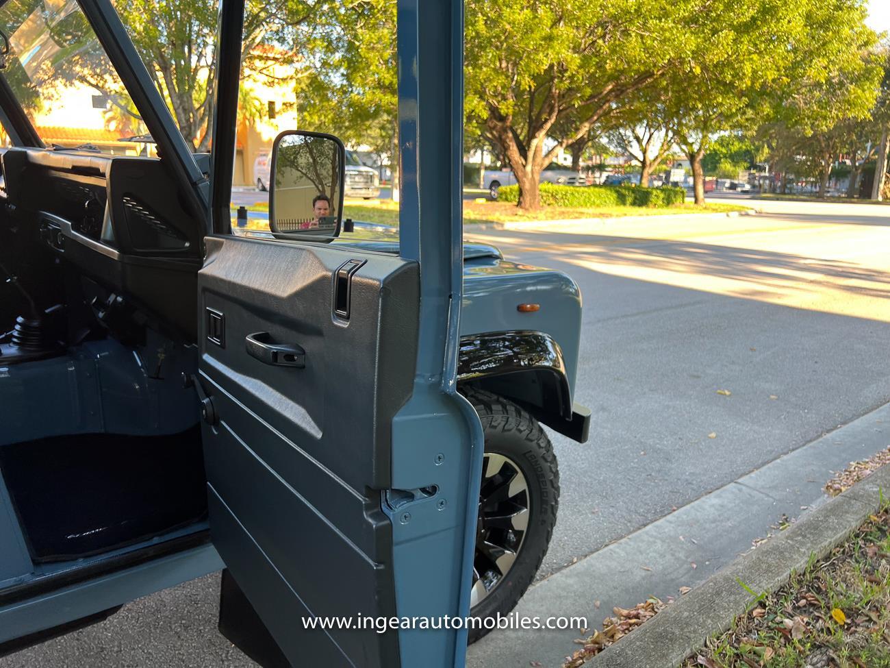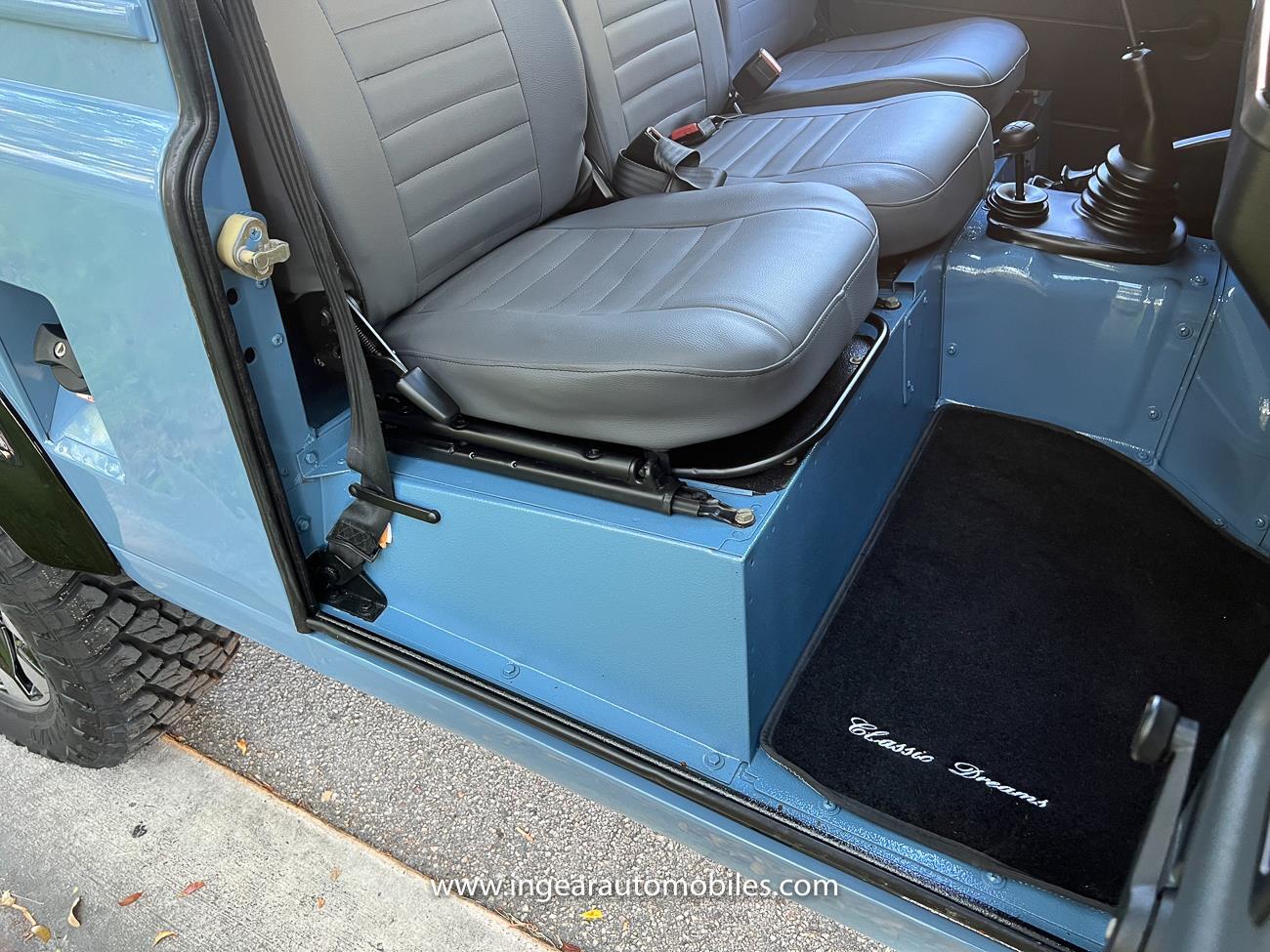 Defender has numerous options such as Power Steering, Power Brakes, Front Disc Brakes, sawtooth wheels, Factory Left Hand Drive, new wheels & tires, buckets seats, fender flares, rear side opening windows, carpet matts, mud guards, rear step, blackout HID headlights, and more…The Interior is nice and contrast well to the exterior safri blue paint, newer upholstery has been fitted, and tastefully done. Factory steering wheel. Has it’s normal wear and tear like any vehicle, but very solid Land Rover, and as you can see it received a restoration by the previous owner. Make sure to see my full album of pictures.
