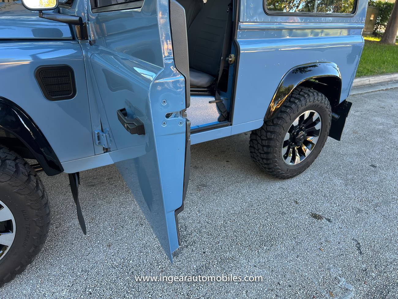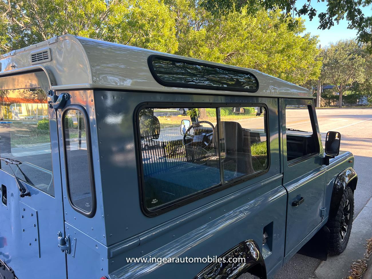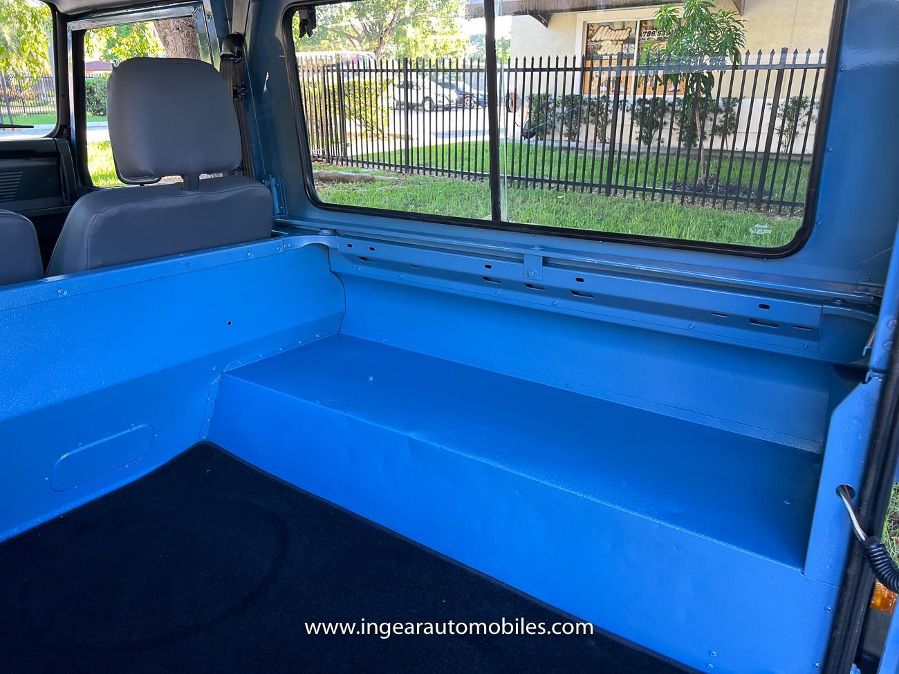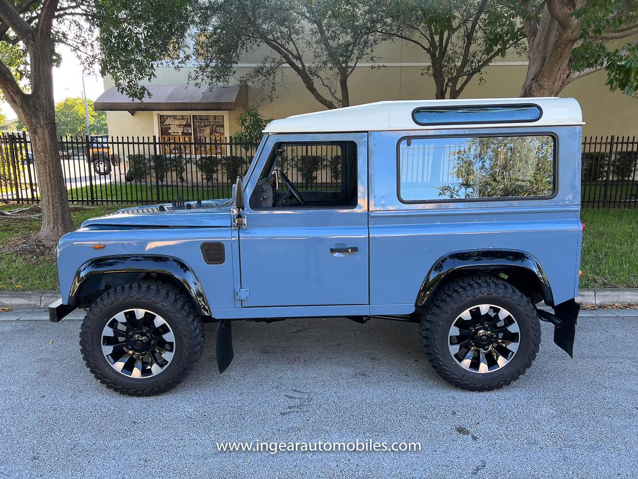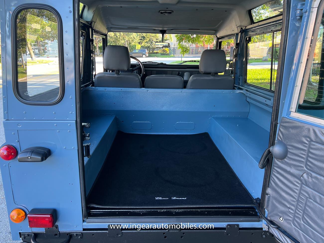 Defender has numerous options such as Power Steering, Power Brakes, Front Disc Brakes, sawtooth wheels, Factory Left Hand Drive, new wheels & tires, buckets seats, fender flares, rear side opening windows, carpet matts, mud guards, rear step, blackout HID headlights, and more…The Interior is nice and contrast well to the exterior safri blue paint, newer upholstery has been fitted, and tastefully done. Factory steering wheel. Has it’s normal wear and tear like any vehicle, but very solid Land Rover, and as you can see it received a restoration by the previous owner. Make sure to see my full album of pictures.