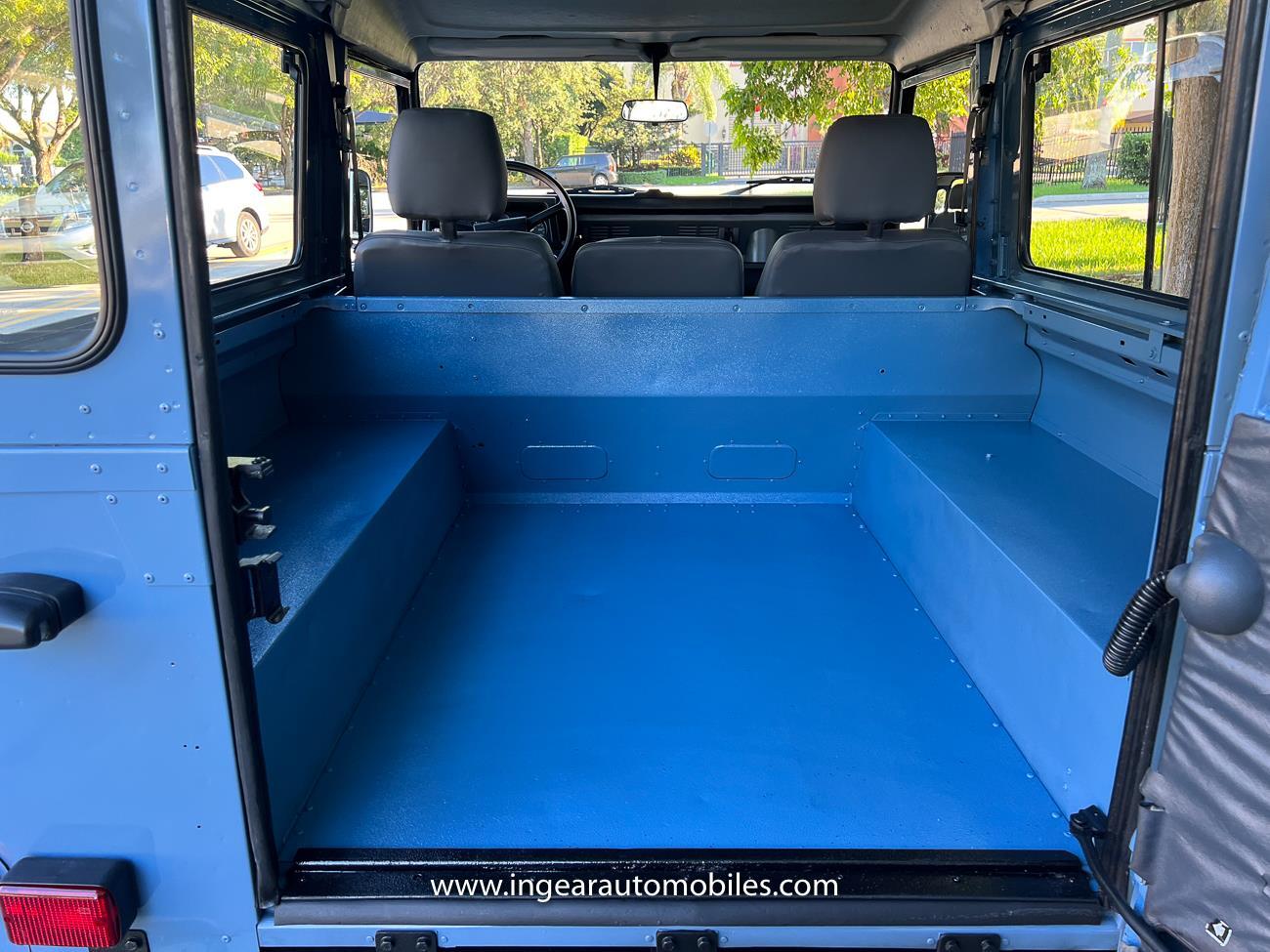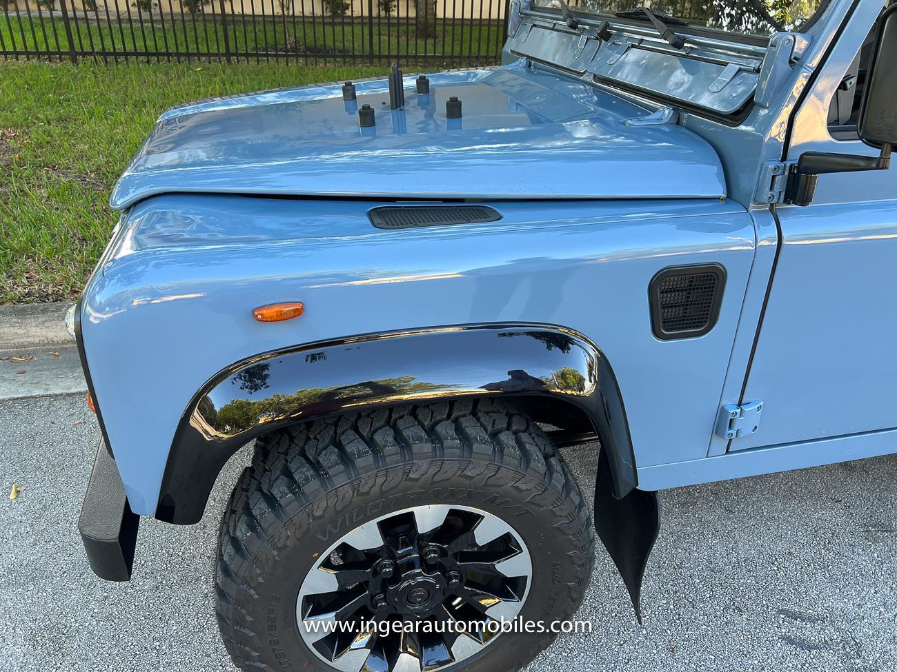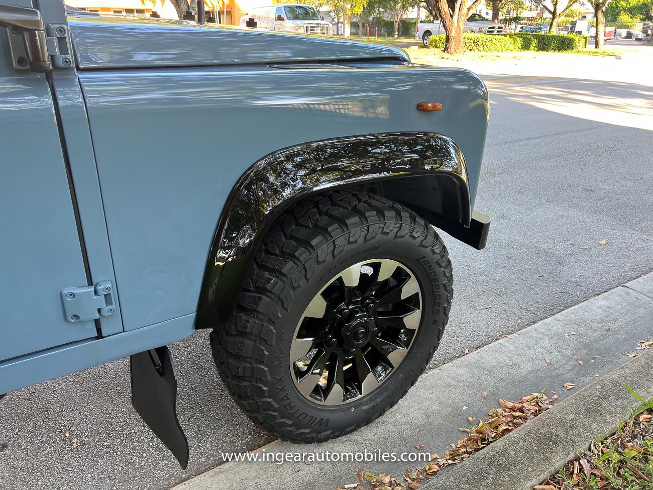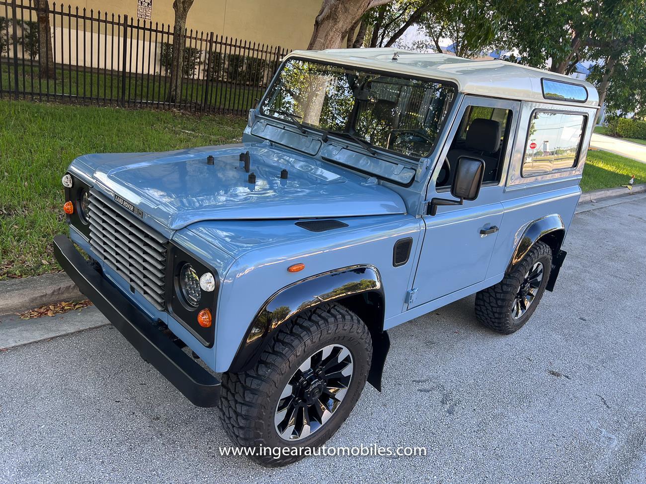Defender has numerous options such as Power Steering, Power Brakes, Front Disc Brakes, sawtooth wheels, Factory Left Hand Drive, new wheels & tires, buckets seats, fender flares, rear side opening windows, carpet matts, mud guards, rear step, blackout HID headlights, and more…The Interior is nice and contrast well to the exterior safri blue paint, newer upholstery has been fitted, and tastefully done. Factory steering wheel. Has it’s normal wear and tear like any vehicle, but very solid Land Rover, and as you can see it received a restoration by the previous owner. Make sure to see my full album of pictures.