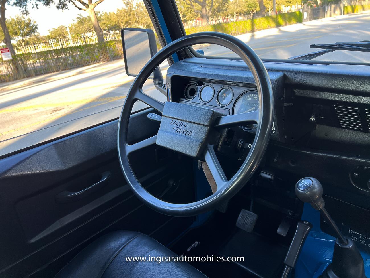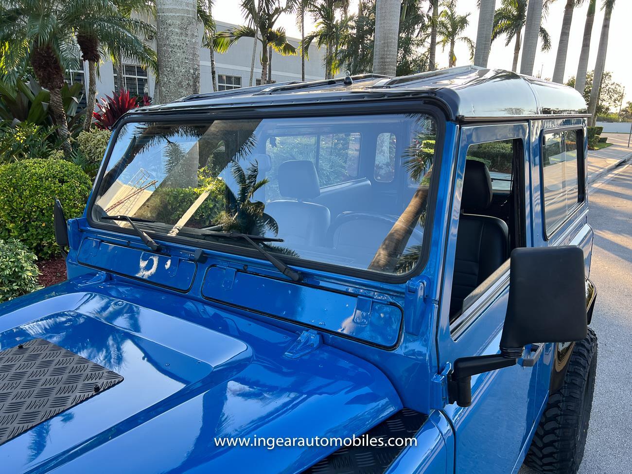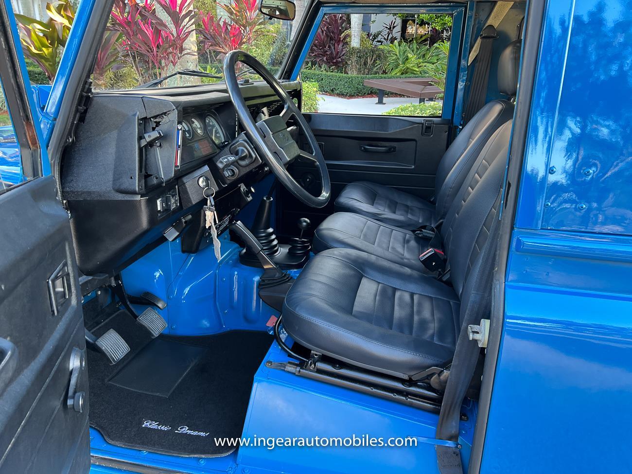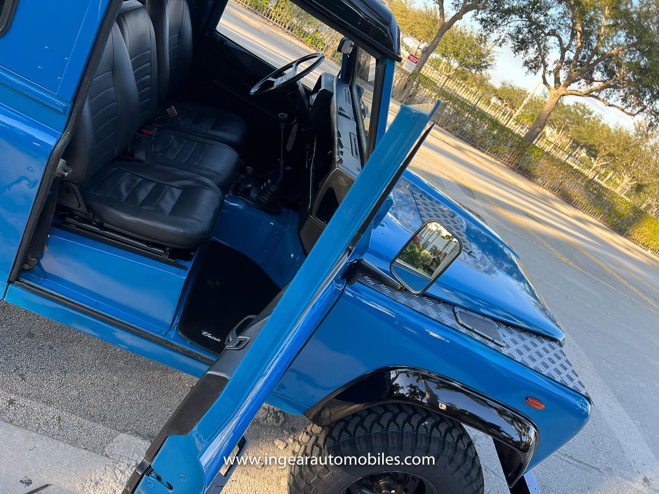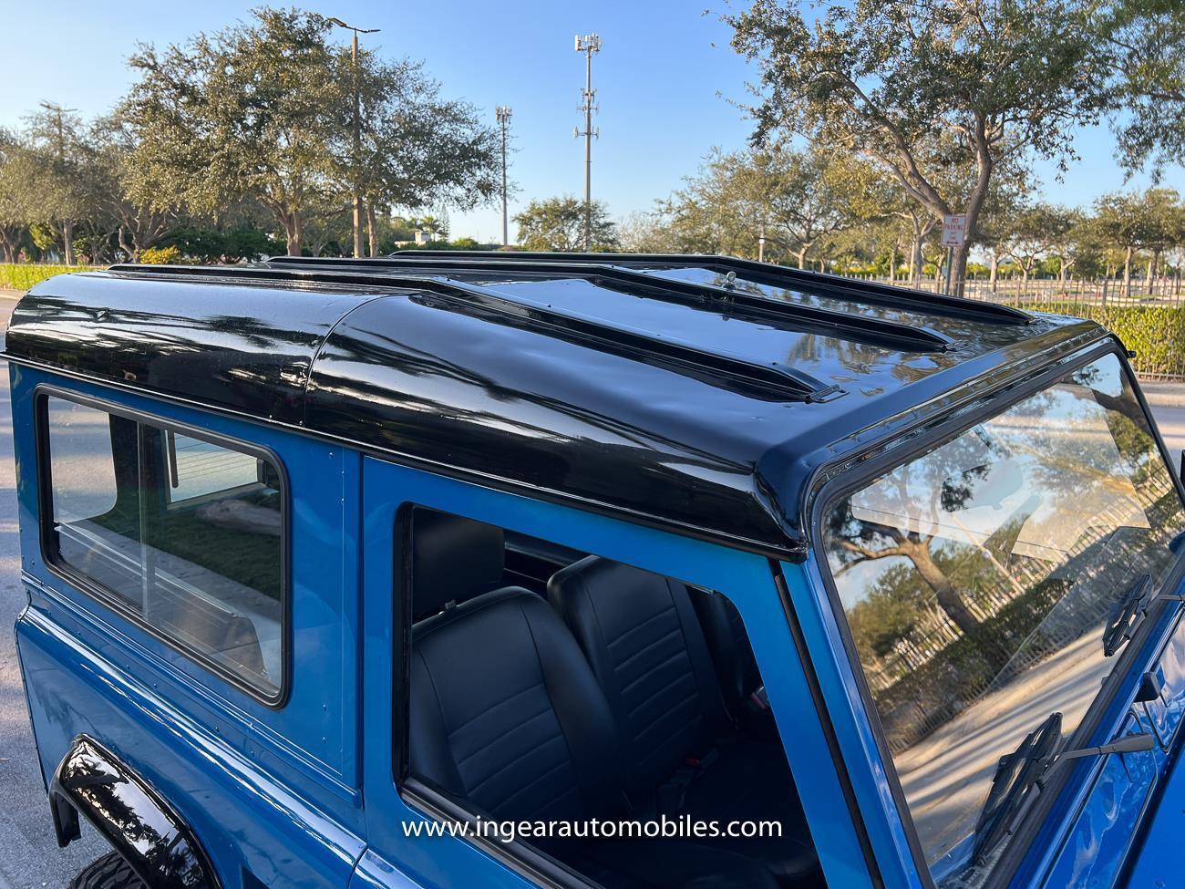 Up for sale is a 1987 Land Rover Defender 90 4x4. Black steel wheels! Finished in blue with black roof. Rear fold down seats! You can take it to the trails & for weekend cruises. The Defender is powered by it’s 2.5L Turbo Diesel engine matted to a 5 speed transmission. Rebuilt turbo. ORIGINAL Left hand drive not a conversion. Defender has numerous options such as Power Steering, Power Brakes, Front Disc Brakes, steel wheels, Factory Left Hand Drive, new wheels & tires, buckets seats, fender flares, rear side opening windows, carpet matts, Diamond plate Fenders, and more…The Interior is nice and contrast well to the exterior safri blue paint, newer upholstery has been fitted, and tastefully done. Factory steering wheel. Has it’s normal wear and tear like any vehicle, but very solid Land Rover, and as you can see it received a restoration by the previous owner. Make sure to see my full album of pictures. Clean FL Title
