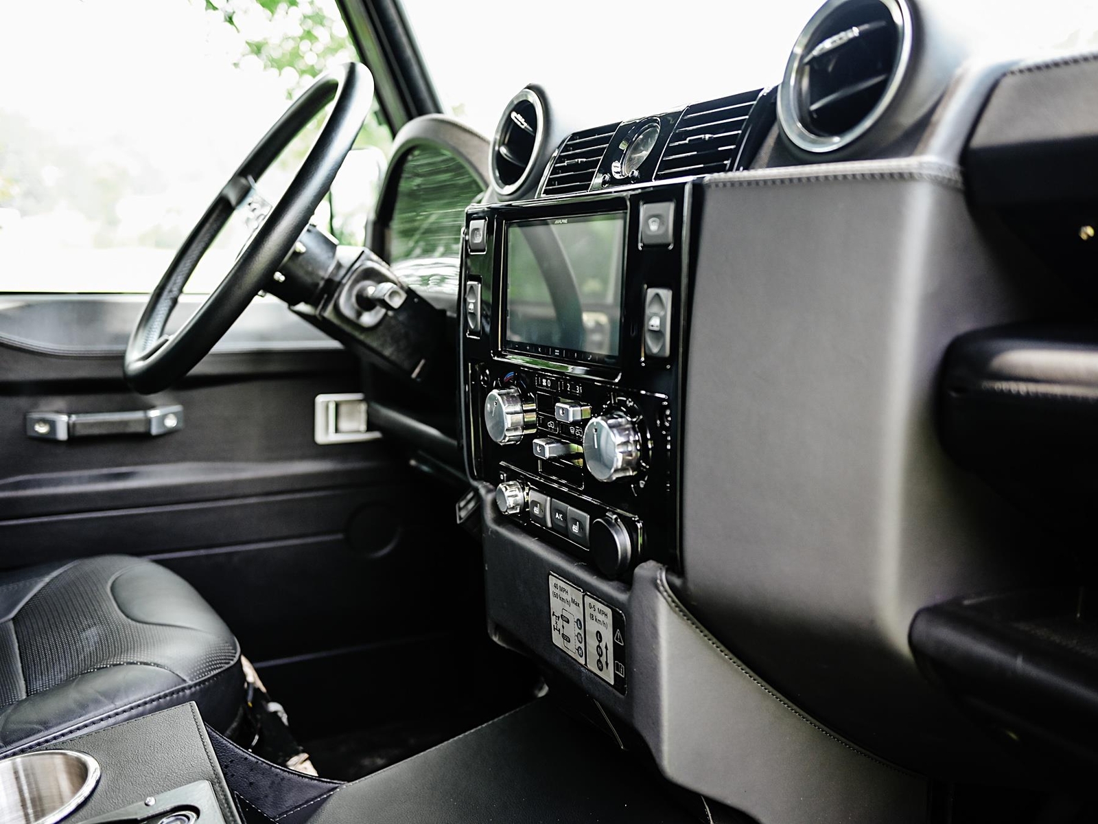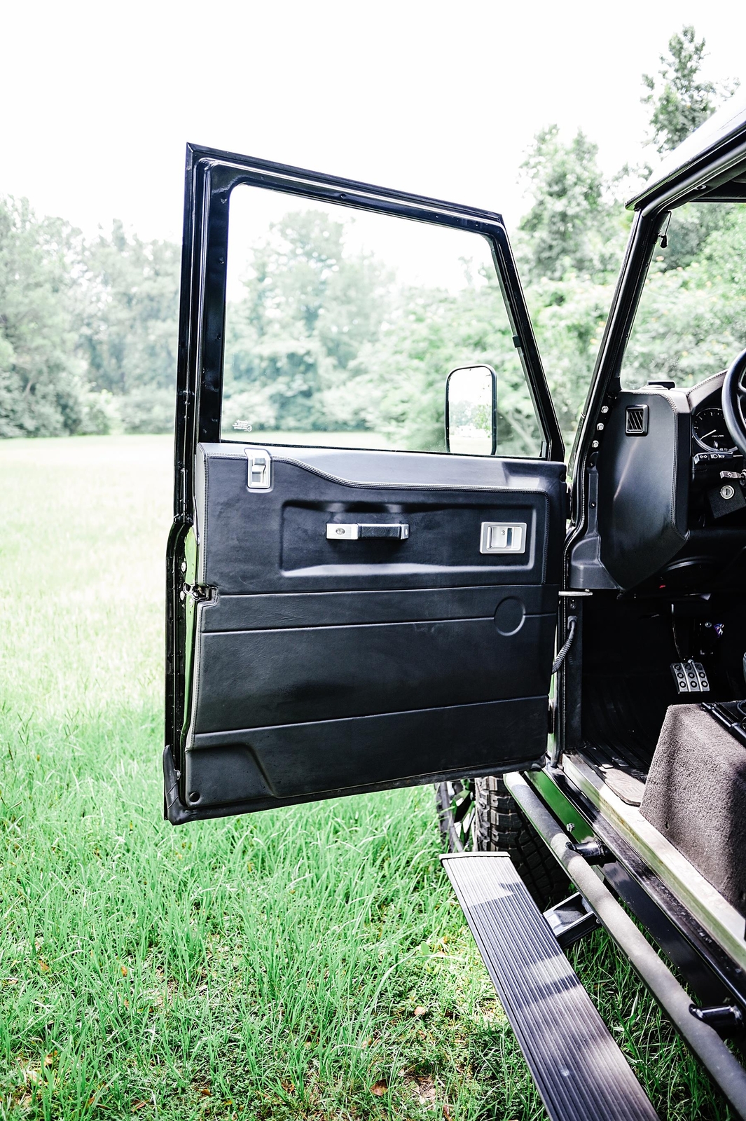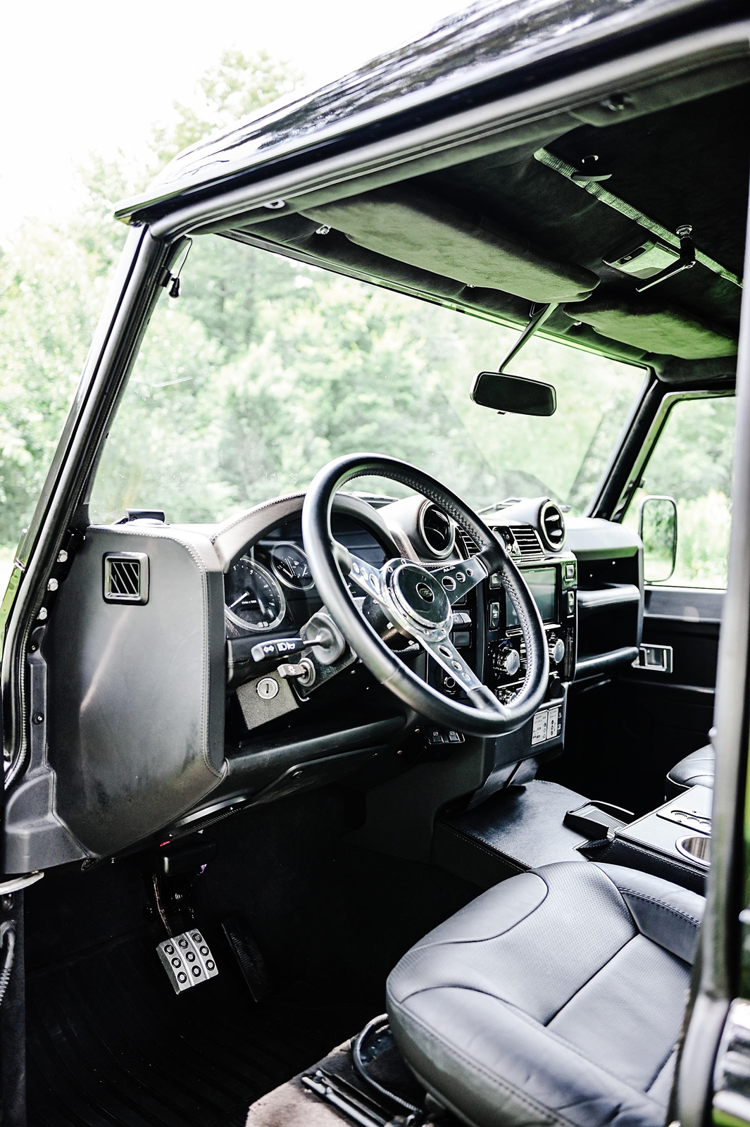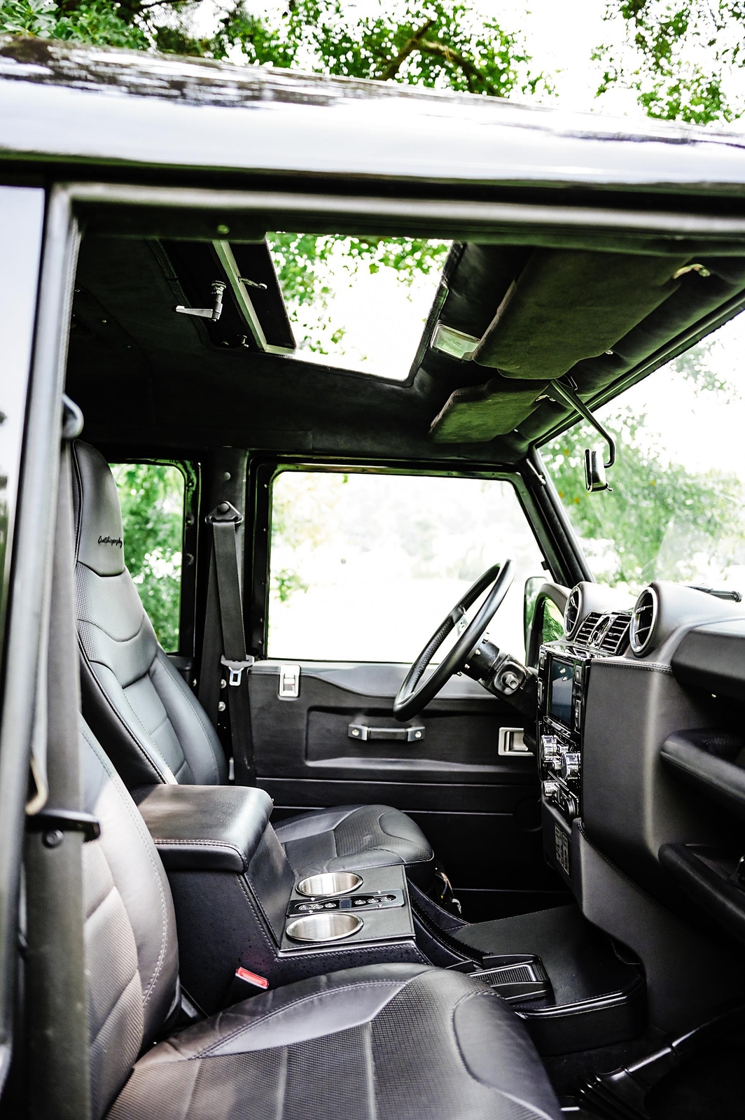The body, expertly finished in deep Santorini Black Metallic with color-matched wheel arches and trim, was meticulously reassembled with the chassis after being treated at our in-house body and paint facility. Black powder-coated Terrafirma® rock sliders with integrated tree bars help protect the lower body, while Optimill® black anodized aluminum exterior door handles complement the Optimill® black billet aluminum door, bonnet, and windscreen hinges, enhancing the vehicle's stealthy appearance.