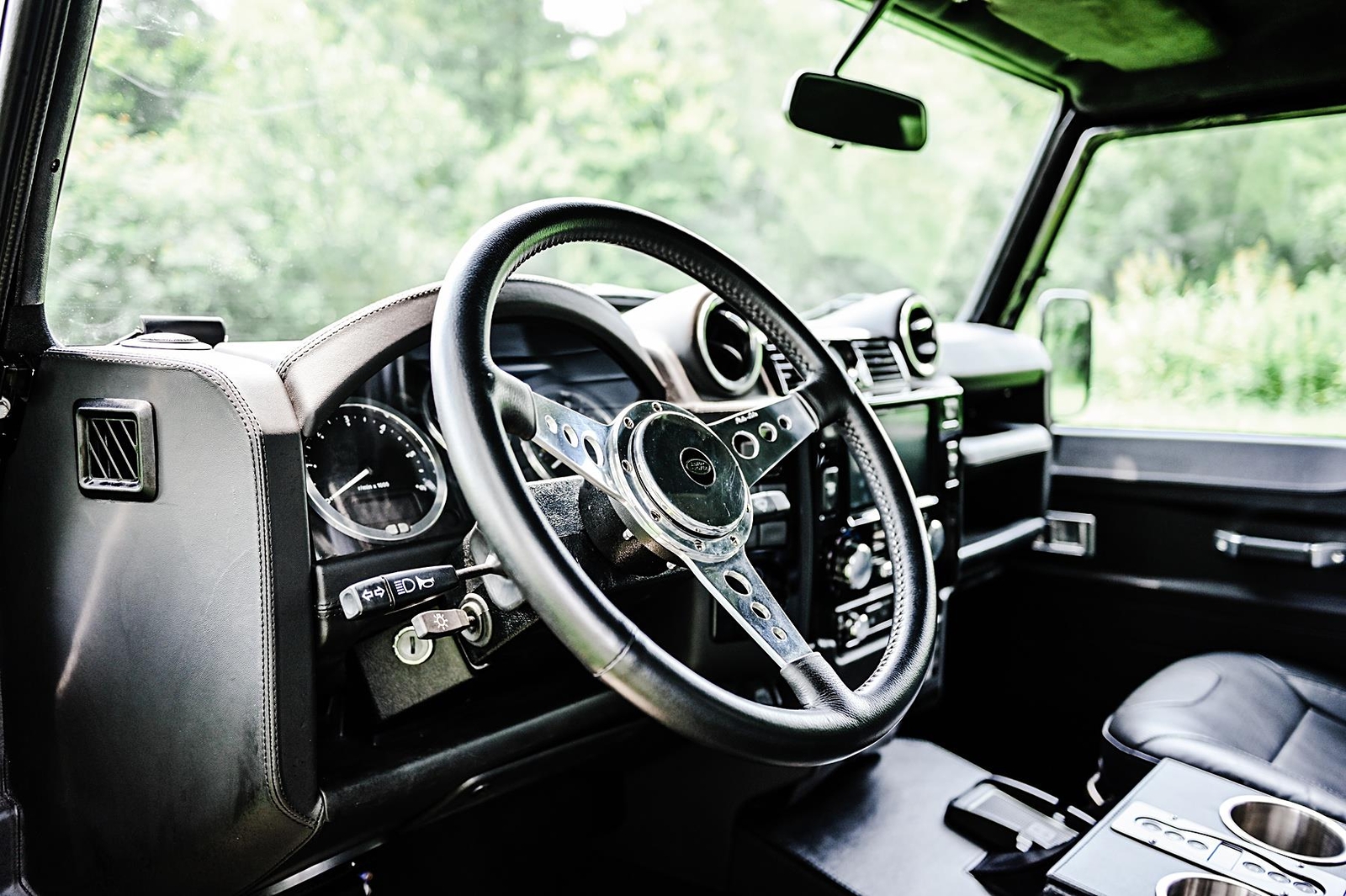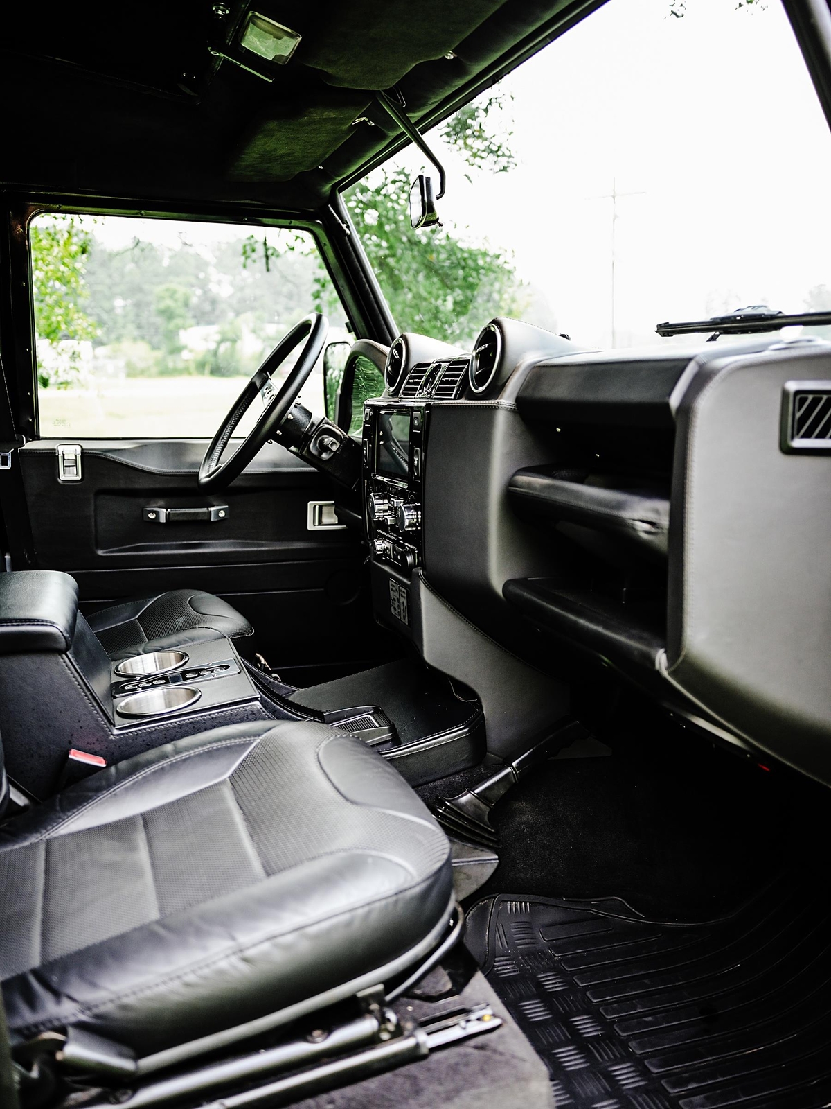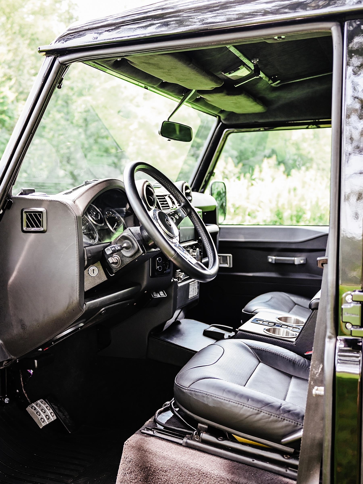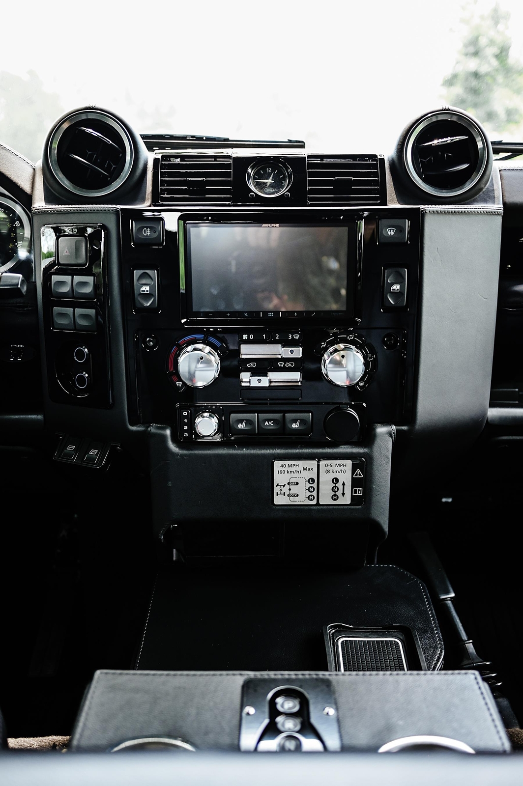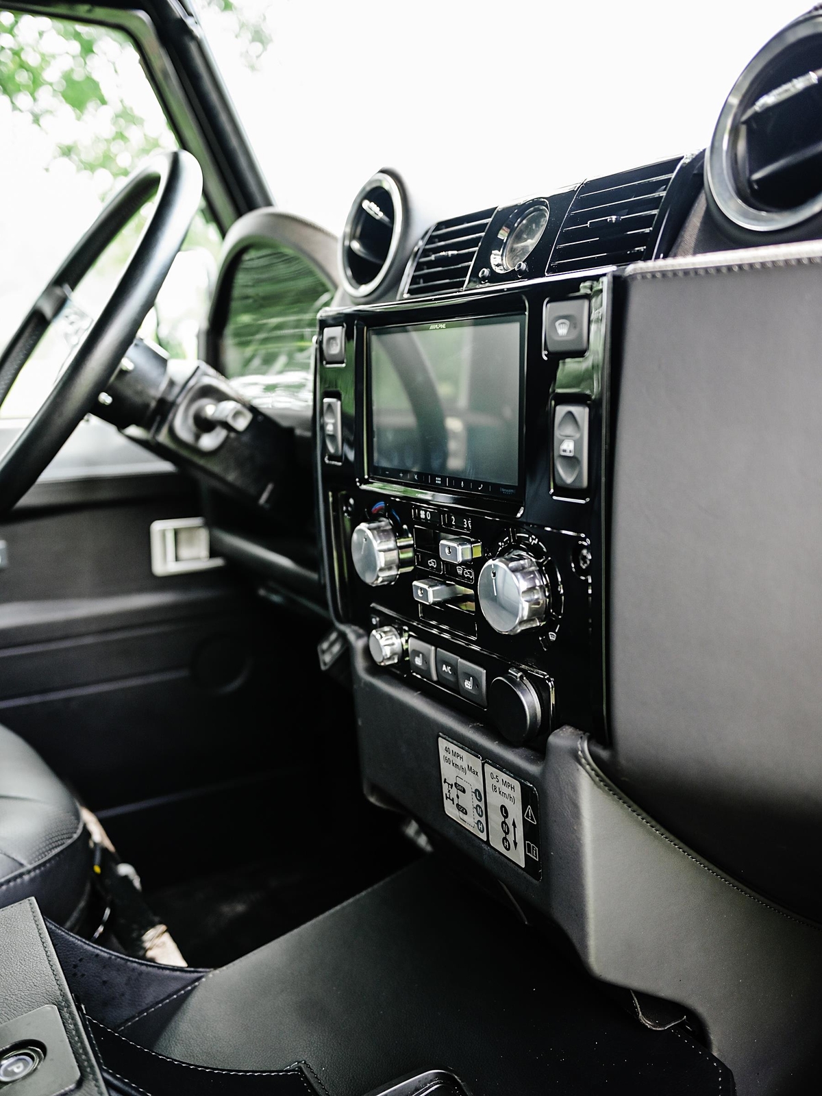 The body, expertly finished in deep Santorini Black Metallic with color-matched wheel arches and trim, was meticulously reassembled with the chassis after being treated at our in-house body and paint facility. Black powder-coated Terrafirma® rock sliders with integrated tree bars help protect the lower body, while Optimill® black anodized aluminum exterior door handles complement the Optimill® black billet aluminum door, bonnet, and windscreen hinges, enhancing the vehicle's stealthy appearance.