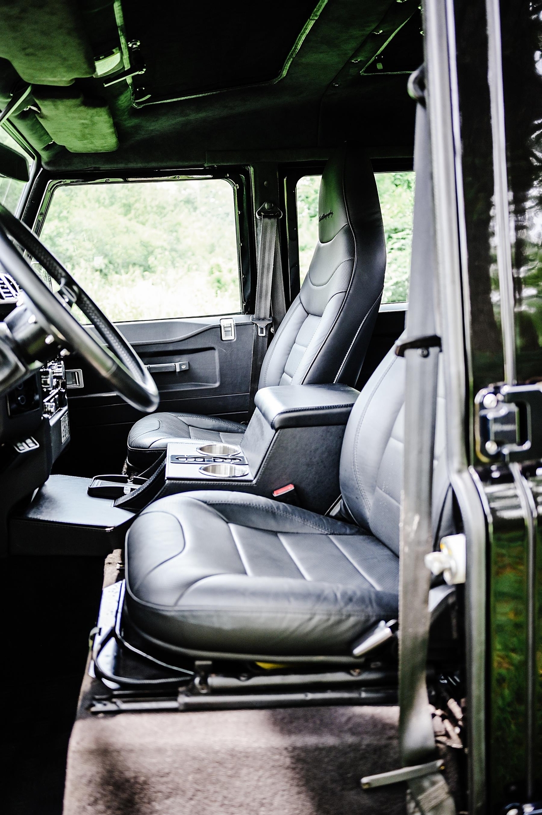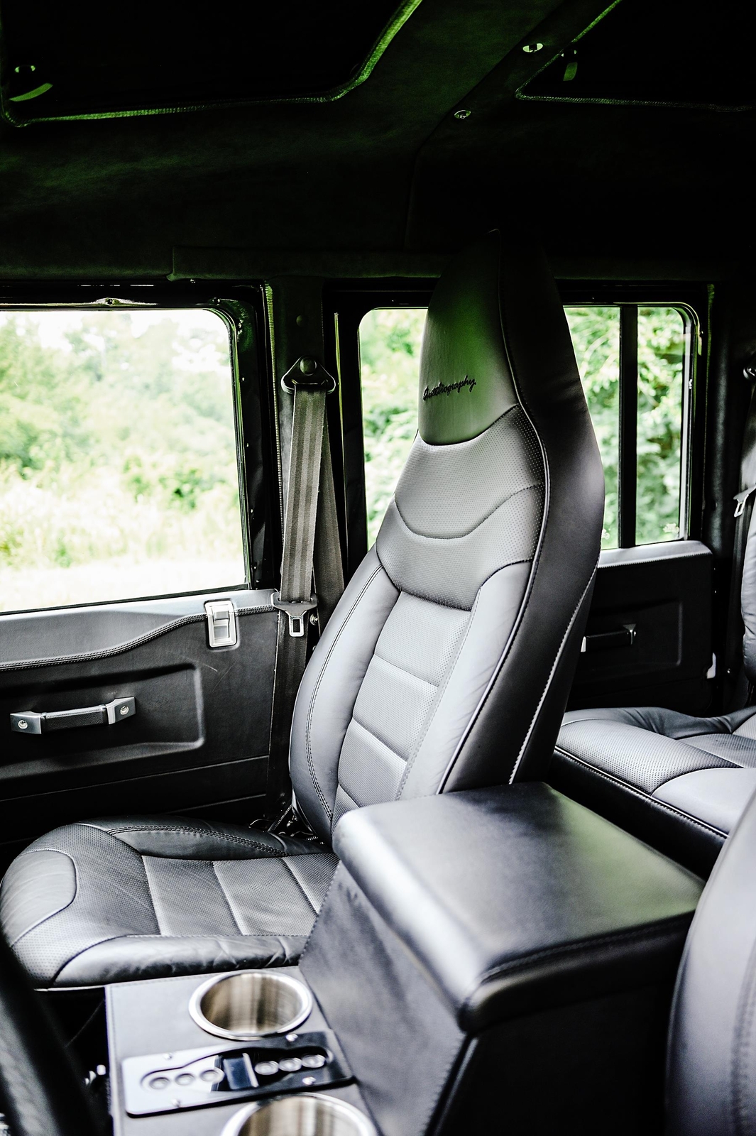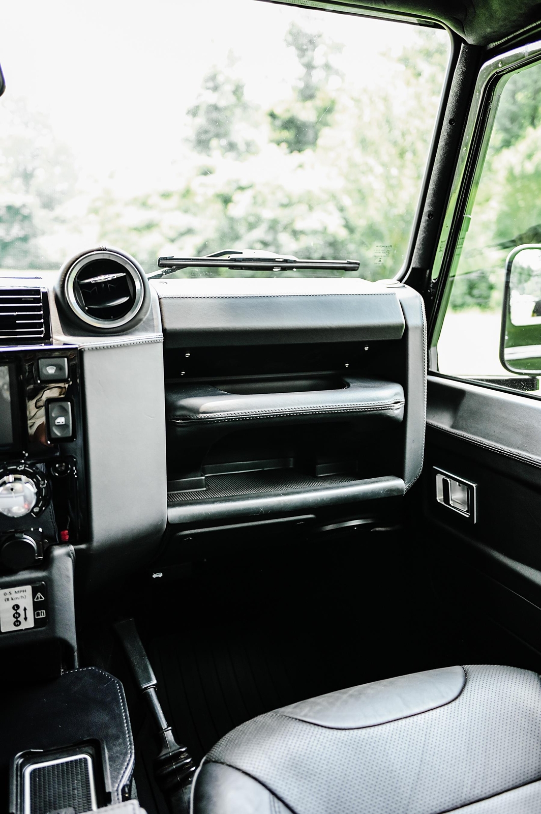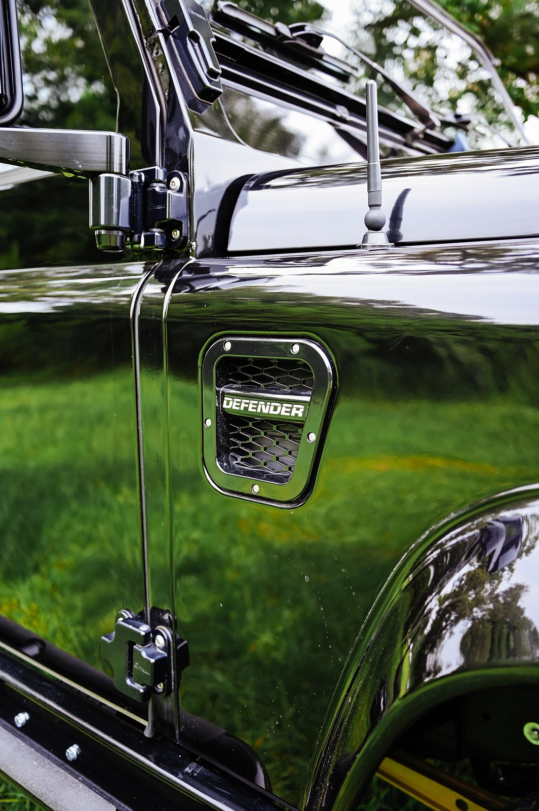 The body, expertly finished in deep Santorini Black Metallic with color-matched wheel arches and trim, was meticulously reassembled with the chassis after being treated at our in-house body and paint facility. Black powder-coated Terrafirma® rock sliders with integrated tree bars help protect the lower body, while Optimill® black anodized aluminum exterior door handles complement the Optimill® black billet aluminum door, bonnet, and windscreen hinges, enhancing the vehicle's stealthy appearance.
