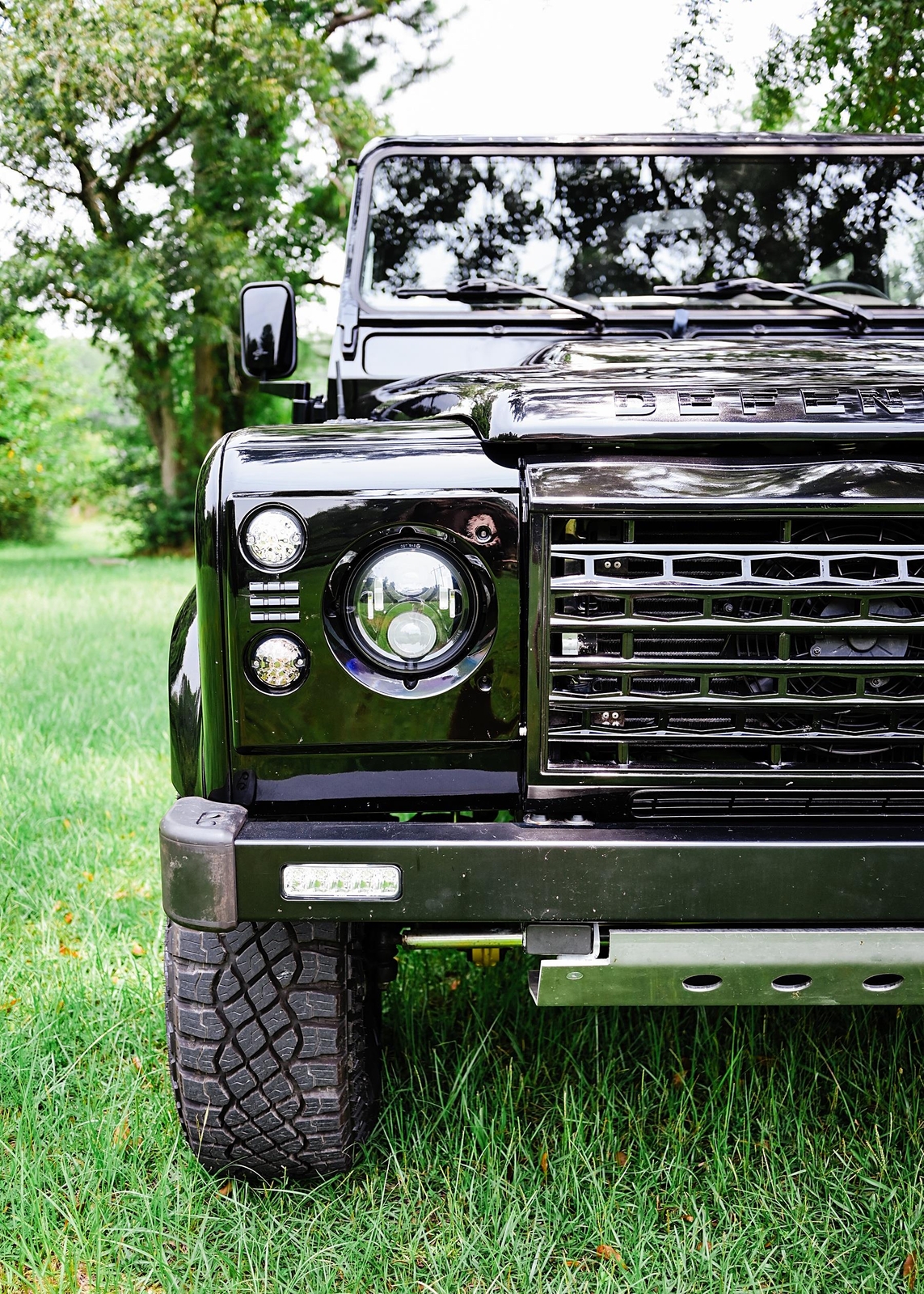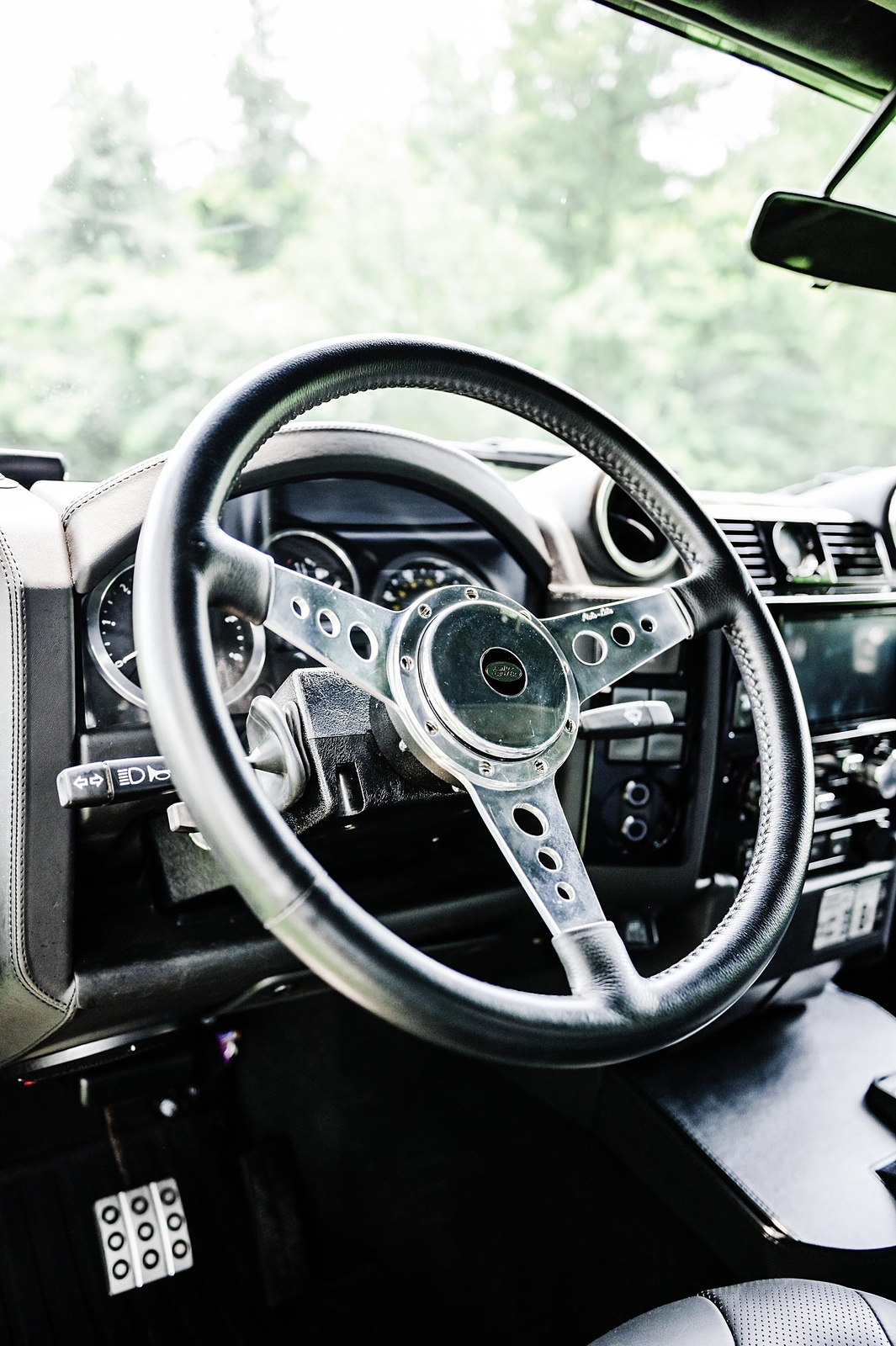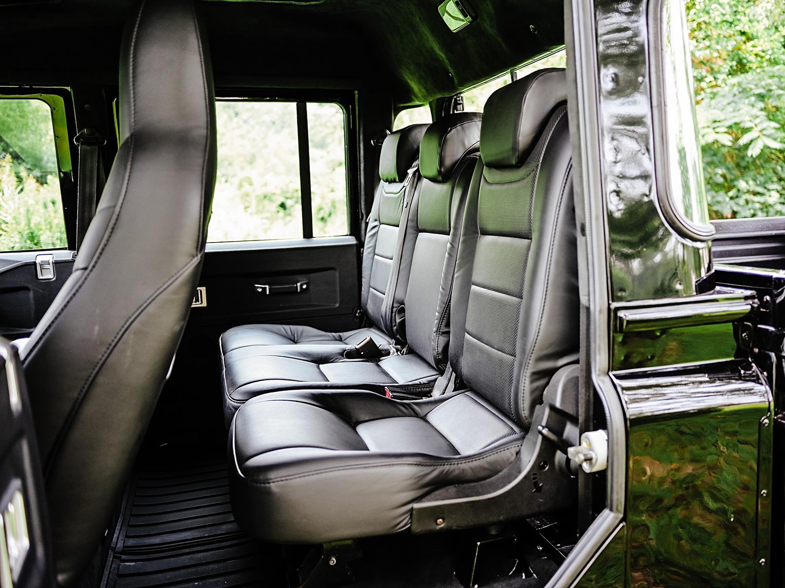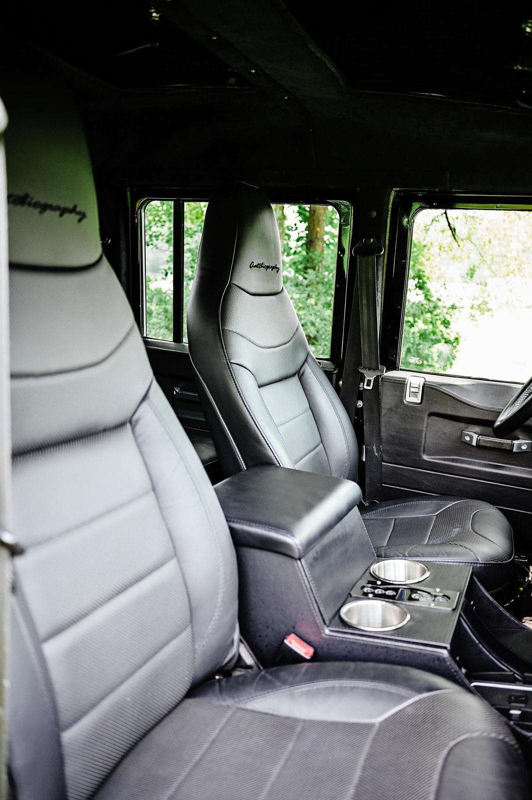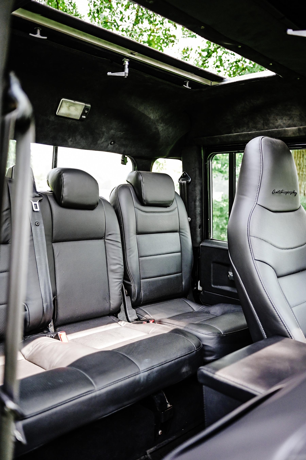 The body, expertly finished in deep Santorini Black Metallic with color-matched wheel arches and trim, was meticulously reassembled with the chassis after being treated at our in-house body and paint facility. Black powder-coated Terrafirma® rock sliders with integrated tree bars help protect the lower body, while Optimill® black anodized aluminum exterior door handles complement the Optimill® black billet aluminum door, bonnet, and windscreen hinges, enhancing the vehicle's stealthy appearance.