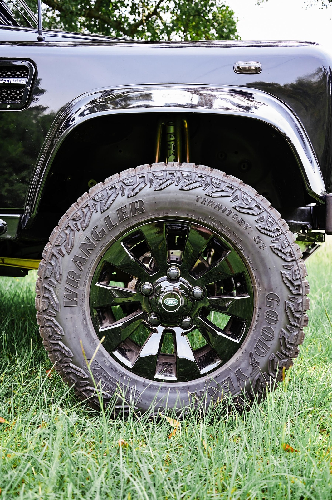 The upgraded, heavy-duty front and rear axles are located by slightly elevated Fox Racing® 2.0 shocks and springs, Terrafirma® caster-corrected front and cranked rear radius arms, track rod, drag link, and Terrafirma® steering damper, all protected by a heavy-duty aluminum front skid plate. It rides on bold, gloss black 18-inch “Sawtooth” alloy wheels wrapped with 275/70R18 Goodyear® Wrangler Territory® MT (Maximum Traction) tires — a hybrid on- and off-road tire with an open tread design that helps clear mud from the tire and provides superb traction even when the pavement ends.
