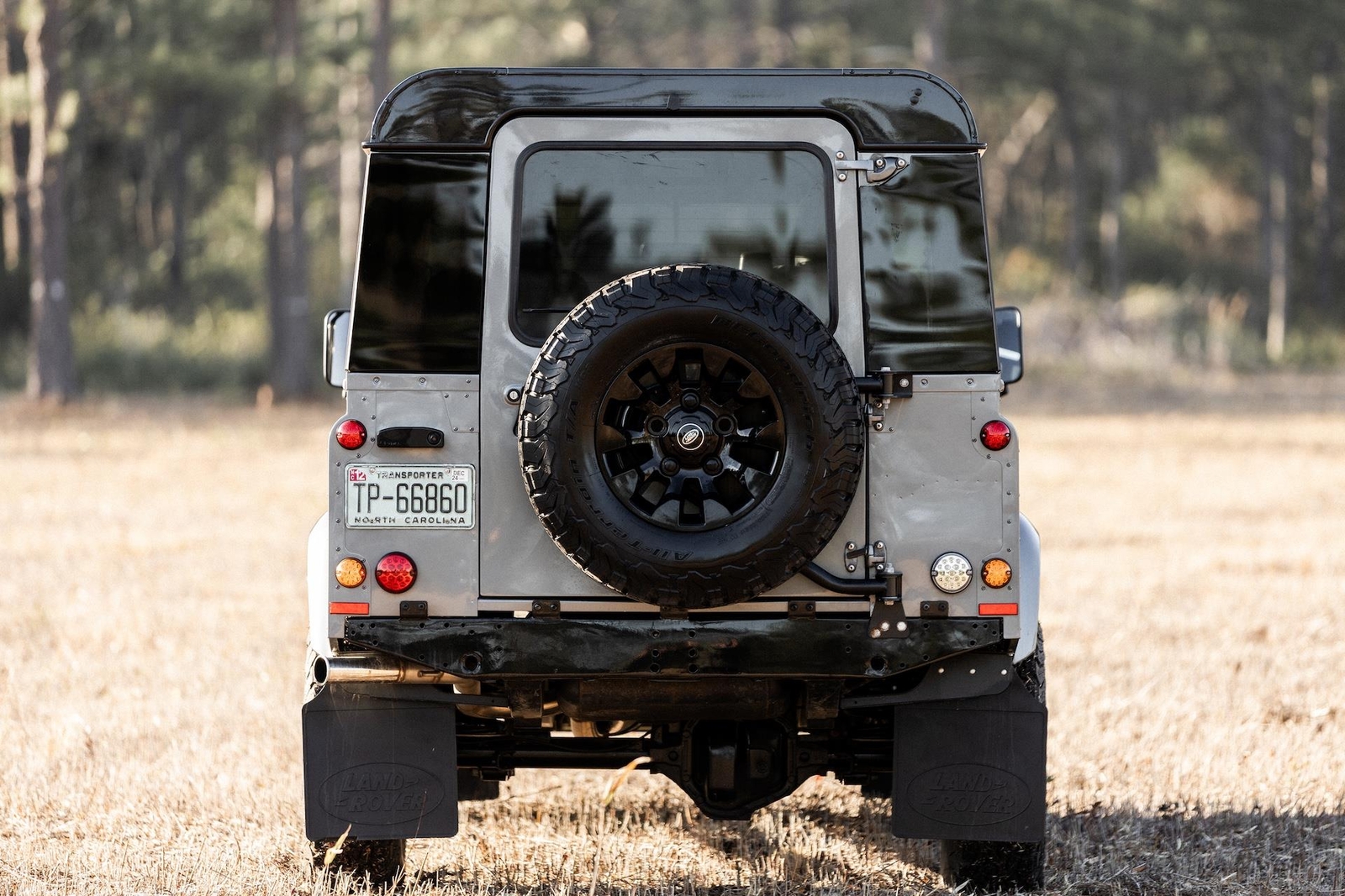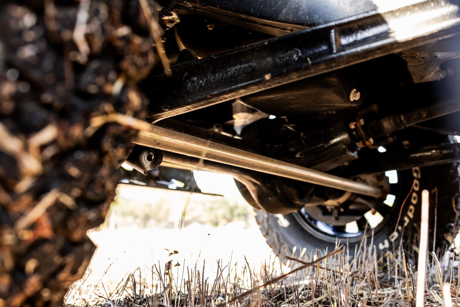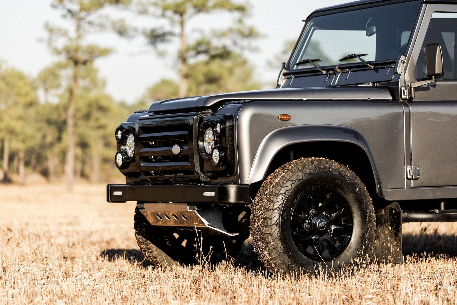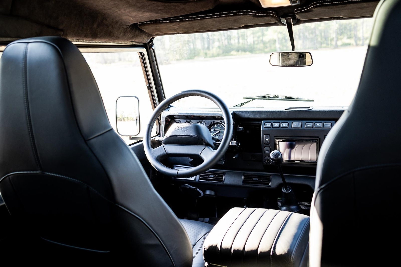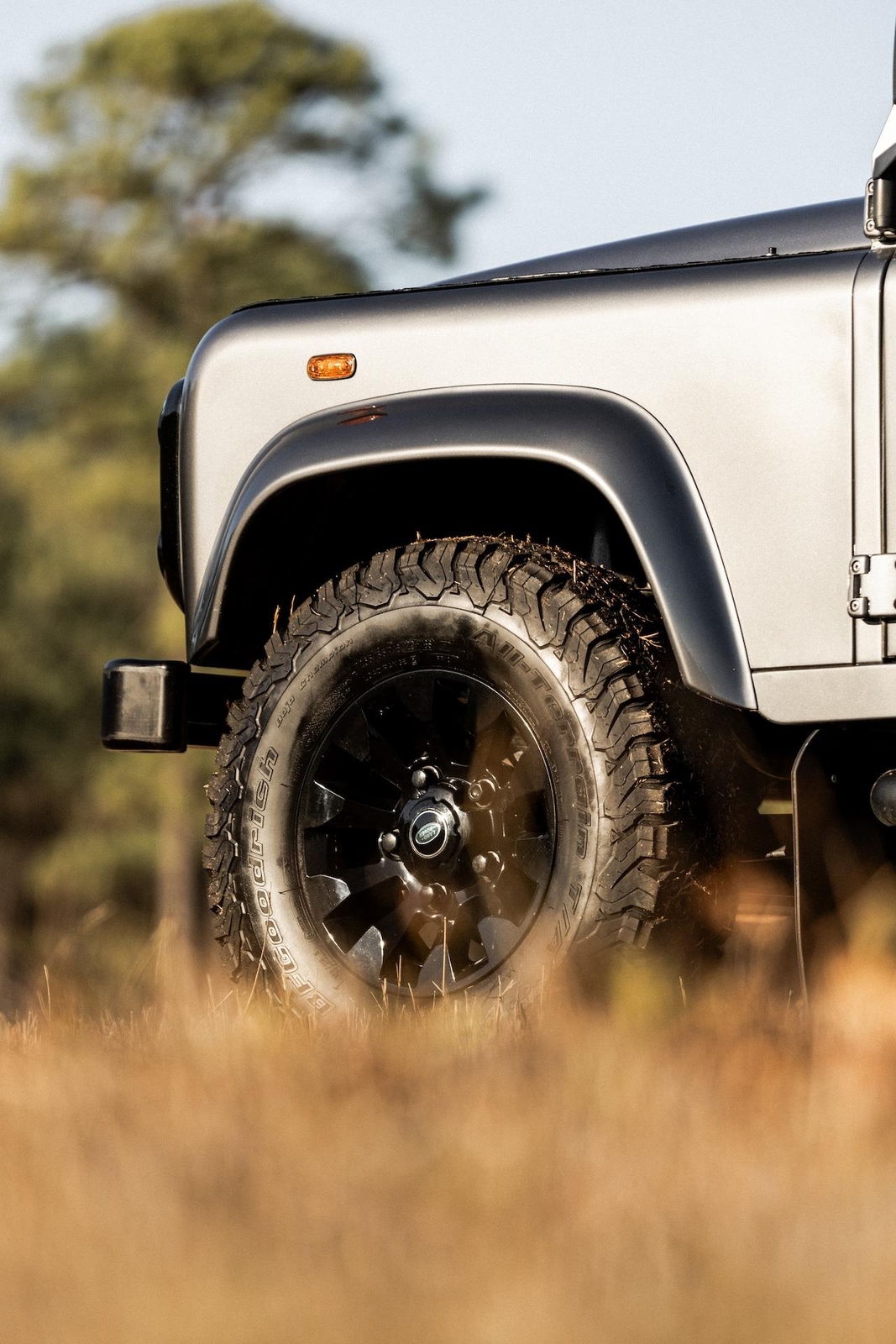 The front and rear axles are located by heavy-duty springs, OEM shock absorbers, heavy-duty steering arms, and steering damper, all safeguarded by a heavy-duty, aluminum front skid plate. The vehicle stands on gloss black 16" Land Rover “Sawtooth” wheels wrapped with beefy 235/65R16 BFGoodrich® All-Terrain T/A® KO2® tires, featuring interlocking tread elements to maximize traction and handling on- and off-road by stabilizing the tread center and providing biting edges for improved traction. This is BFGoodrich’s toughest all-terrain tire. Ever.