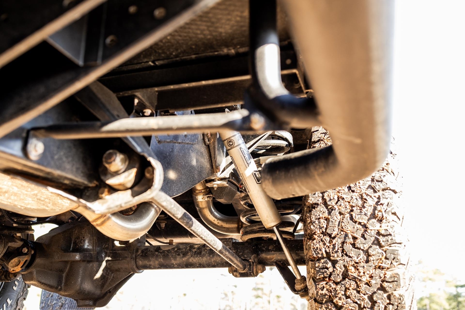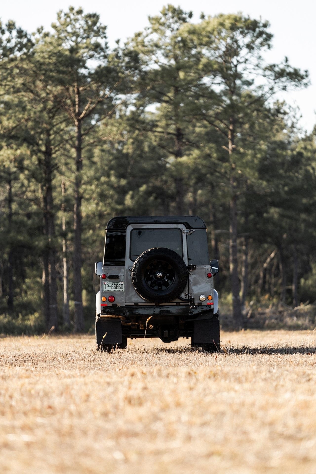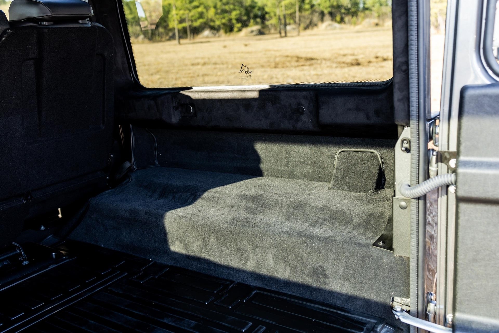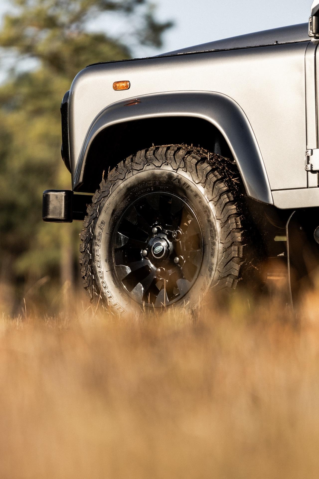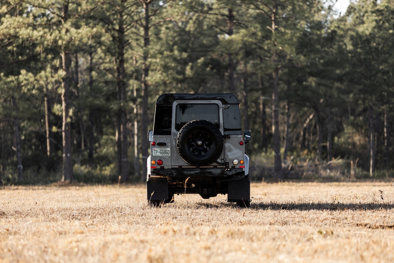 The front and rear axles are located by heavy-duty springs, OEM shock absorbers, heavy-duty steering arms, and steering damper, all safeguarded by a heavy-duty, aluminum front skid plate. The vehicle stands on gloss black 16" Land Rover “Sawtooth” wheels wrapped with beefy 235/65R16 BFGoodrich® All-Terrain T/A® KO2® tires, featuring interlocking tread elements to maximize traction and handling on- and off-road by stabilizing the tread center and providing biting edges for improved traction. This is BFGoodrich’s toughest all-terrain tire. Ever.