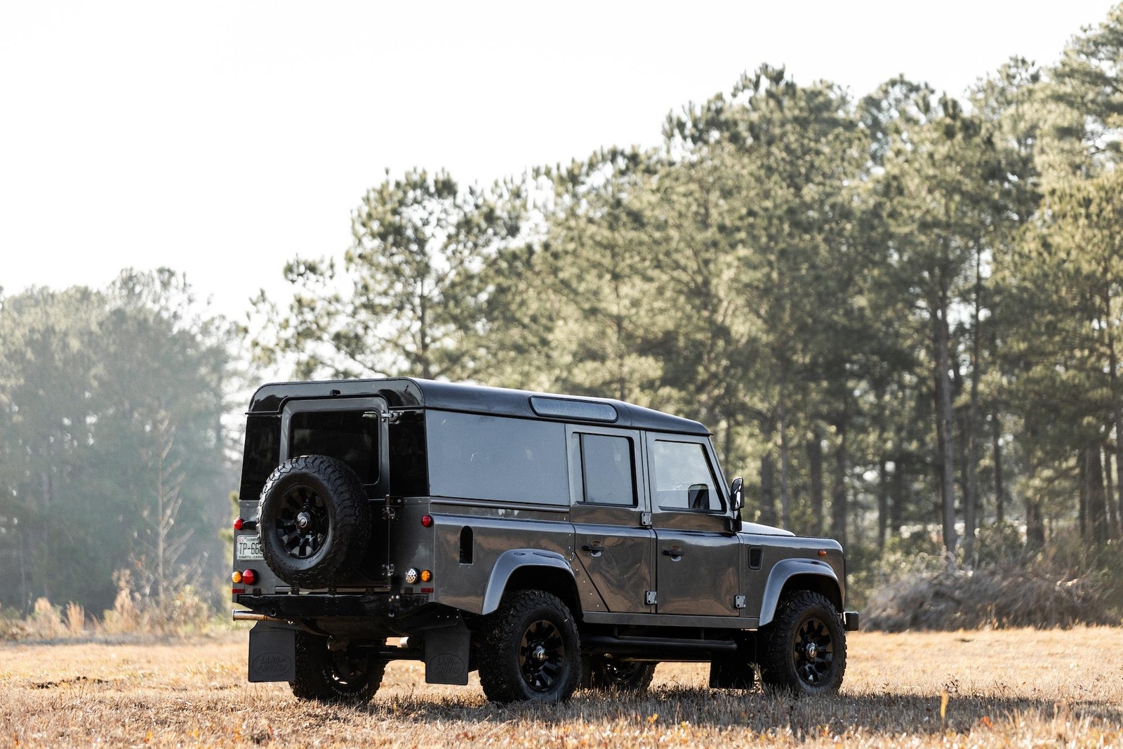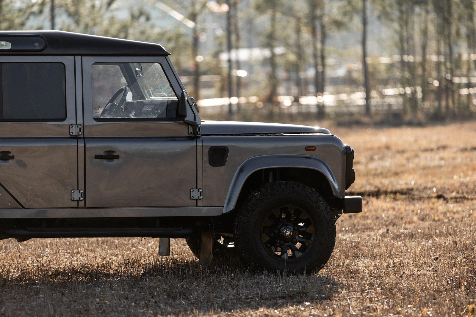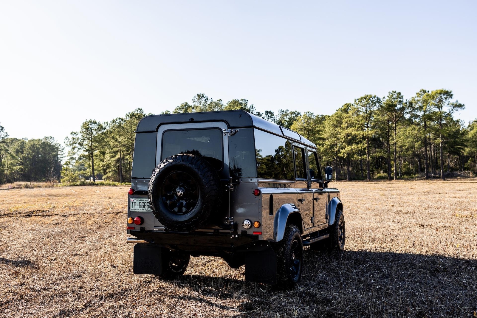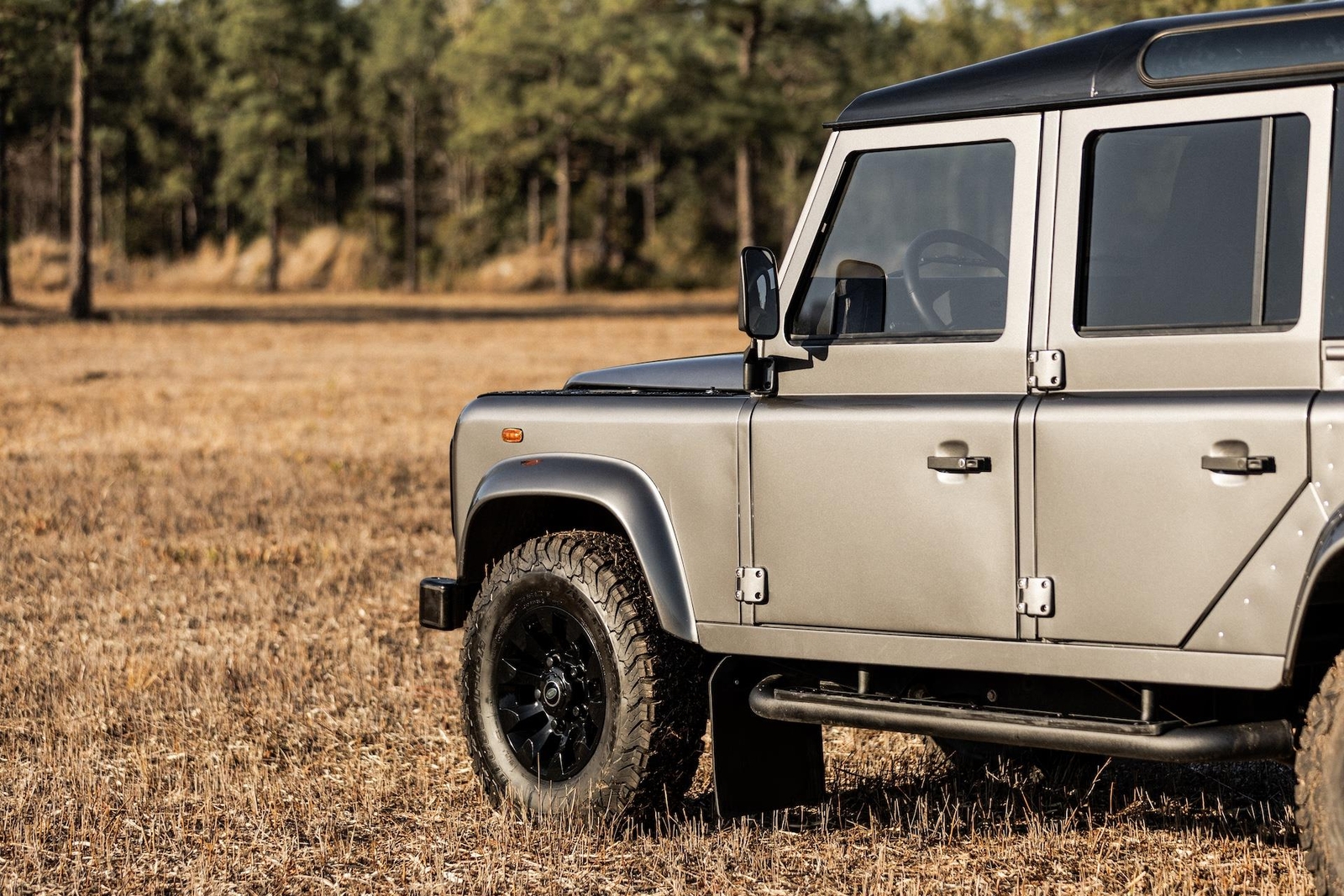 At the front end, this Defender 110 showcases a gloss black KBX®-style grille with wire mesh insert, matching light surrounds, satin black side intake and wing top vents. For modern and precise illumination, LED headlamps and colored LED marker, signal, reverse, and tail lamps have been fitted. The color-coded slimline front bumper with rubber end caps houses two rectangular LED daytime running lights. At the rear, the heavy-duty swing-away rear tire carrier provides a neat and functional solution for storing the full-size spare tire with matching wheel.