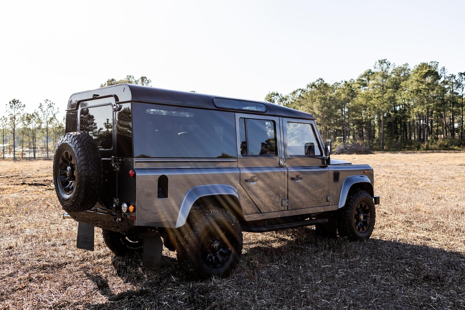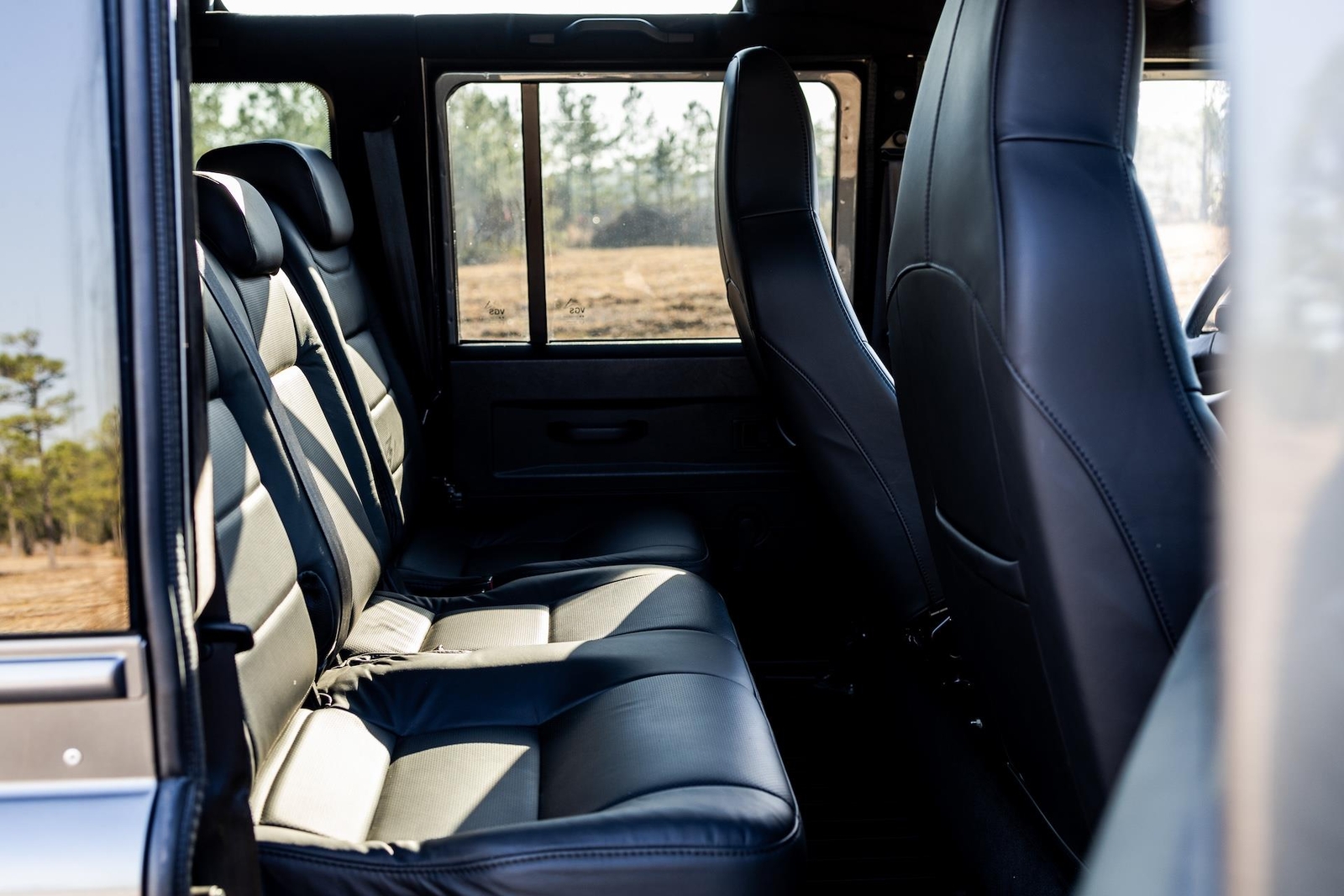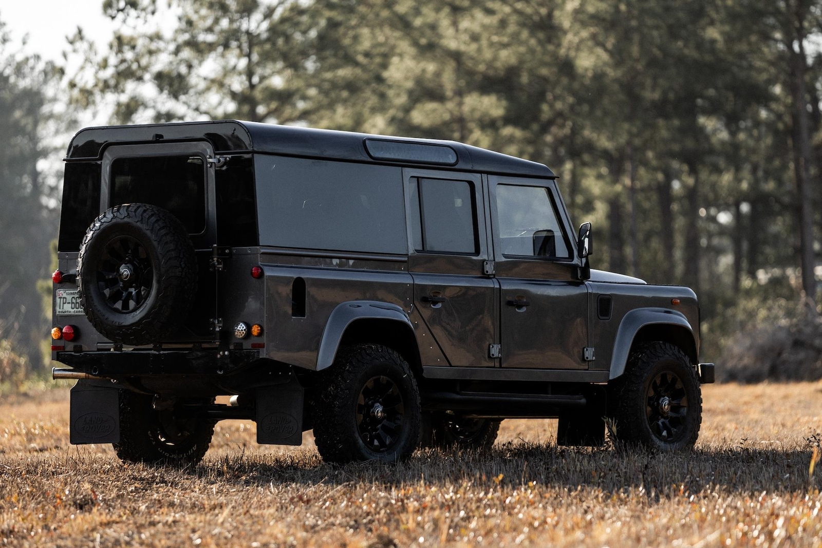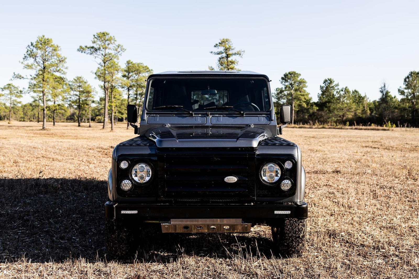At the front end, this Defender 110 showcases a gloss black KBX®-style grille with wire mesh insert, matching light surrounds, satin black side intake and wing top vents. For modern and precise illumination, LED headlamps and colored LED marker, signal, reverse, and tail lamps have been fitted. The color-coded slimline front bumper with rubber end caps houses two rectangular LED daytime running lights. At the rear, the heavy-duty swing-away rear tire carrier provides a neat and functional solution for storing the full-size spare tire with matching wheel.